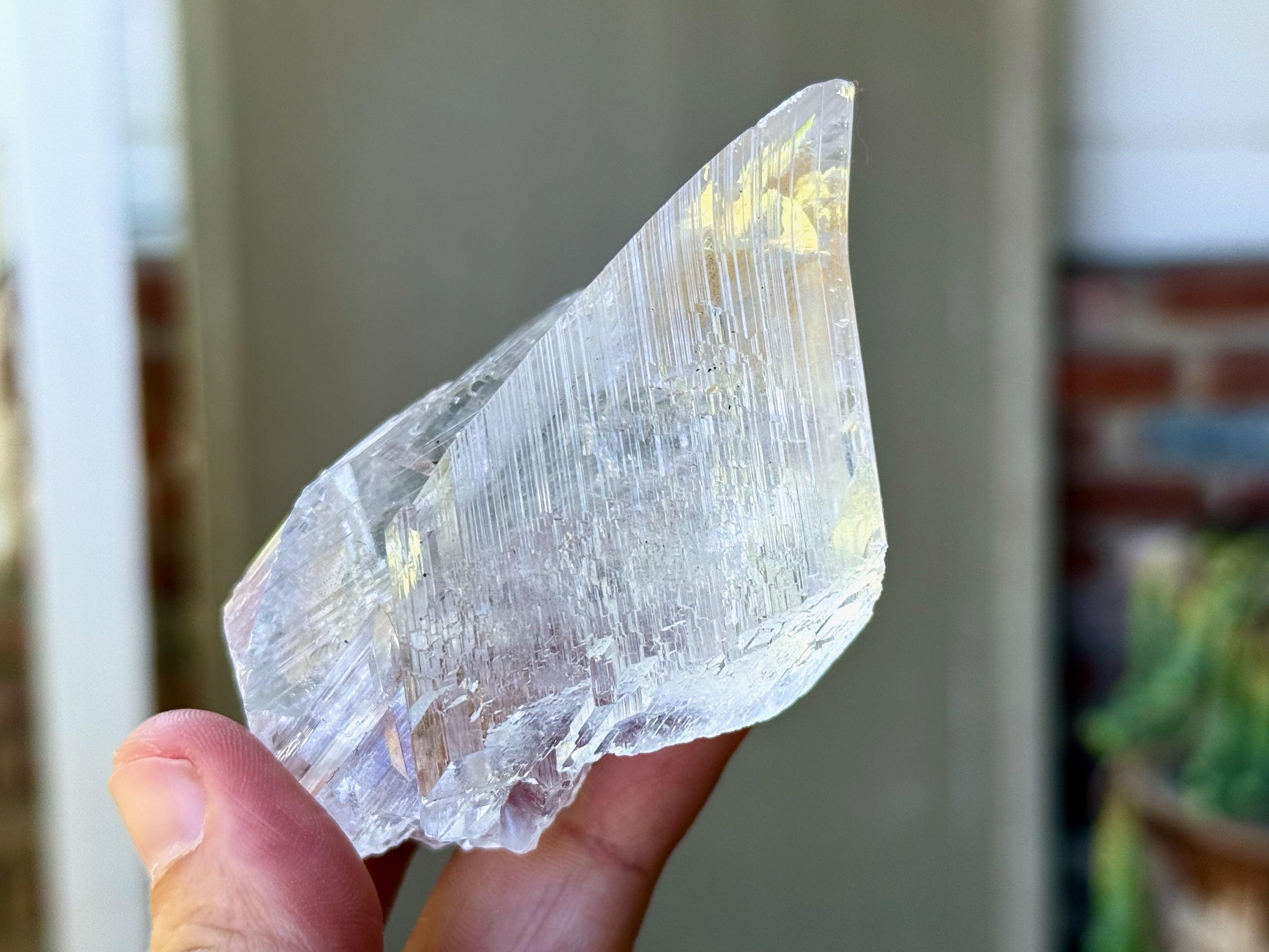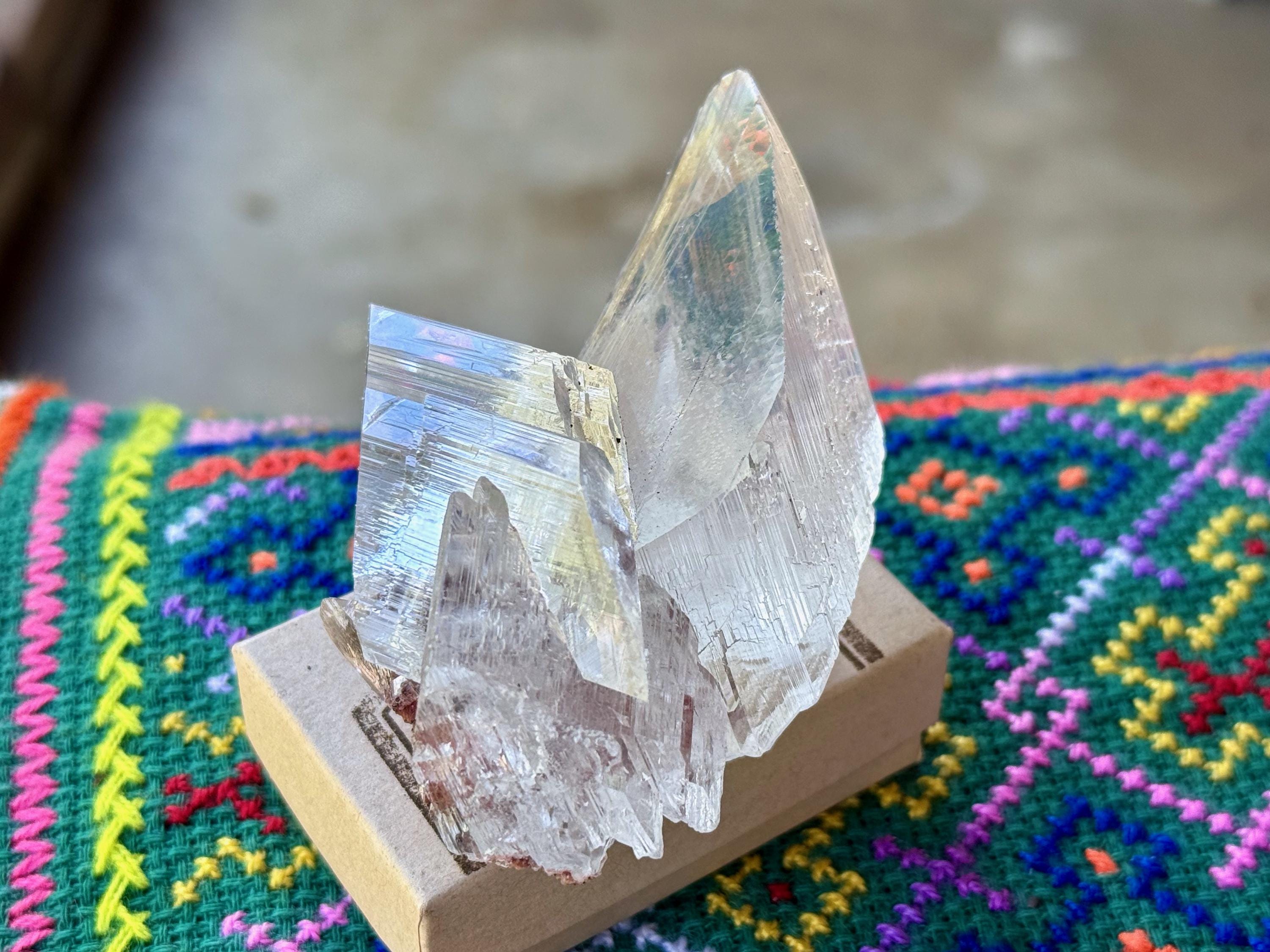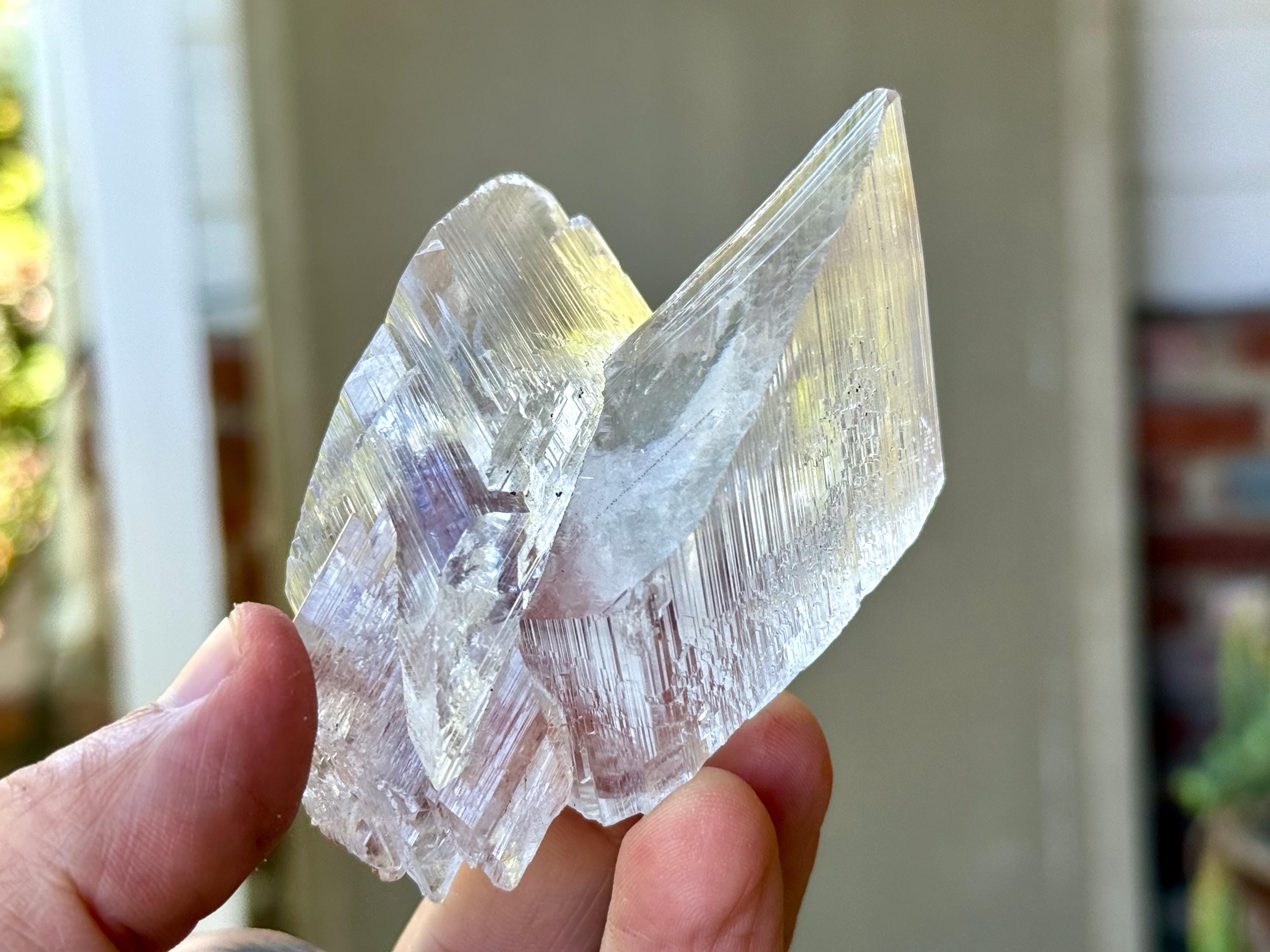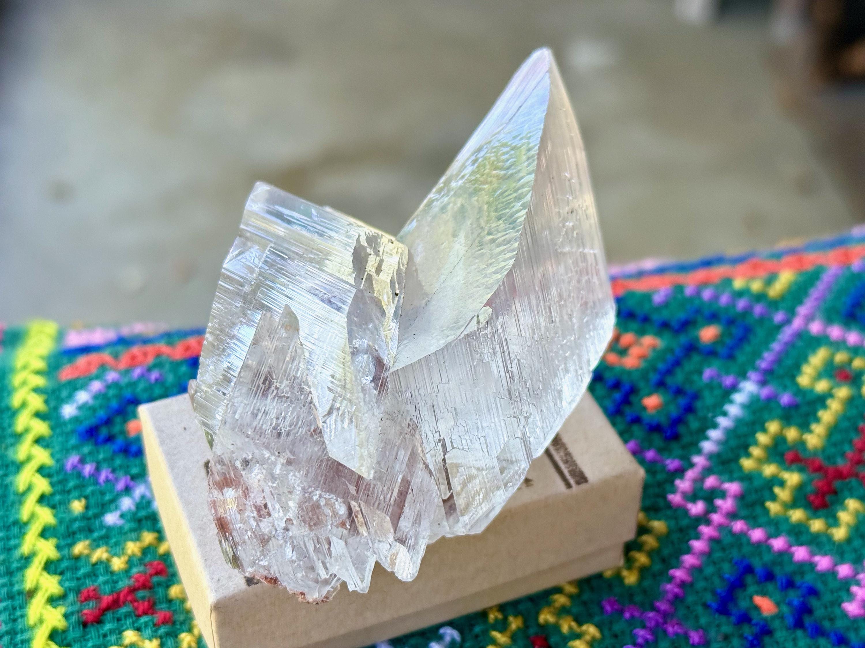 Water clear clarity and brilliant luster to this exquisite Naica Selenite in a Twin Flame formation (see more on this below). This crystal is a superfine example of the quality we've come to appreciate from the Naica Mine, with a stable crystalline formation and beautiful vertical grooves.