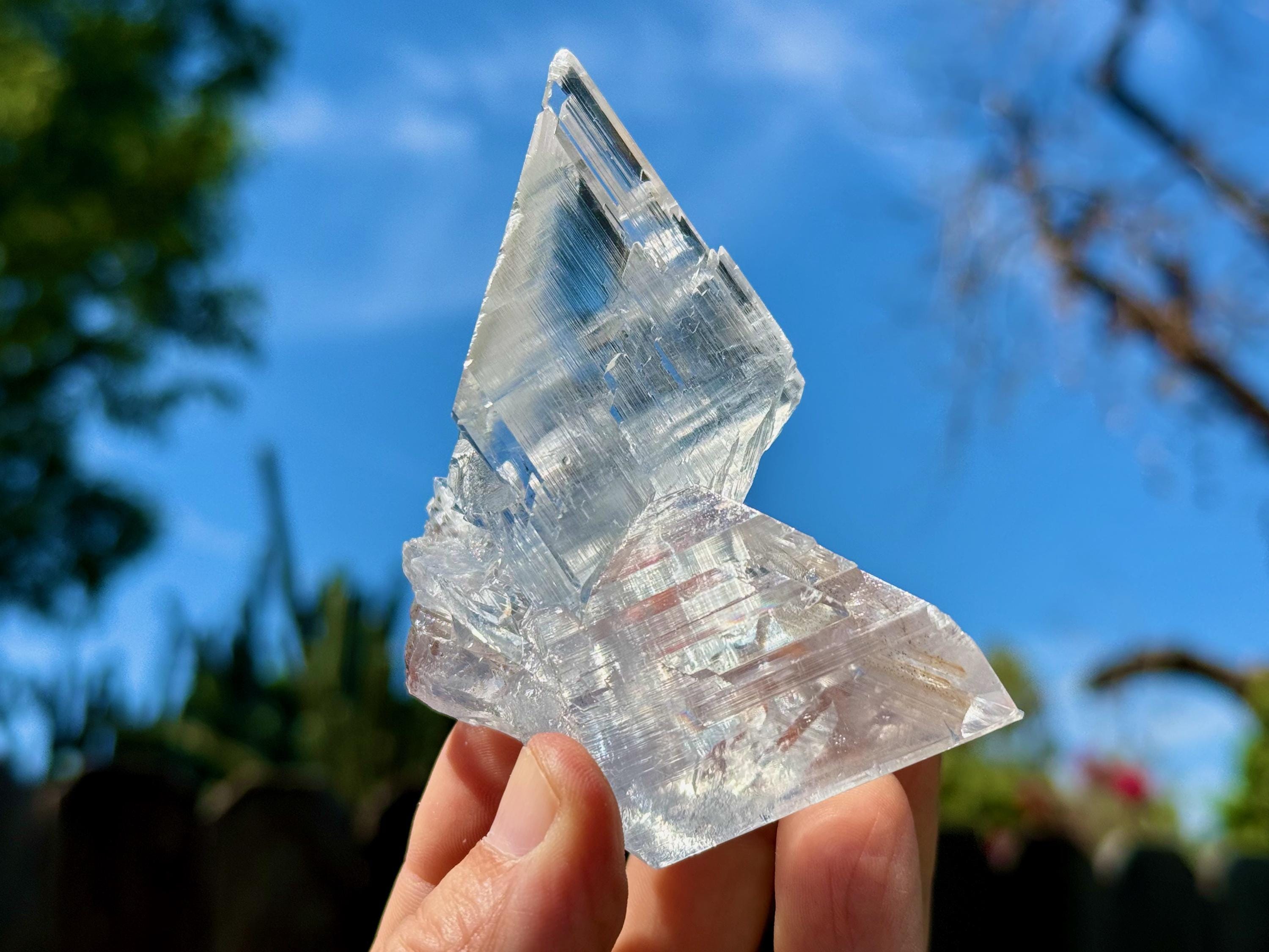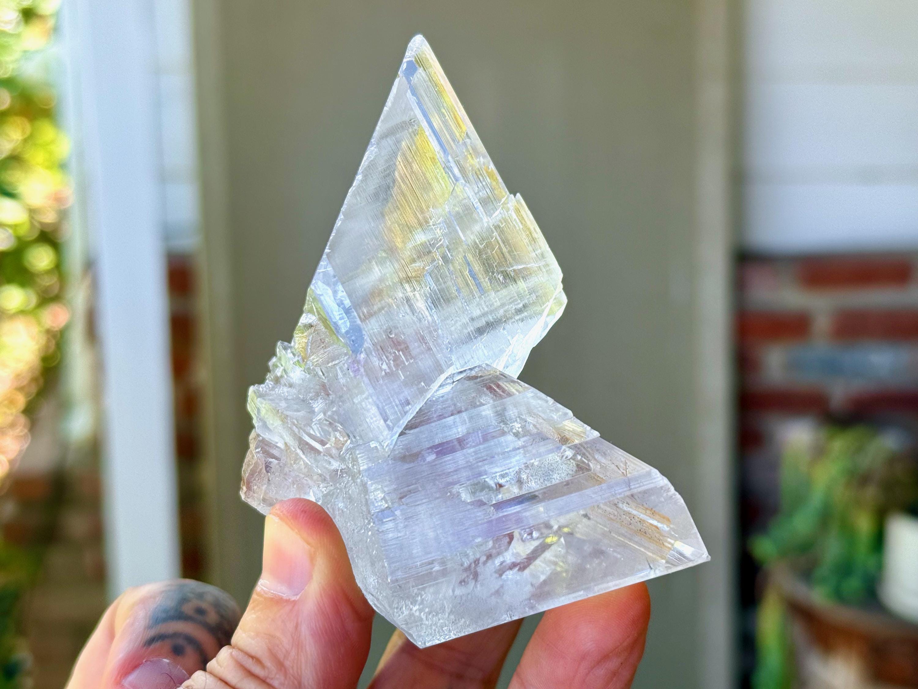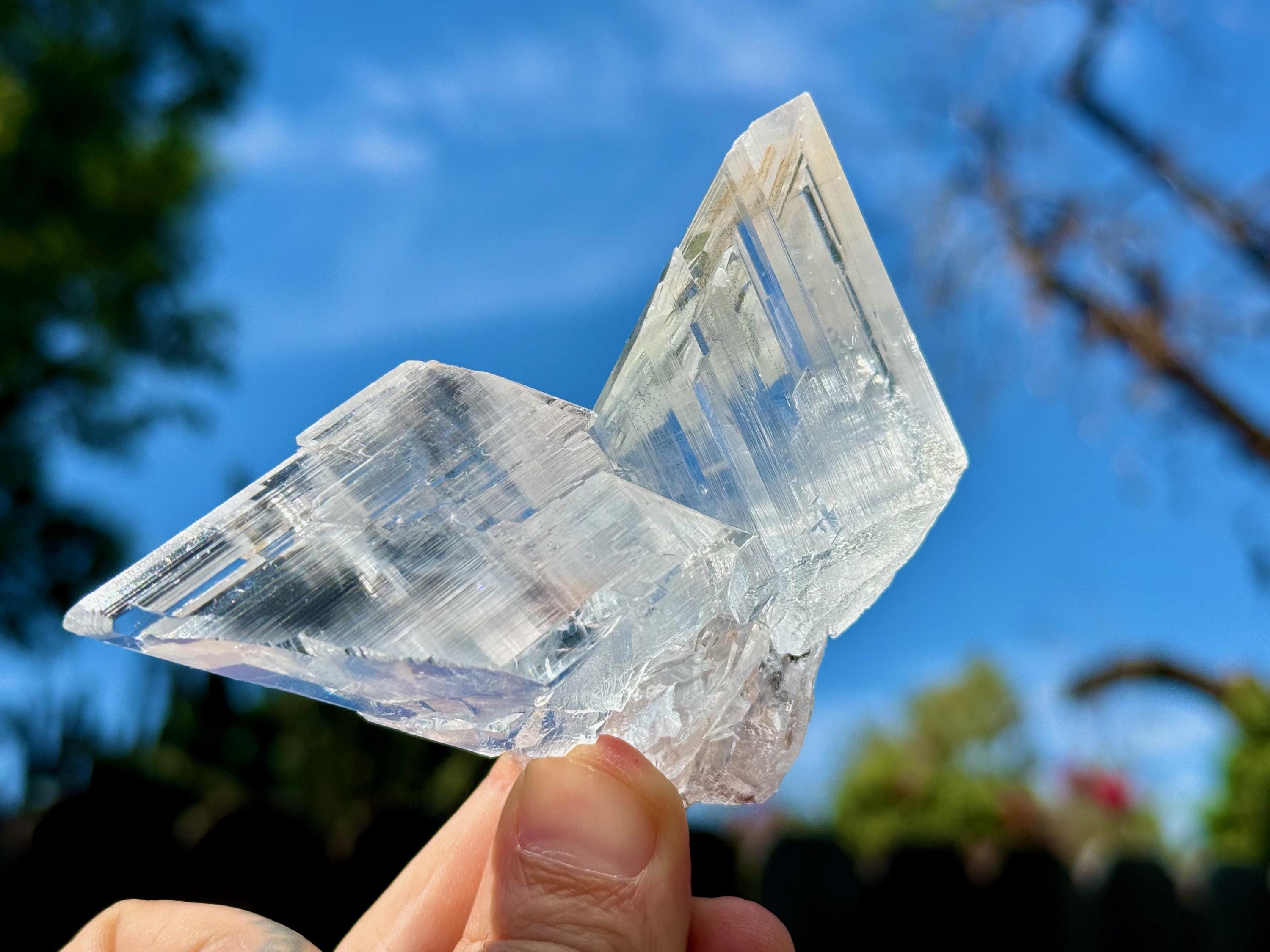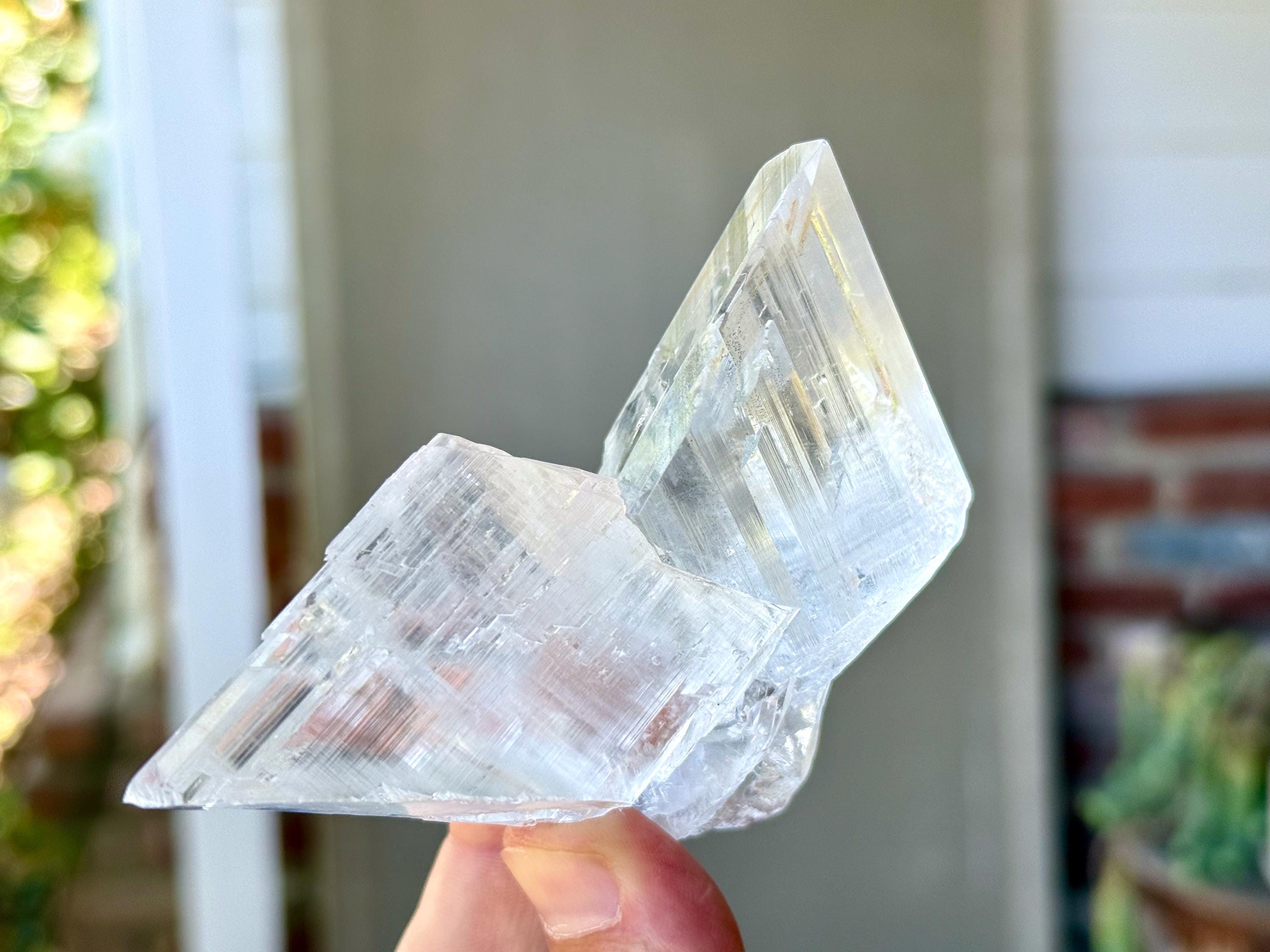 Water clear clarity and glassy, vitreous luster to this exquisite Naica Selenite in a unique Twin Formation. This is closer to a "Twin Flame" formation than a "Tantric Twin" formation (see more on this formation below), with the two crystals growing in opposite directions.