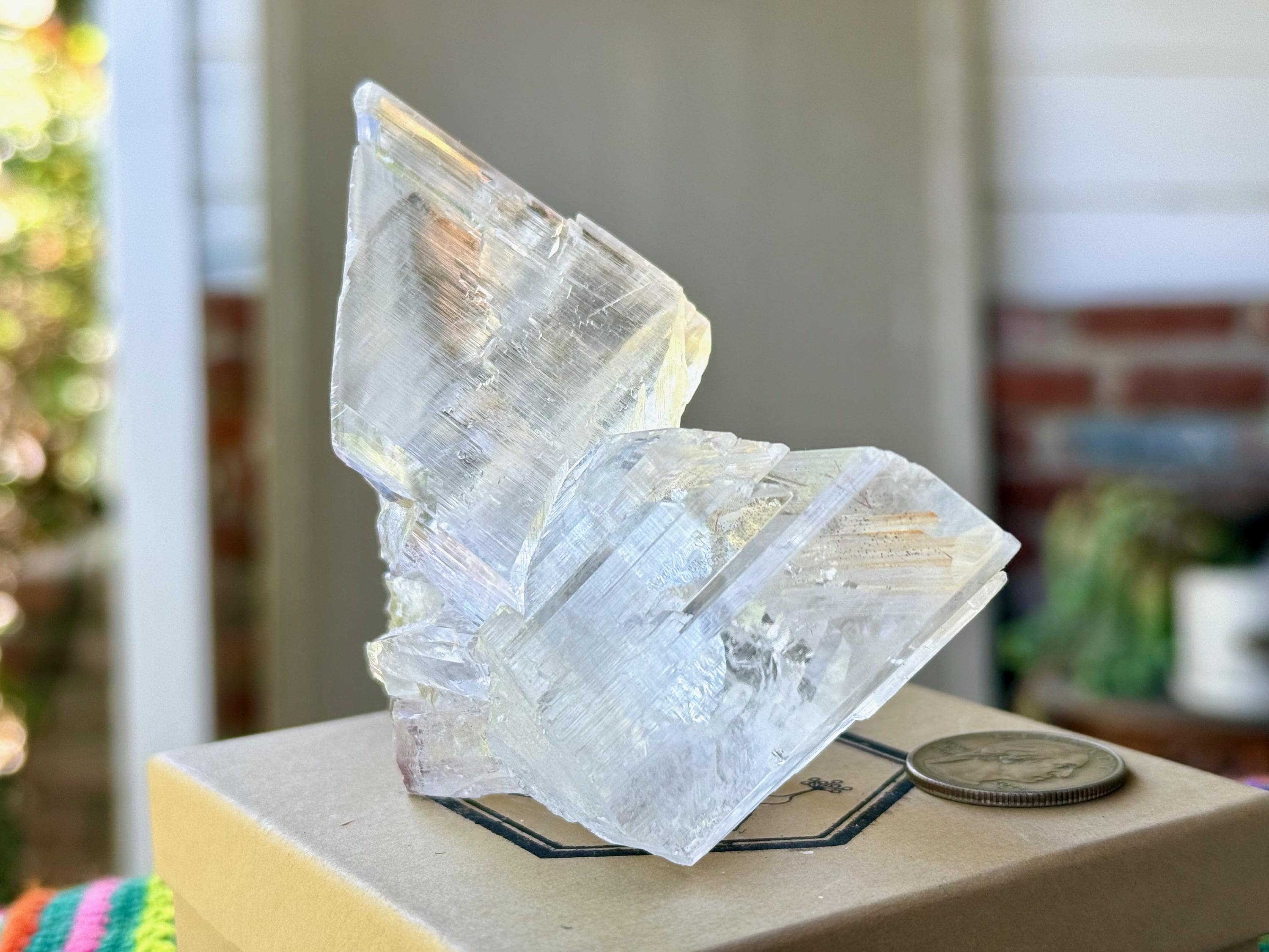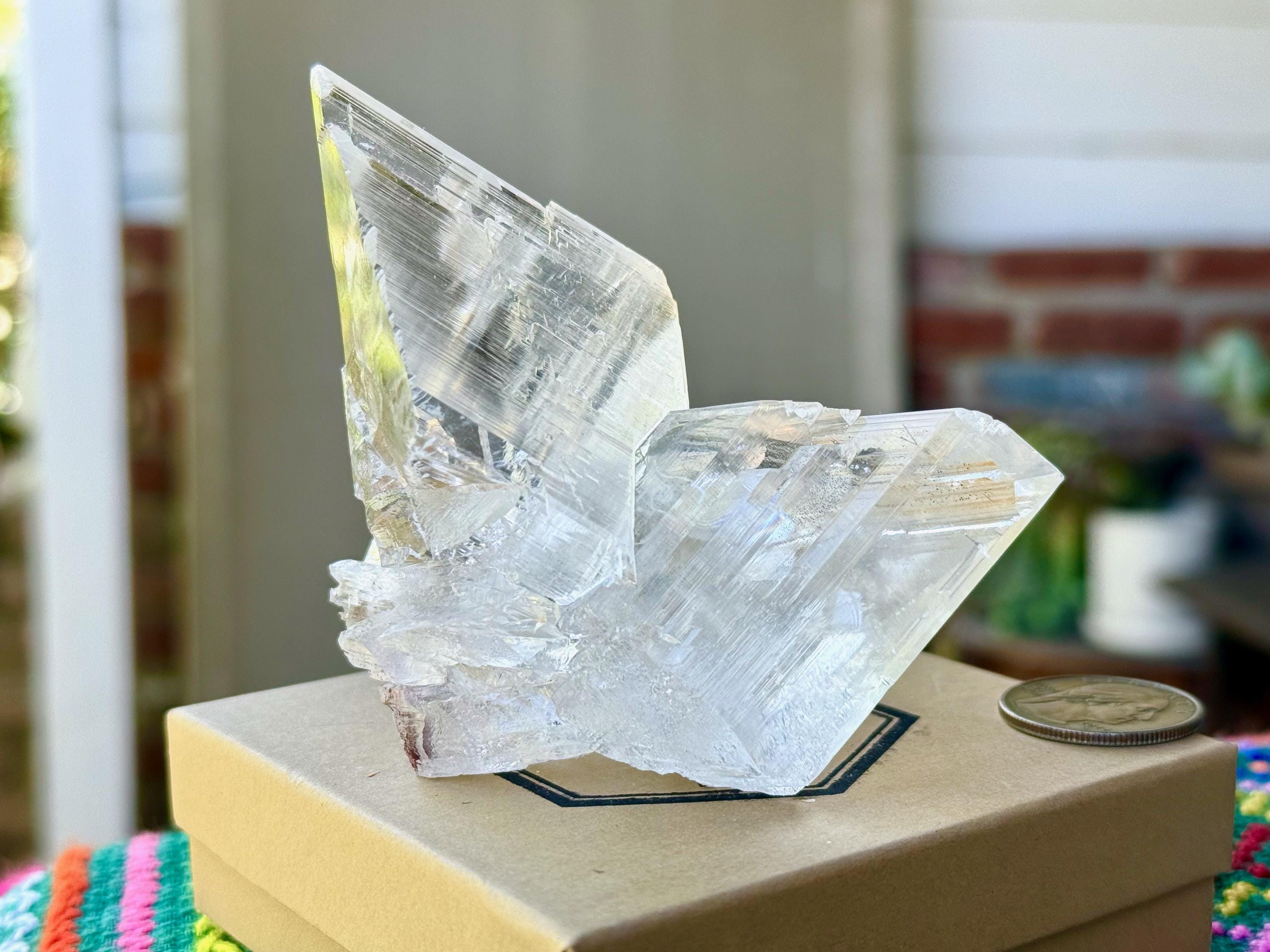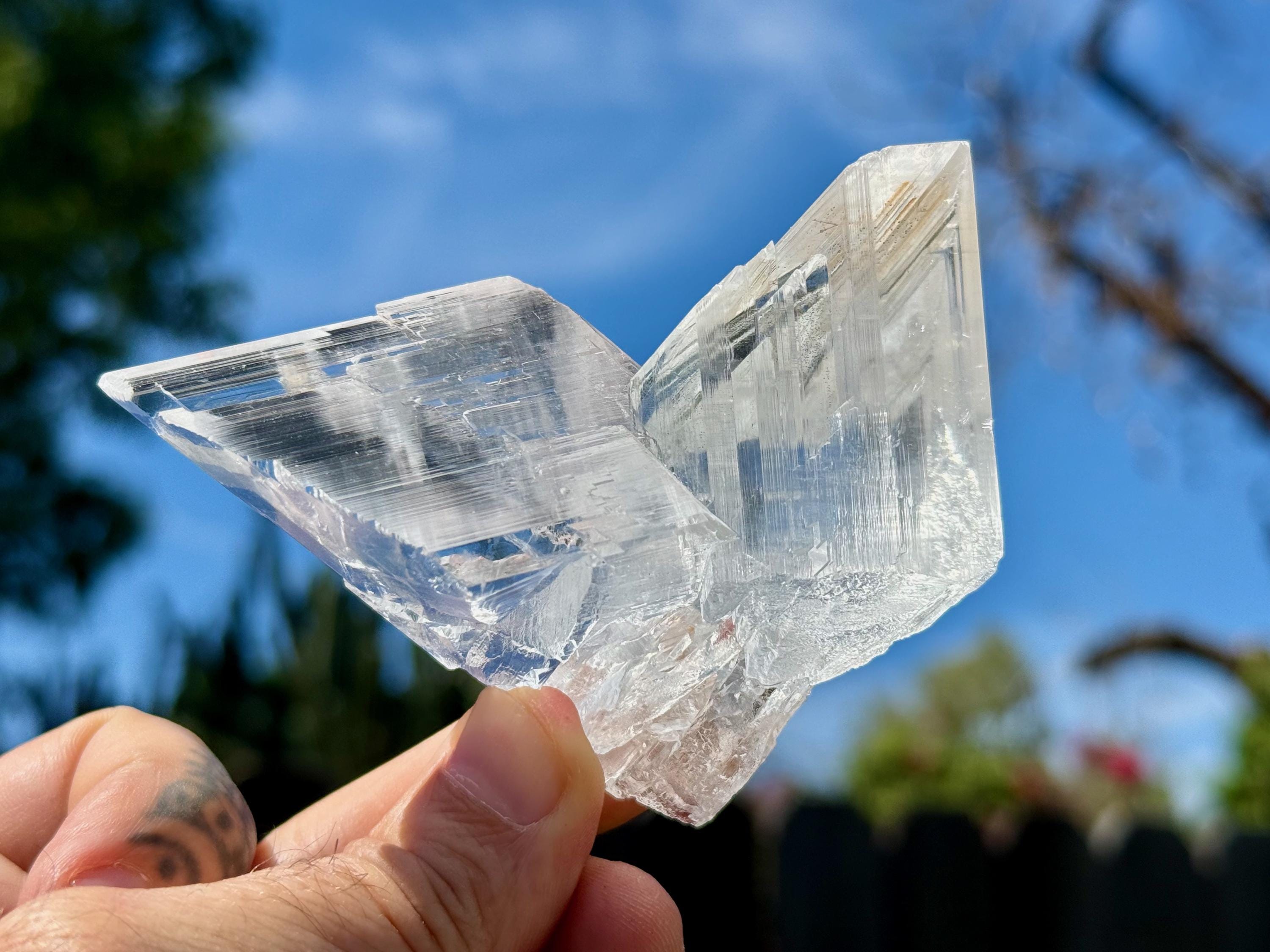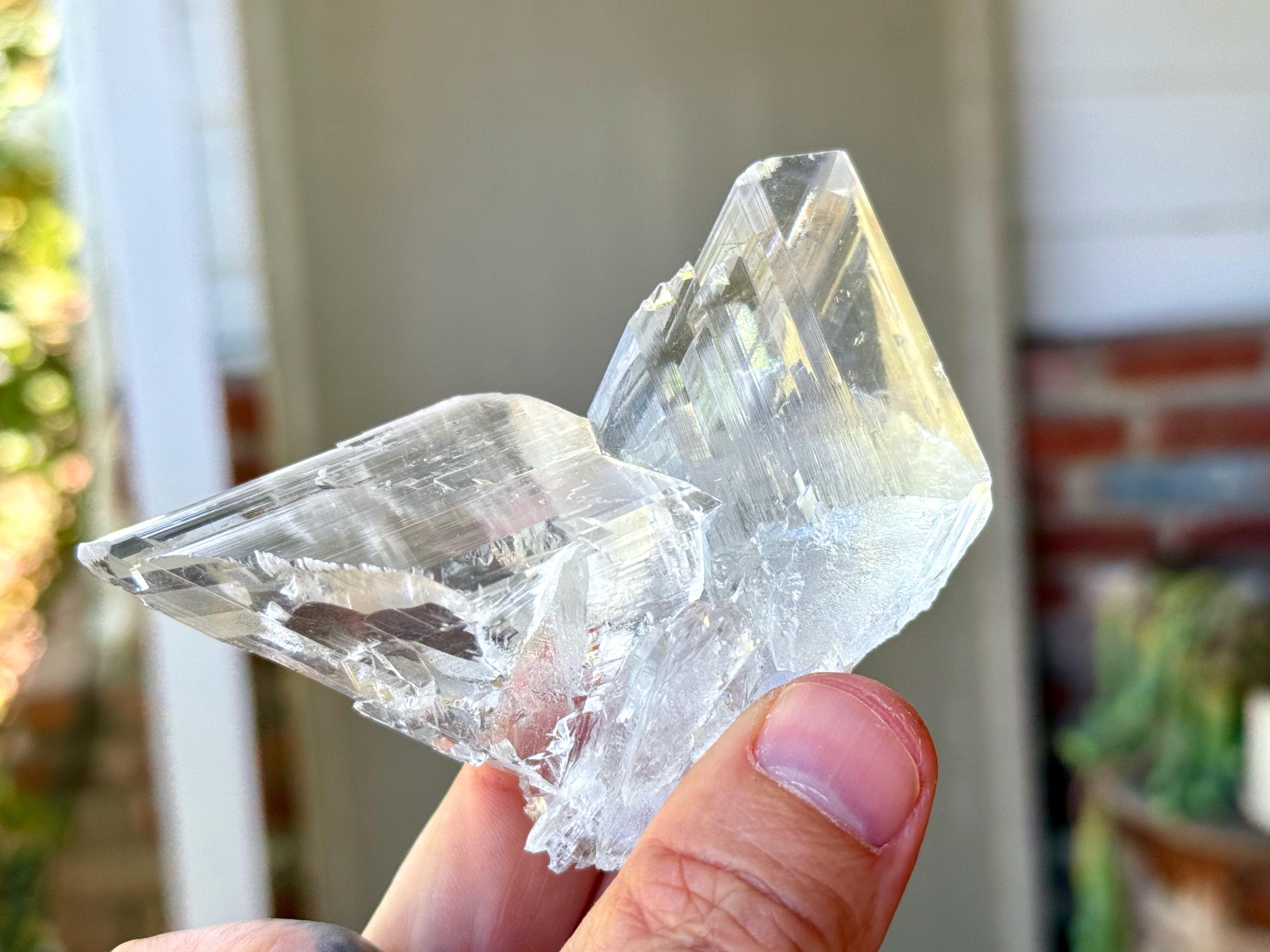 Water clear clarity and glassy, vitreous luster to this exquisite Naica Selenite in a unique Twin Formation. This is closer to a "Twin Flame" formation than a "Tantric Twin" formation (see more on this formation below), with the two crystals growing in opposite directions.