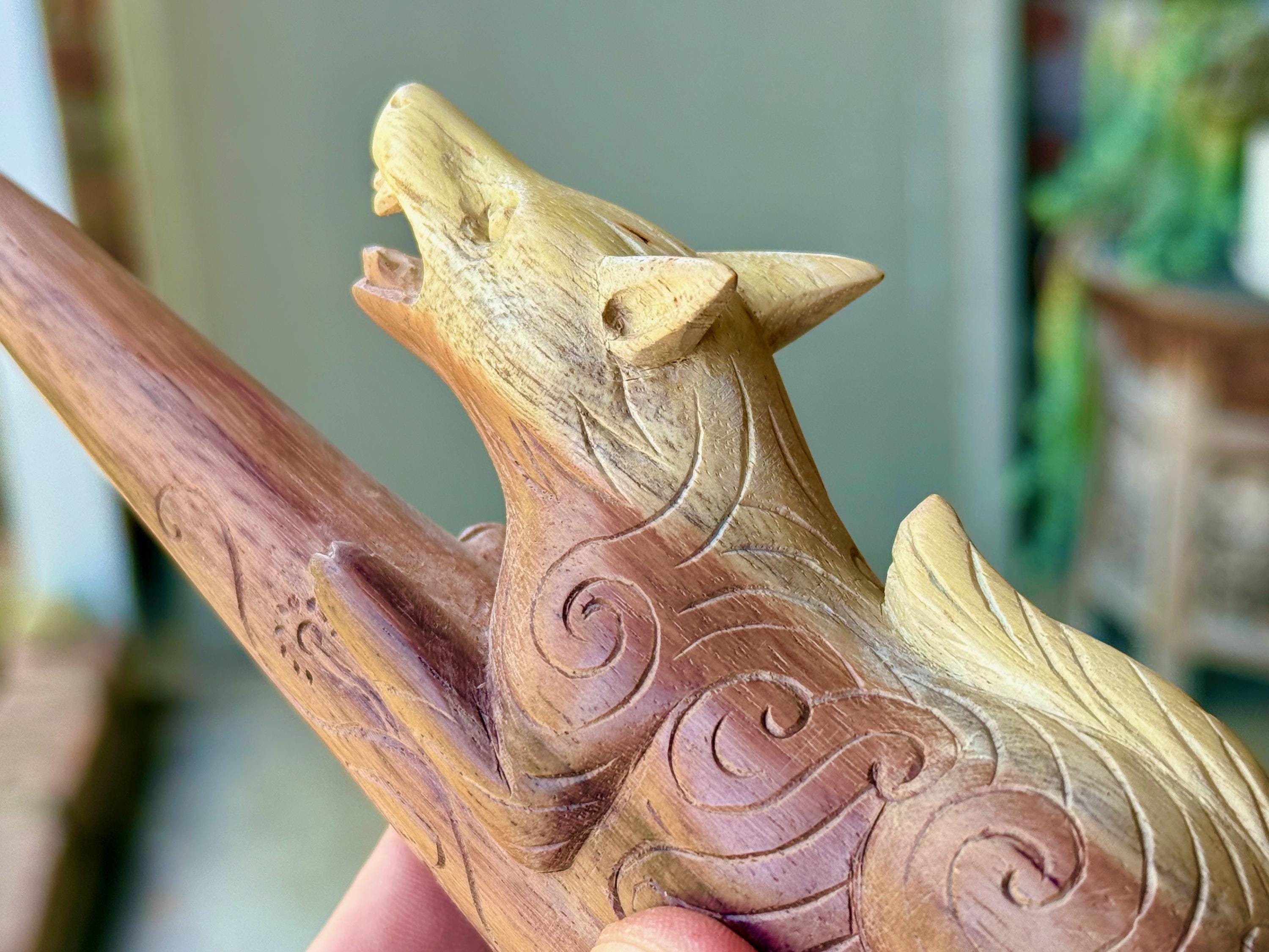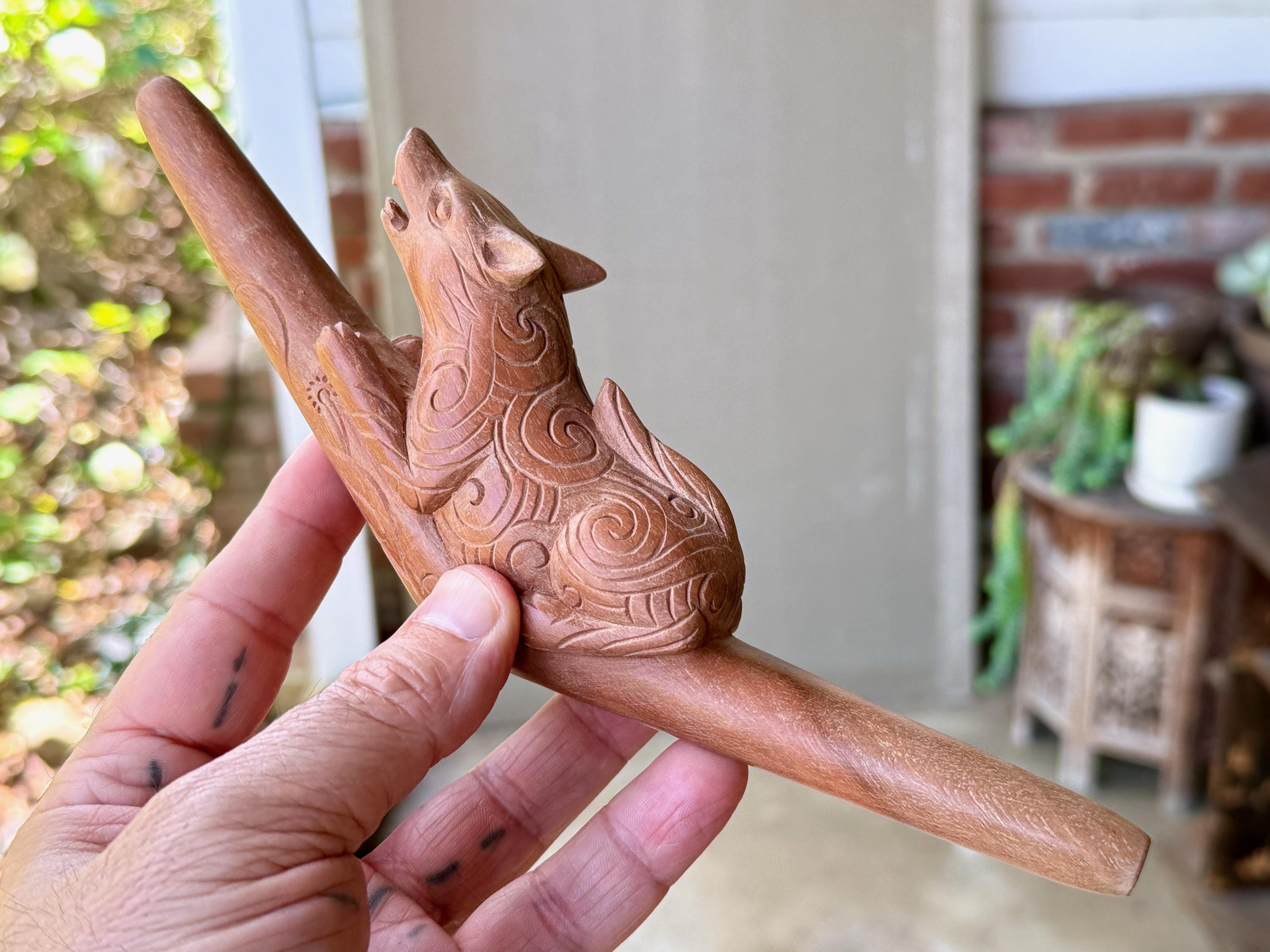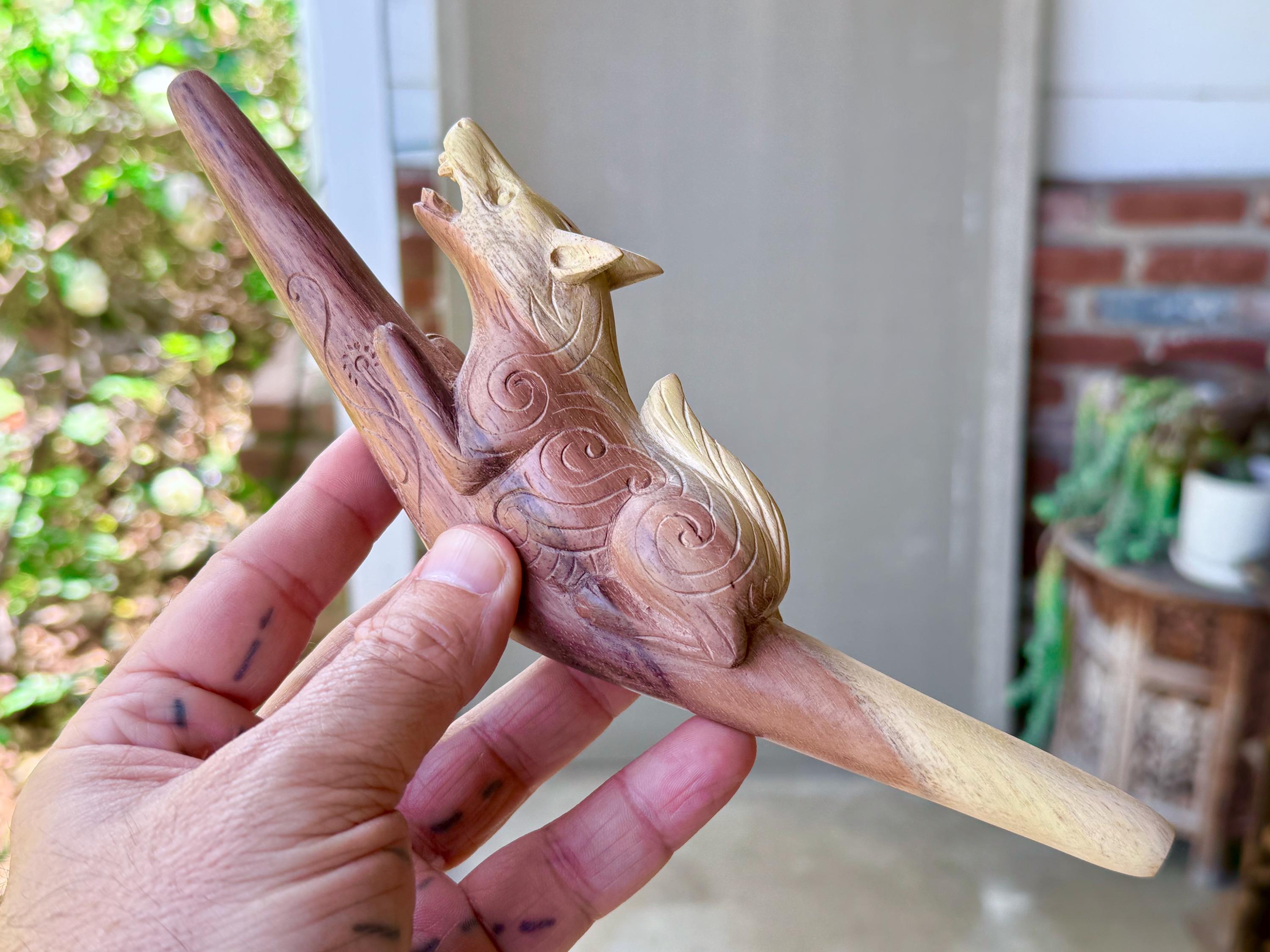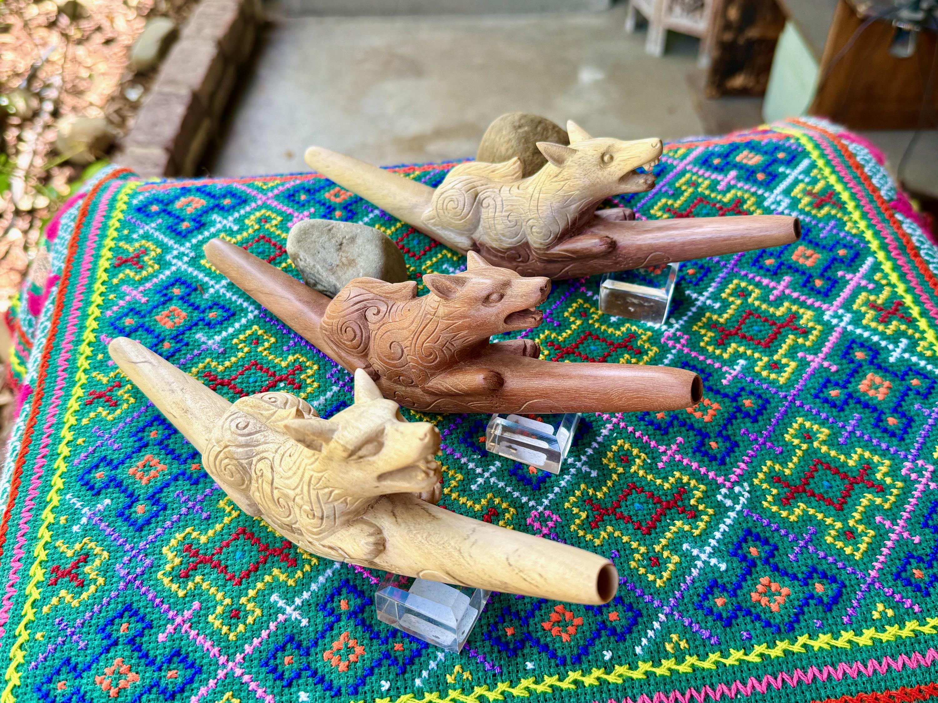 The fierce and wild protector, these wolves are carved with a "cosmic" pattern and perched atop each tepi pipe. Simply select the pipe in the wood of your preference: