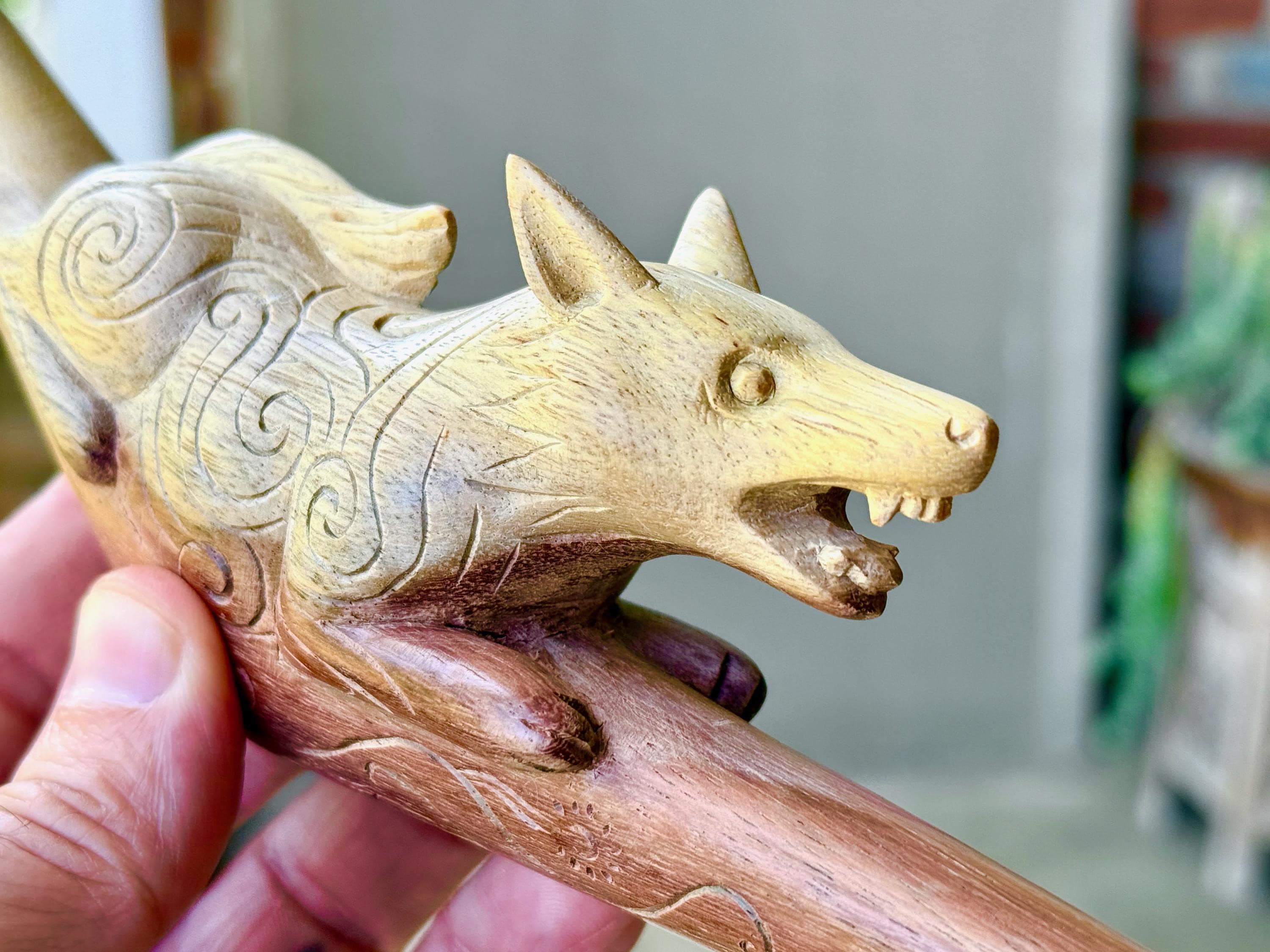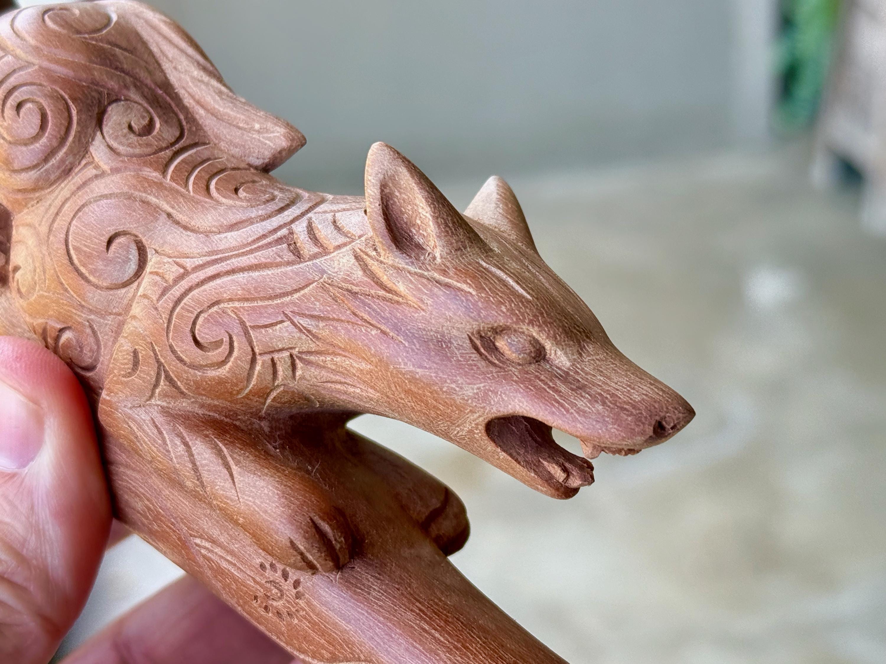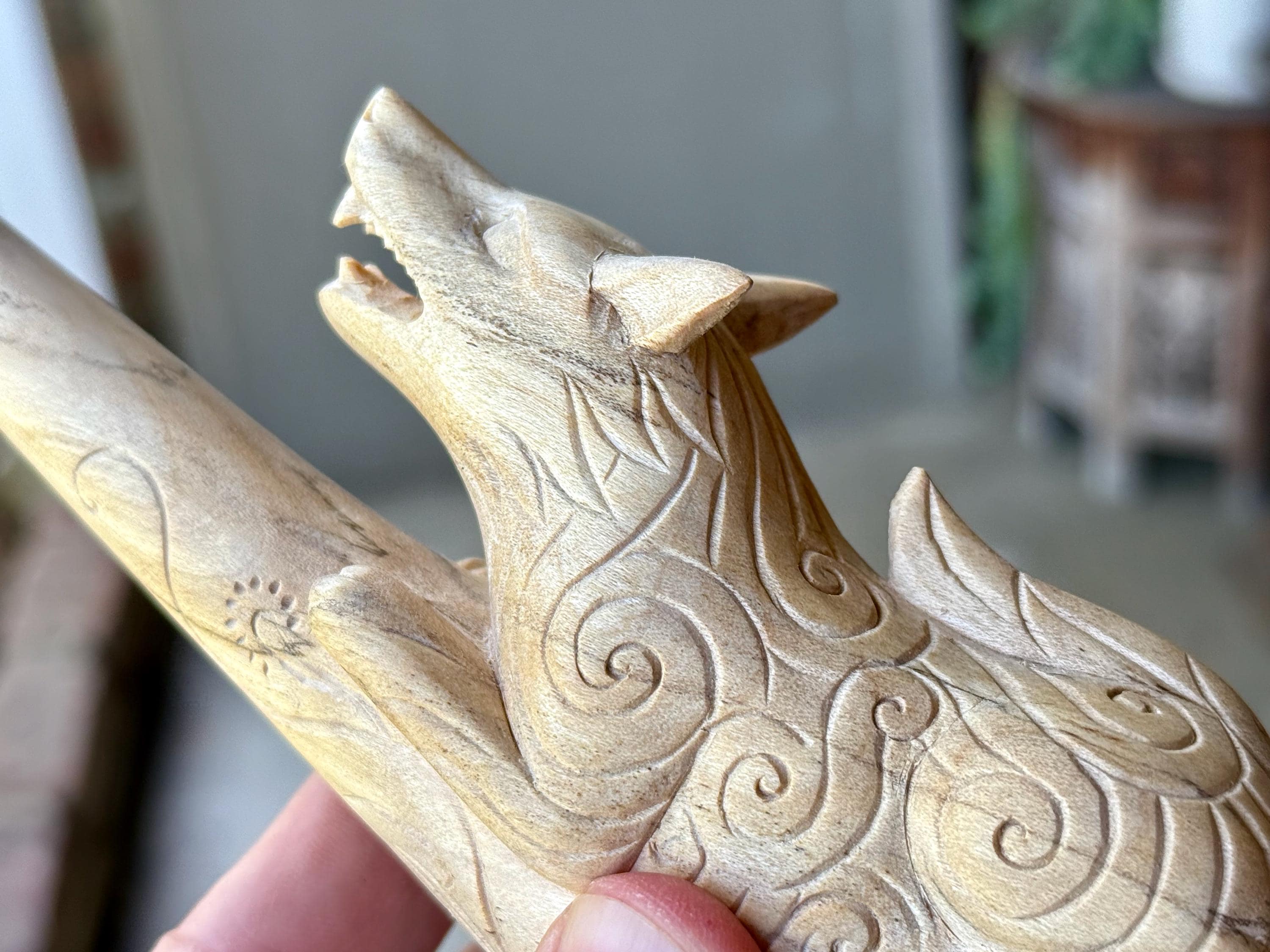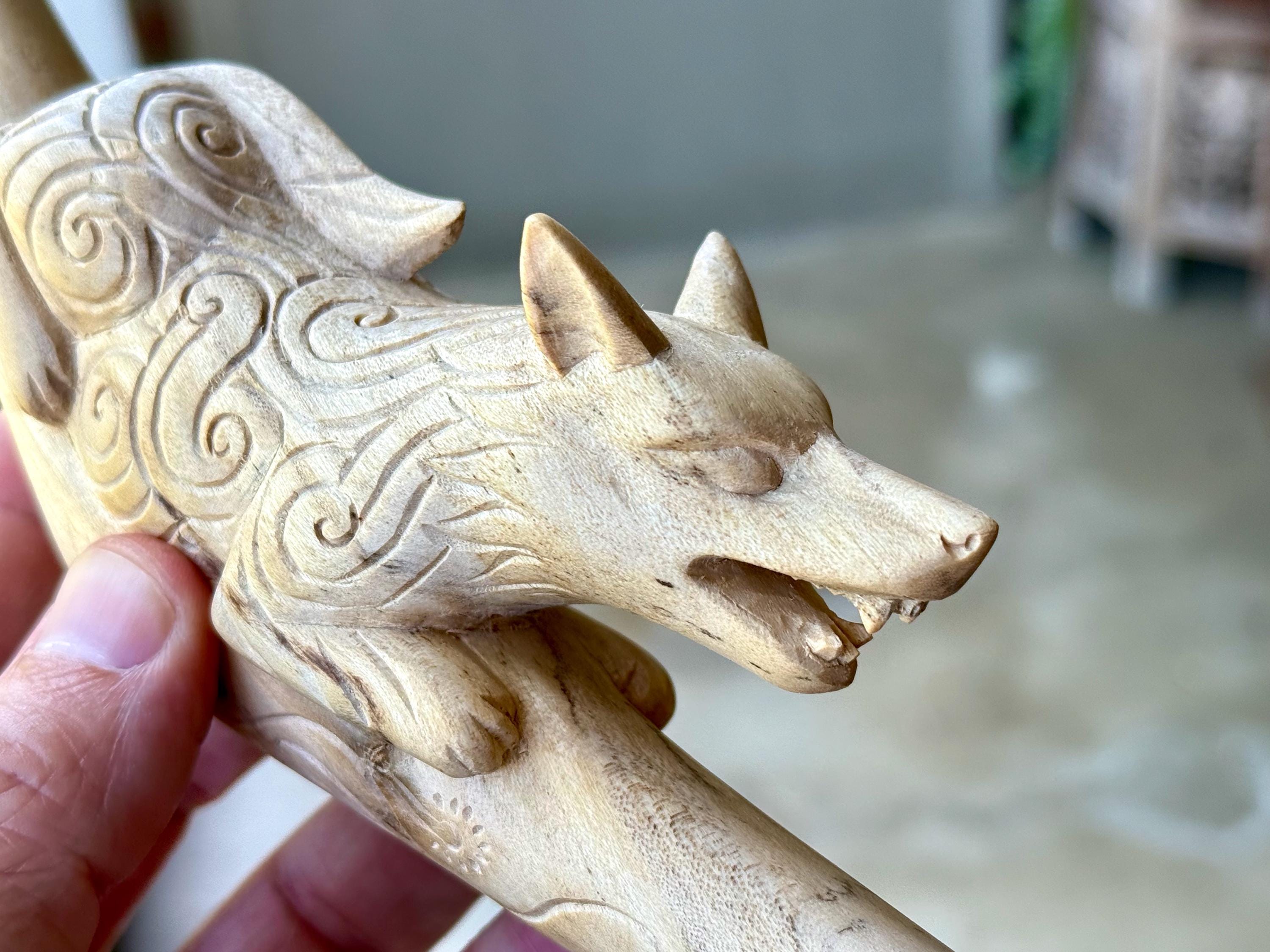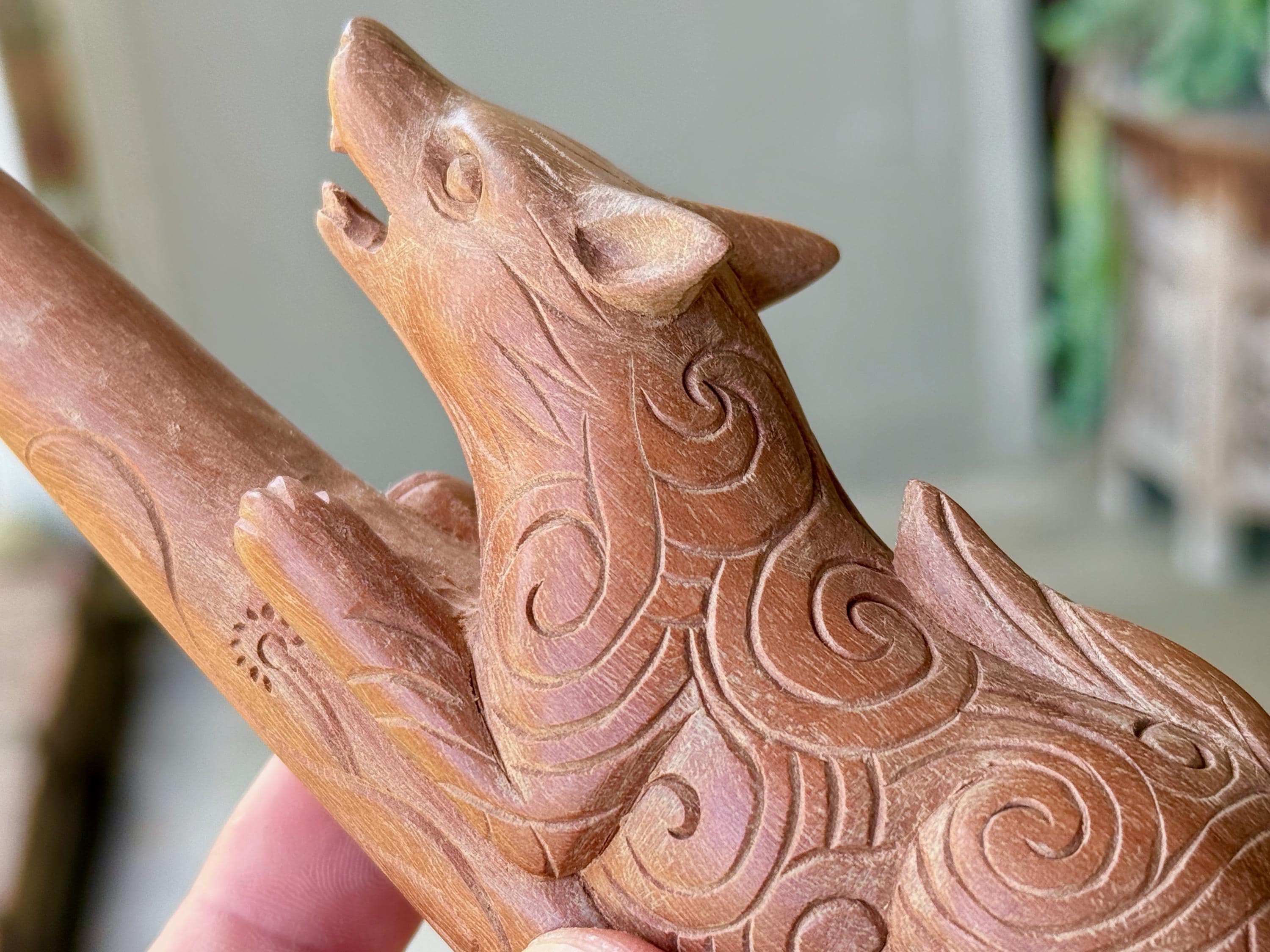 The fierce and wild protector, these wolves are carved with a "cosmic" pattern and perched atop each tepi pipe. Simply select the pipe in the wood of your preference: