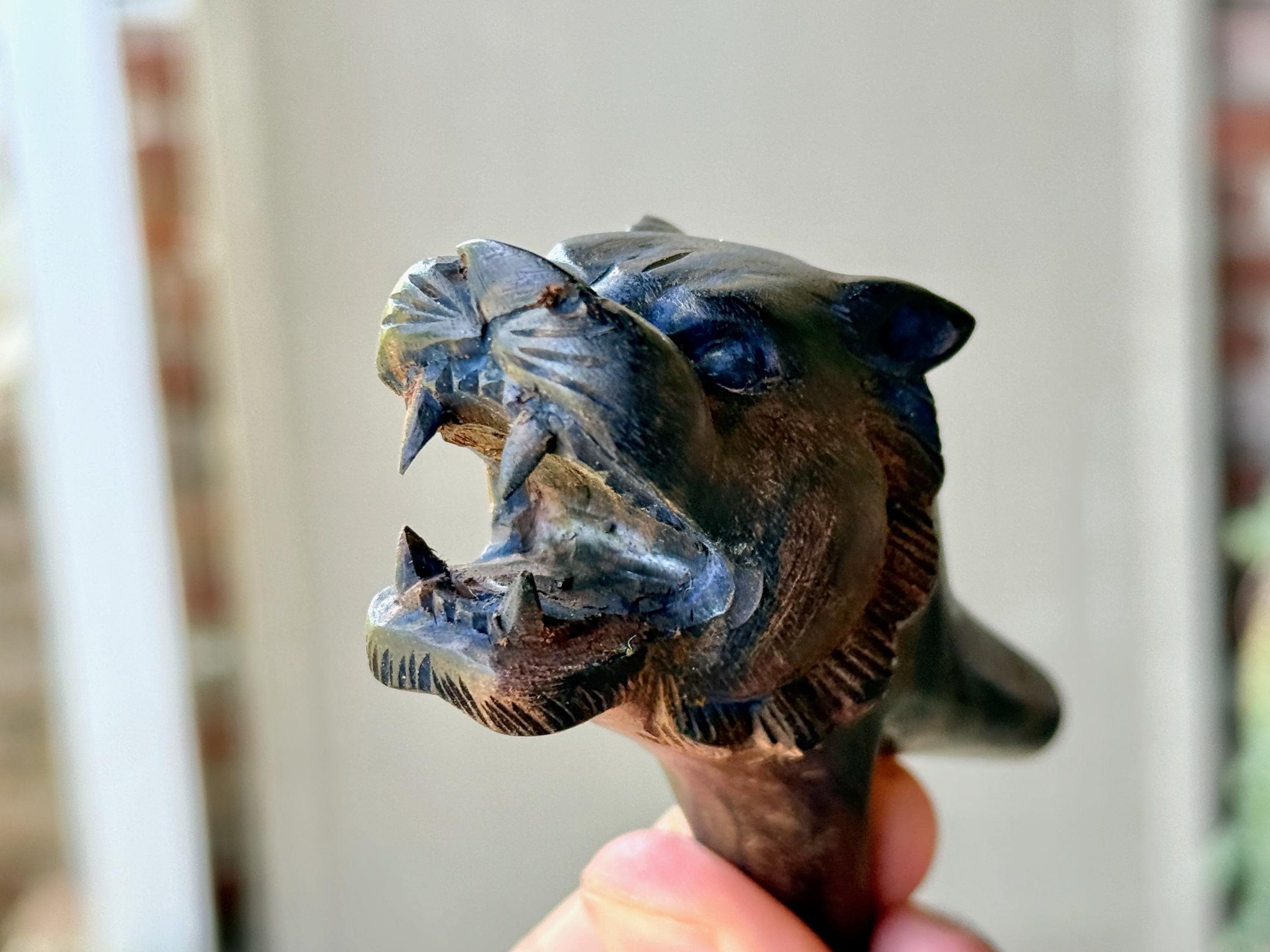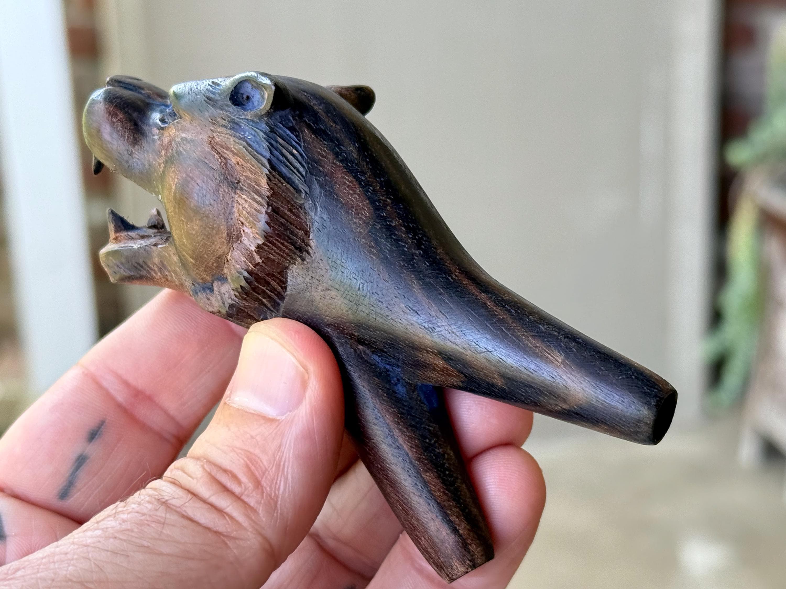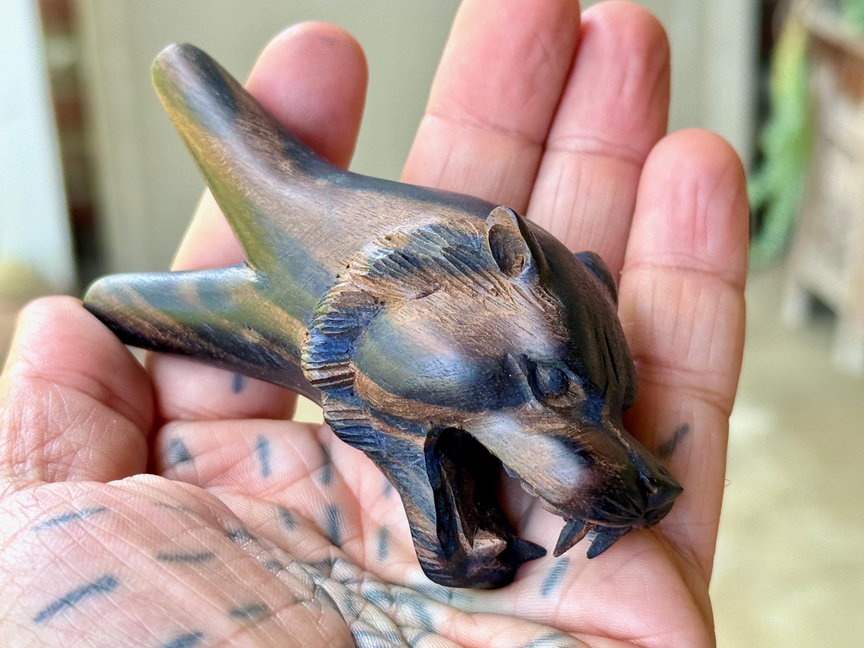 This Lion Kuripe — used for self-administering hapé — is hand carved from natural, dark tropical hardwood.