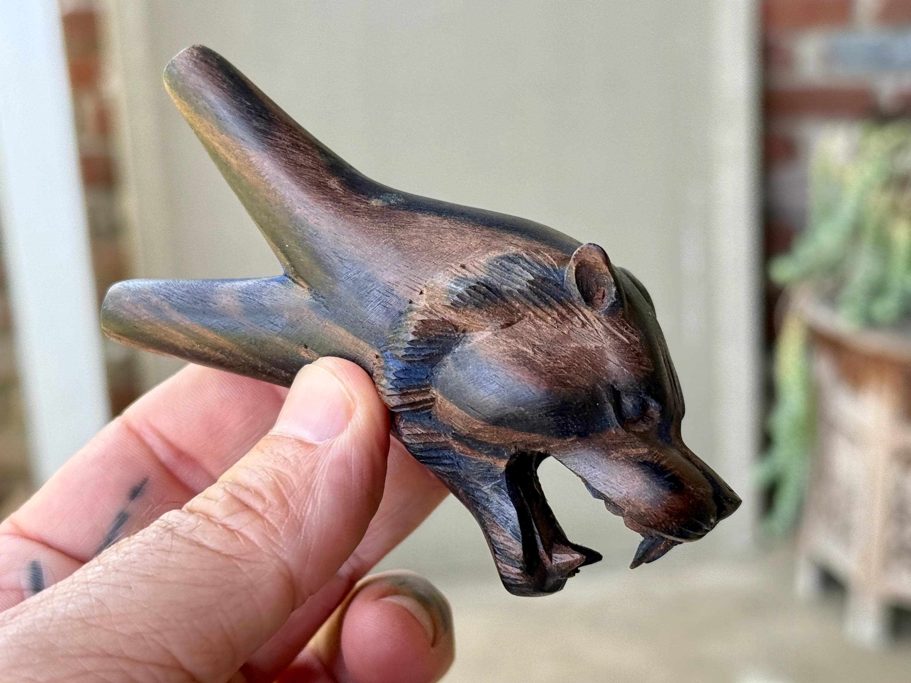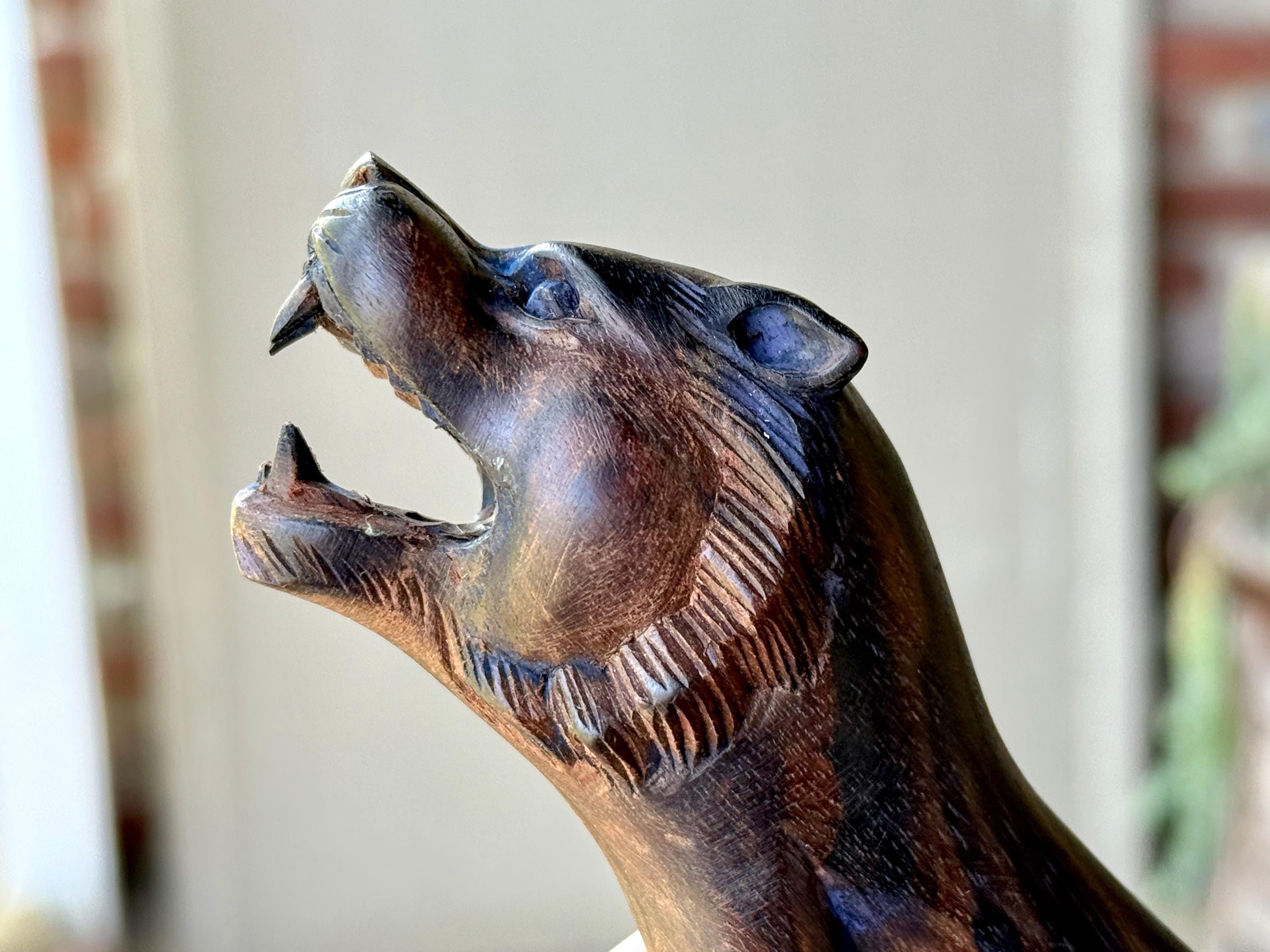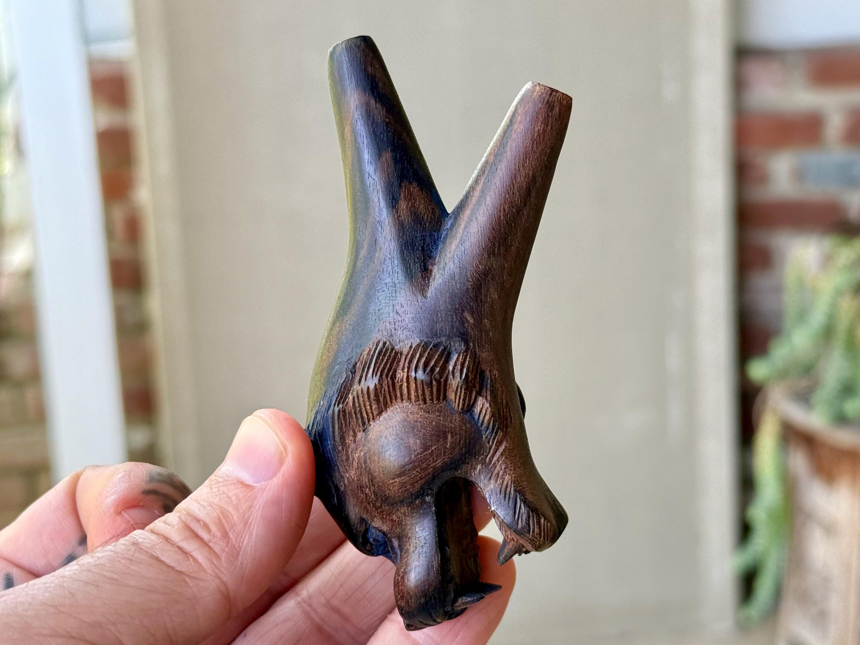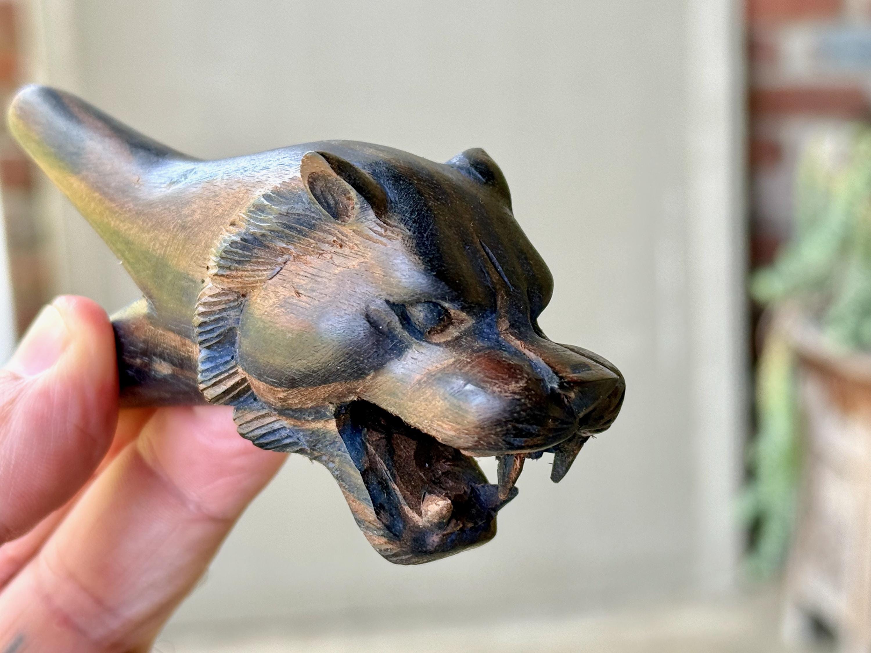 This Lion Kuripe — used for self-administering hapé — is hand carved from natural, dark tropical hardwood.