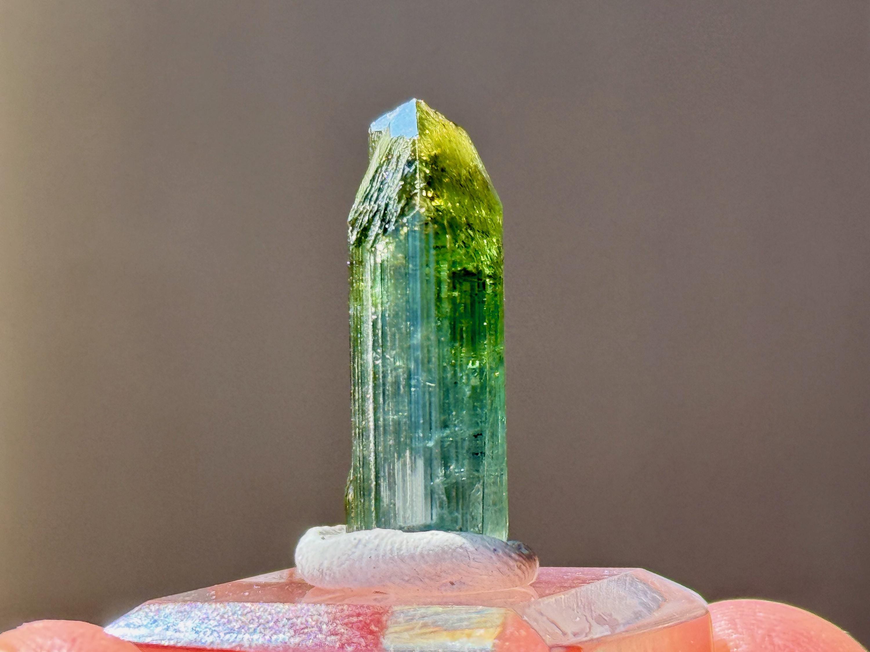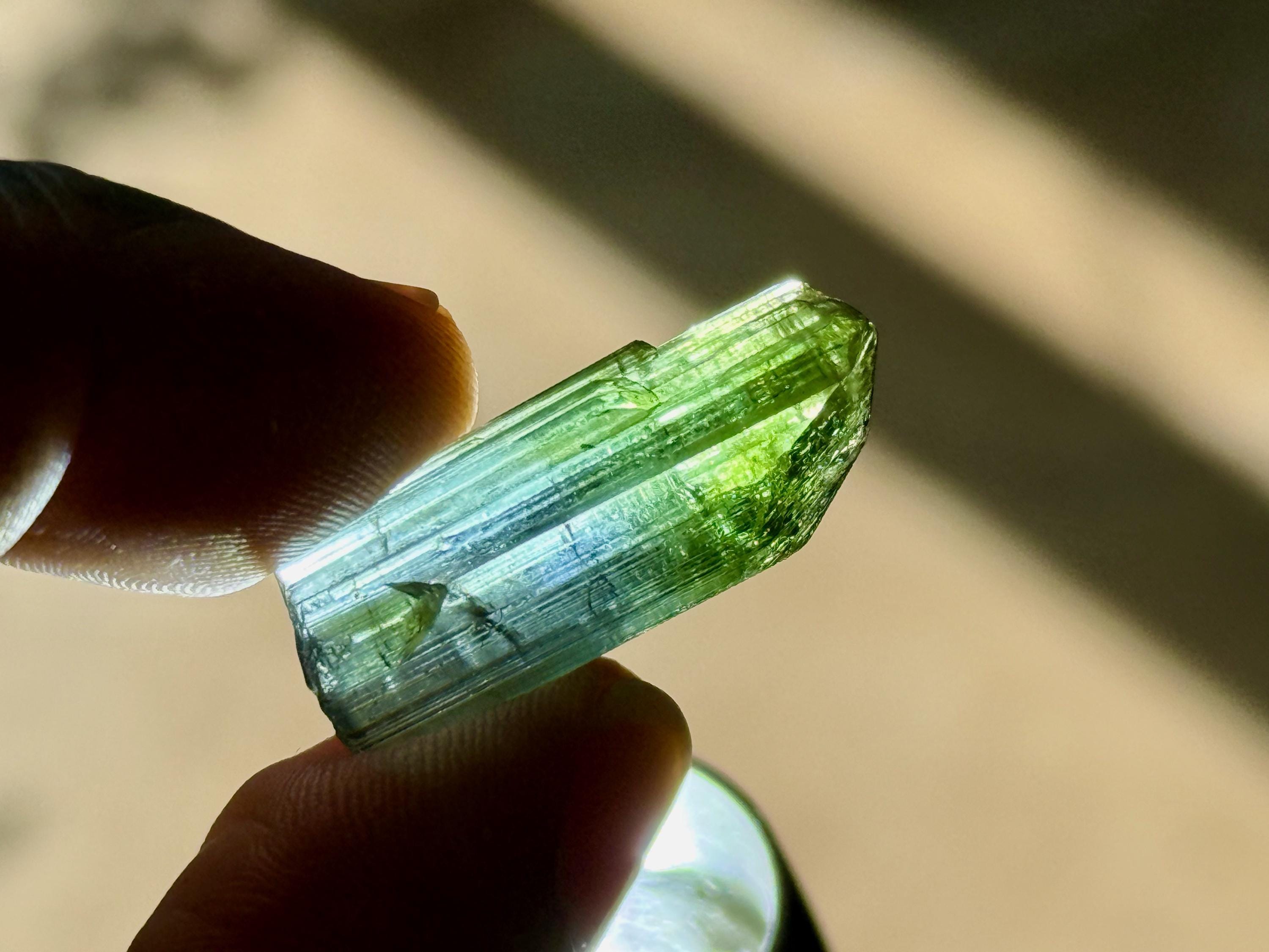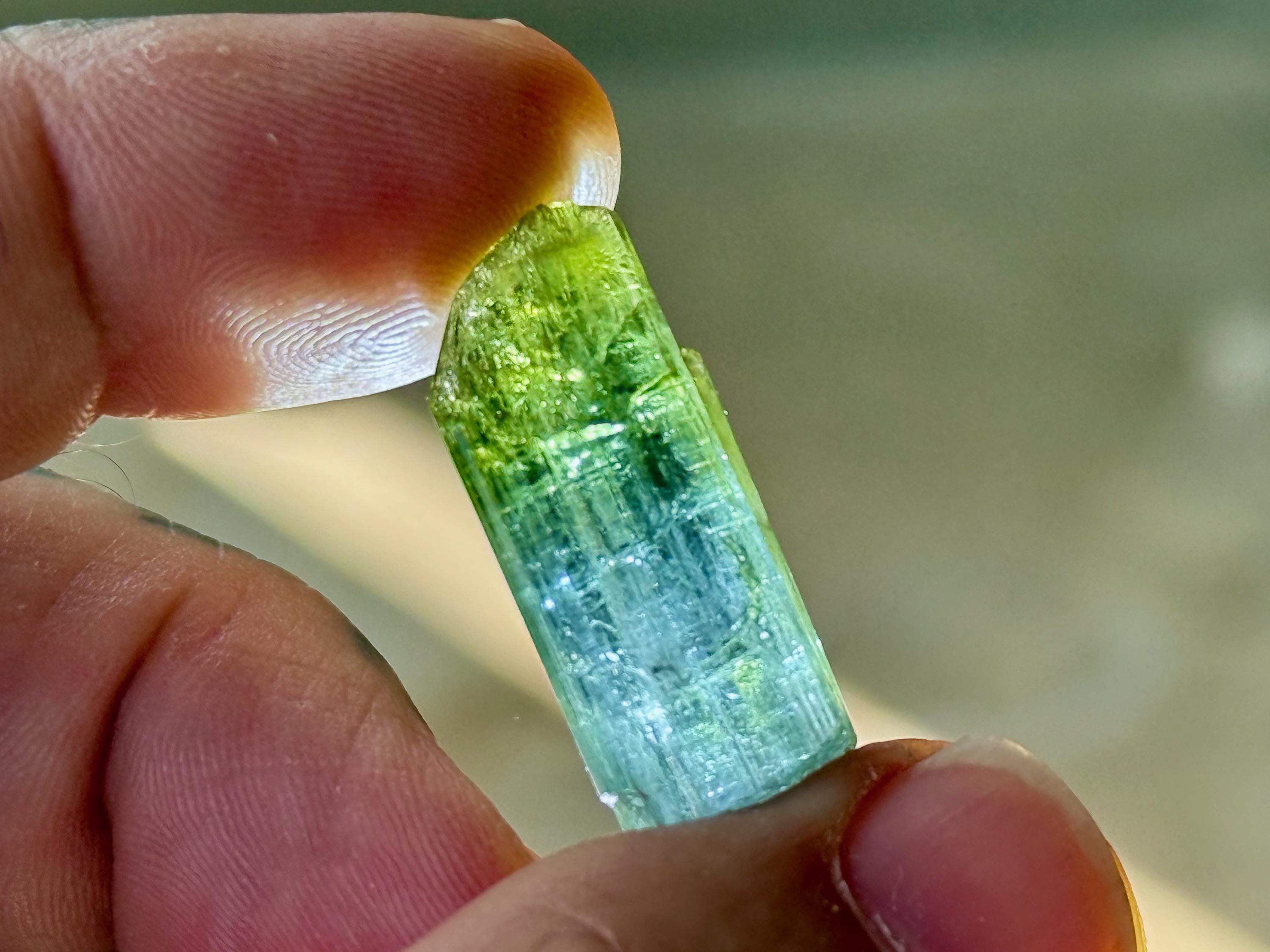 This crystal features a bicolor color gradient with pale blue at the base, blending up into vibrant green at the top. When backlit, as in Photos 6-10, we can see this color separation clearly.