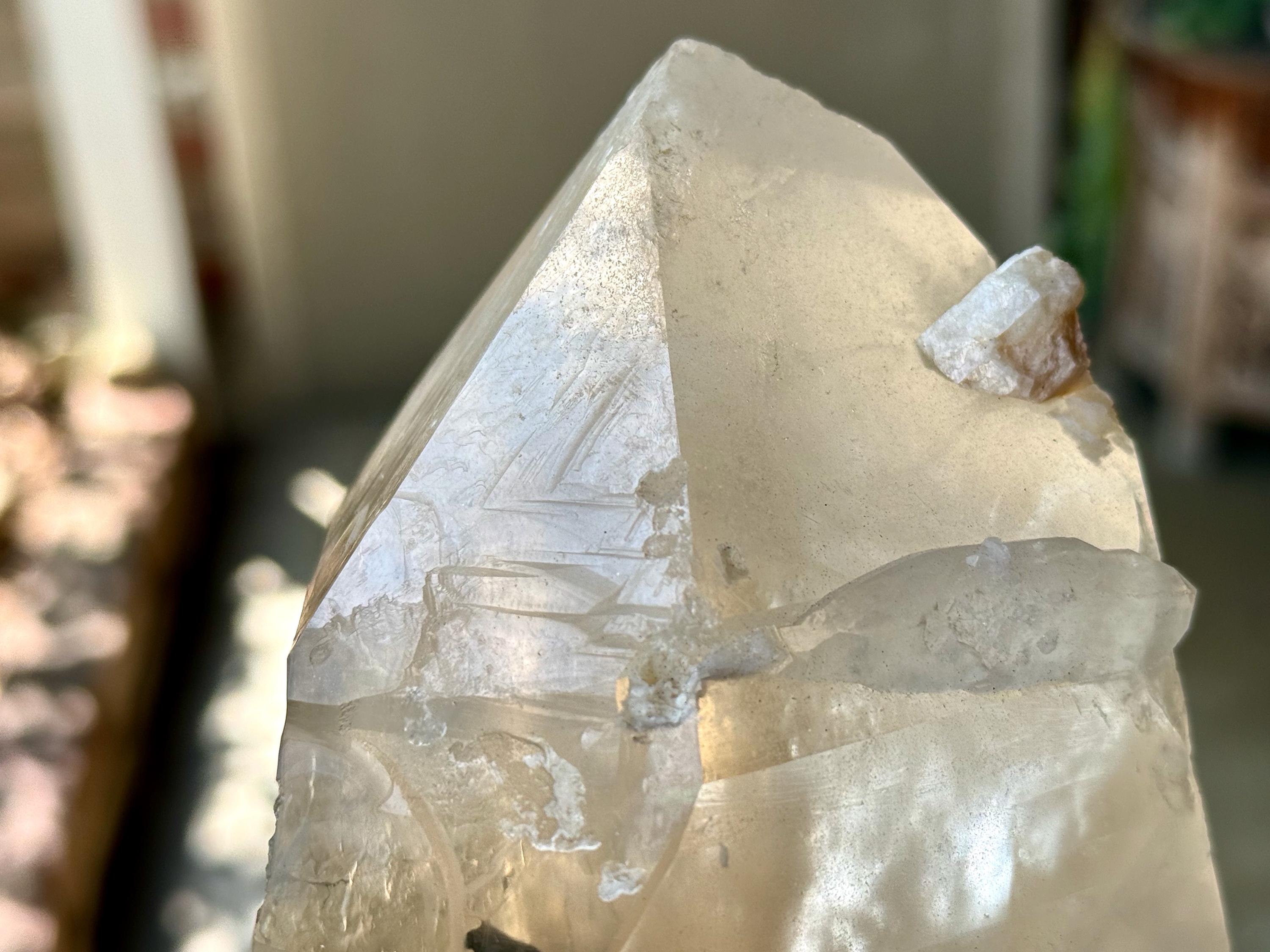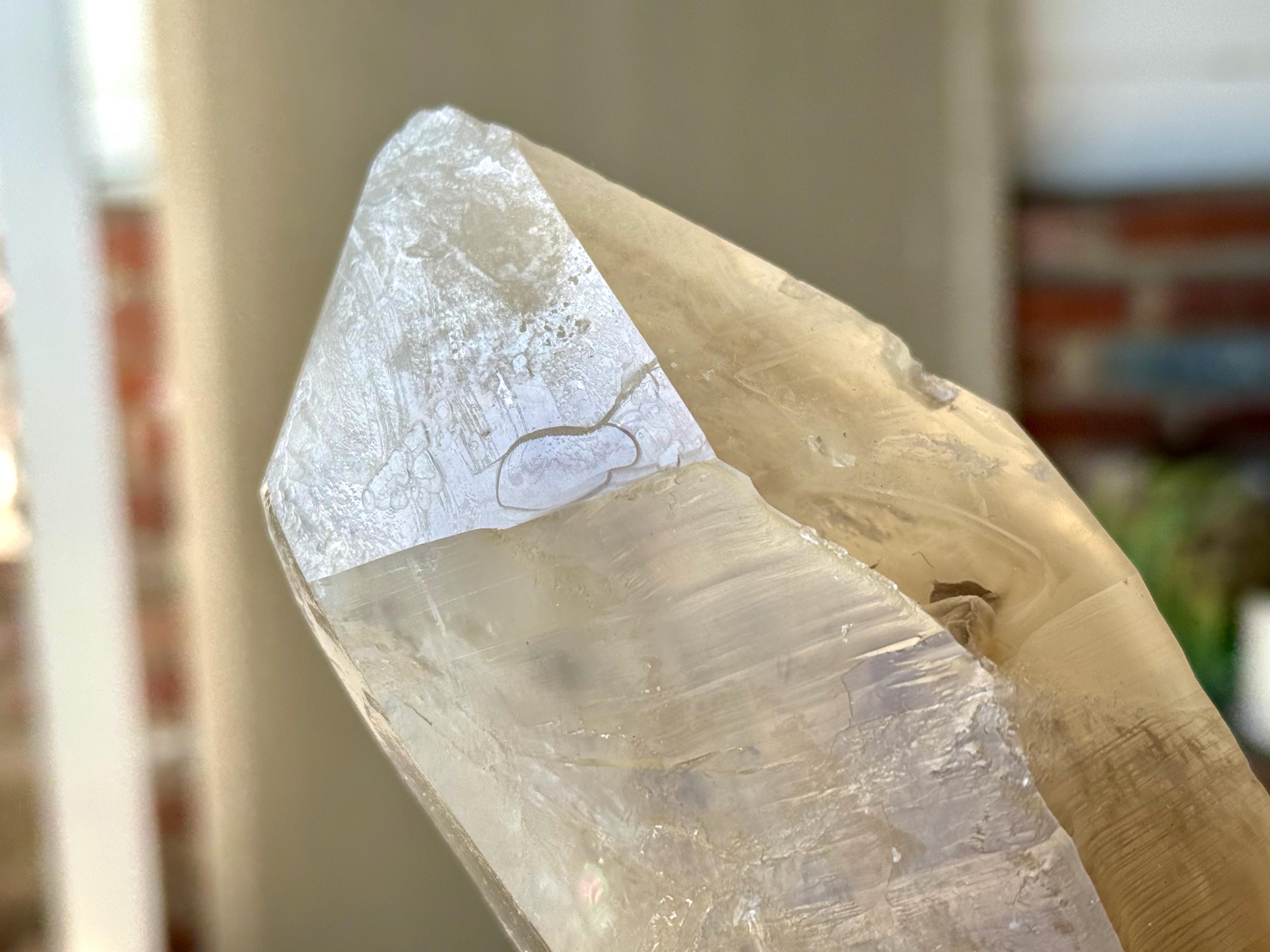 The main facet is 5-sided, making this an "Isis" crystal (see more on this formation below). Imprinted on the main facet are several Record Keeper triangles (Photo 8). Within the main facet area, you may see some mild flashing rainbows deep within, when the light is right.