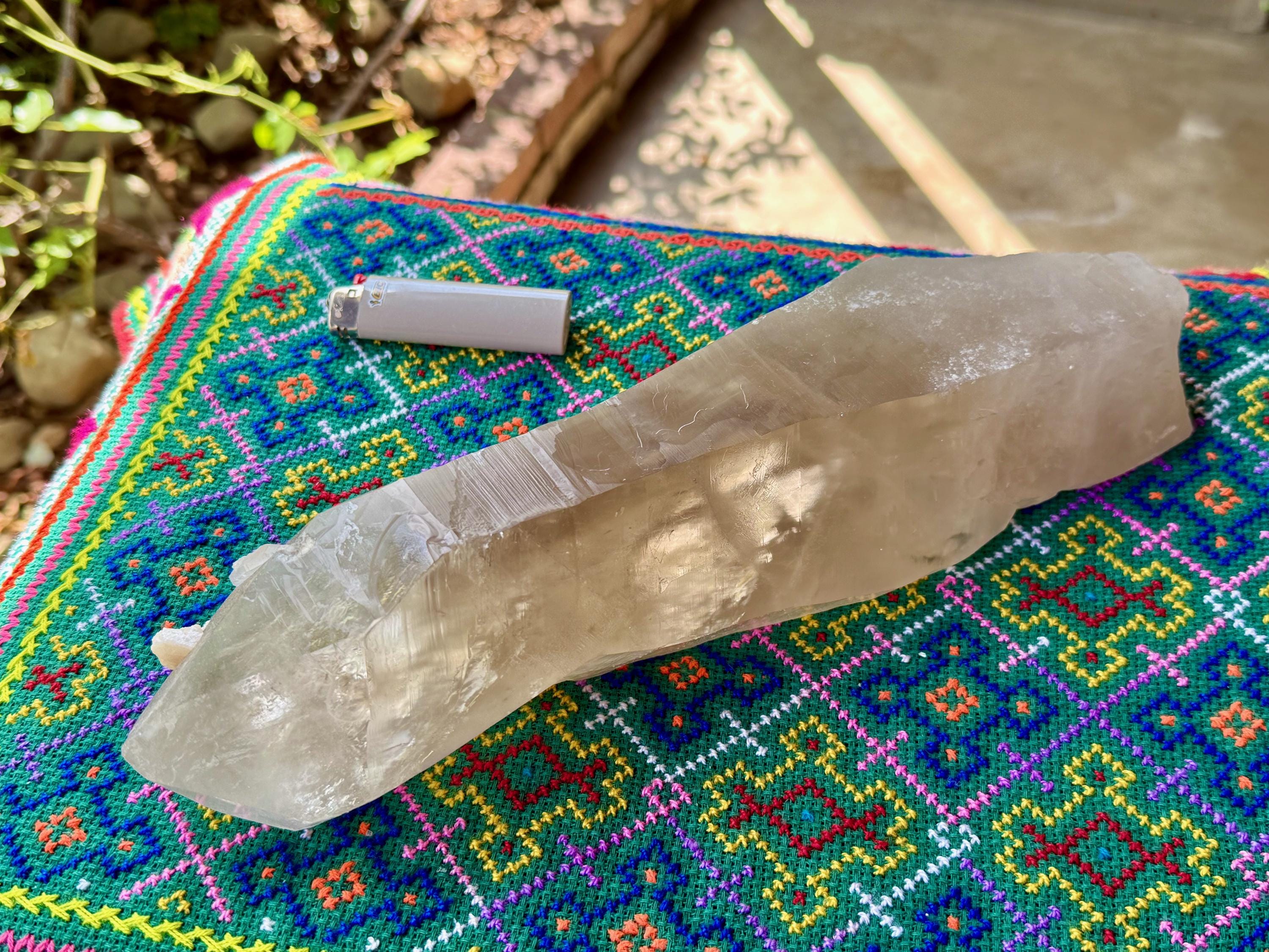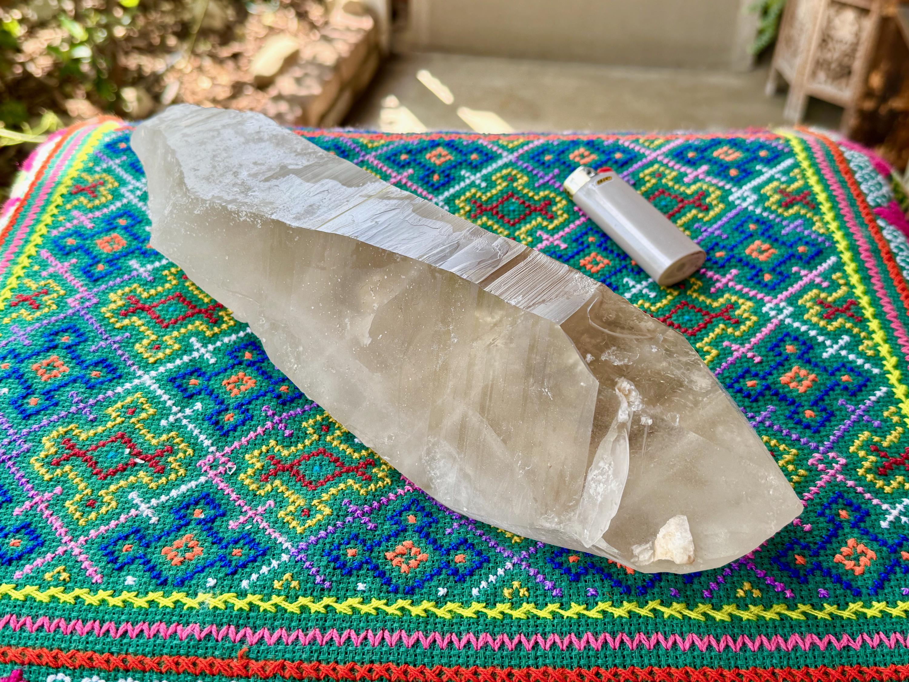 This crystal has a completely self-healed underside, which is also naturally flat, allowing this piece to lay on its side for display. We've included a standard lighter in some of these photos to show the relative size comparison (Photos 4-6).