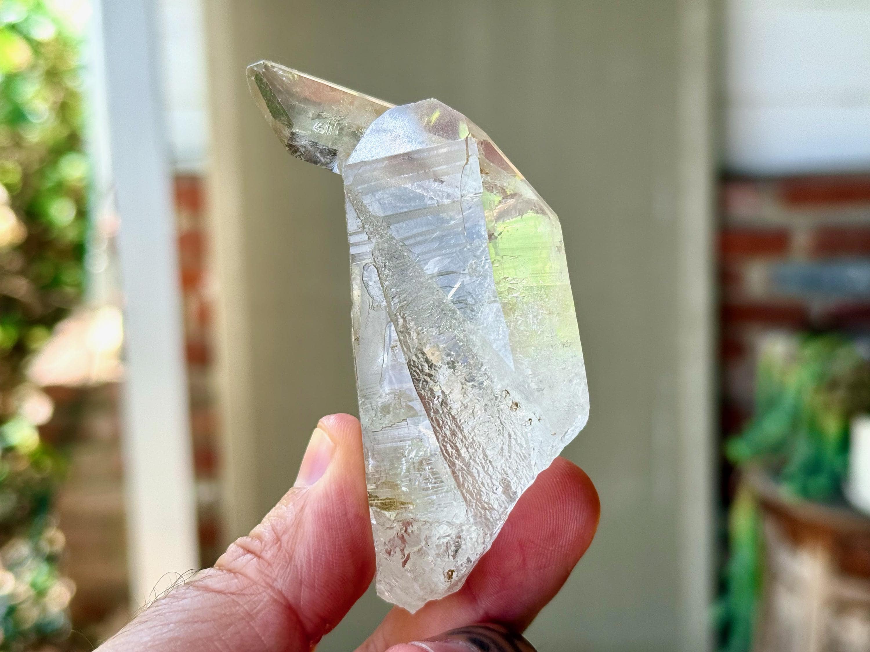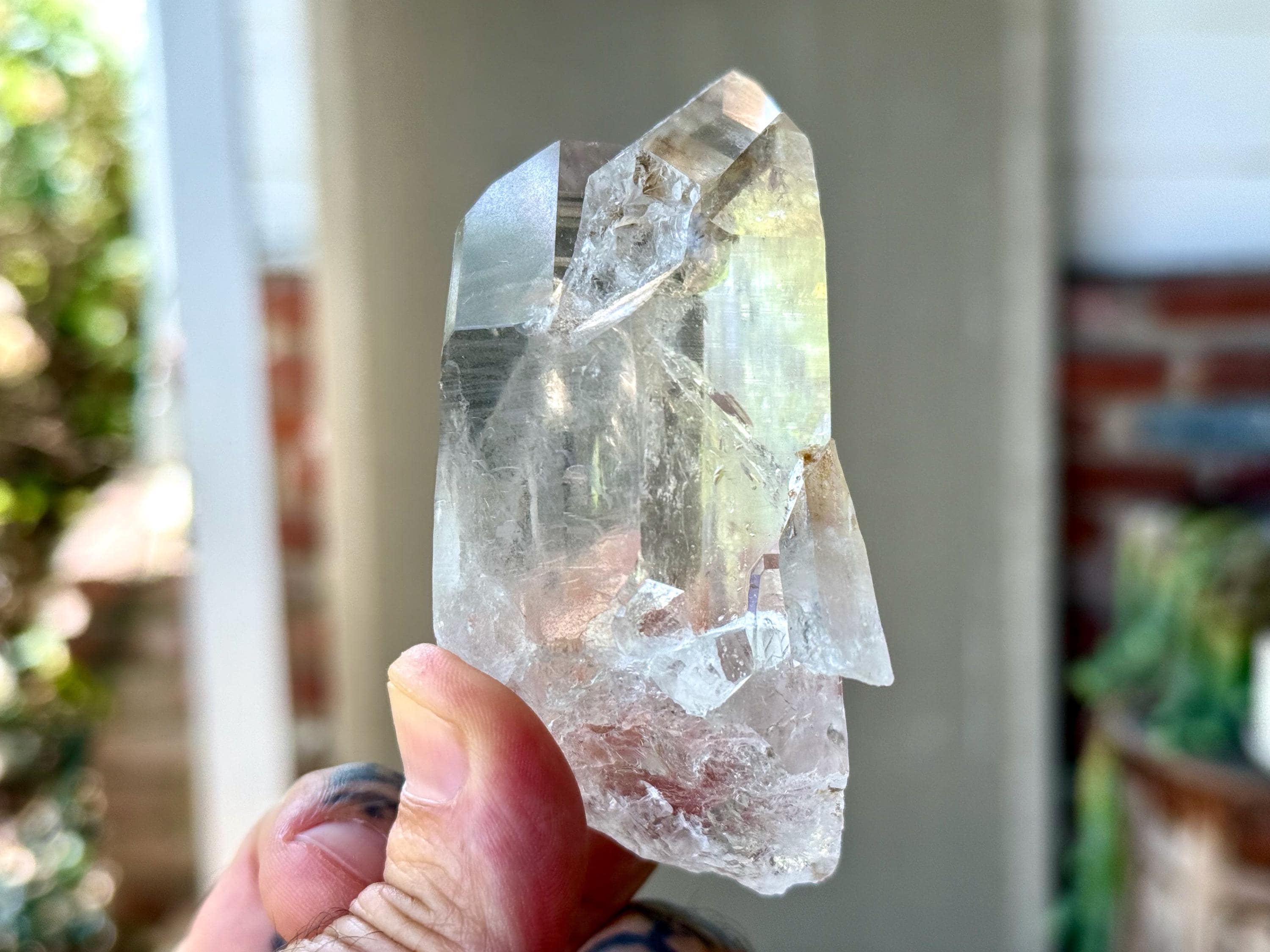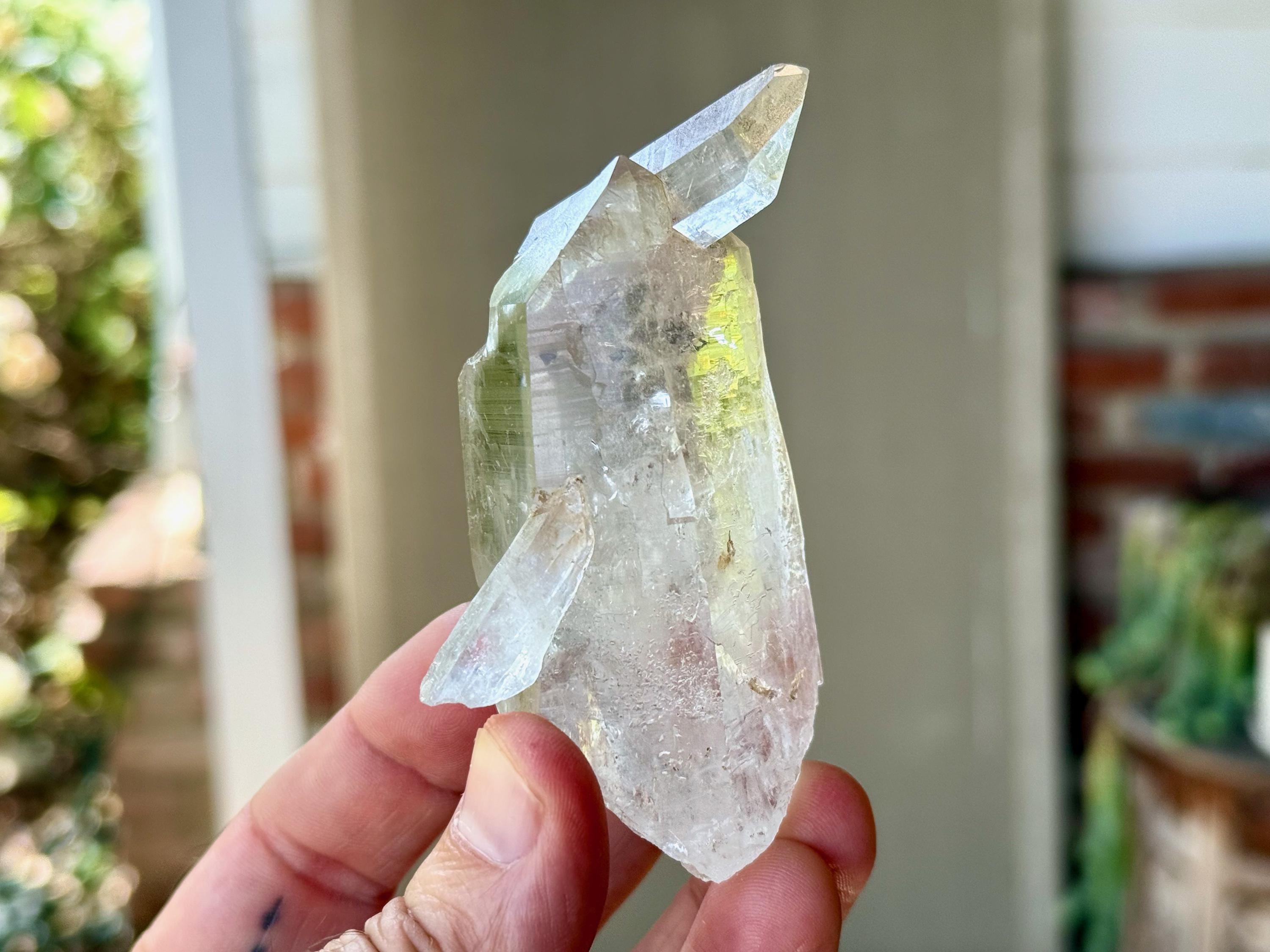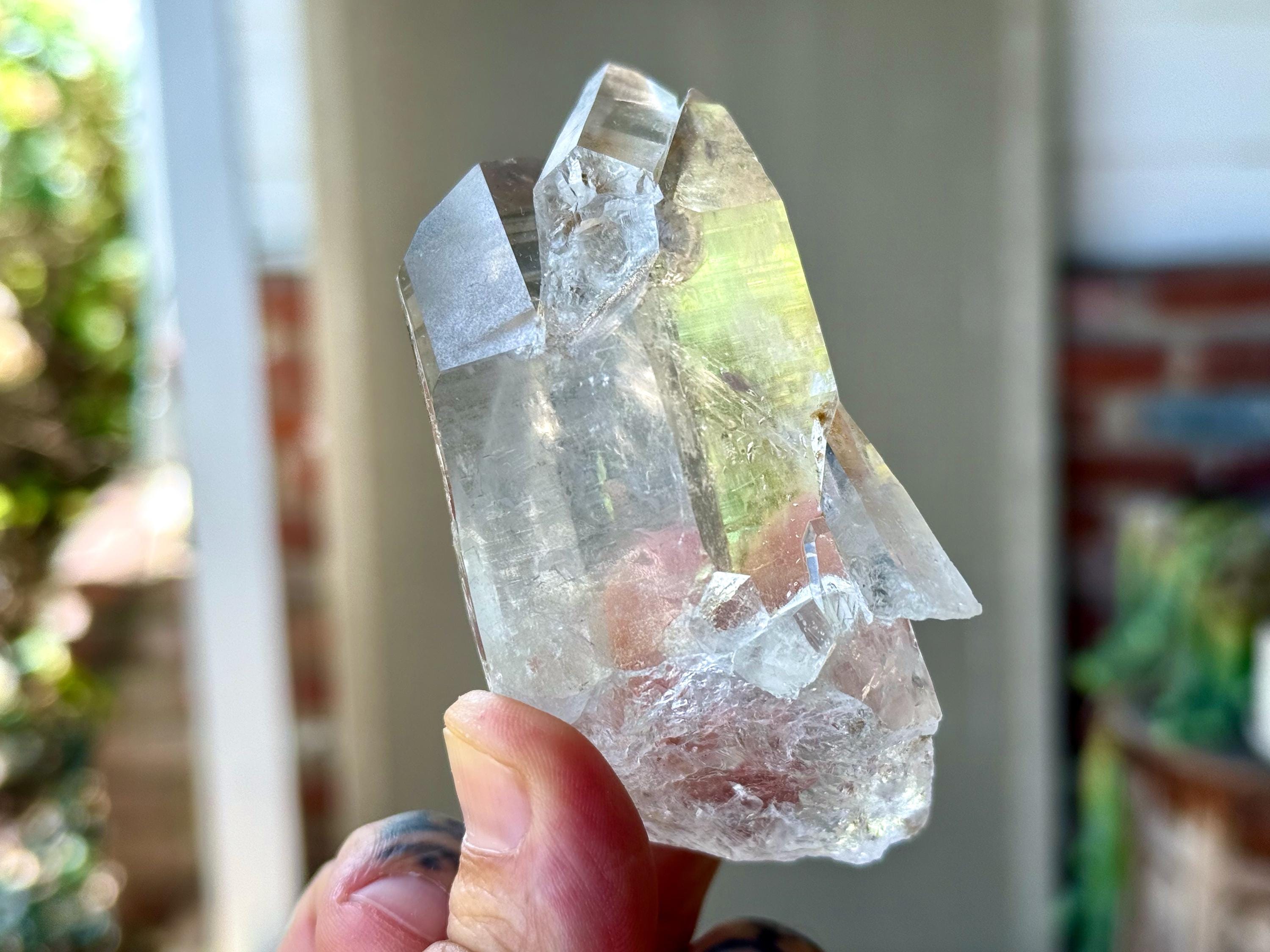 *Please note this crystal is clear and colorless. Any yellow hues in the photos are due to the natural sunlight and surrounding environment reflecting off the crystal.