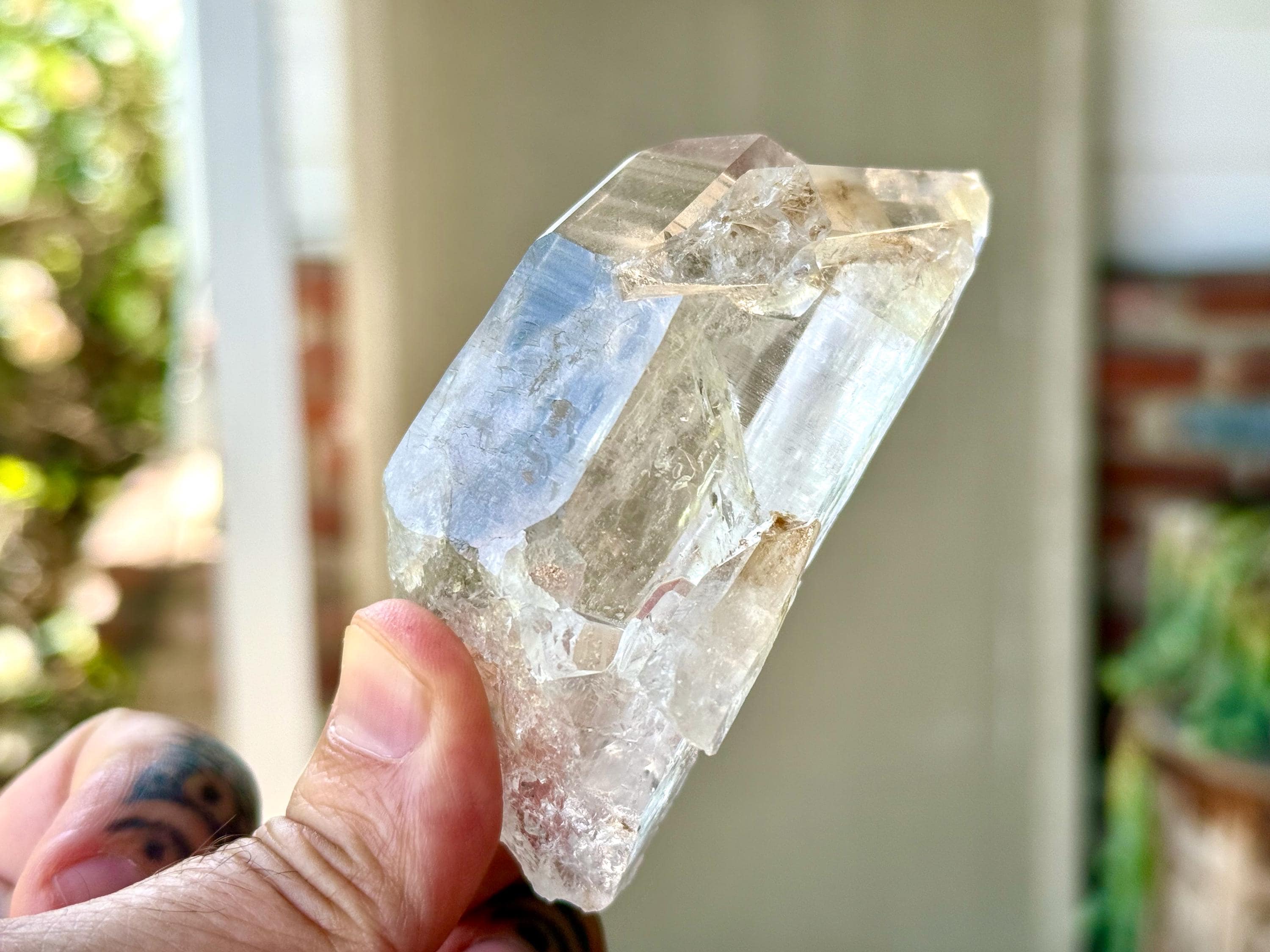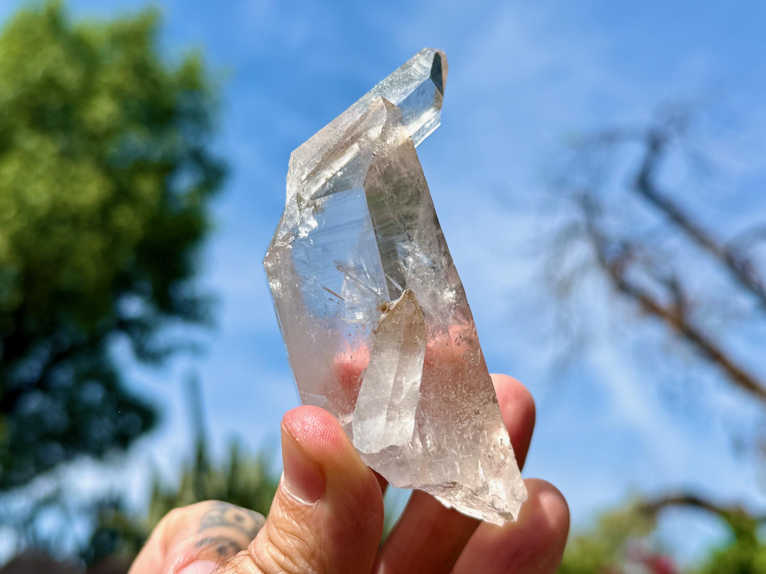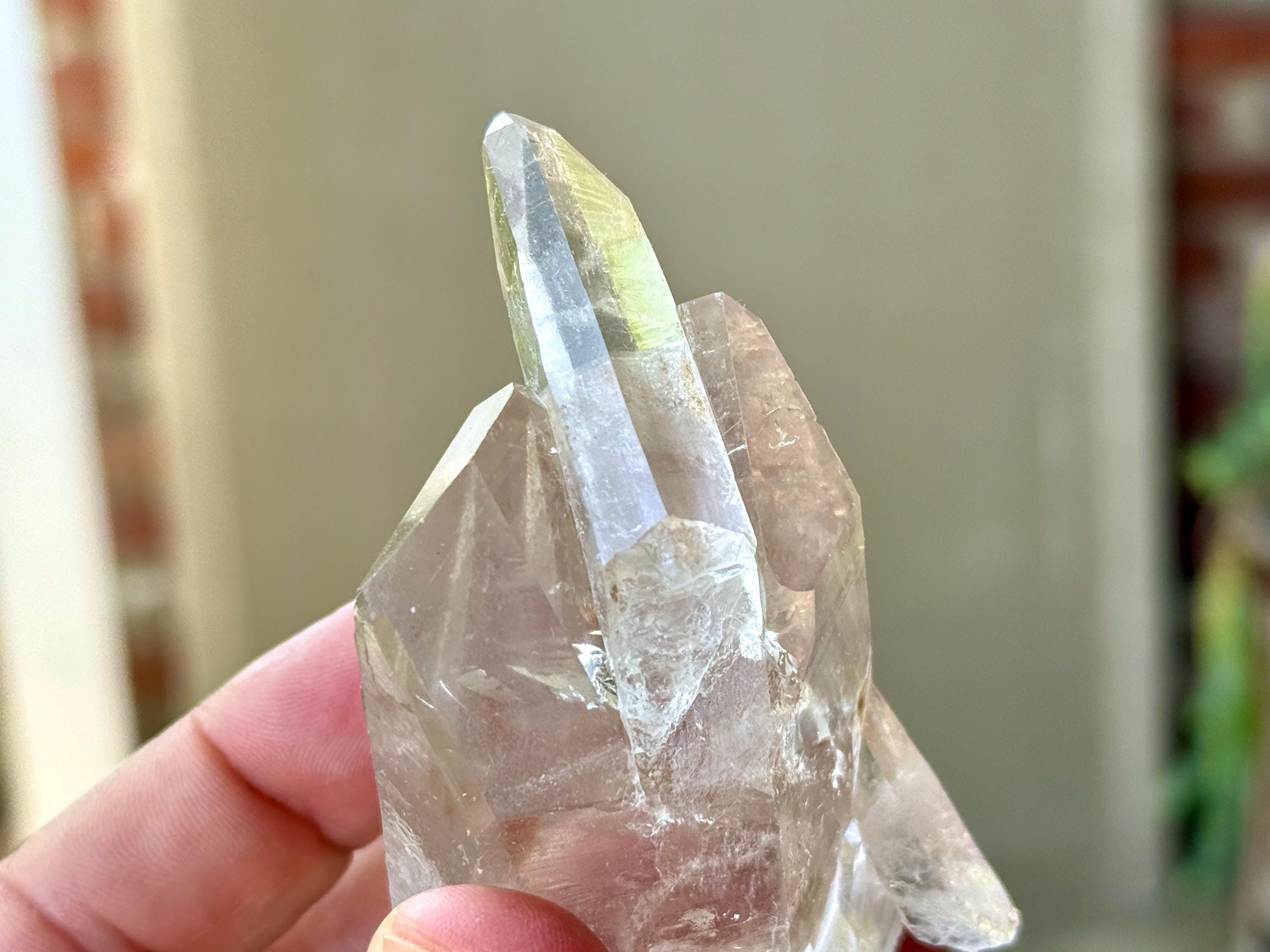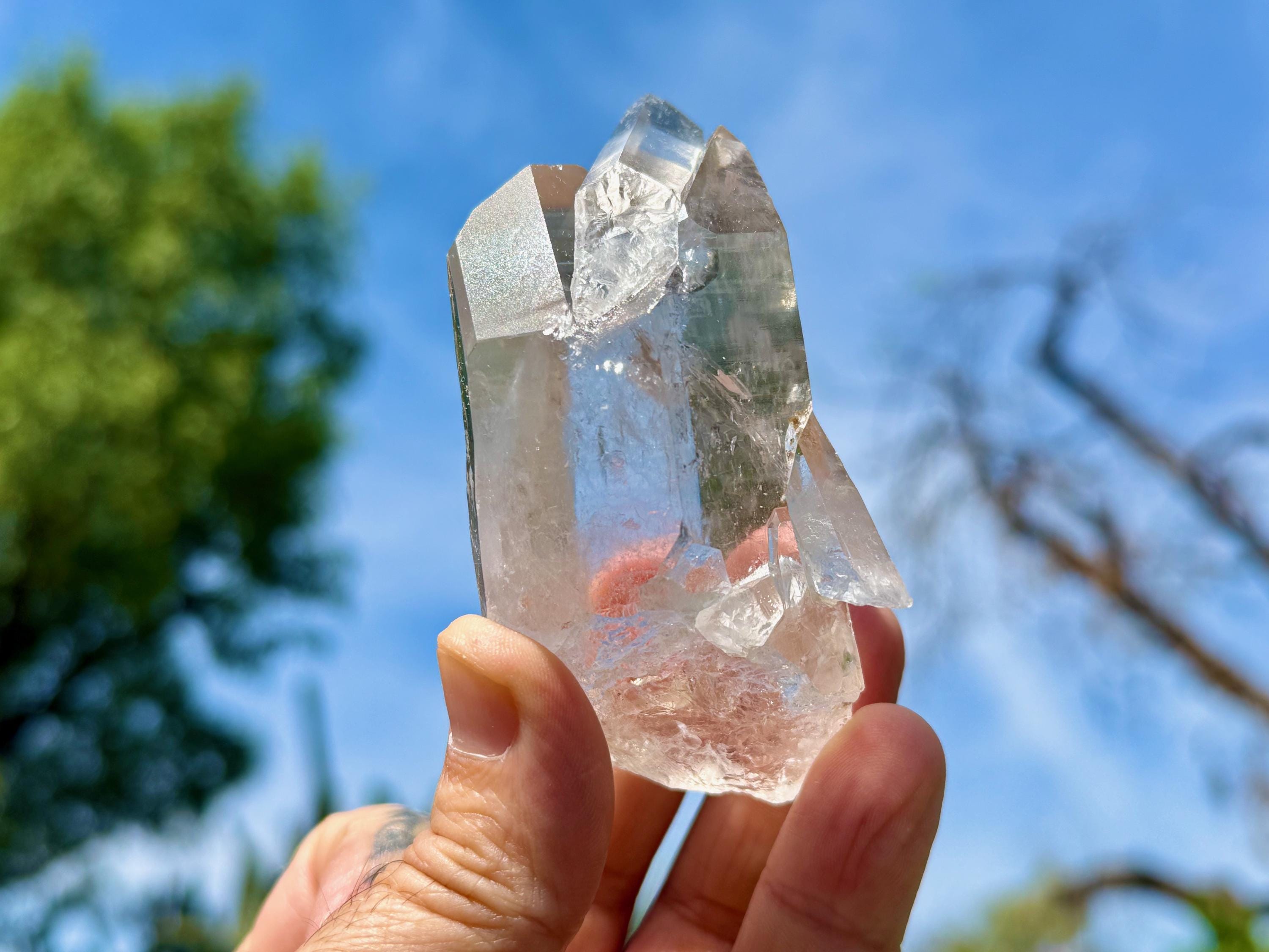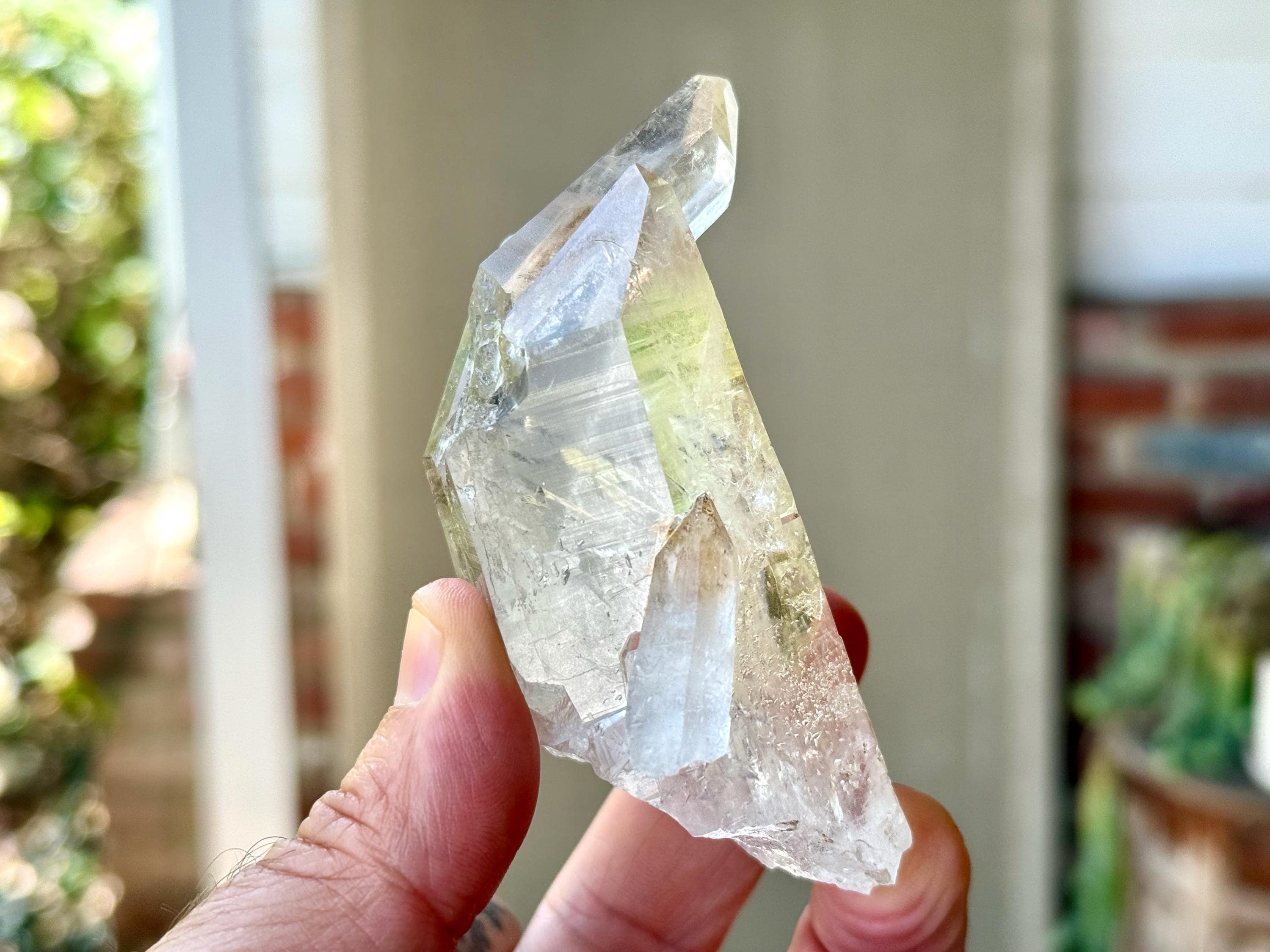 *Please note this crystal is clear and colorless. Any yellow hues in the photos are due to the natural sunlight and surrounding environment reflecting off the crystal.