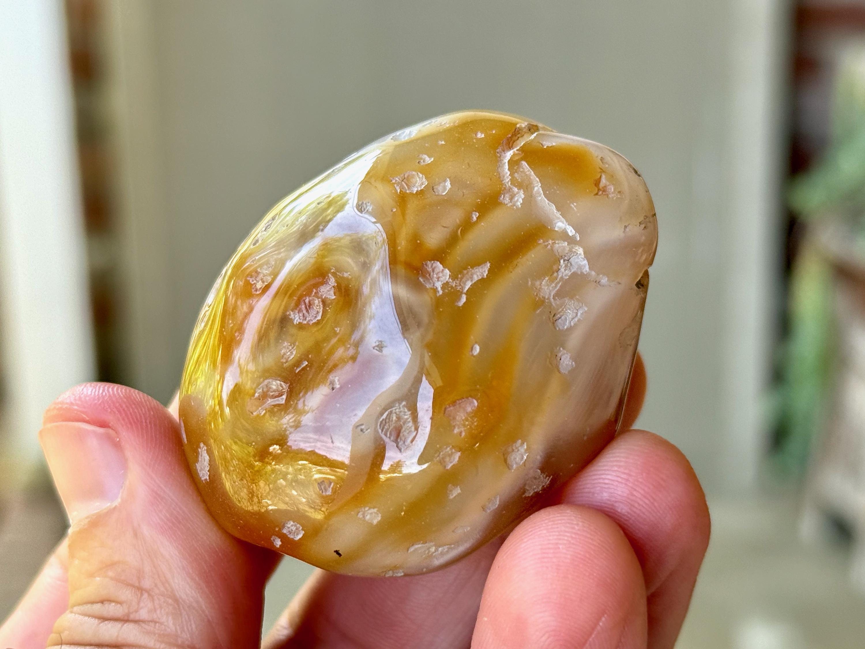 The term for this natural phenomenon is "Enhydro" and it occurs when water is trapped inside of an Agate (or crystal) during its millions-of-years development. These Agates have been polished so that one can see the water moving within when backlit (with a flashlight, for instance). In many cases, you can actually hear the water swishing if you shake it next to your ear. This is an incredibly rare phenomenon, as most Enhydro crystals contain only the smallest drop of water. These very special stones bring a balance between the elements of Earth and Water, increased spiritual receptivity and balance.