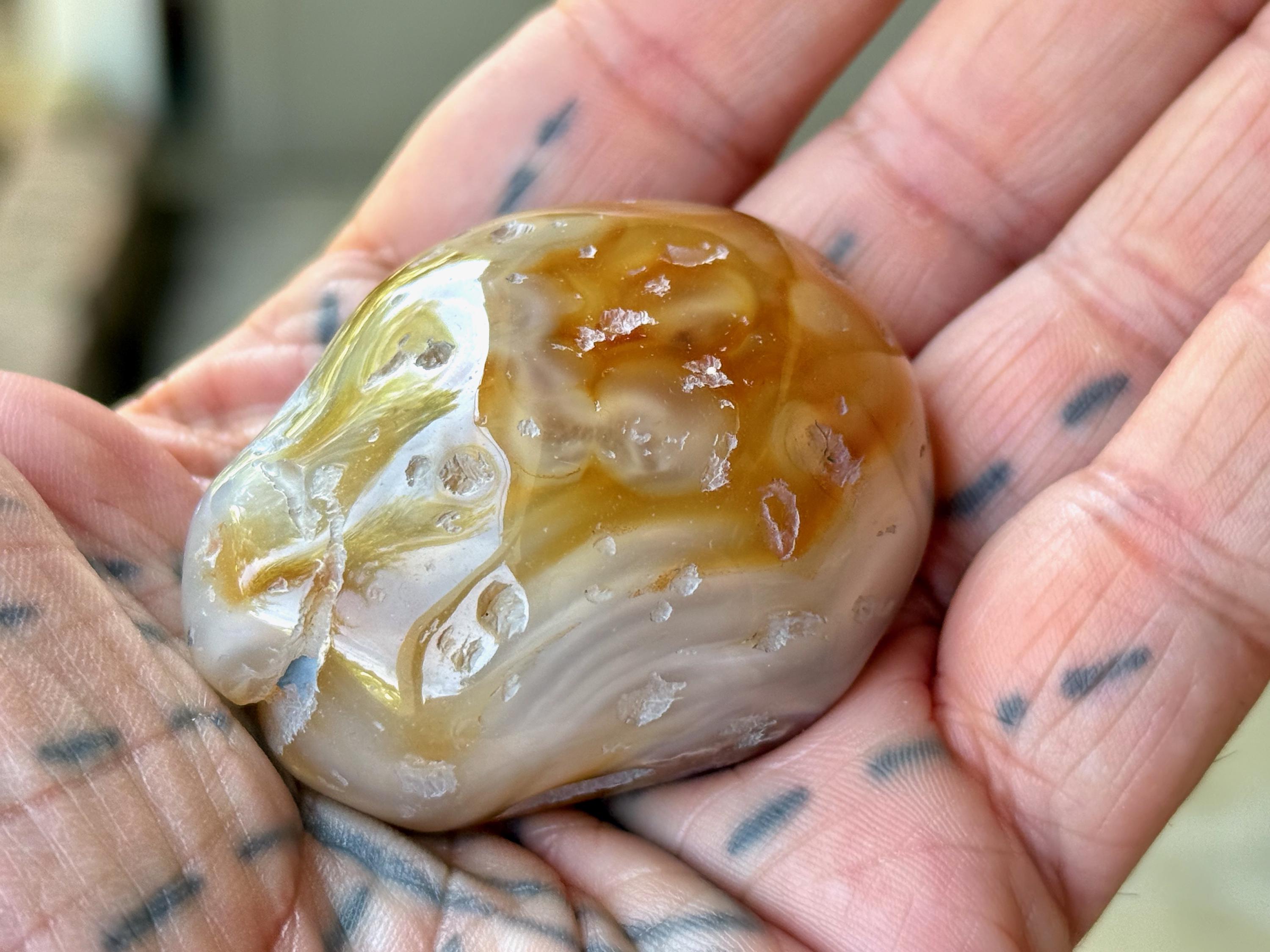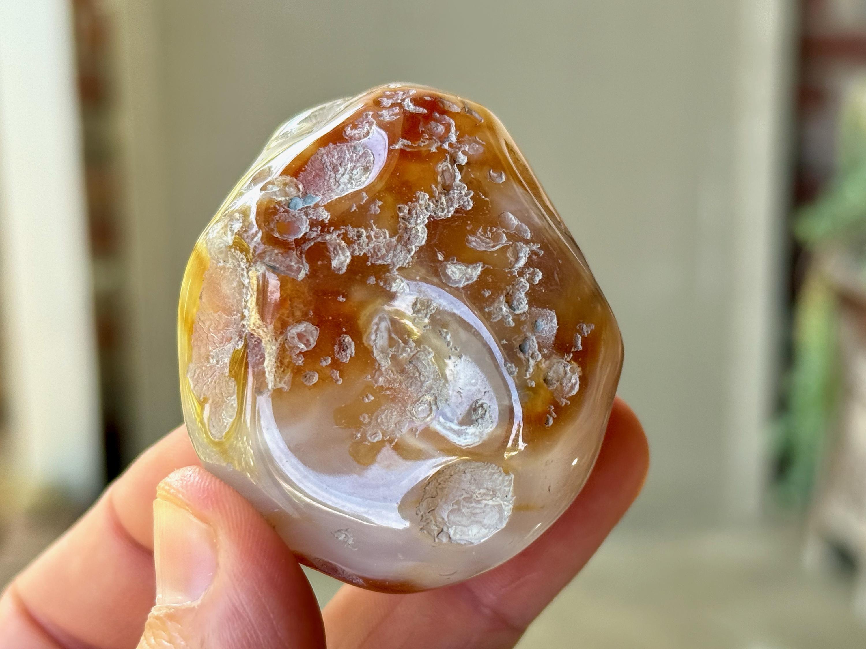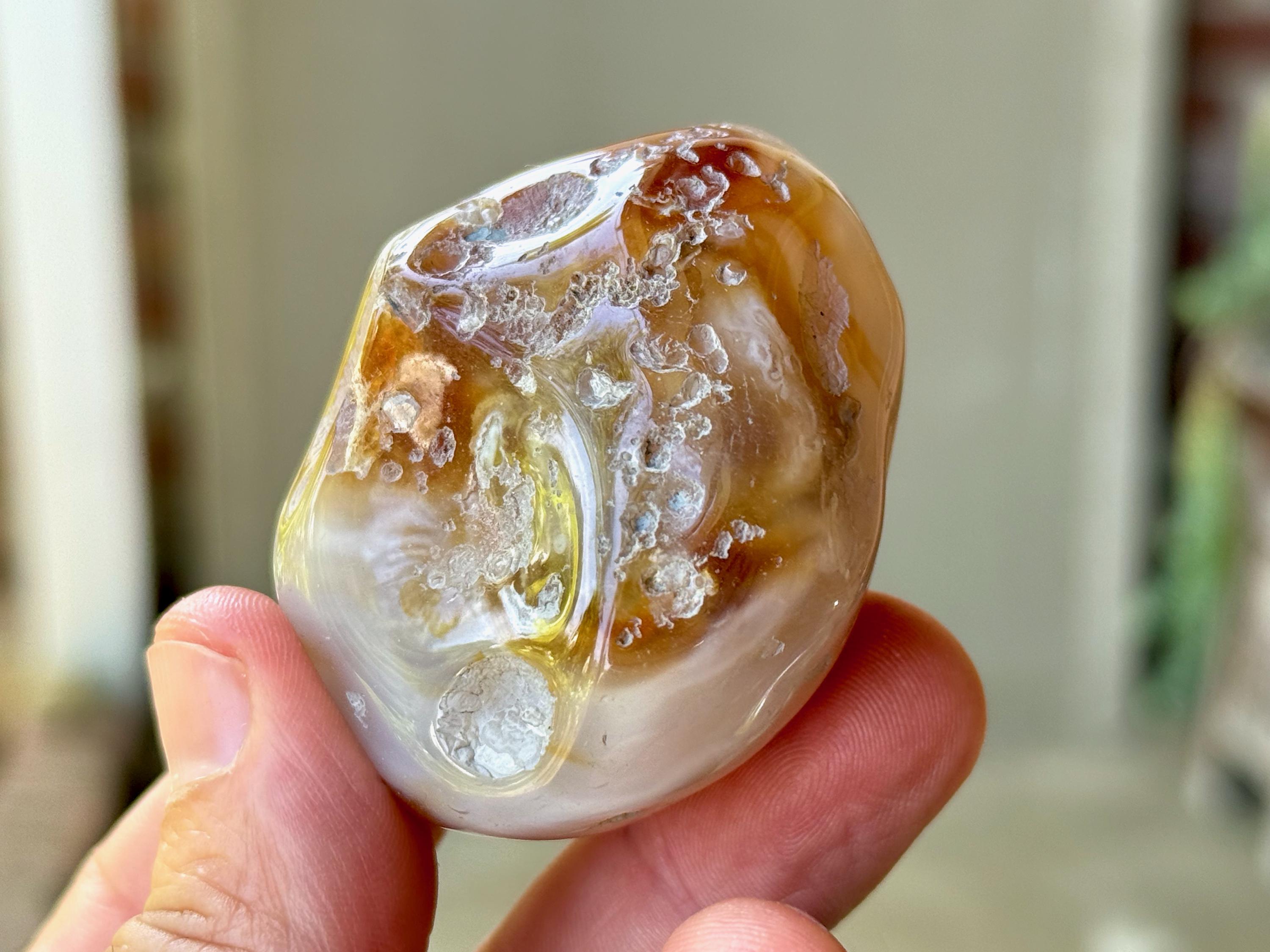 One of the best from this collection! Beautiful swirling patterns of orange and white adorn this aquatic Enhydro Agate. Of course what is most special about this piece is that it is absolutely FILLED with ancient water.