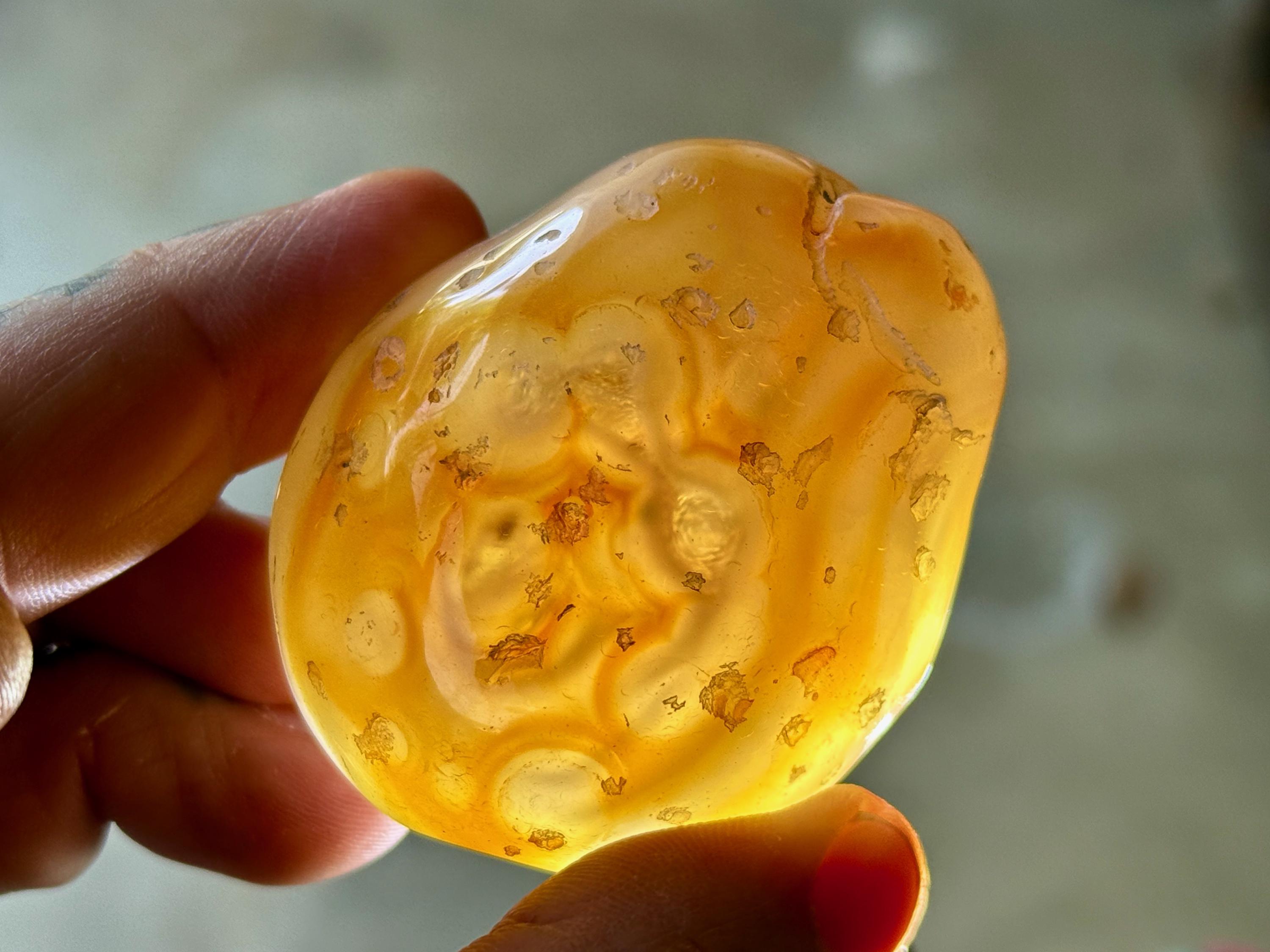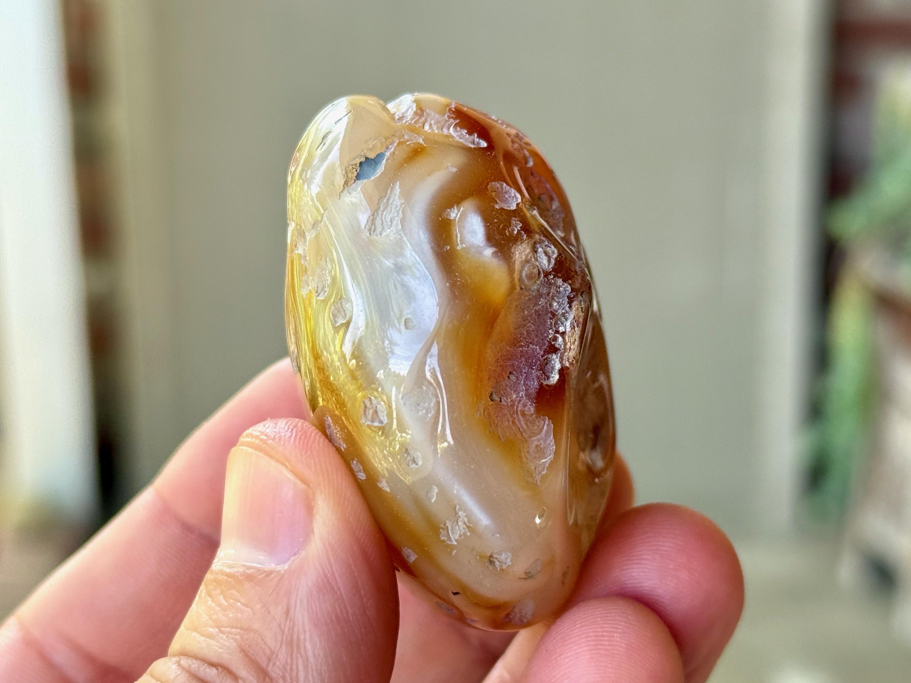 An Enhydro is the term for the natural phenomenon that occurs when water is trapped inside of an Agate (or crystal, etc) during its million-of-years development. In most cases of Enhydro Quartz (or other crystals), only a droplet of water is included, and it may move if contained within an air pocket. In the case of these Enhydro Agates, there is an ample amount of water included, so much that in most cases one can see it move if the Agate is backlit (with a flashlight), and in some cases even hear it swishing around when shaken.