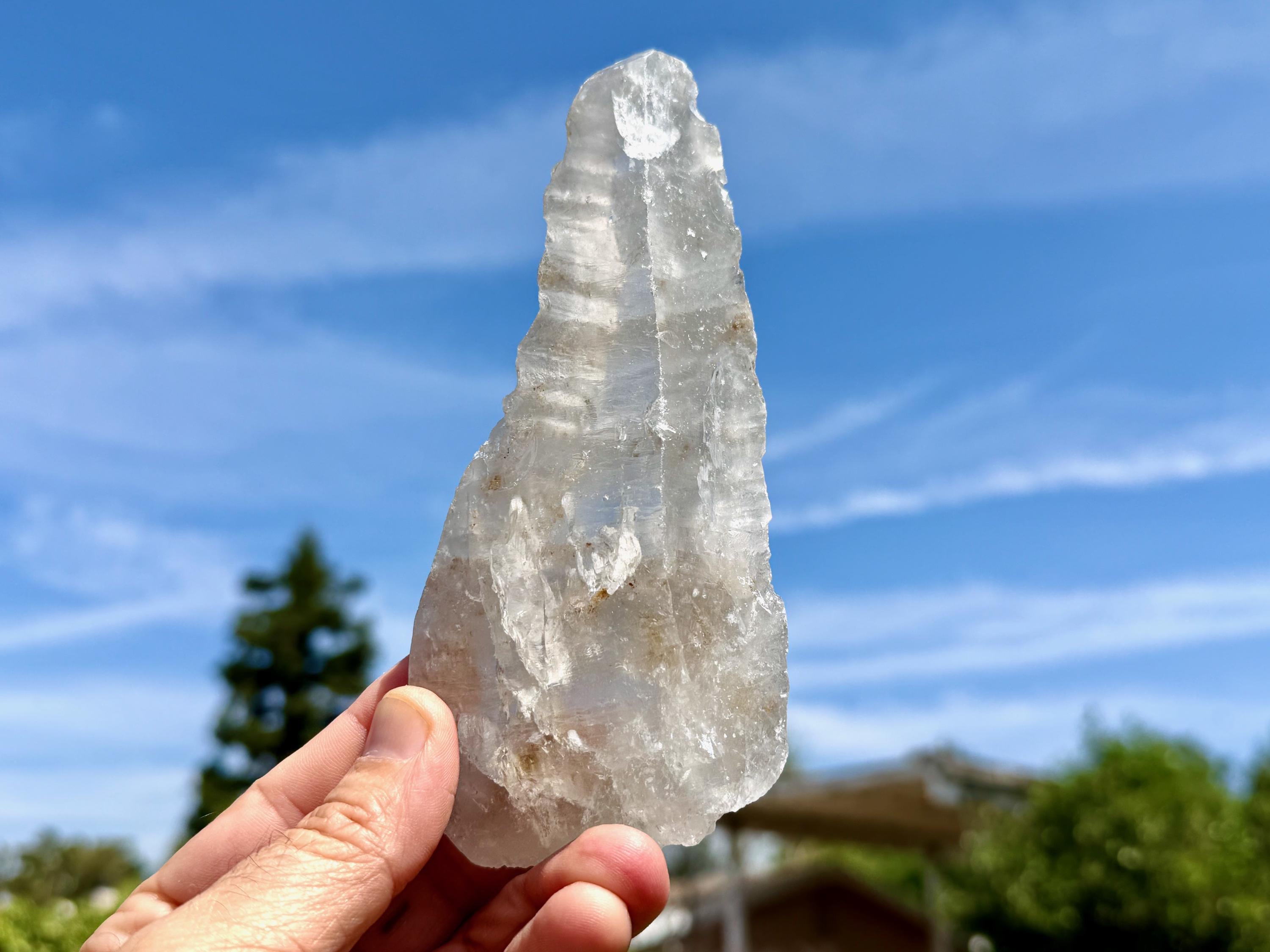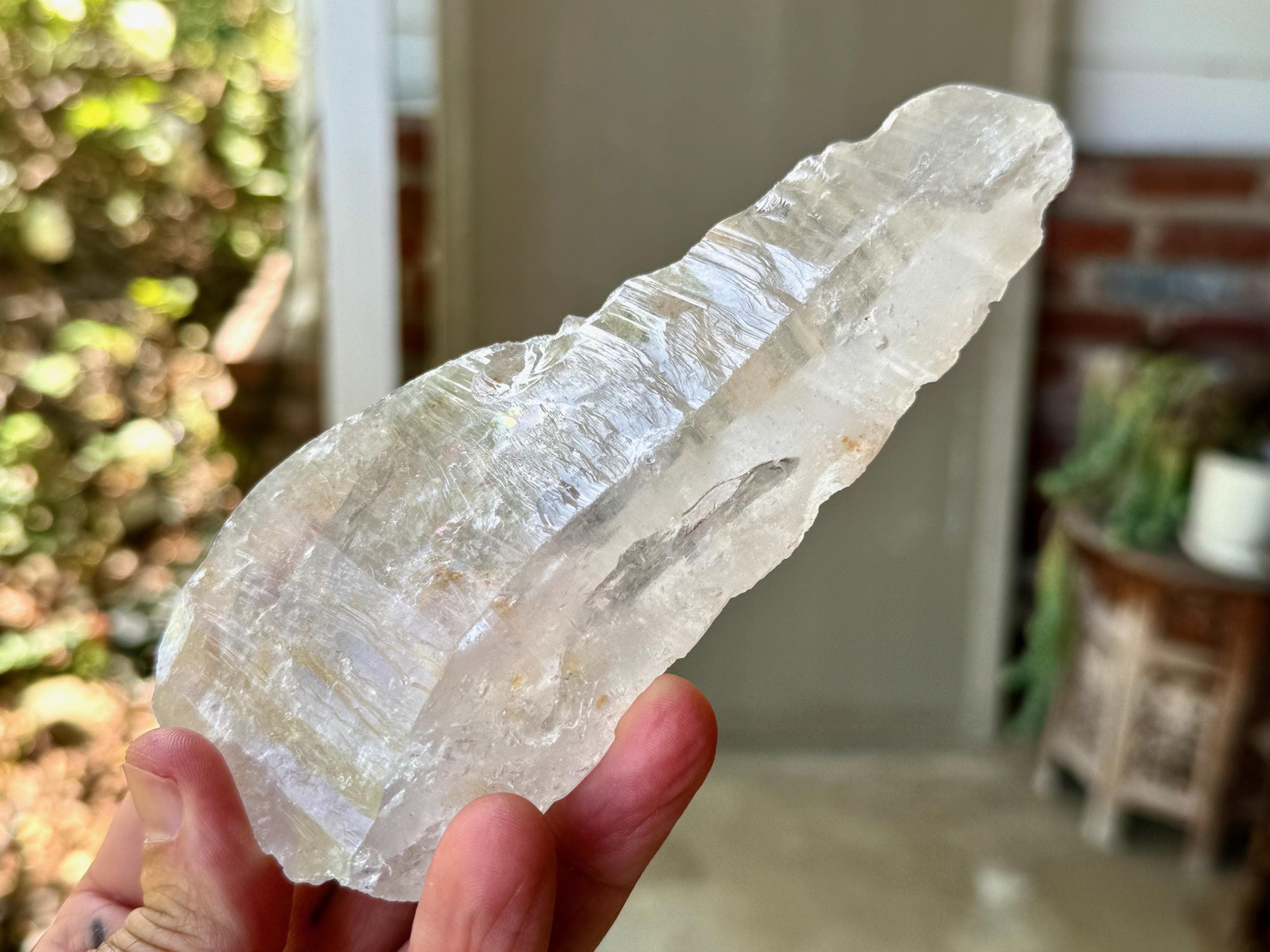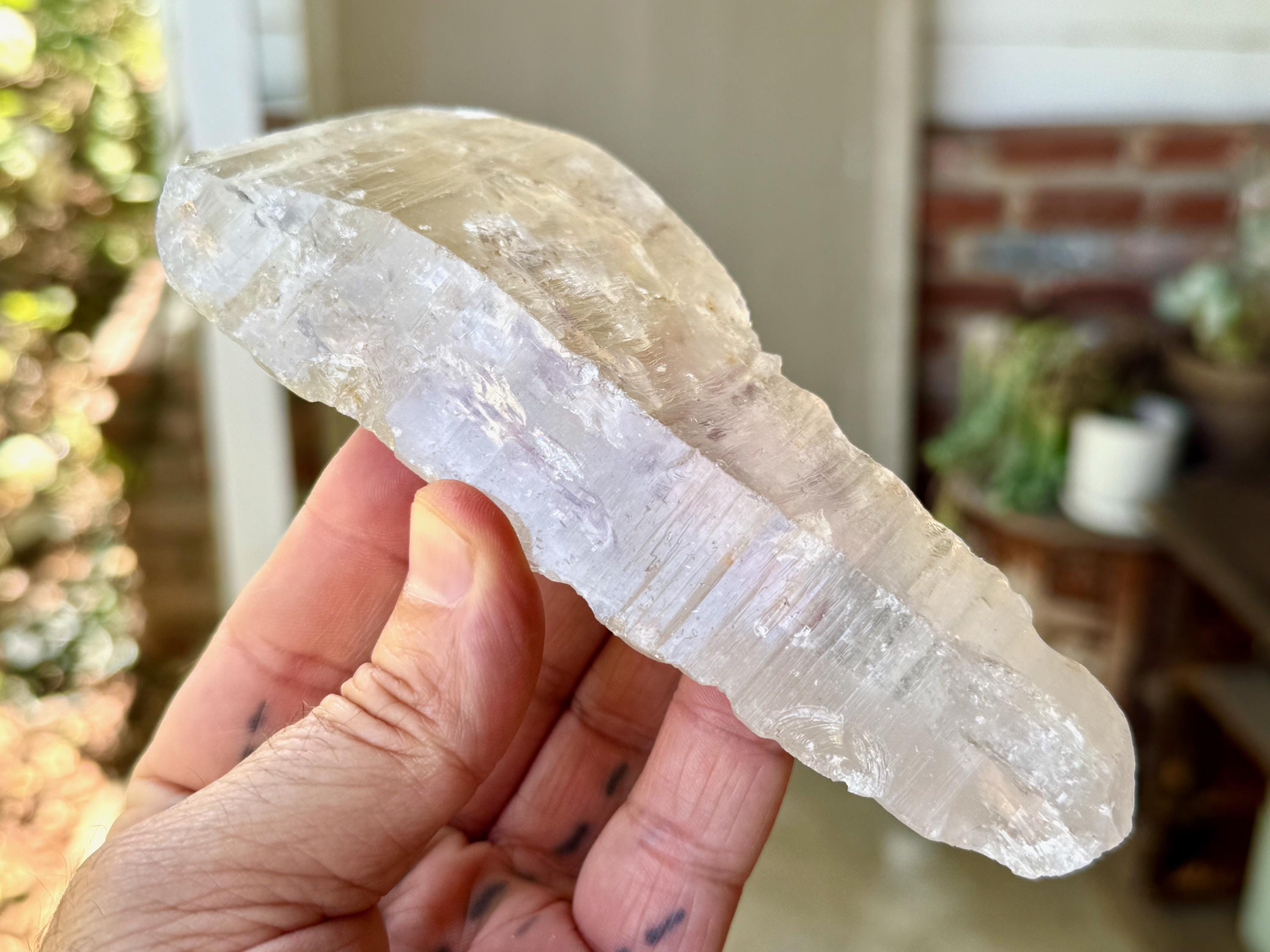We love that the overall "point" formation is still in place, with a broad main facet. The clarity allows us to peer inside and see all the crystalline formations, including many small rainbows, and we can see nicely defined Lemurian ridges on the underside, and finely etched striations on the top side.