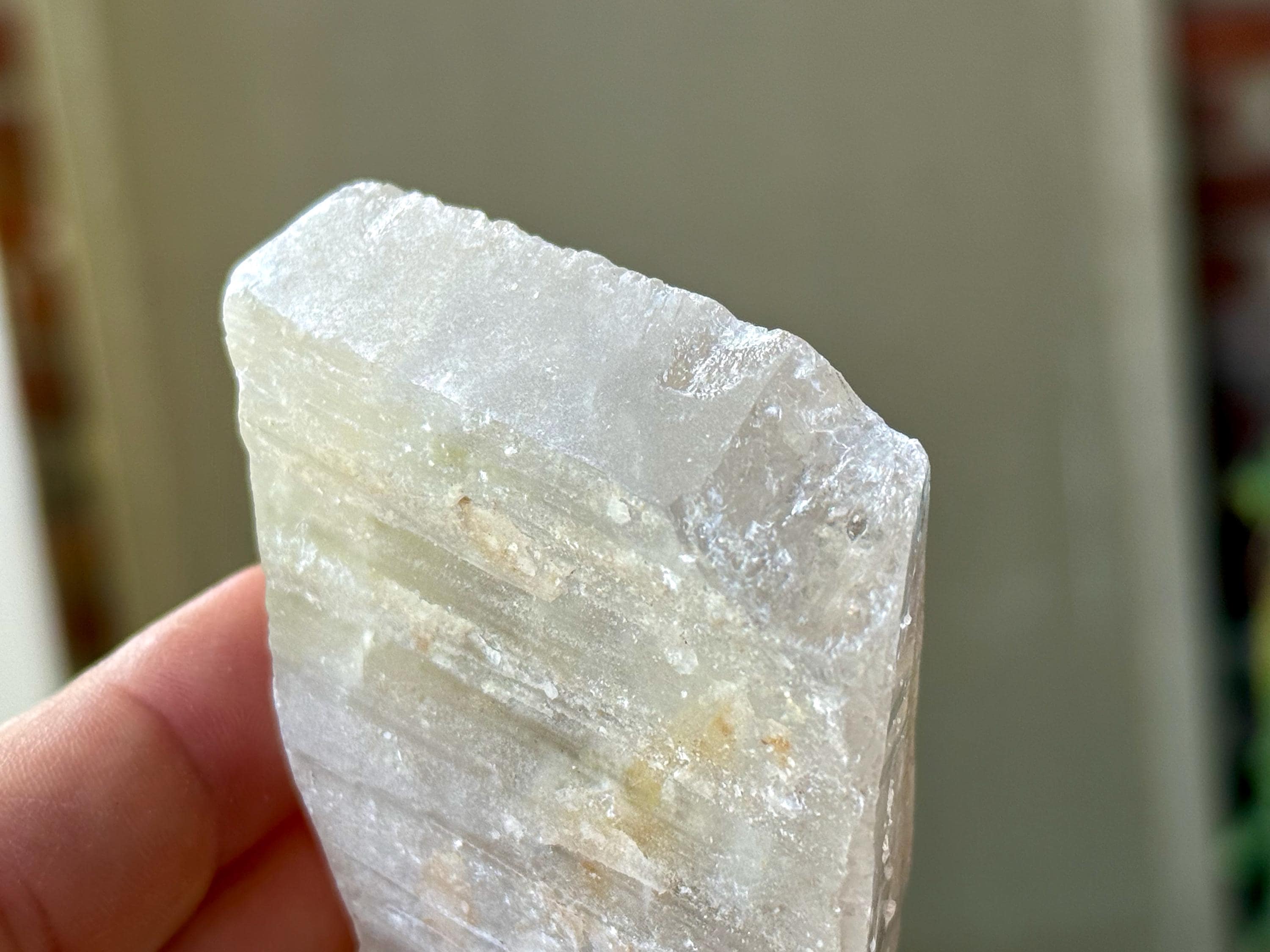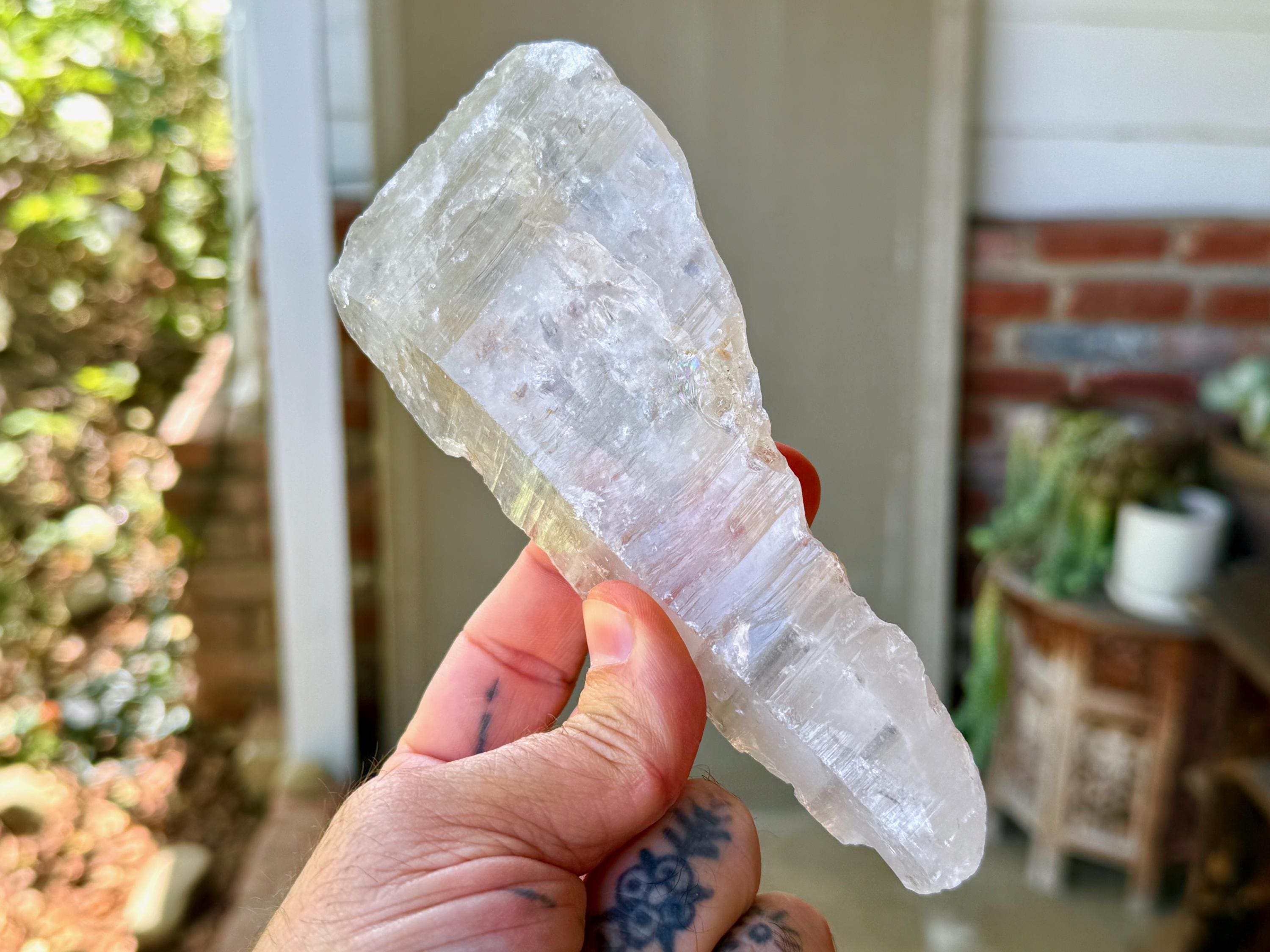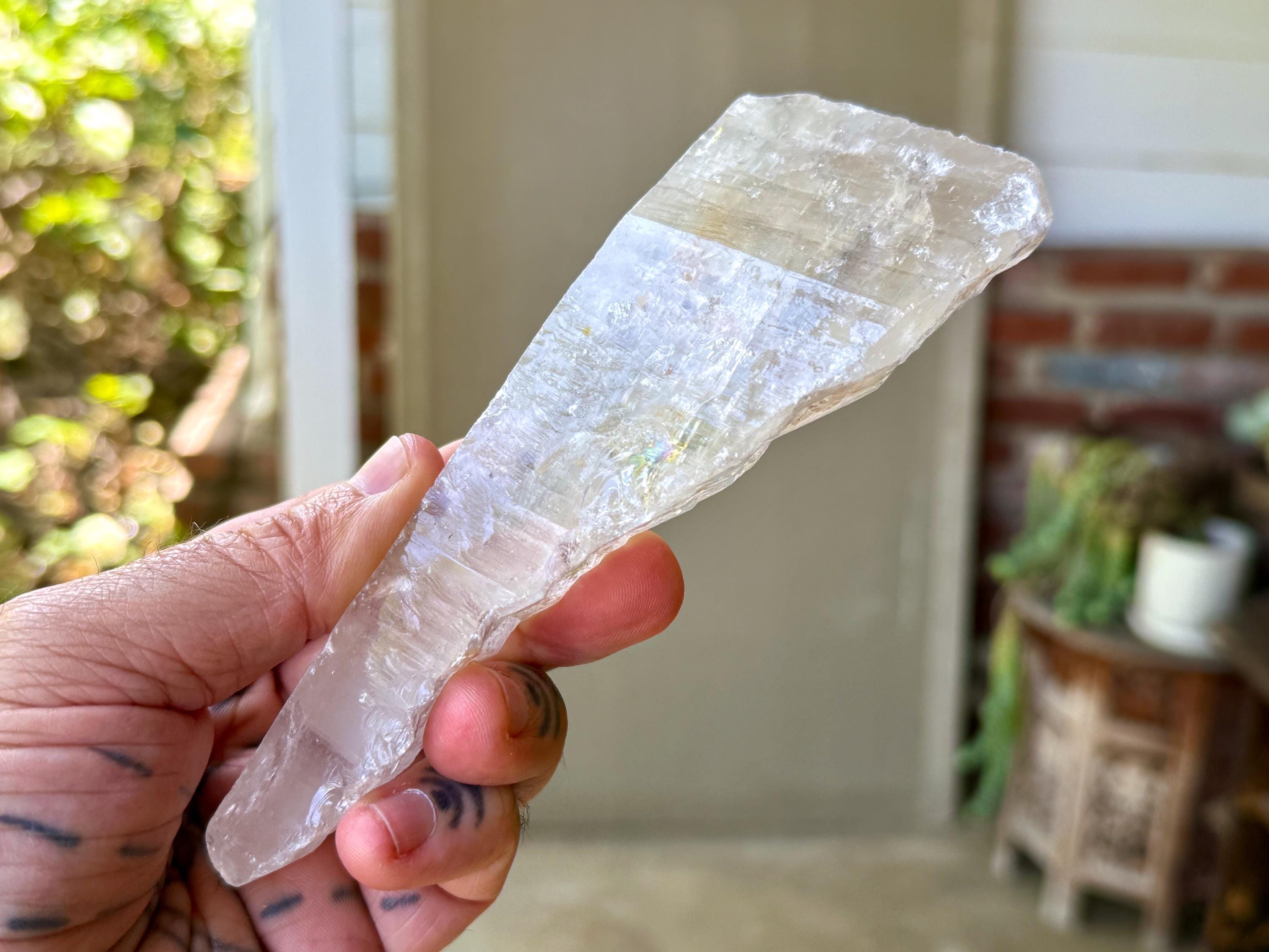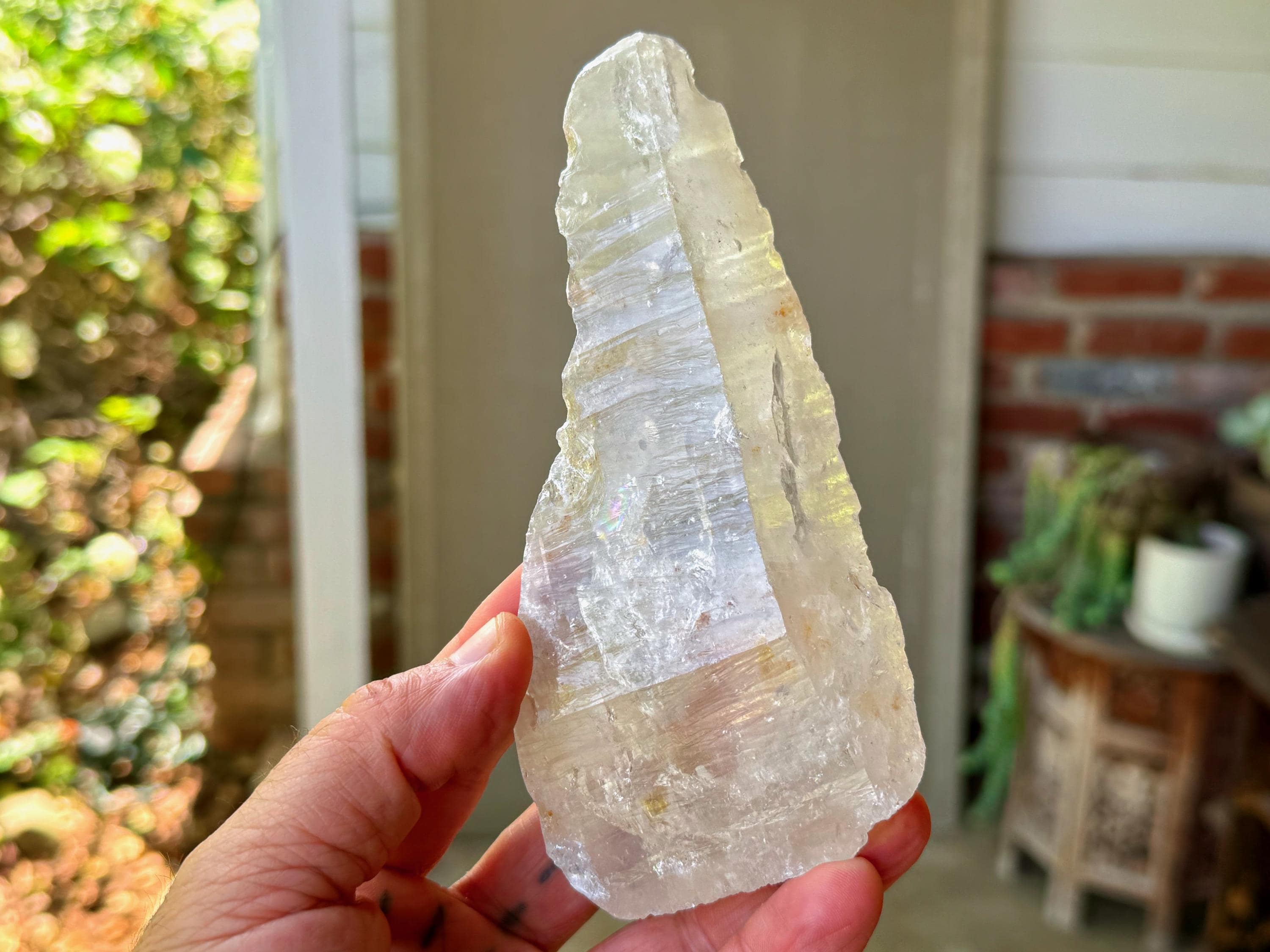 We love that the overall "point" formation is still in place, with a broad main facet. The clarity allows us to peer inside and see all the crystalline formations, including many small rainbows, and we can see nicely defined Lemurian ridges on the underside, and finely etched striations on the top side.