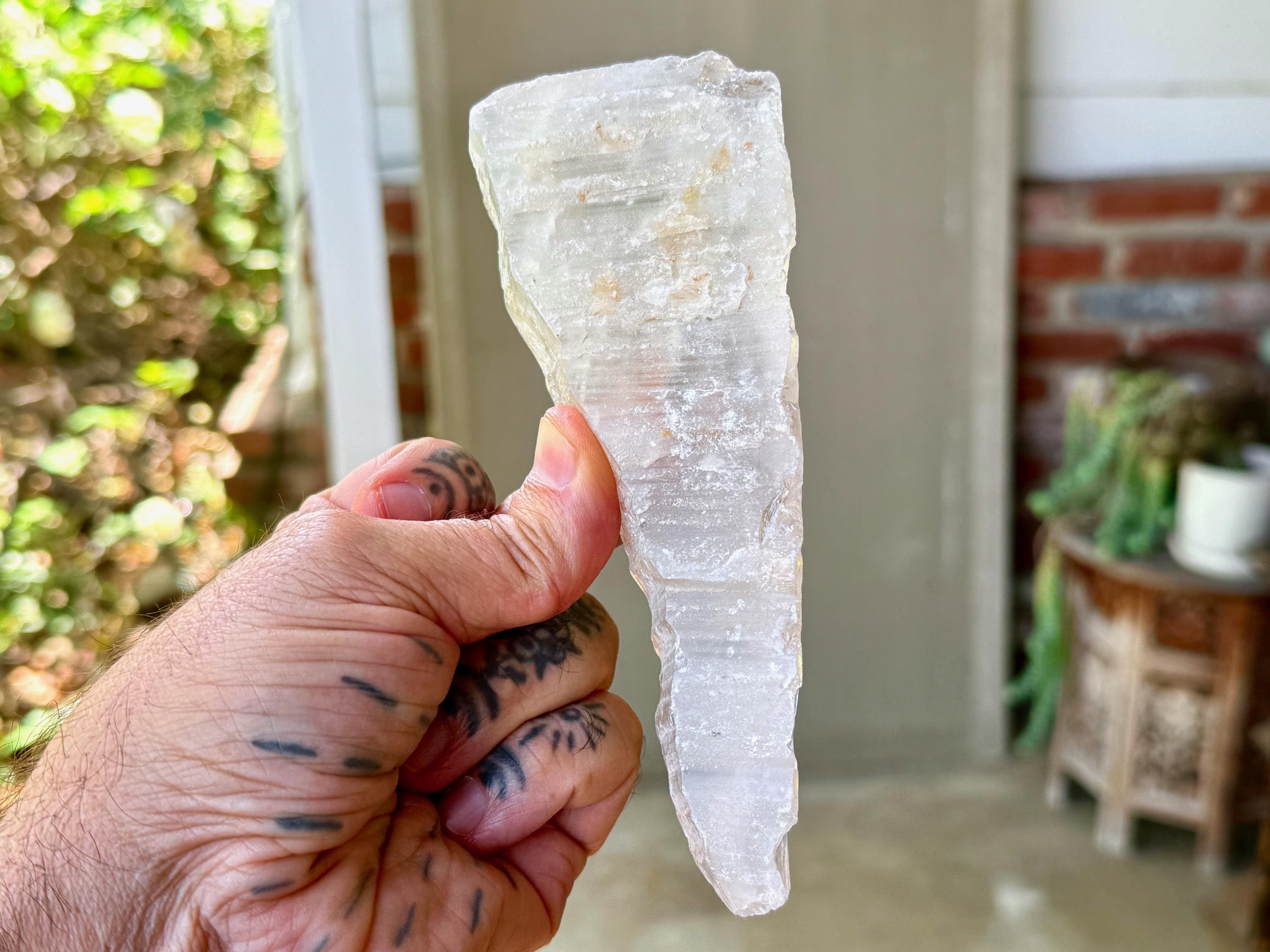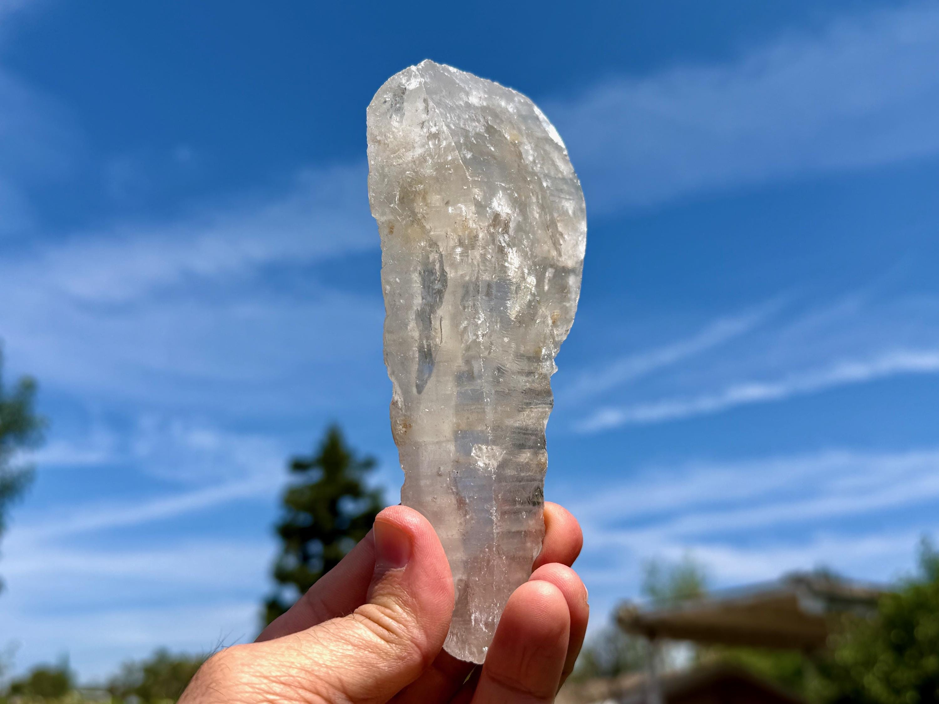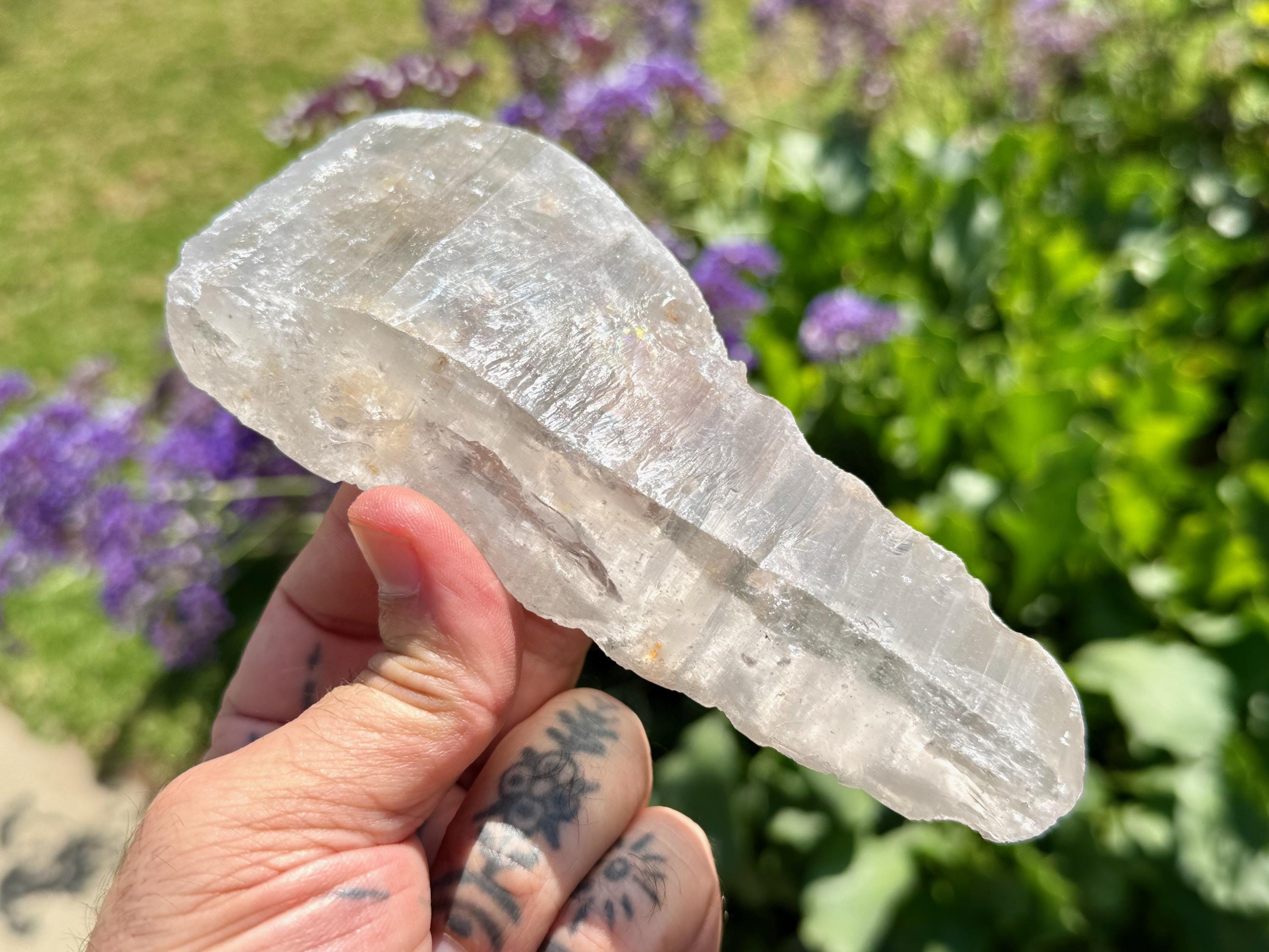 Lemurian Quartz resonates with all chakras, but primarily the Crown Chakra. It has one of the highest vibrations of any crystal and is a beautiful companion for meditation and to realign energies in the body. It can assist in clearing blockages in one's energy field and/or chakras, dispelling heavy energies from the body. If there is stagnant energy in the body, it can help to increase Prana (life force) energy to get things moving properly again. Meditating with Lemurian Crystals can allow us to connect with higher-dimensional spirit guides and connect to Divine realms, as well as to decode the information they contain within.