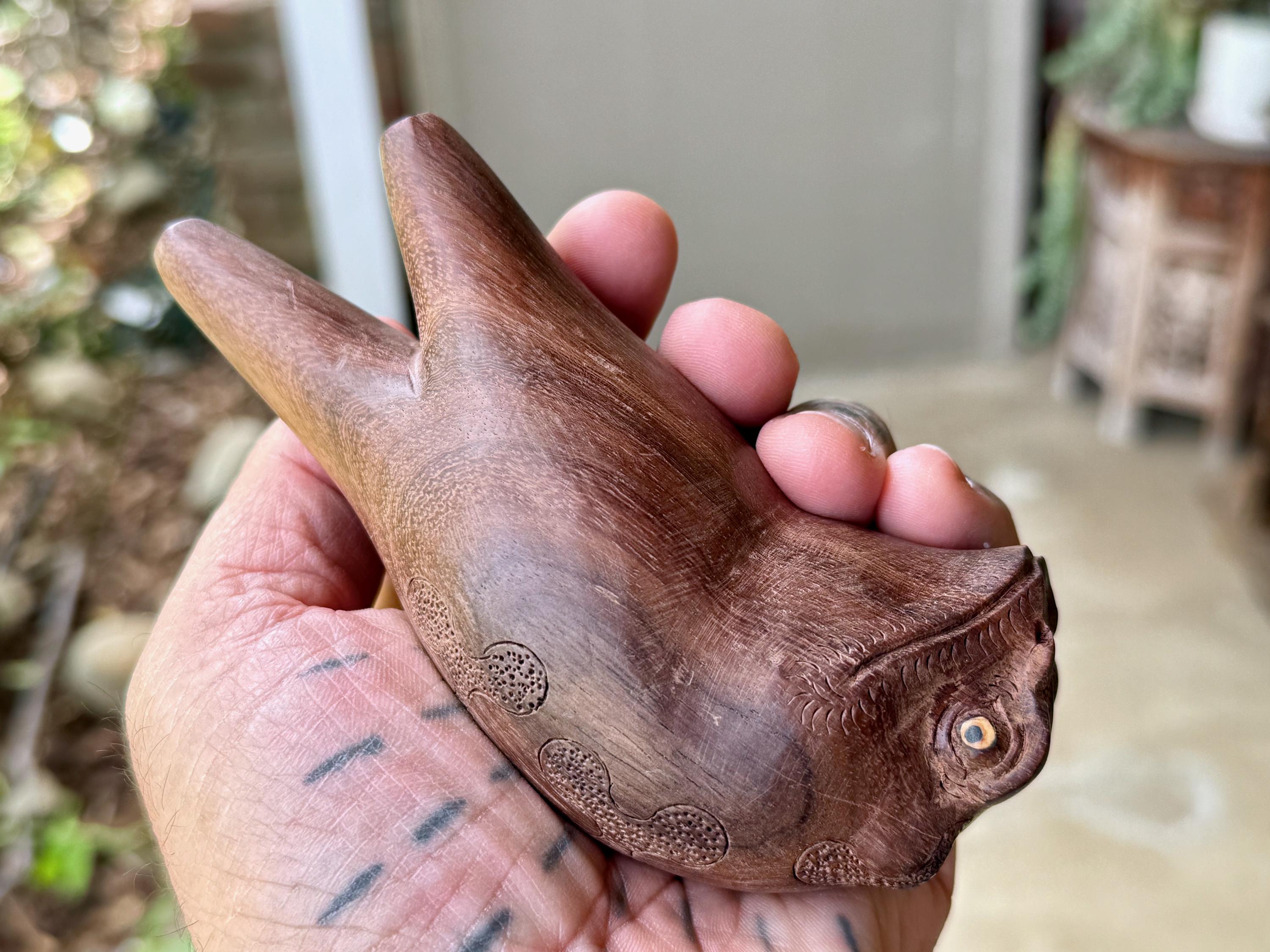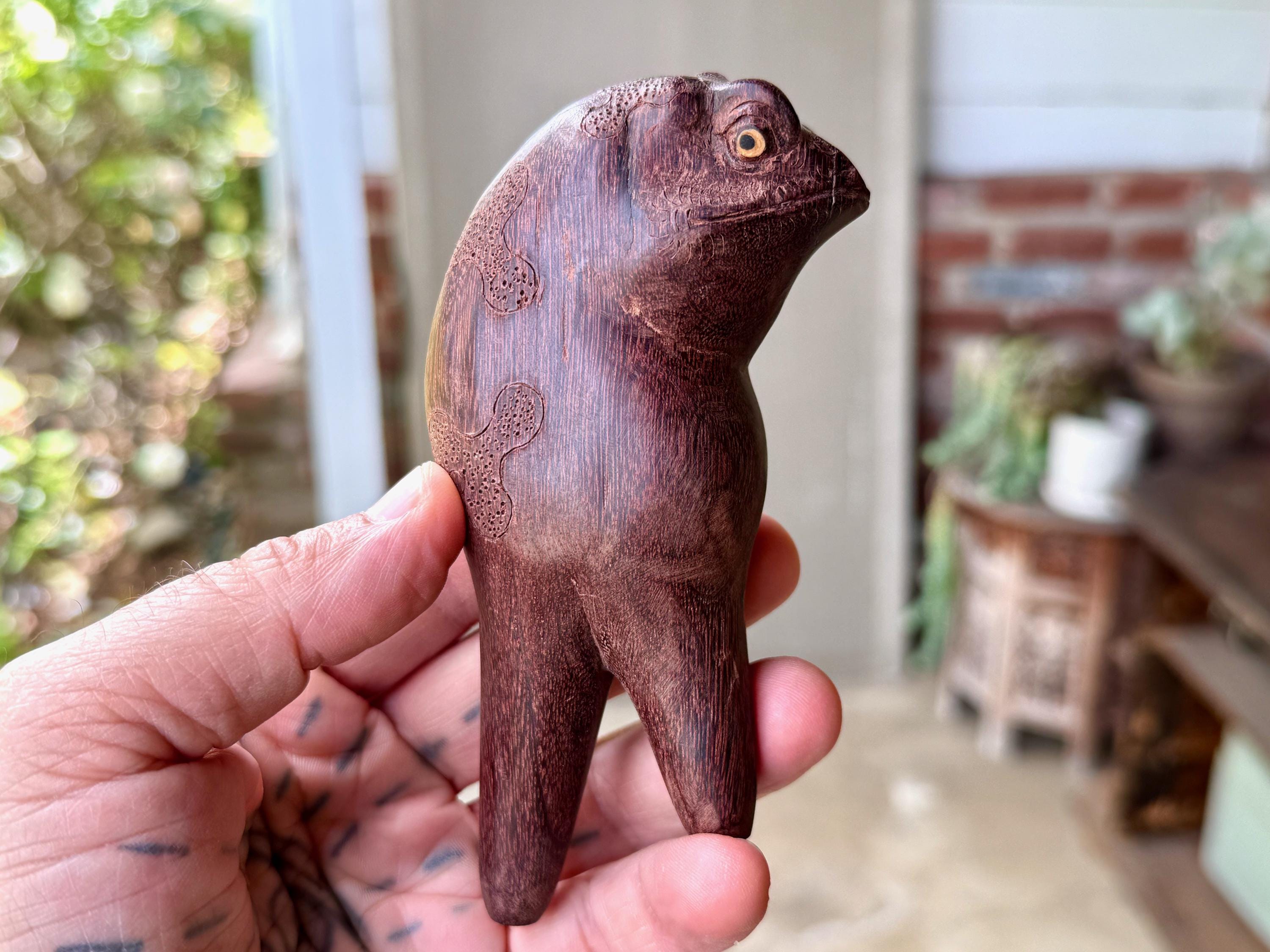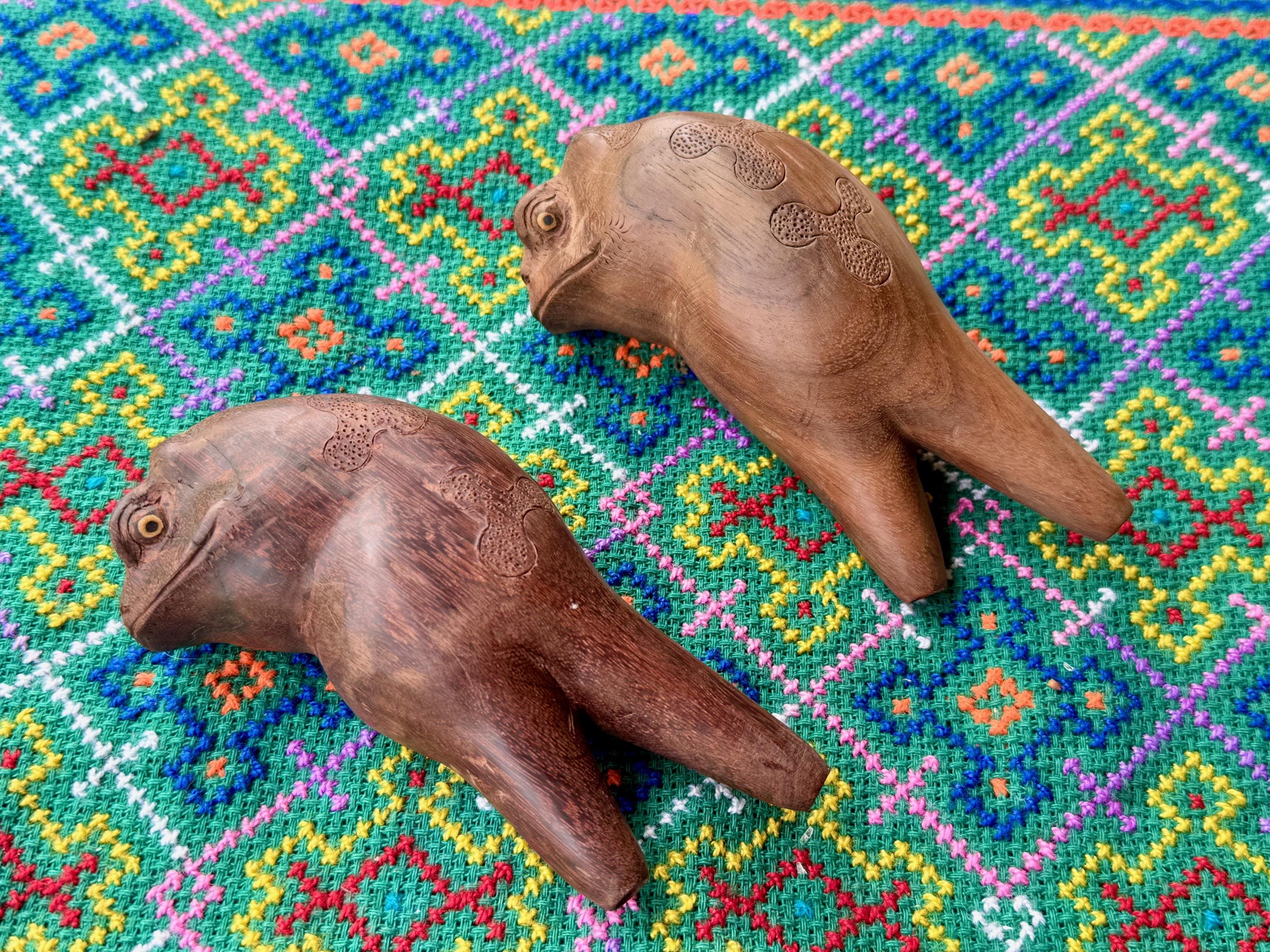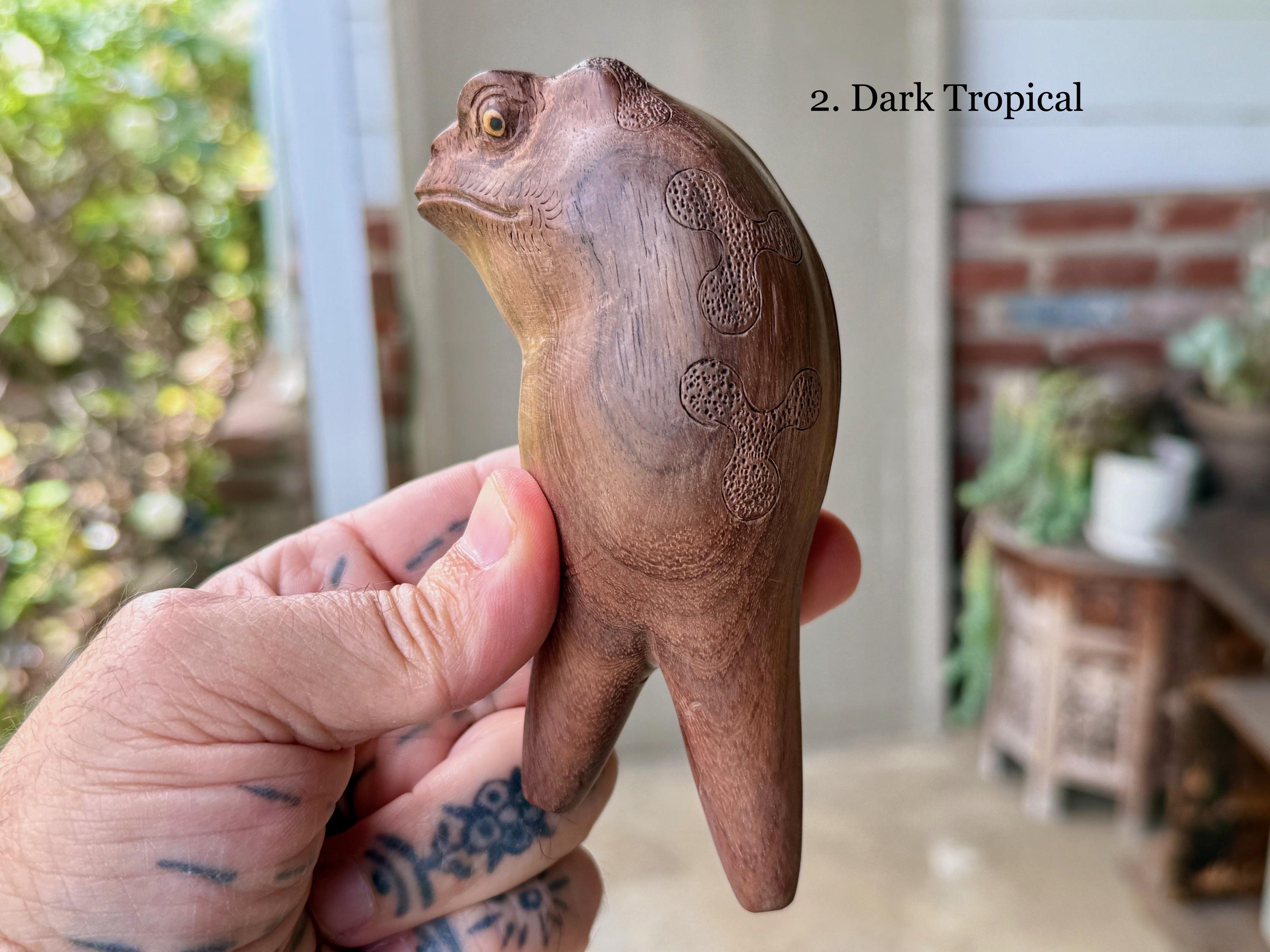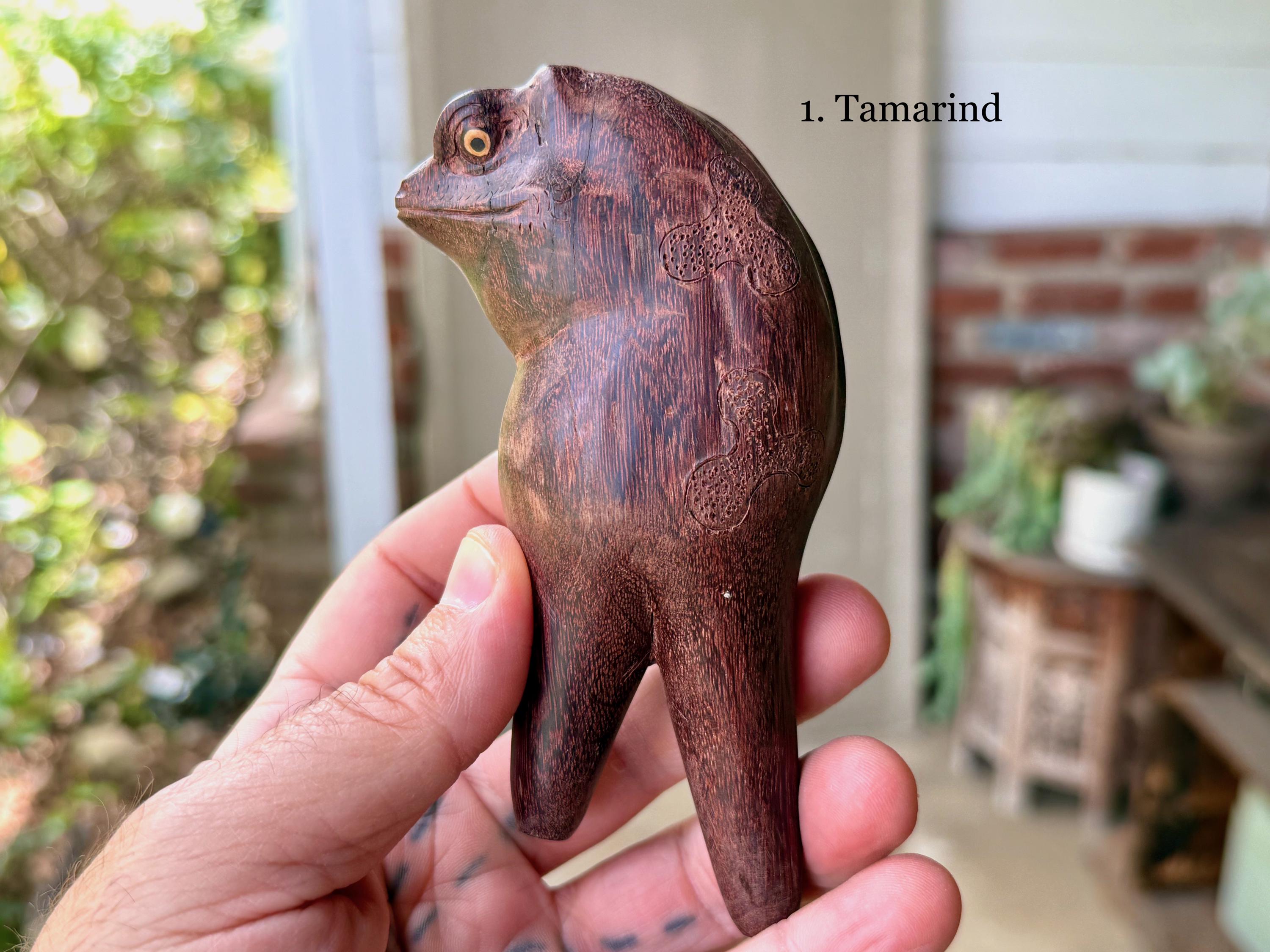 These handsome Jungle Frogs have a bit of a fairytale charm to them. But aside from their charming personas, they are *very* weighty and robust, made from native Tamarind and Dark Tropical hardwoods.