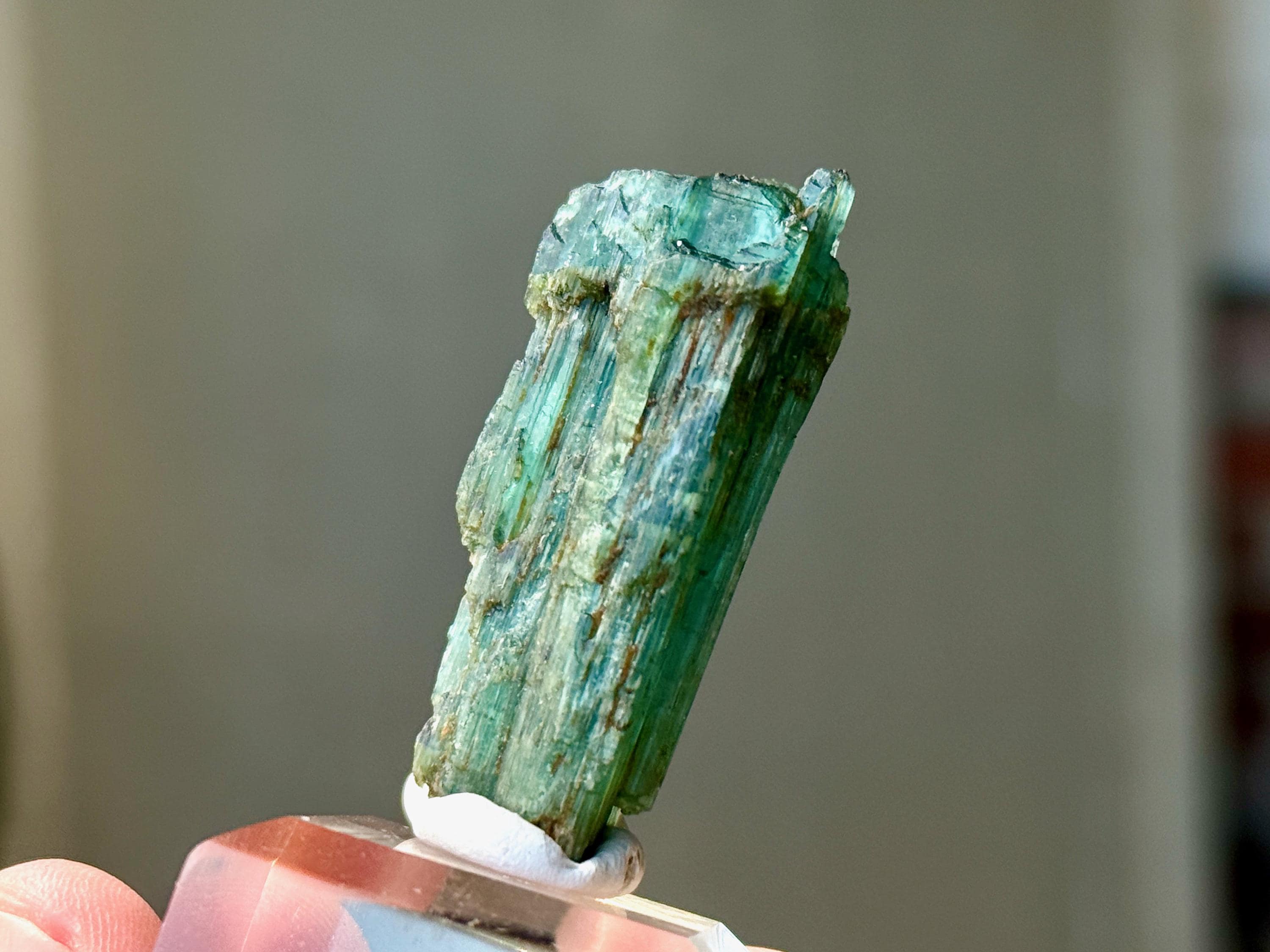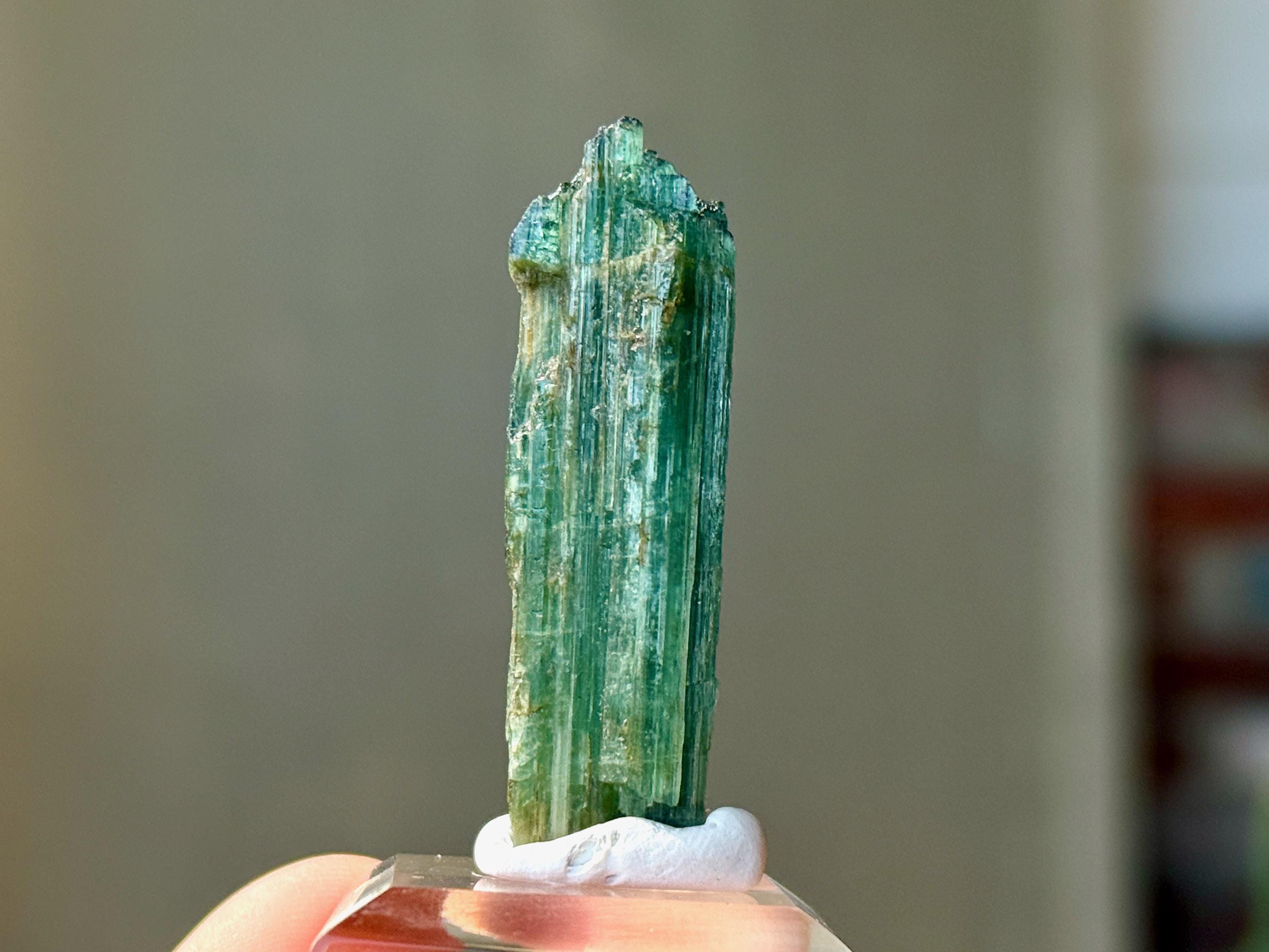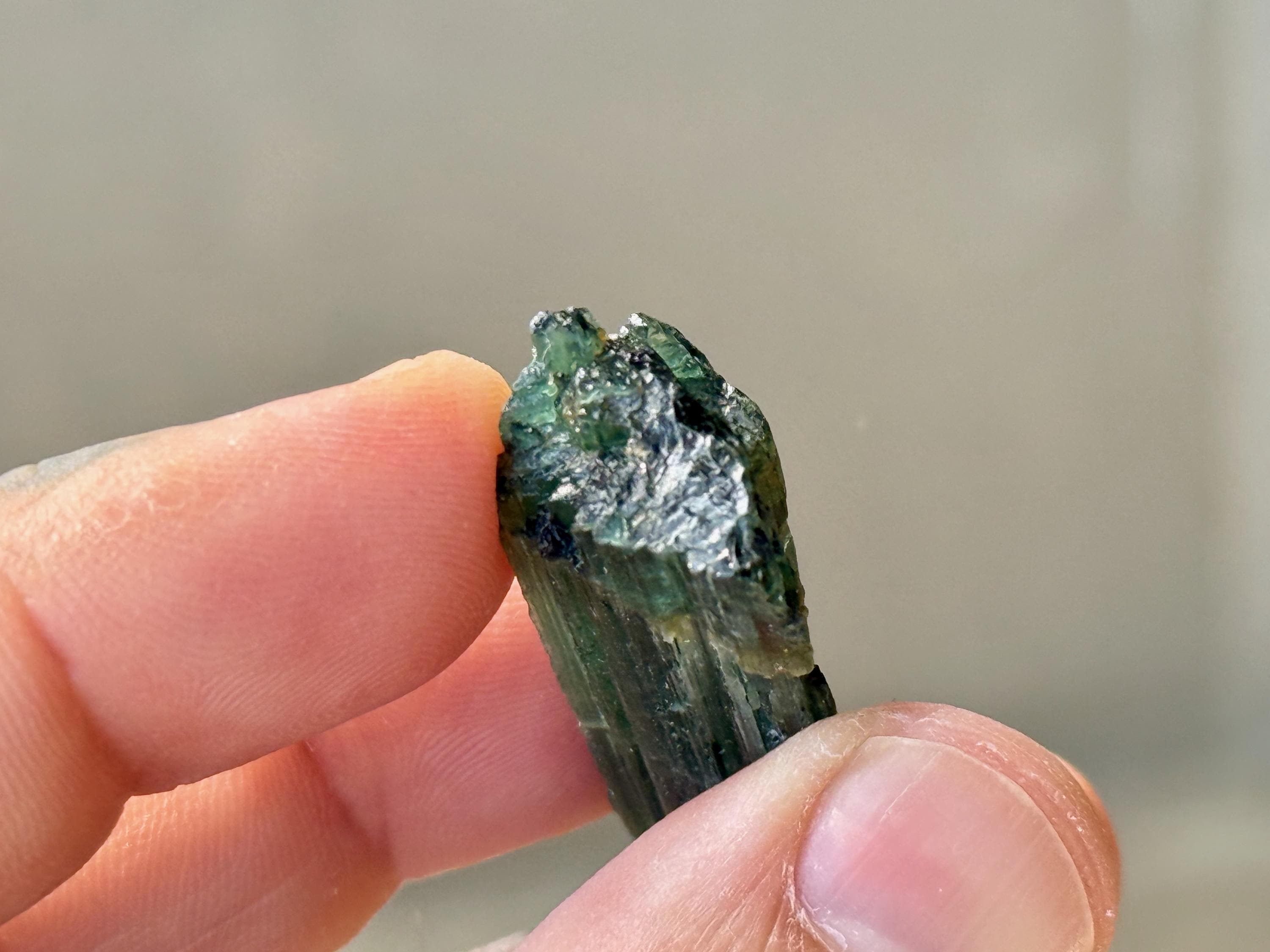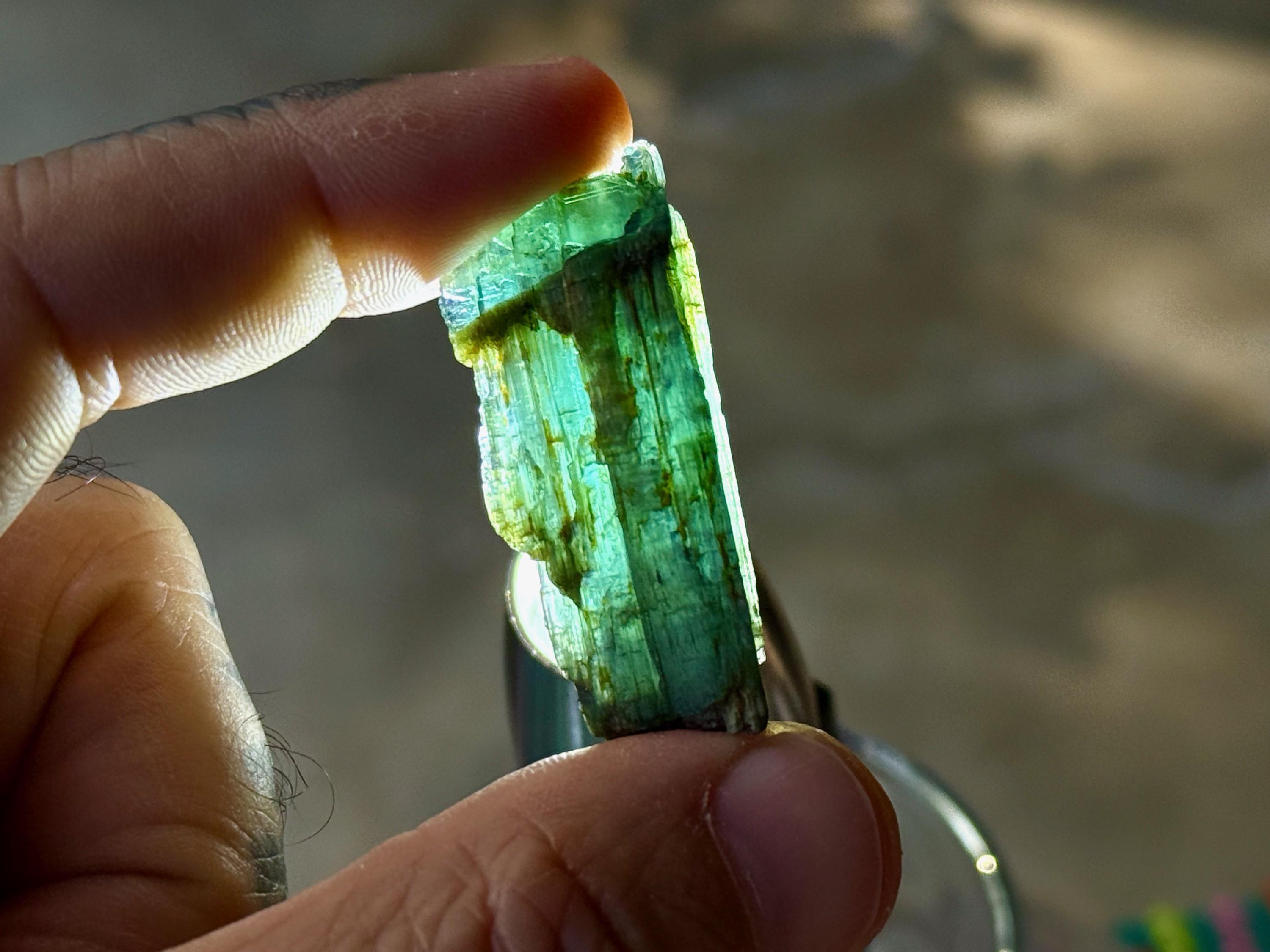 In natural light, this crystal appears equal parts emerald green and teal blue, with nice luster and ridged formation.