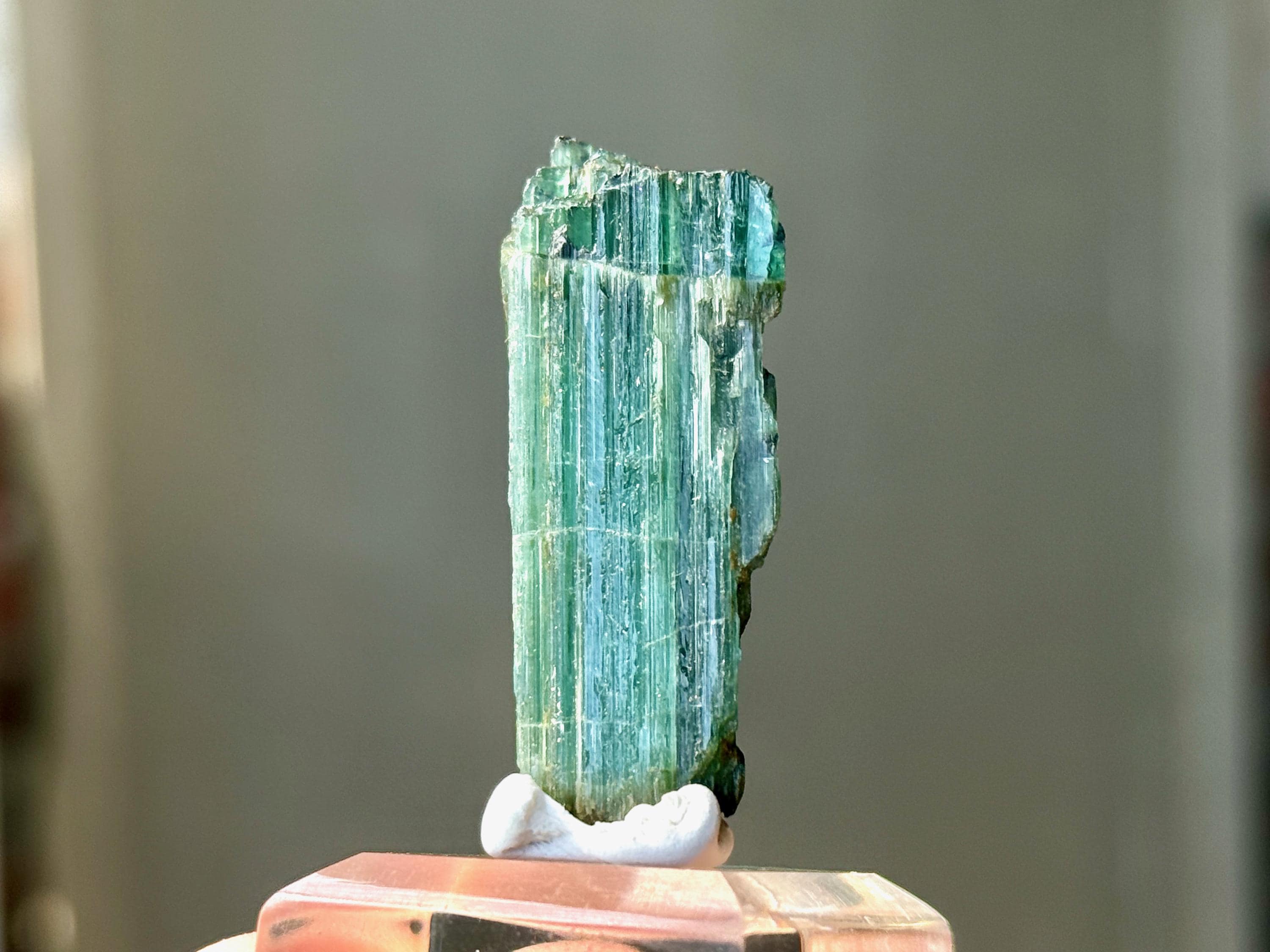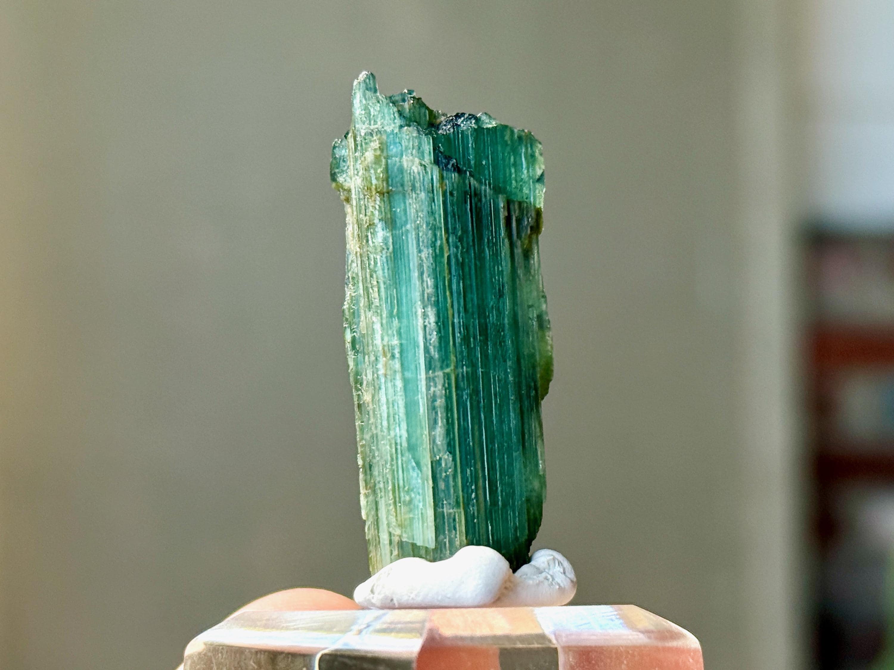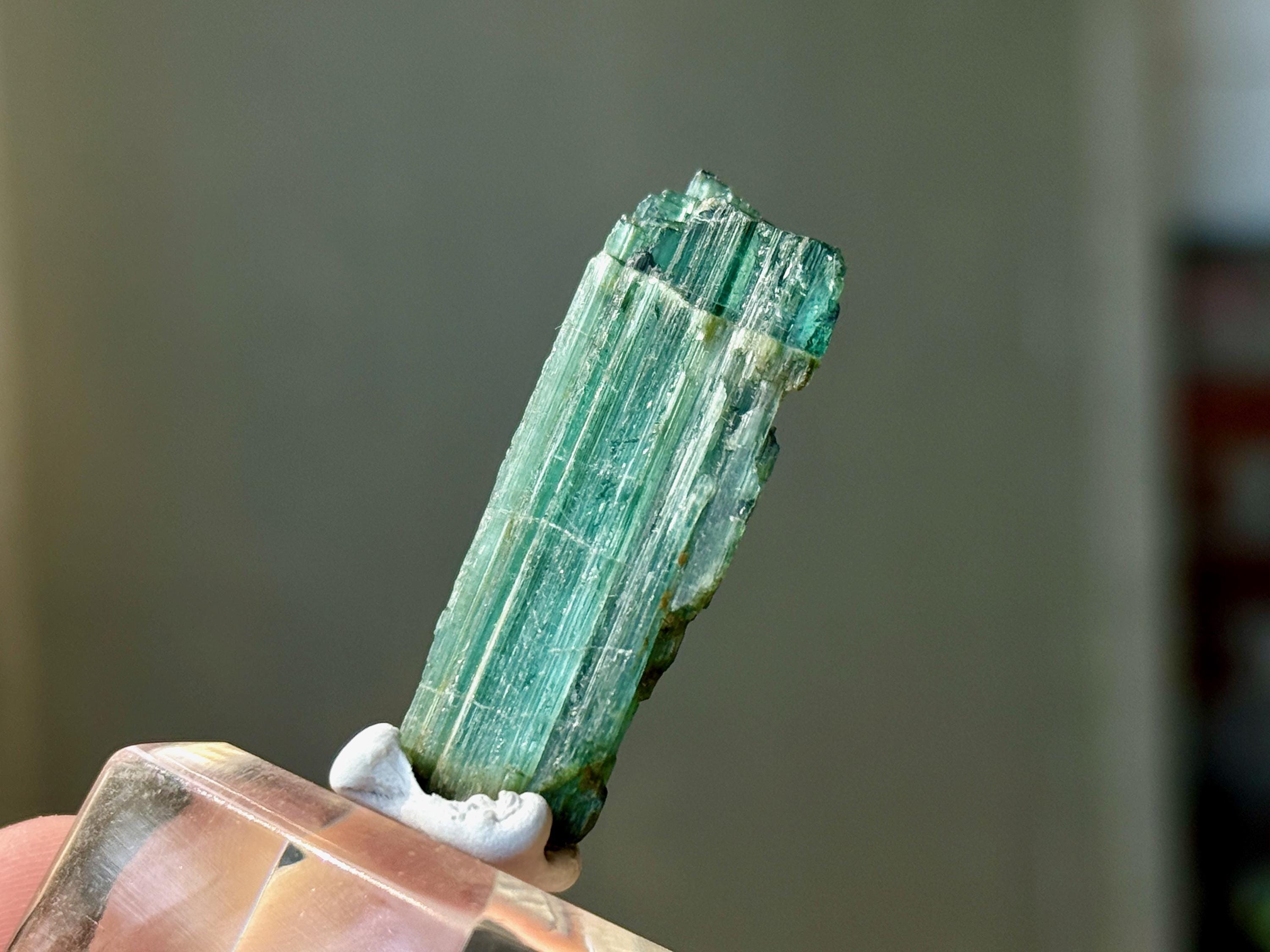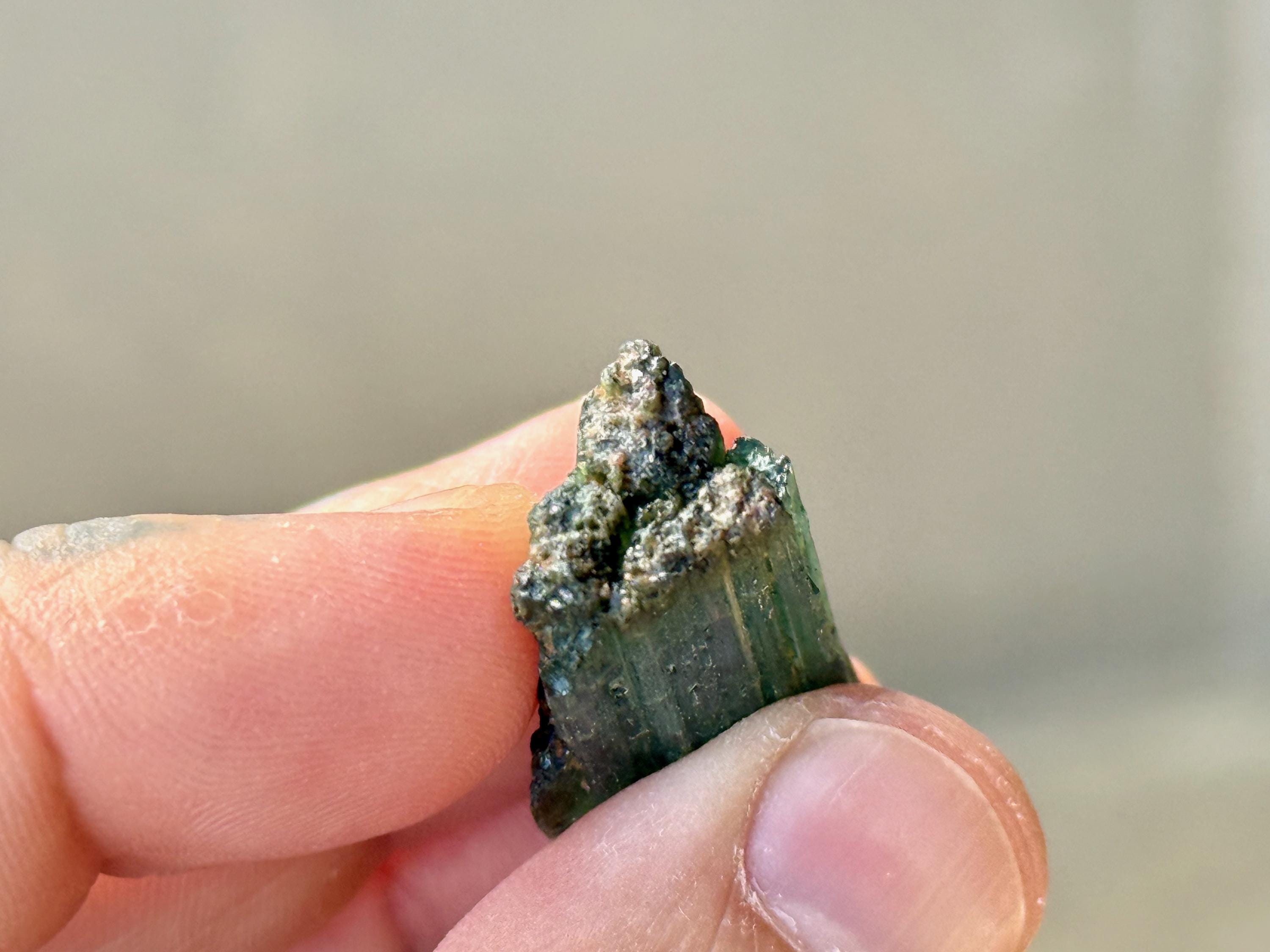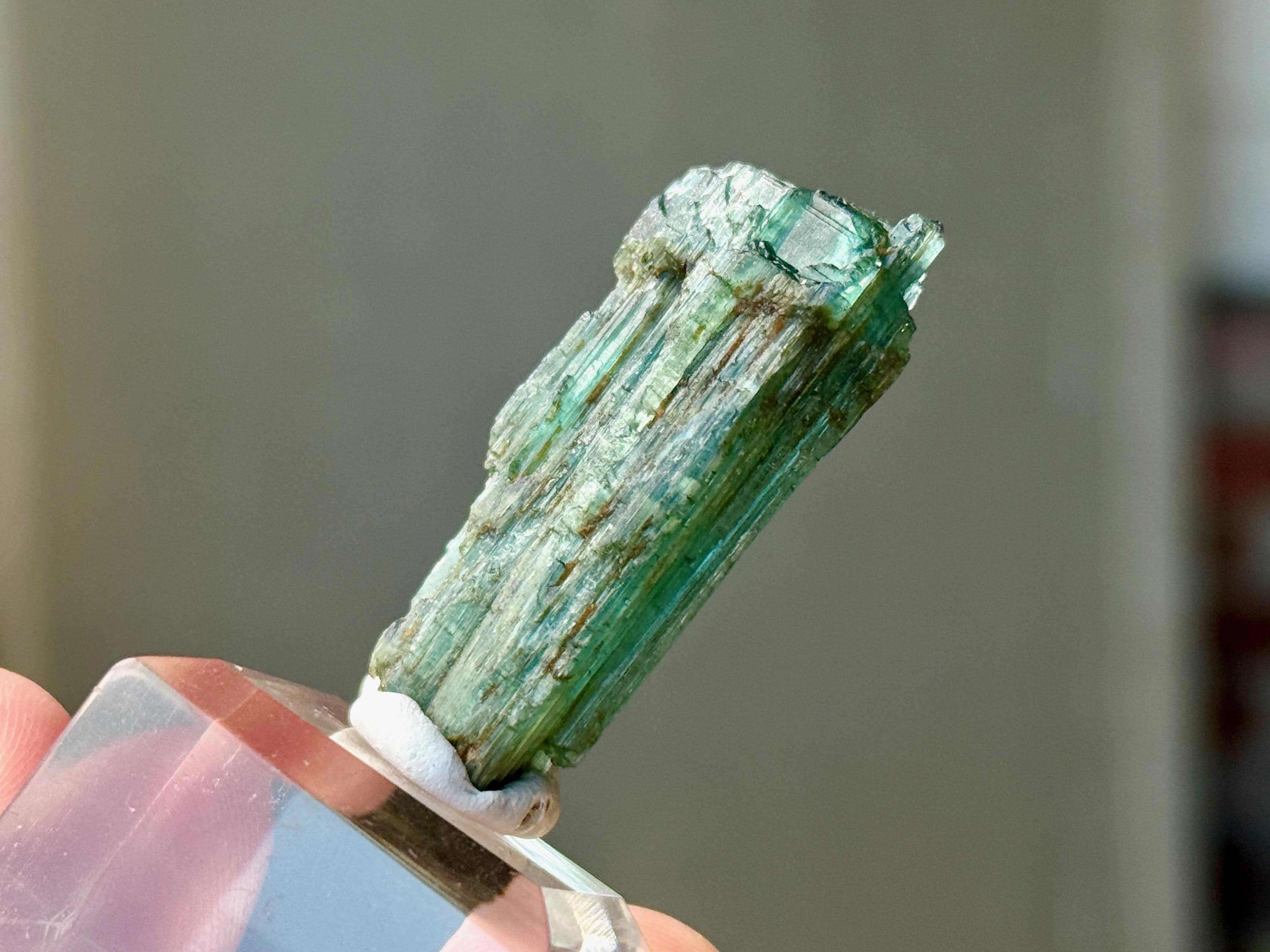 In natural light, this crystal appears equal parts emerald green and teal blue, with nice luster and ridged formation.