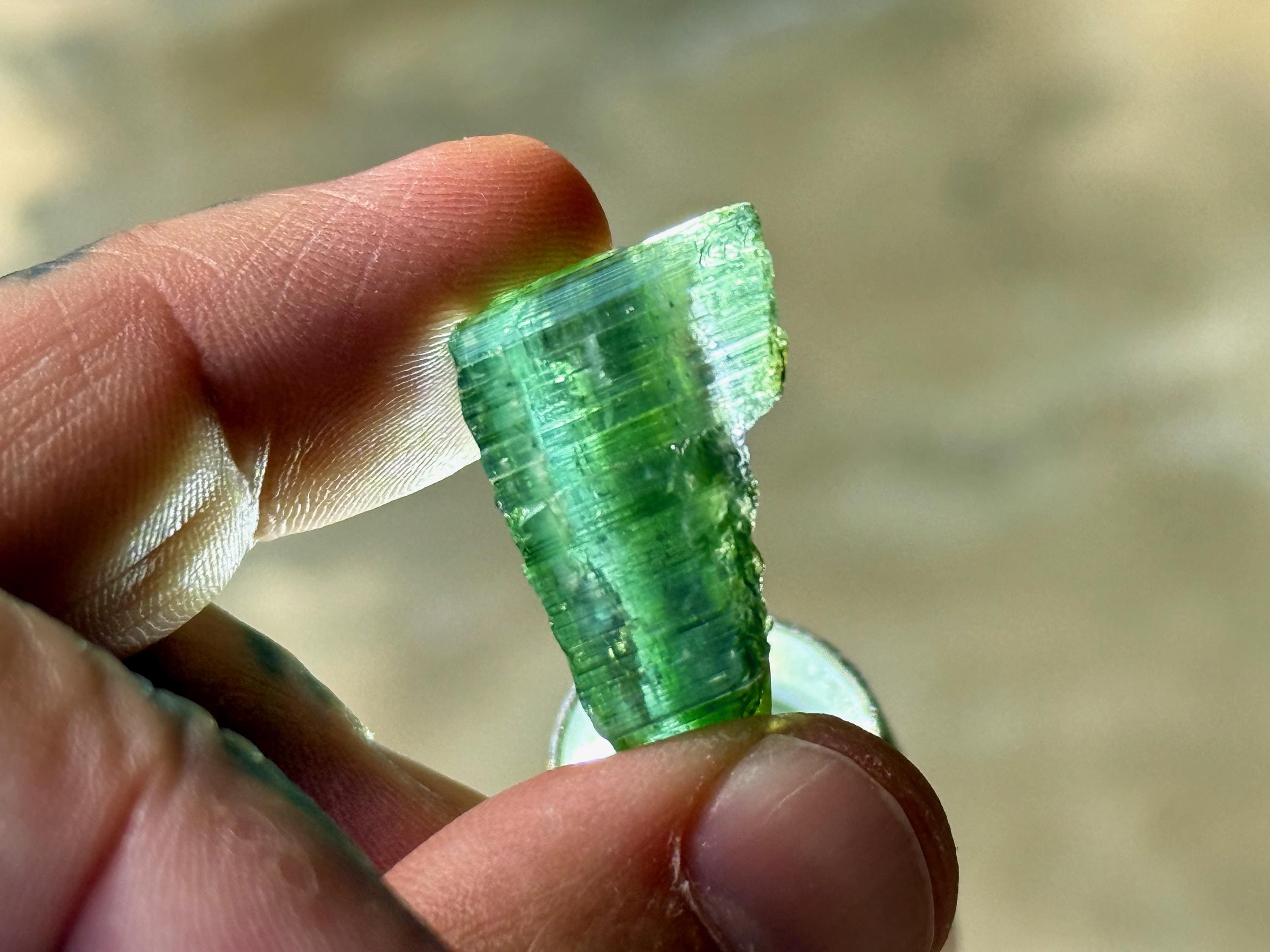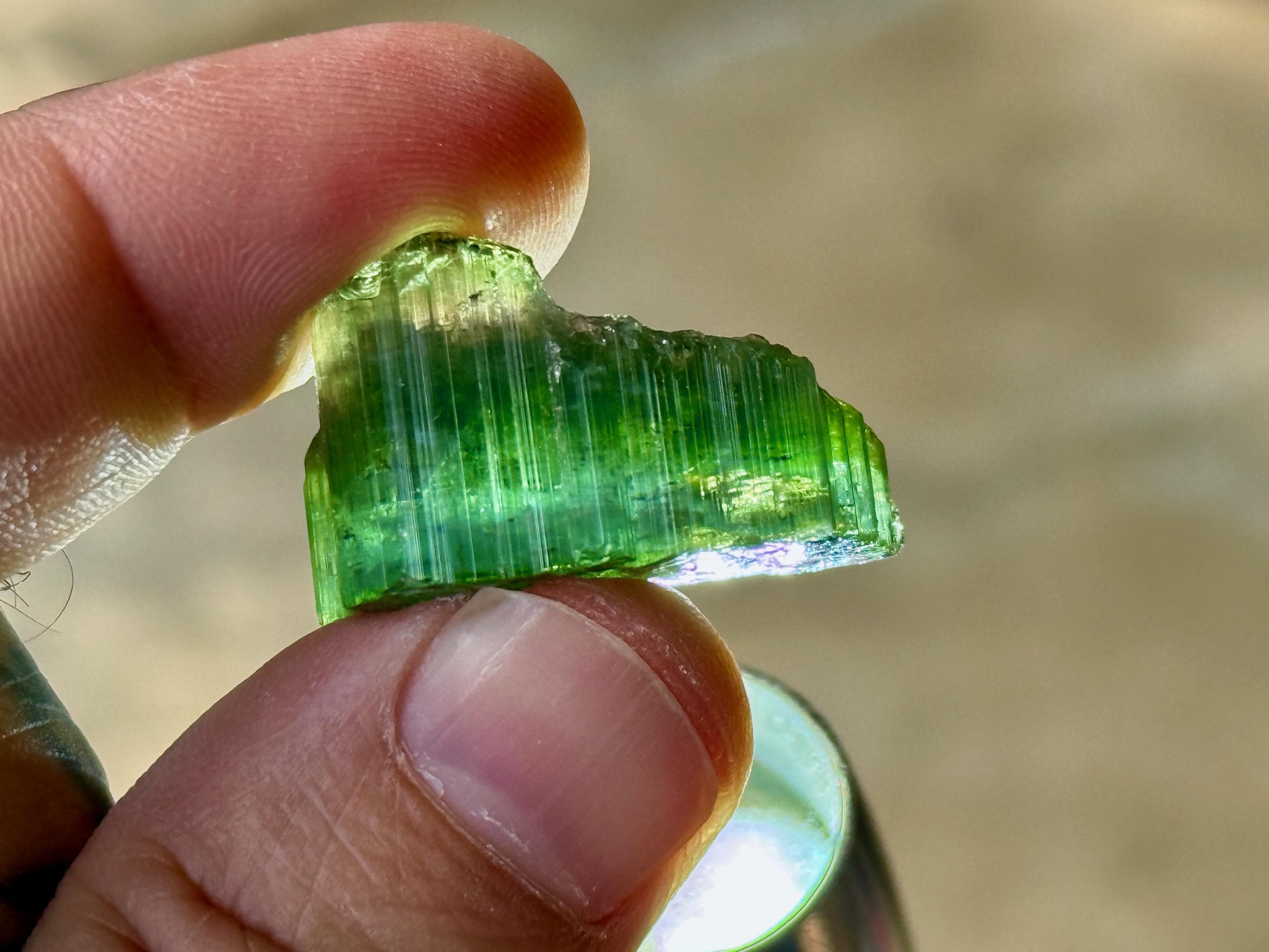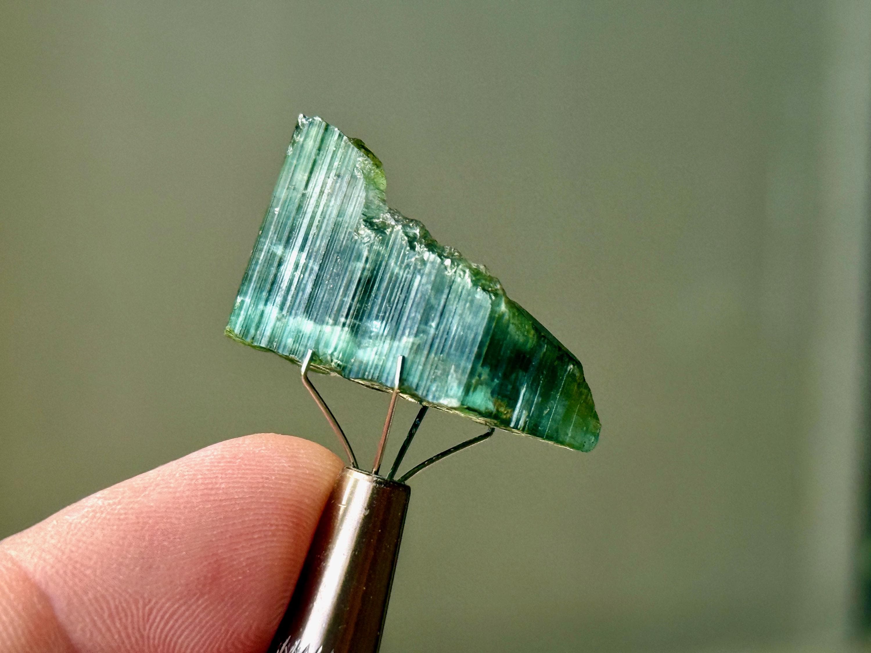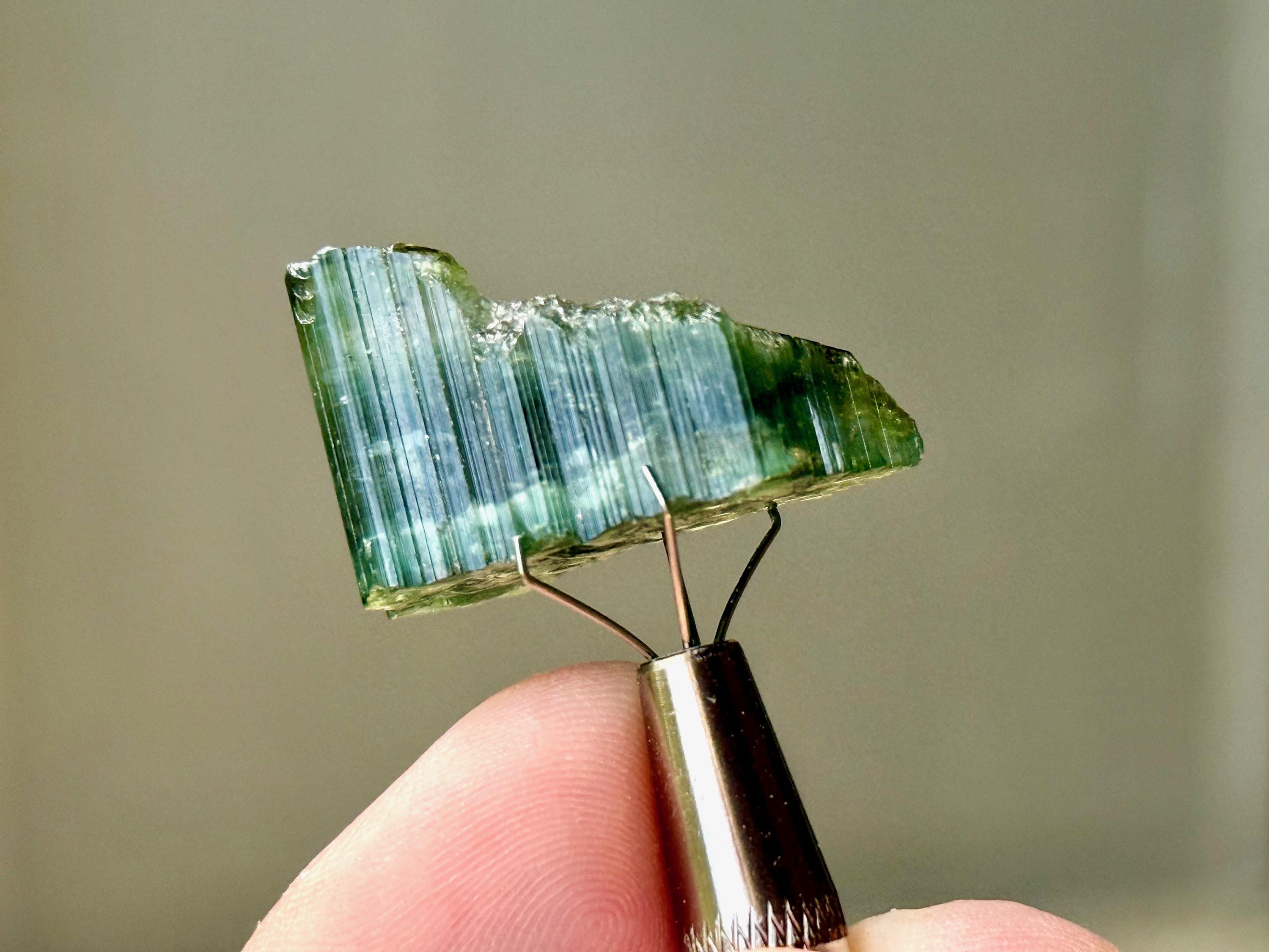 In natural light, this crystal displays mostly gradient green hues. However, when backlit, we can see a banded light blue portion that runs through the center.