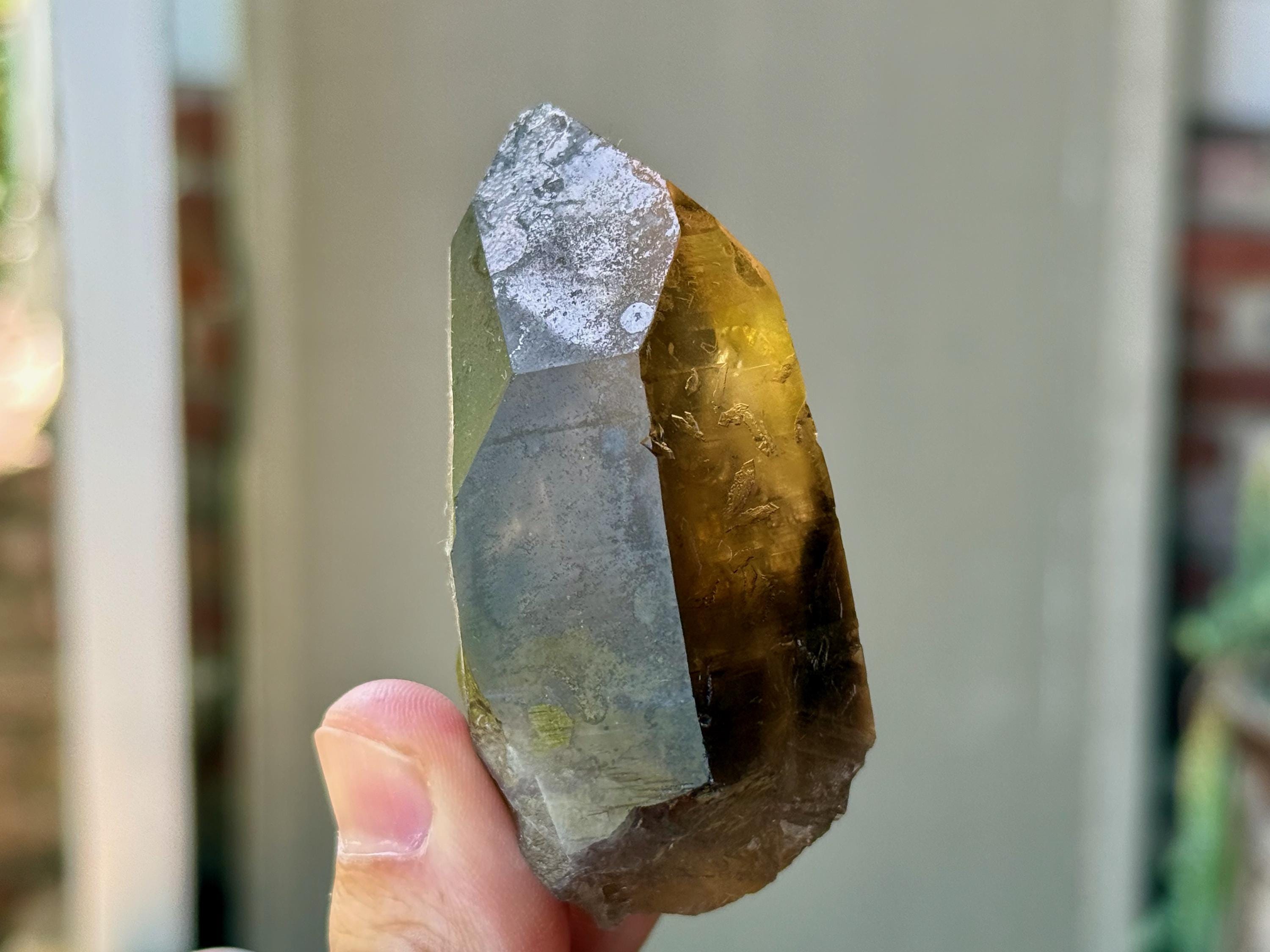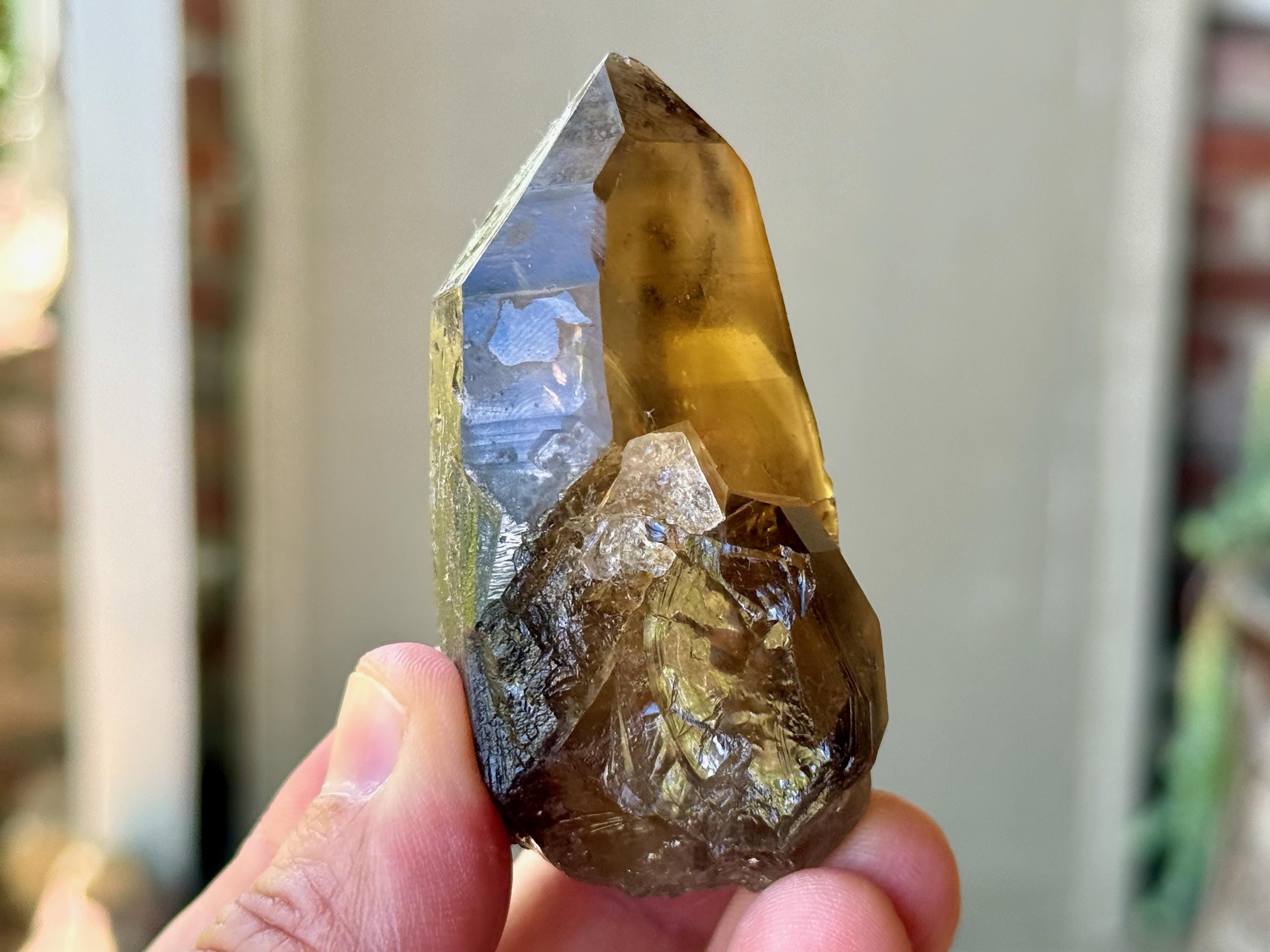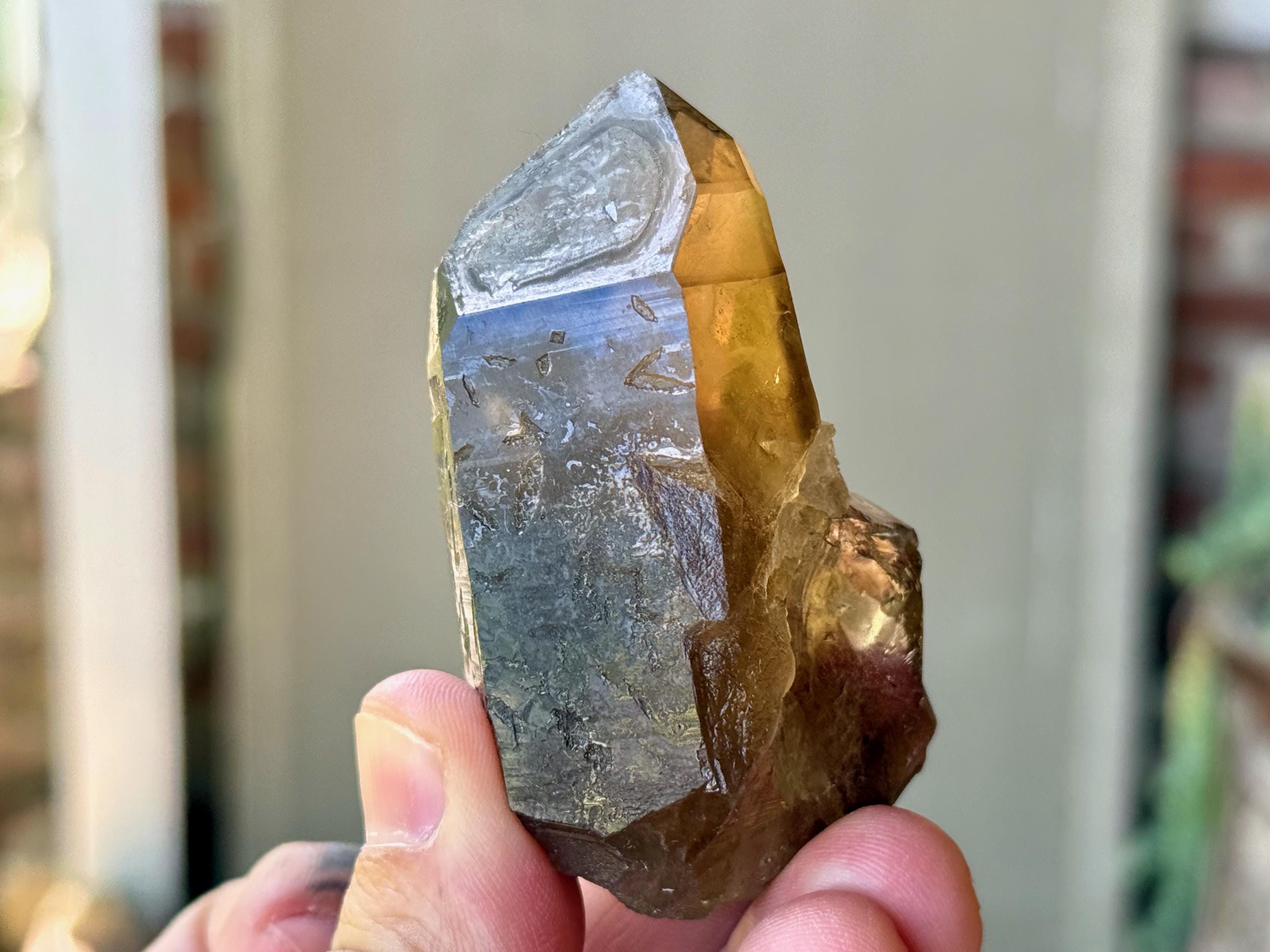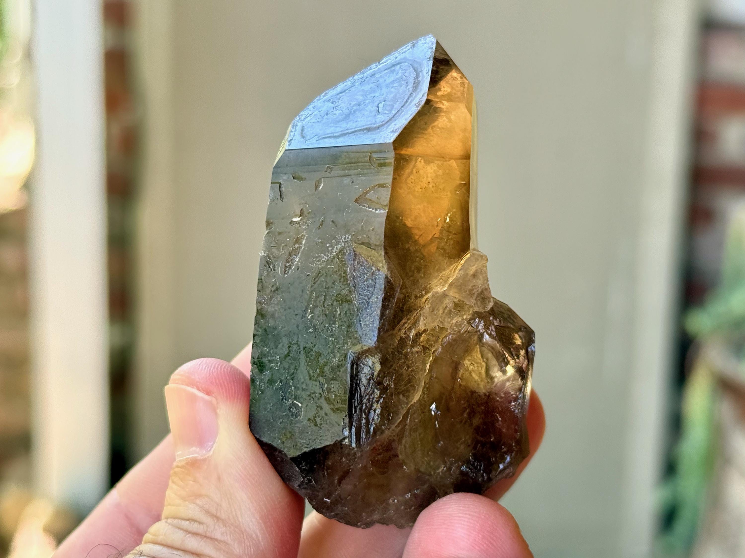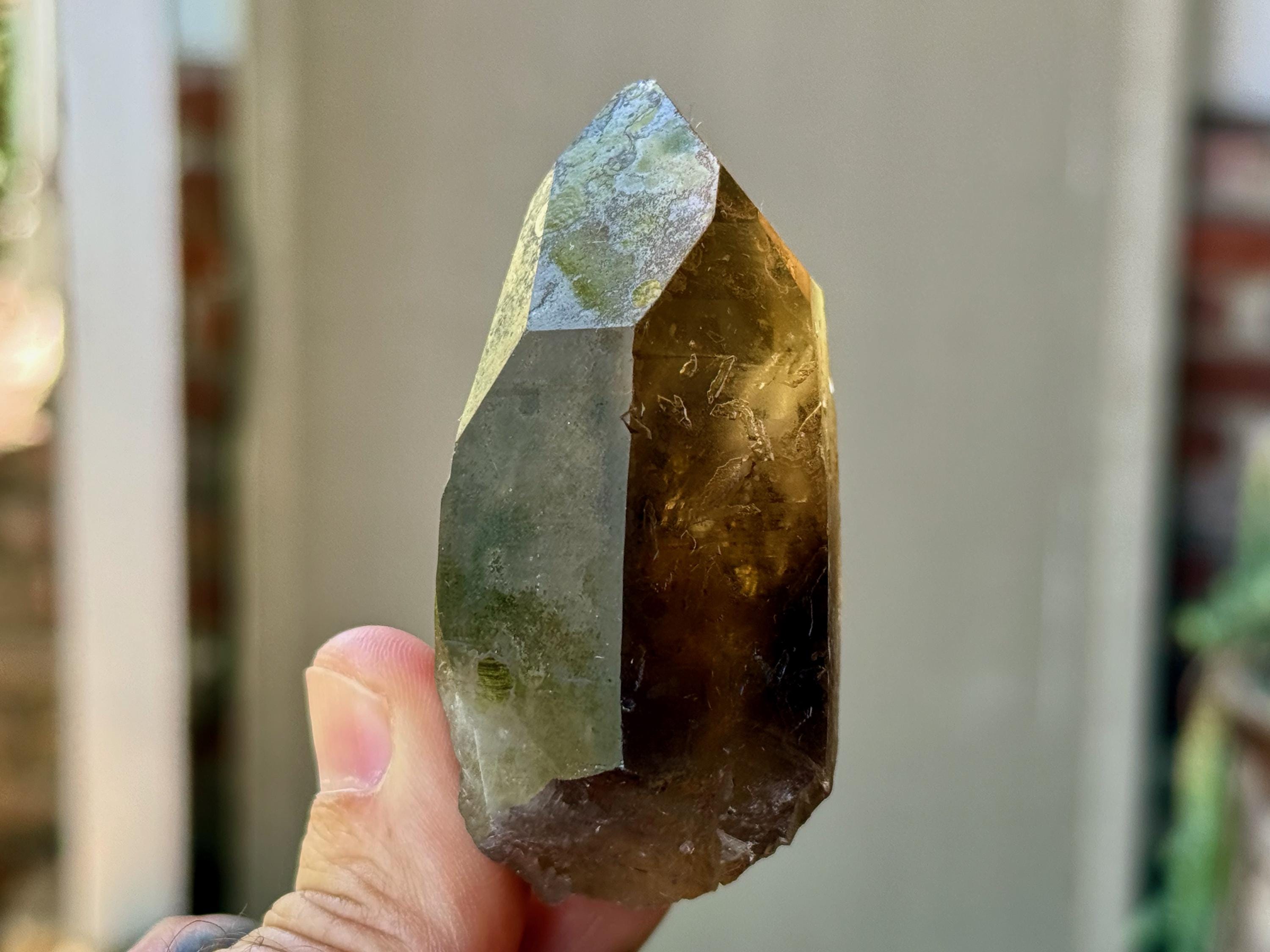 Elegant luster and nice clarity to this Pele's Dream Lemurian with a deep smoky-golden color. This crystal exhibits the gradient color we love to see on these crystals, with a darker smoky base that blends into a clearer and more golden top portion. When backlit, as in Photos 3-4, it lights up magnificently.