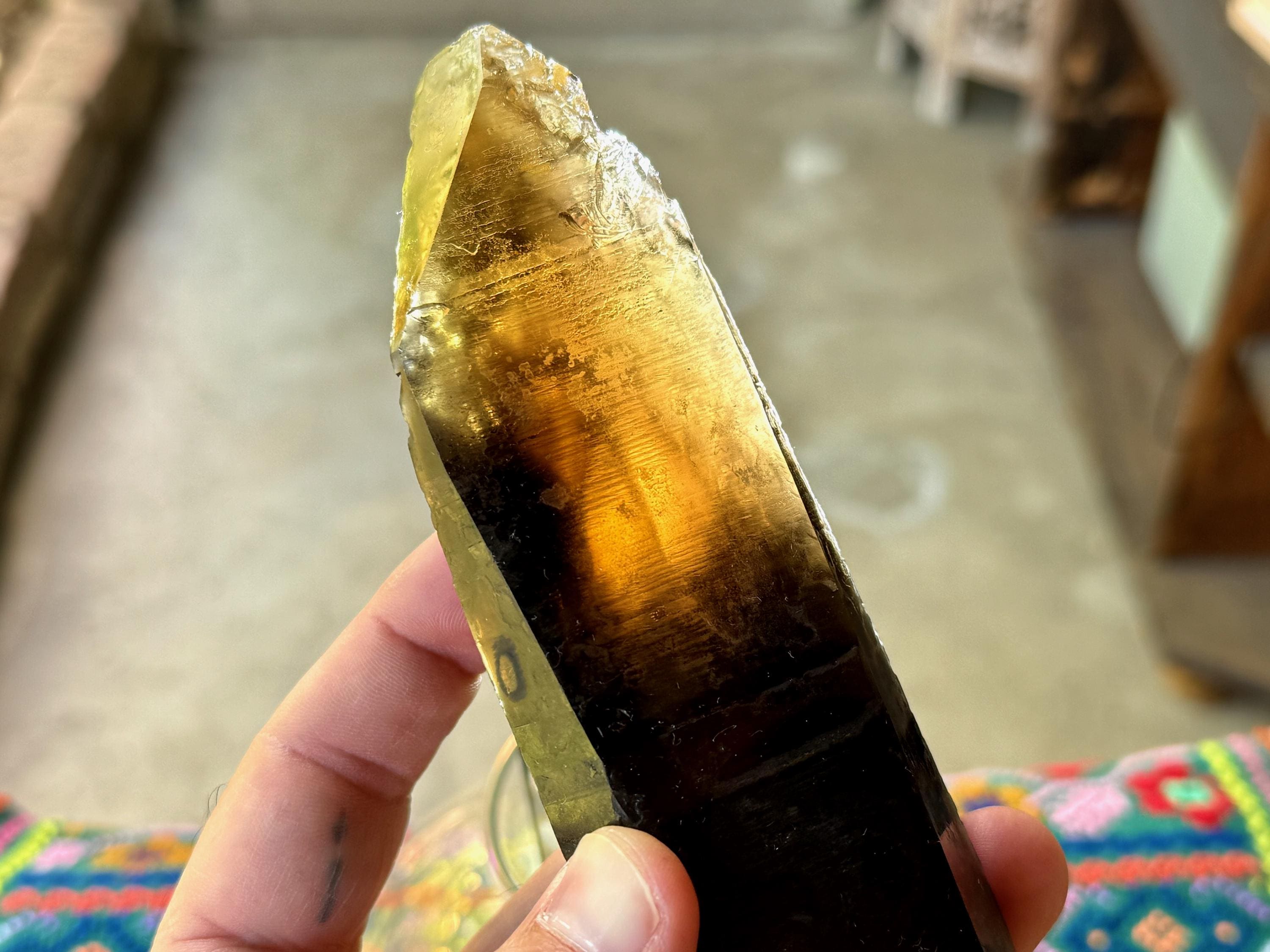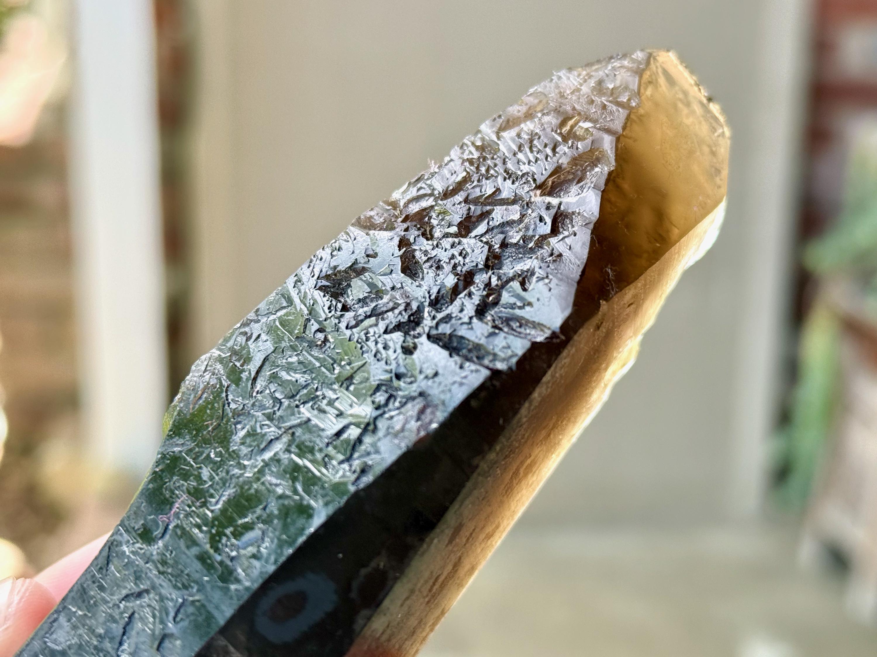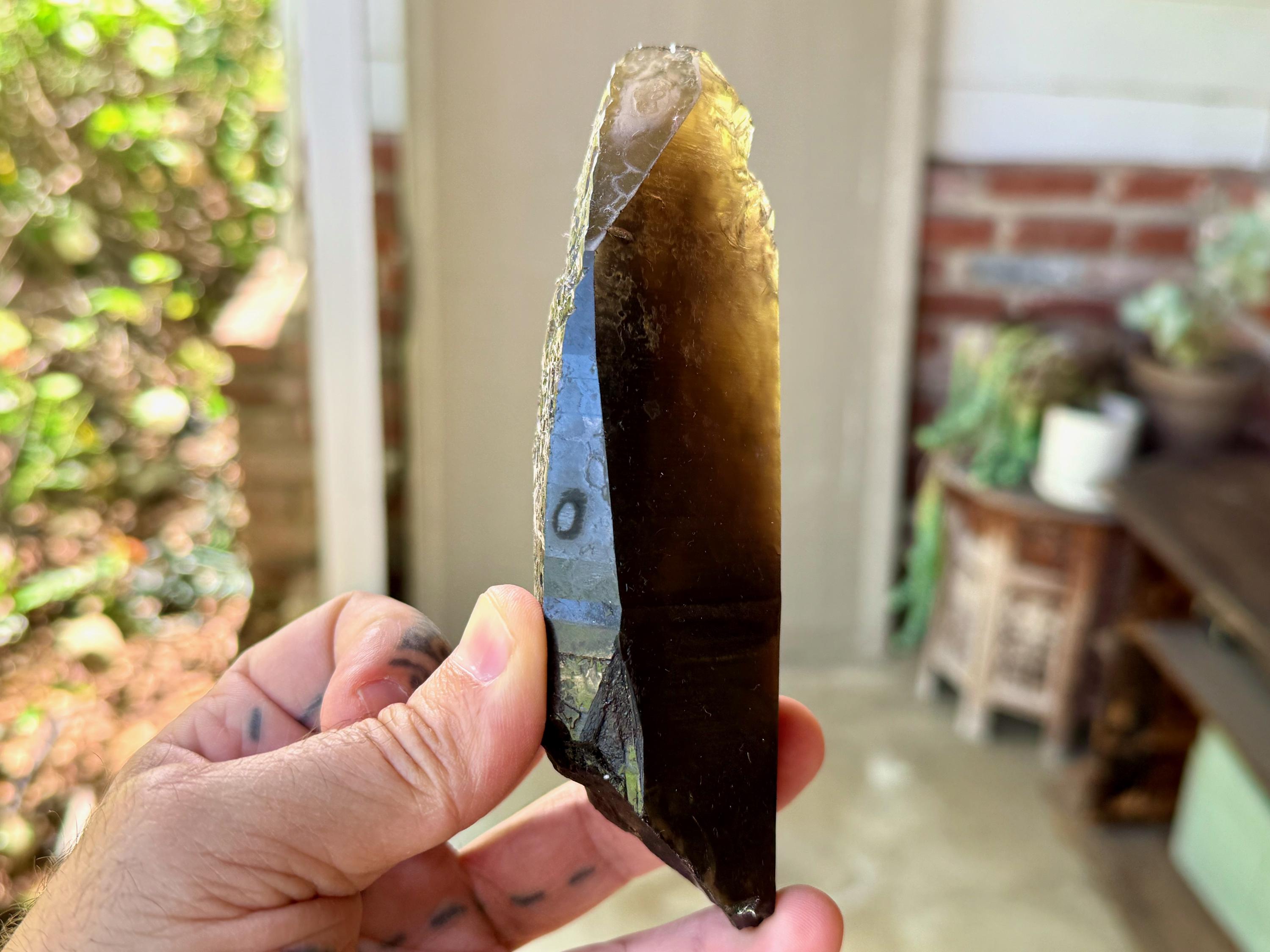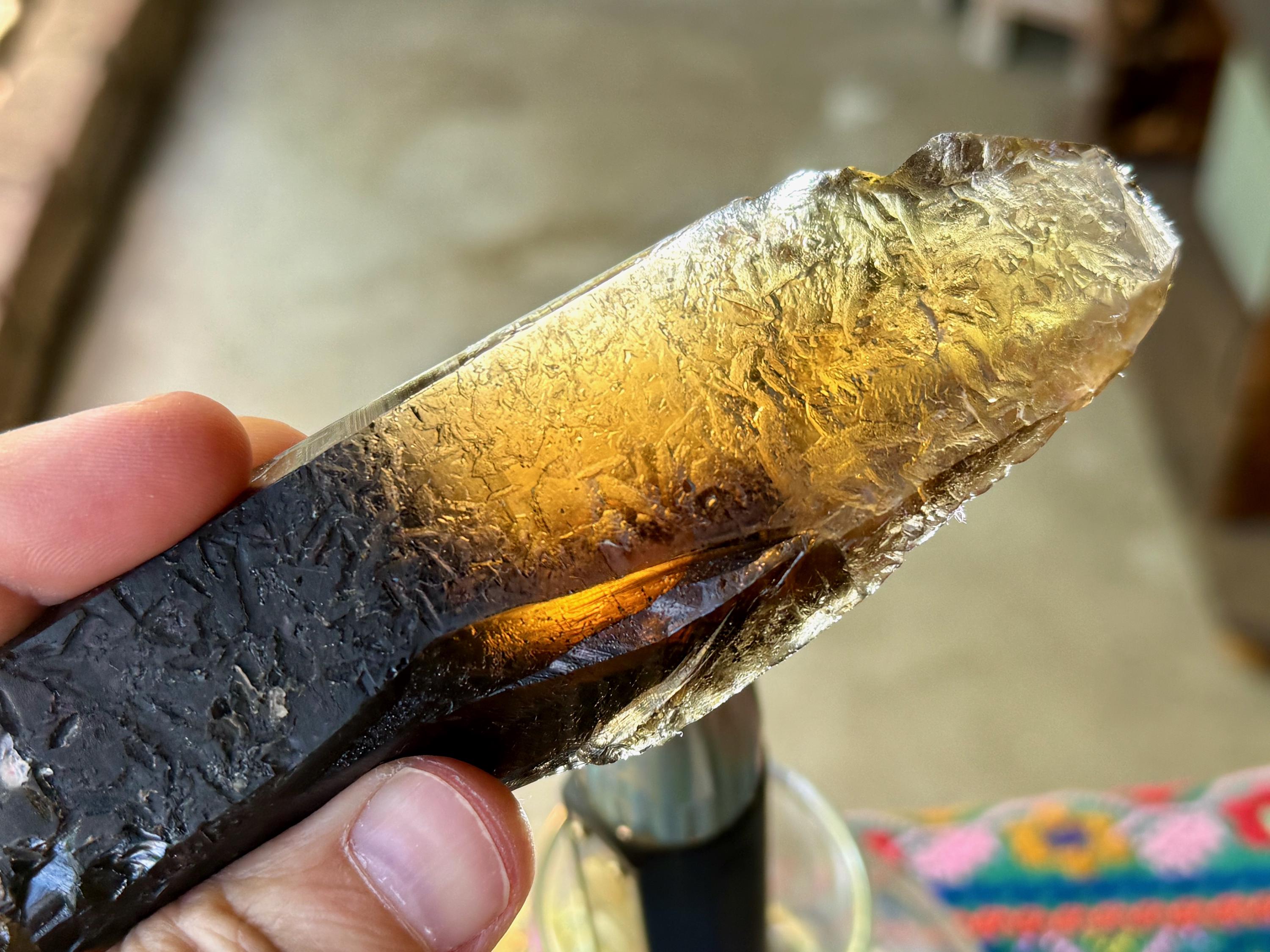 This crystal appears super dark and opaque at first, save for the golden tip. However, when backlit, it lights up brilliantly, revealing its vibrant Citrine golden color (Photos 3-4).