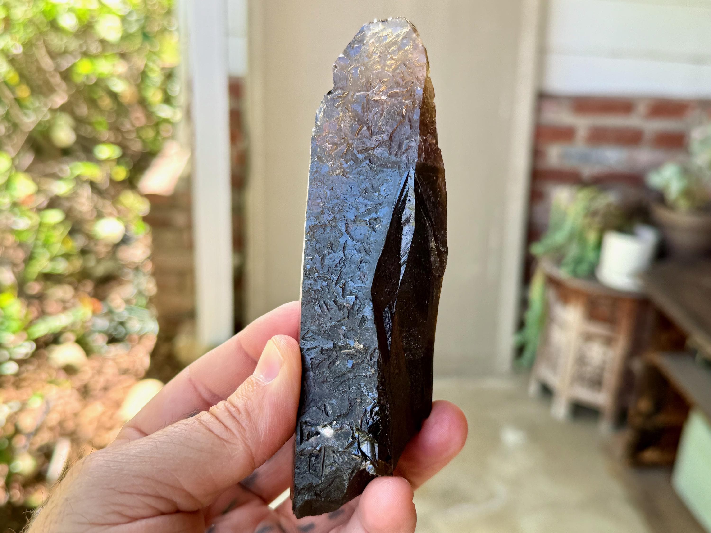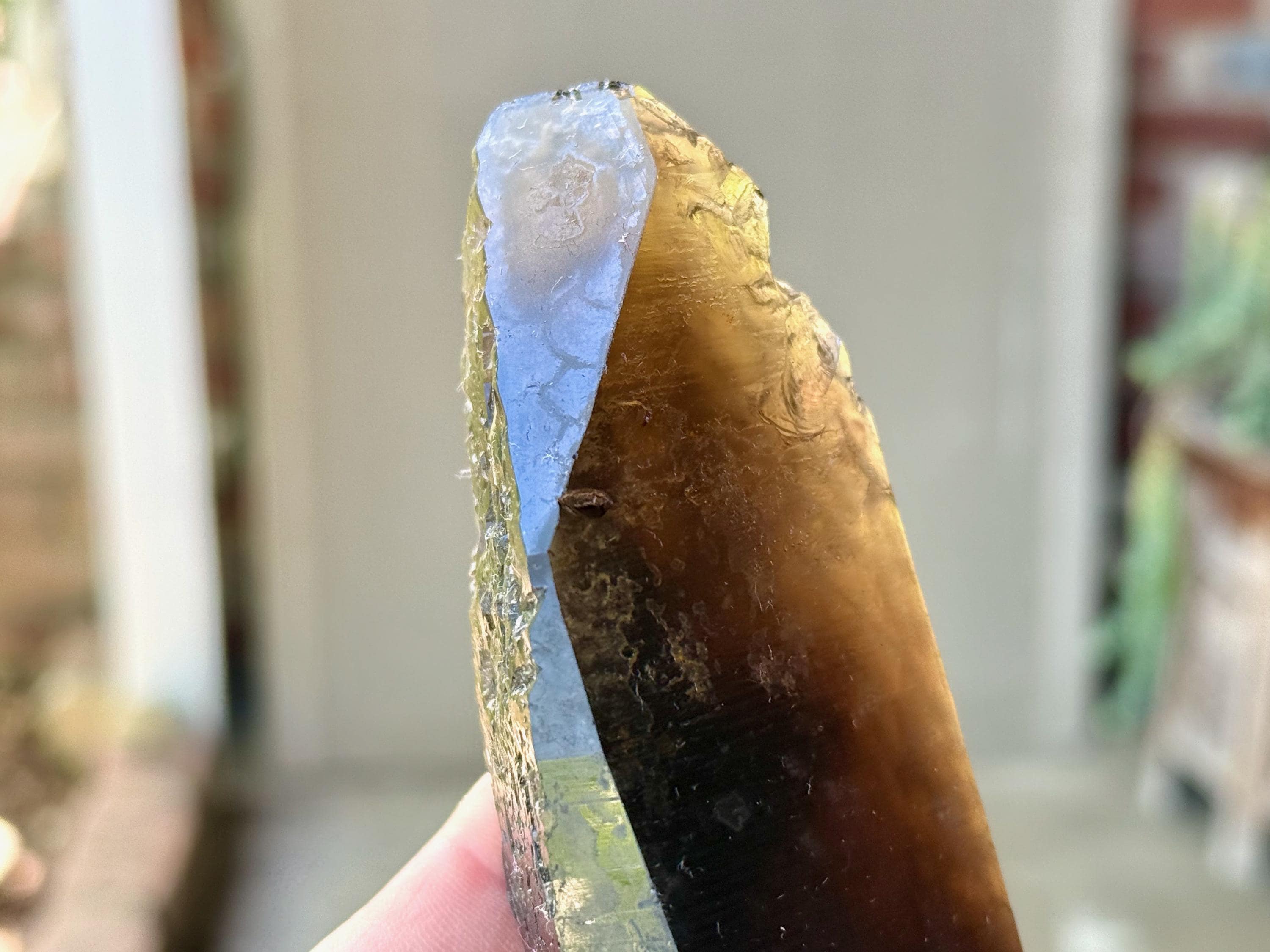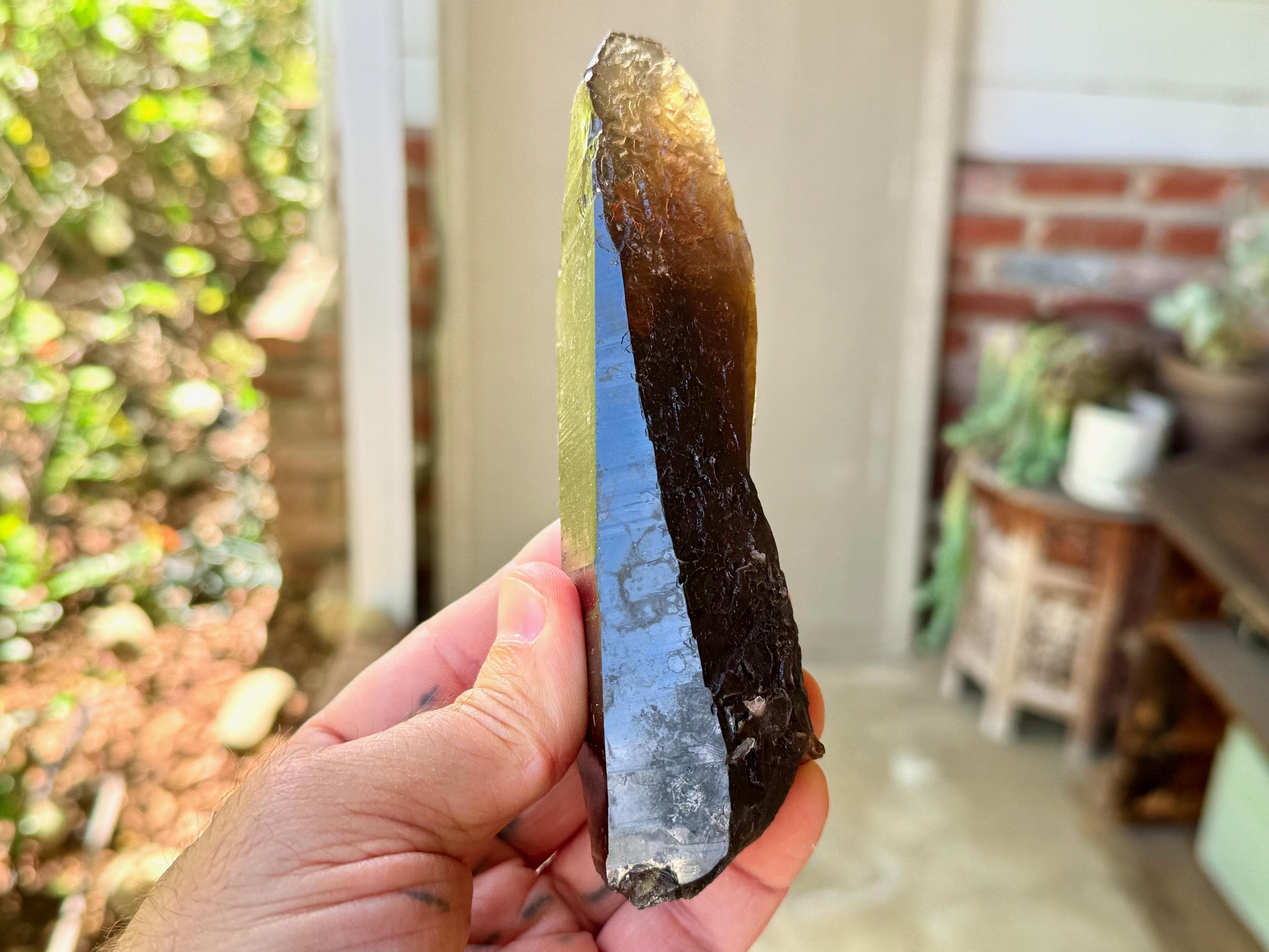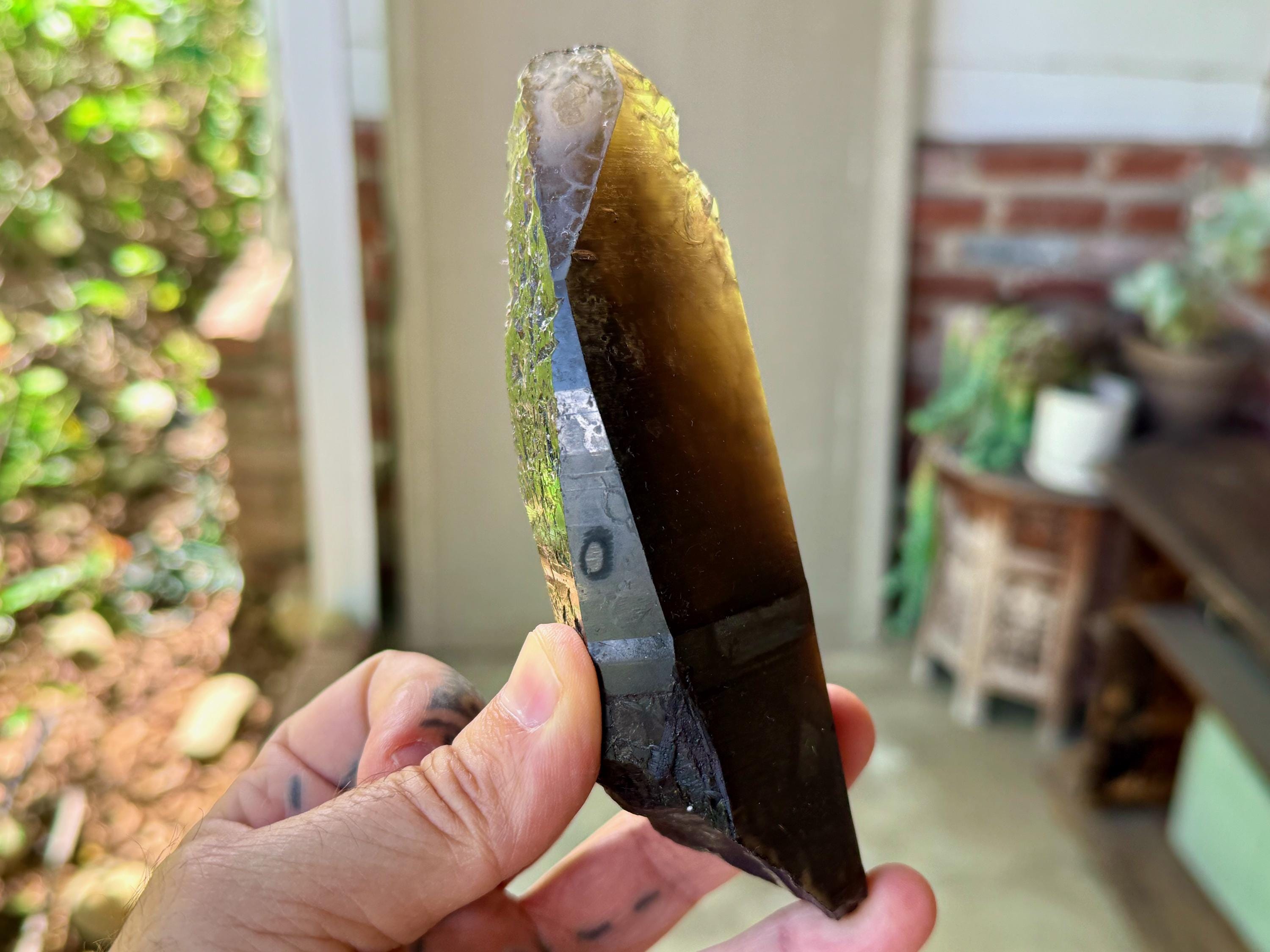This crystal appears super dark and opaque at first, save for the golden tip. However, when backlit, it lights up brilliantly, revealing its vibrant Citrine golden color (Photos 3-4).