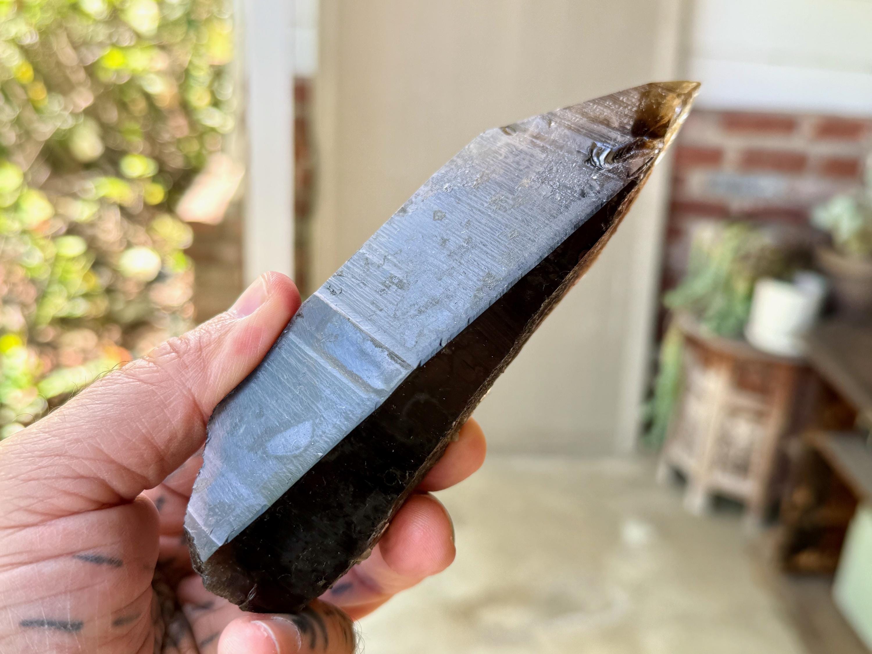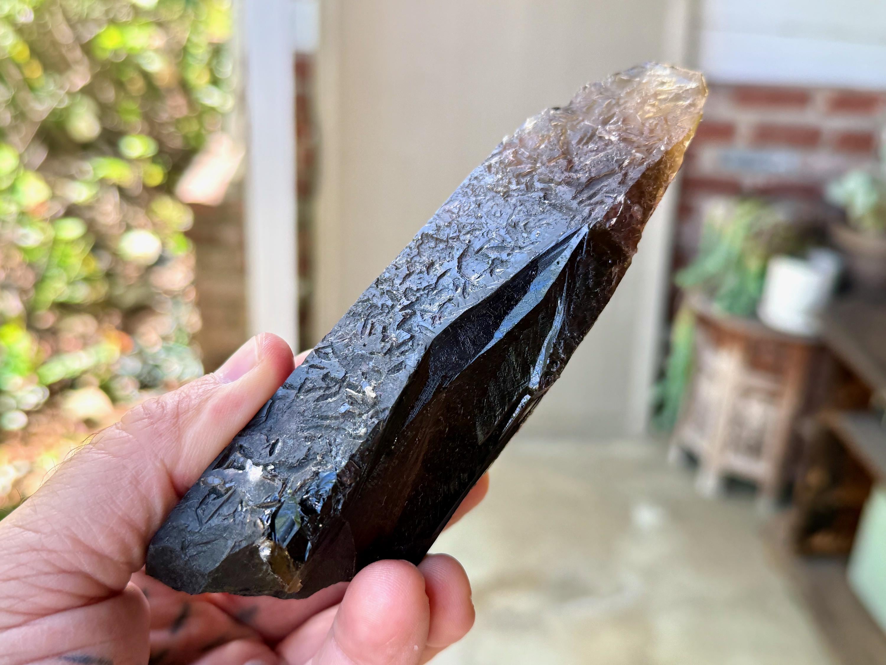 Darkly elegant luster to this Pele's Dream Lemurian Quartz with a sleek elongated formation. This crystal features a very mild indication of striations on its right side, with deep textural impressions on the left and backsides.