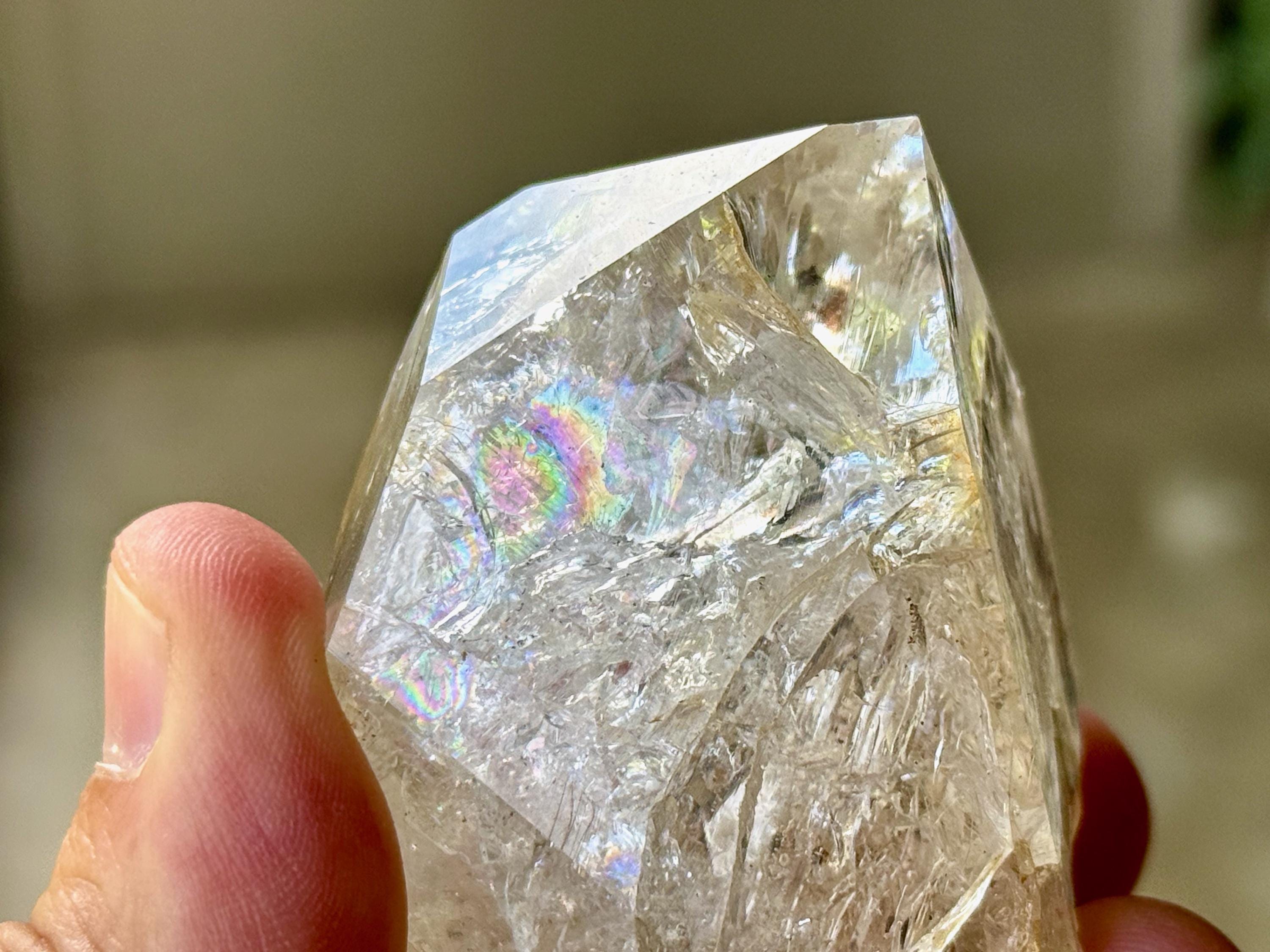 The clarity of this piece allows us to peer within and enjoy all the lovely crystalline structures within. Many of these are self-healed indications, with mirror-like reflectivity, so this piece just seems to emanate light!
