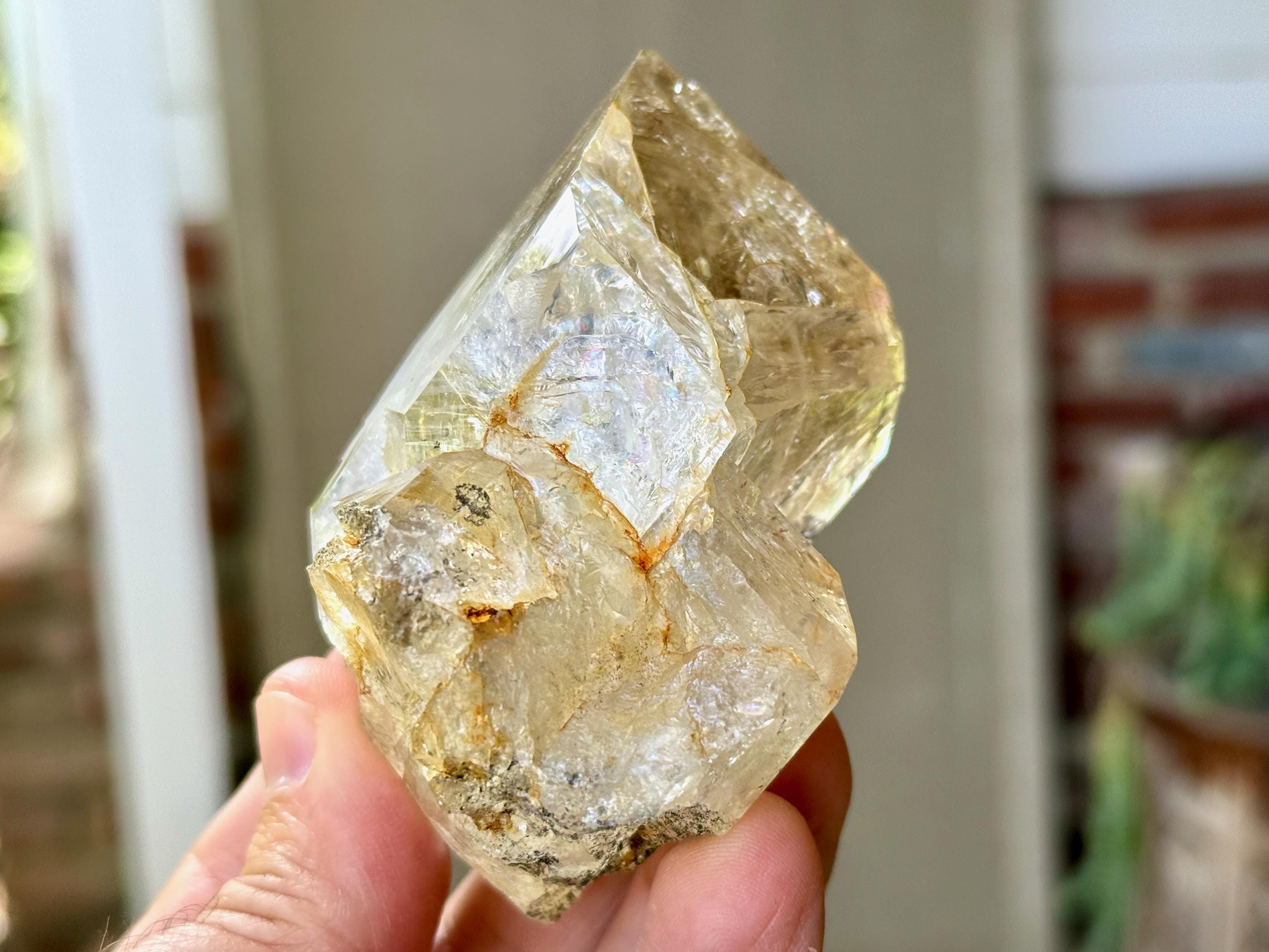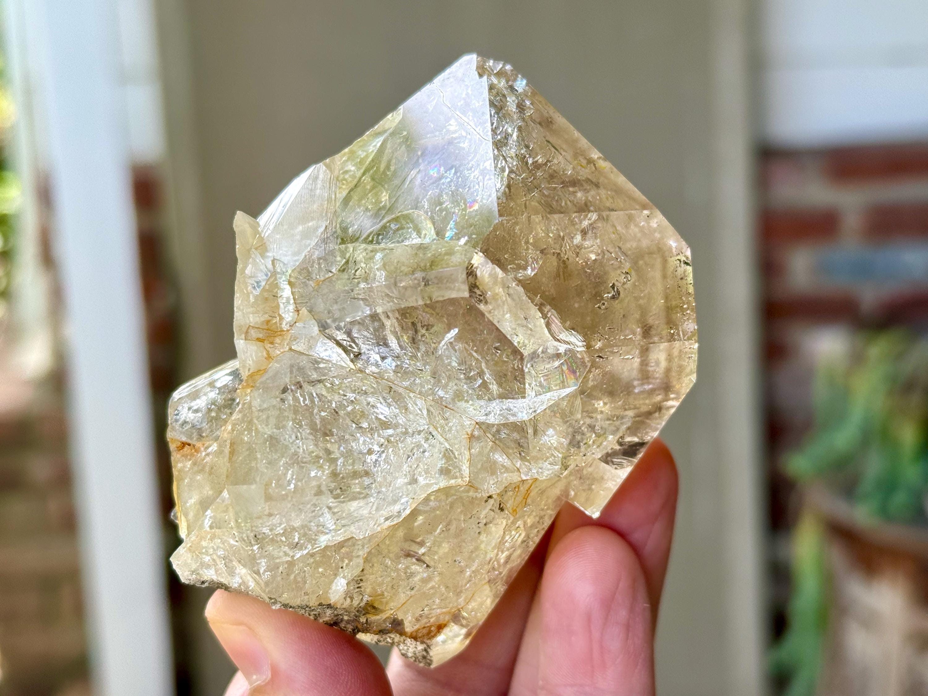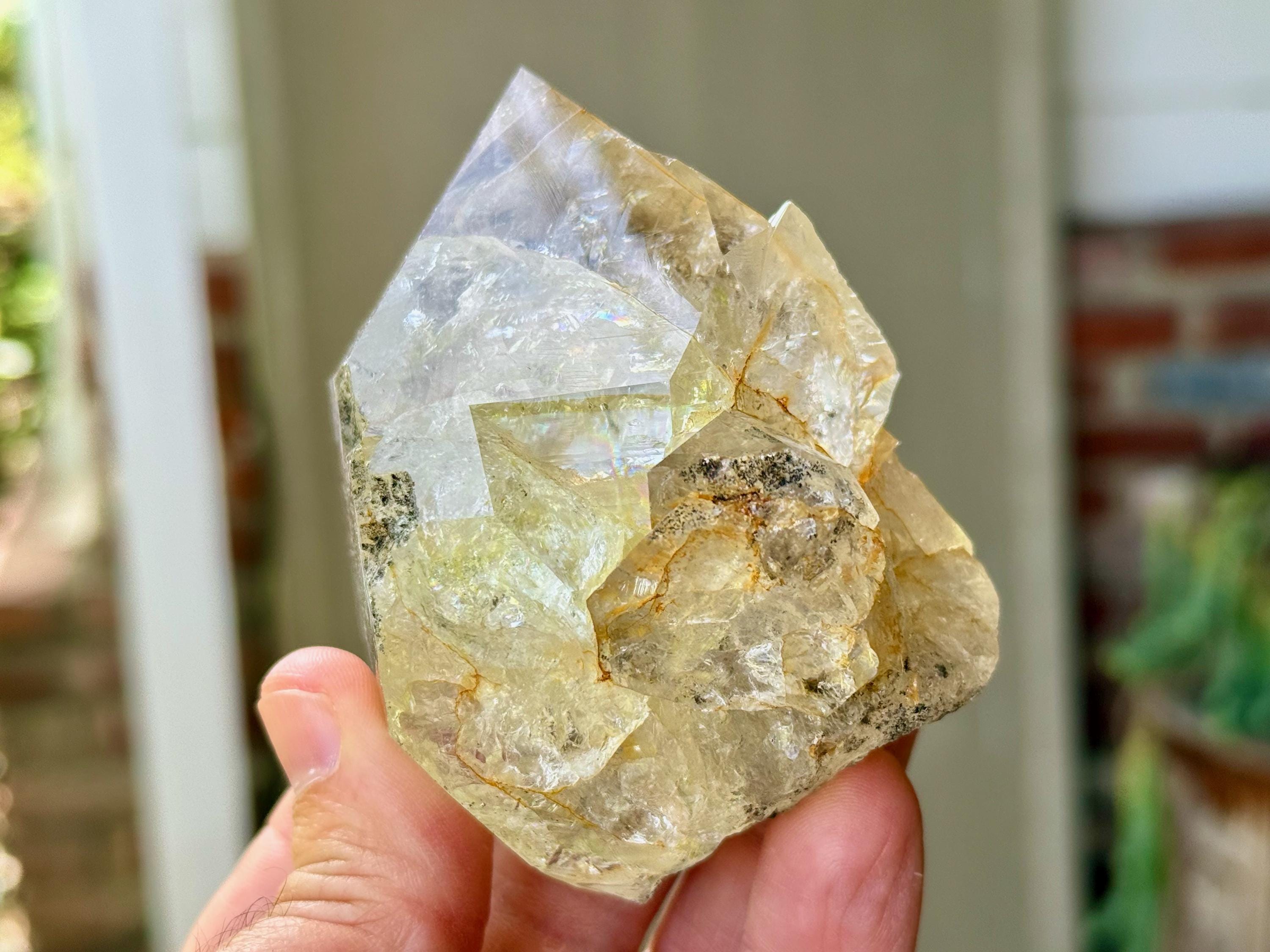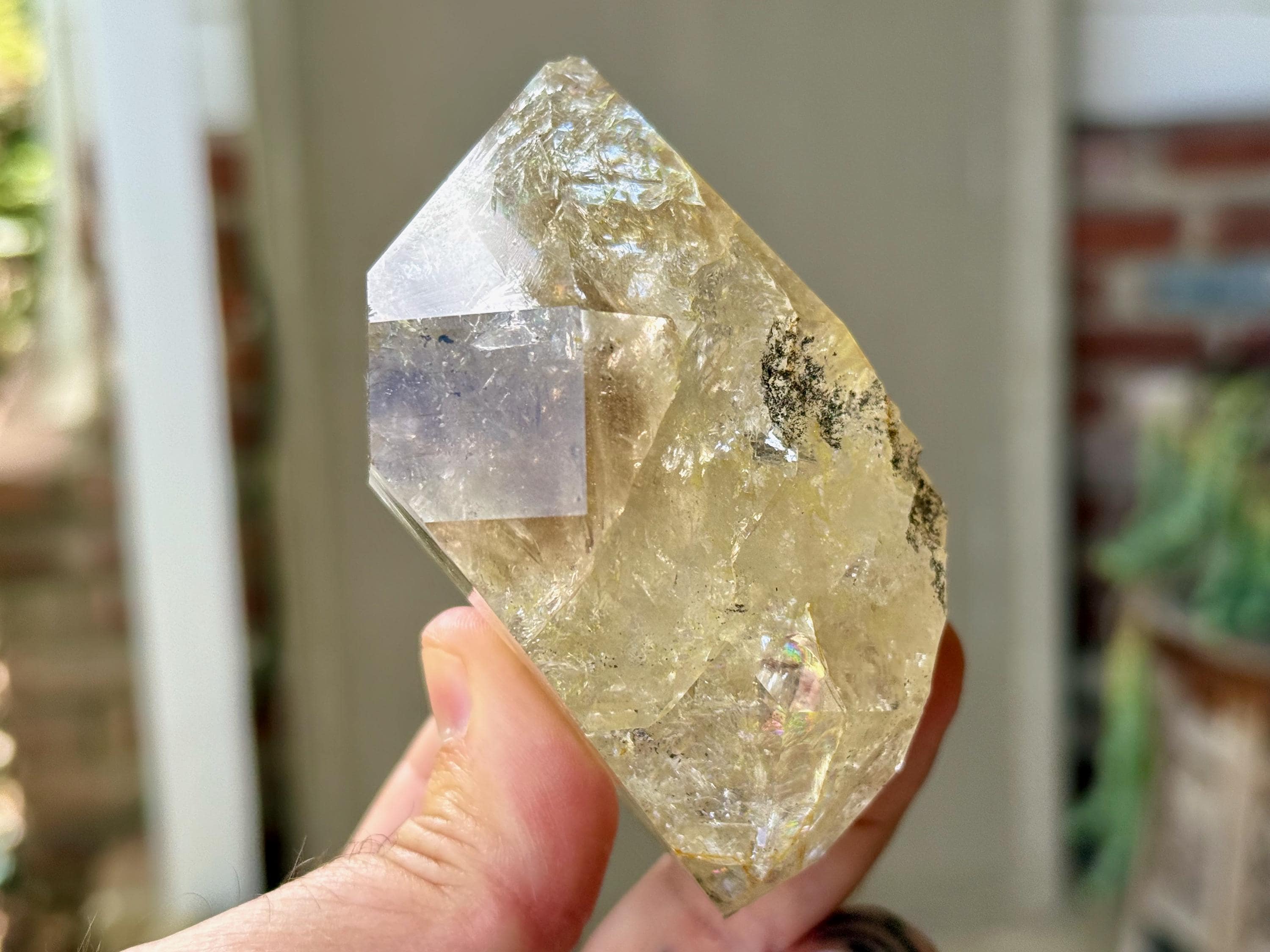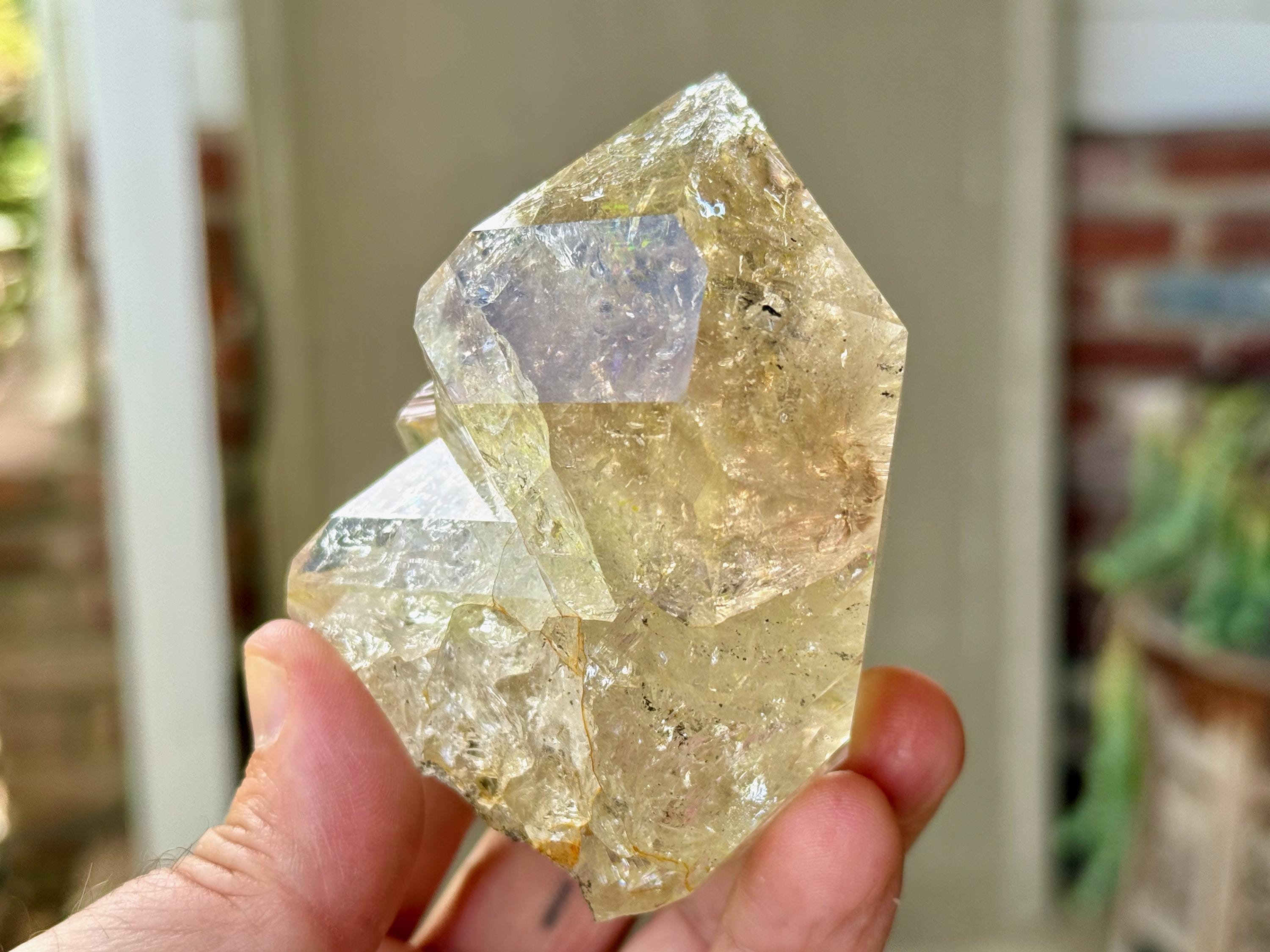 This crystal is filled with tiny flashing rainbows in the top portion, especially in natural, direct light. It possesses a GIANT main facet area, and is somewhat of a partial twin that has "merged" together, as we can see at the base of this crystal. We're just noticing now some more lovely rainbows at the base main facet that we didn't catch in the photos!