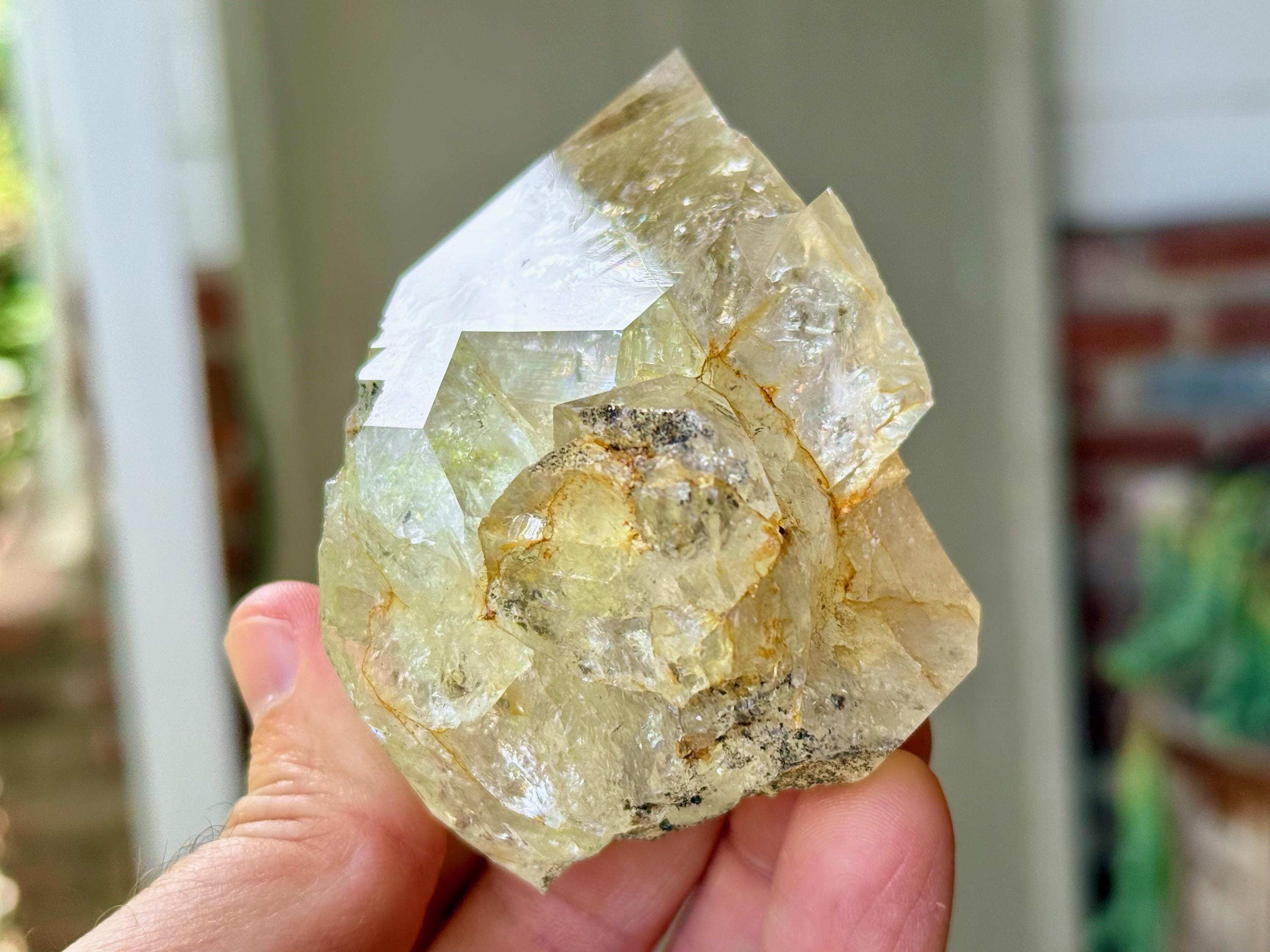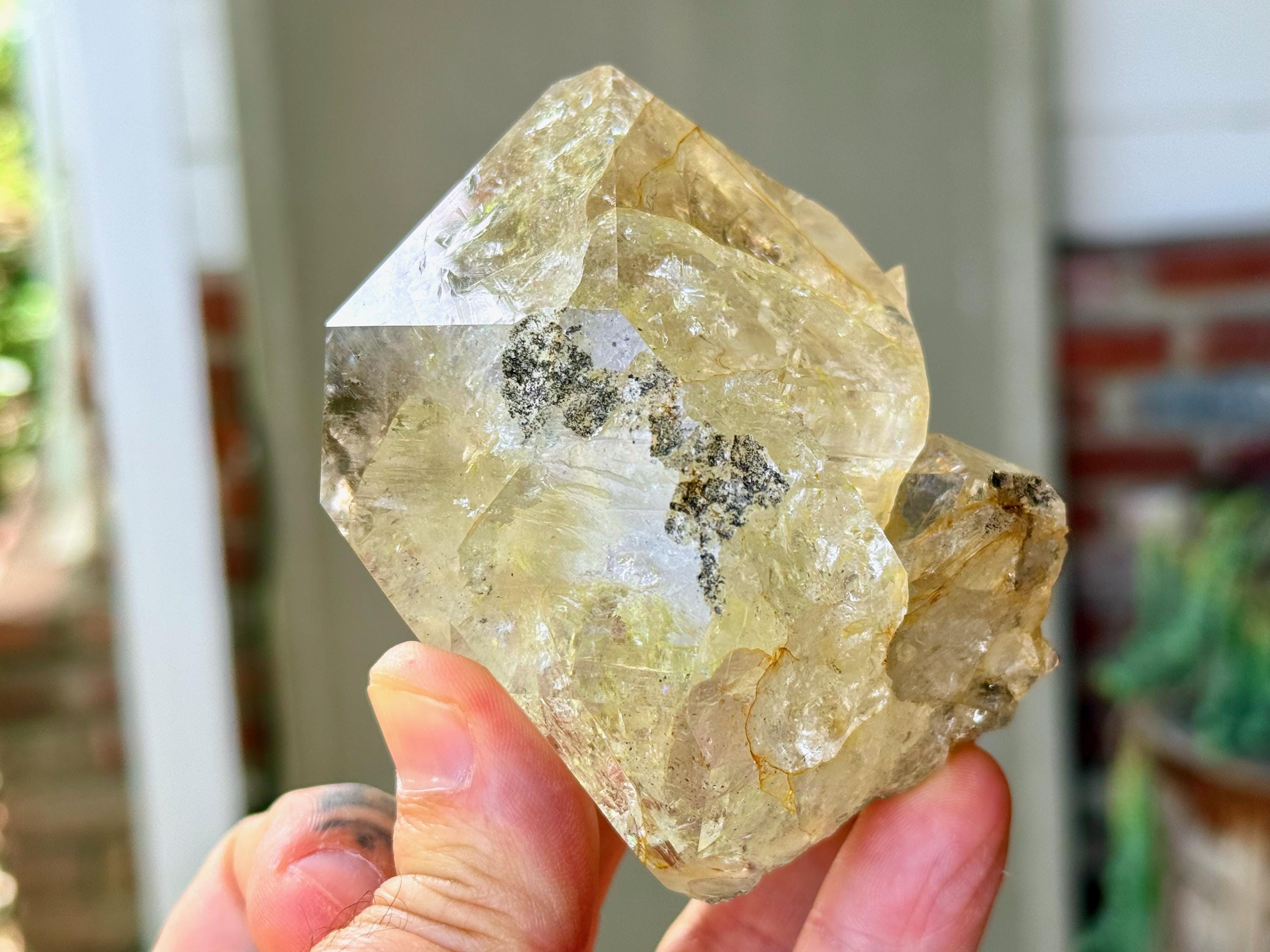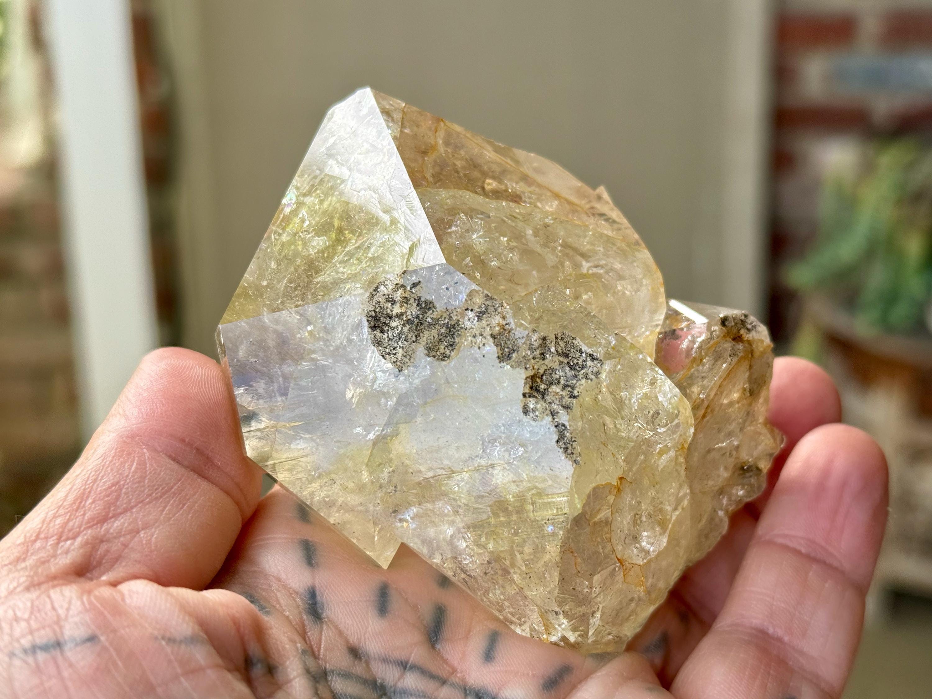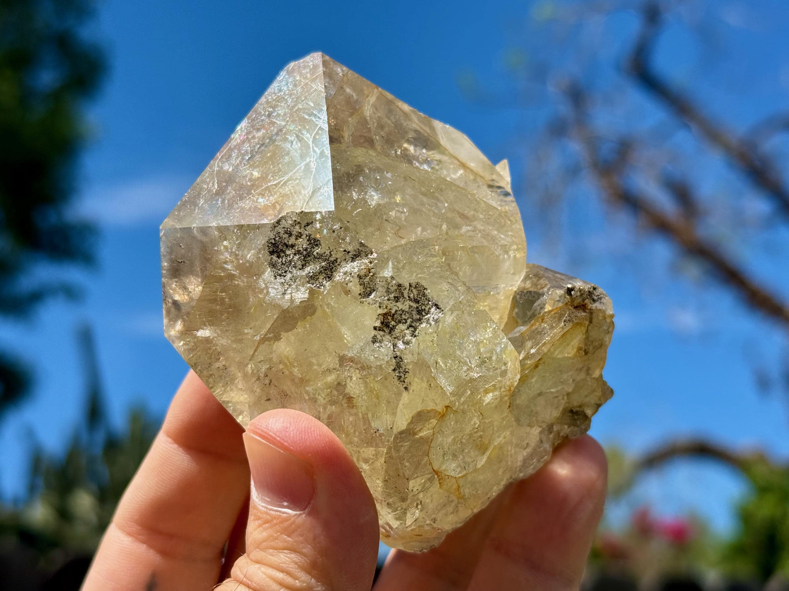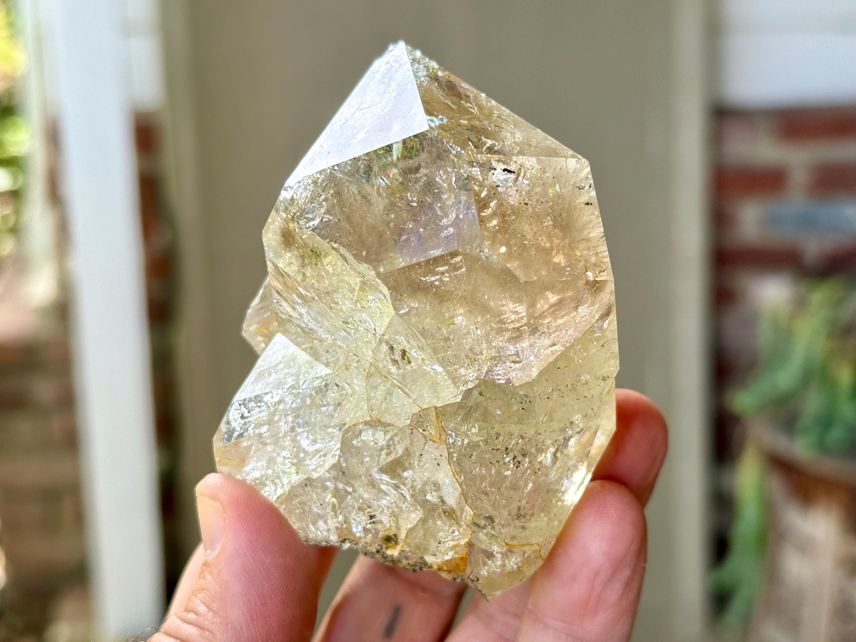 This crystal is filled with tiny flashing rainbows in the top portion, especially in natural, direct light. It possesses a GIANT main facet area, and is somewhat of a partial twin that has "merged" together, as we can see at the base of this crystal. We're just noticing now some more lovely rainbows at the base main facet that we didn't catch in the photos!