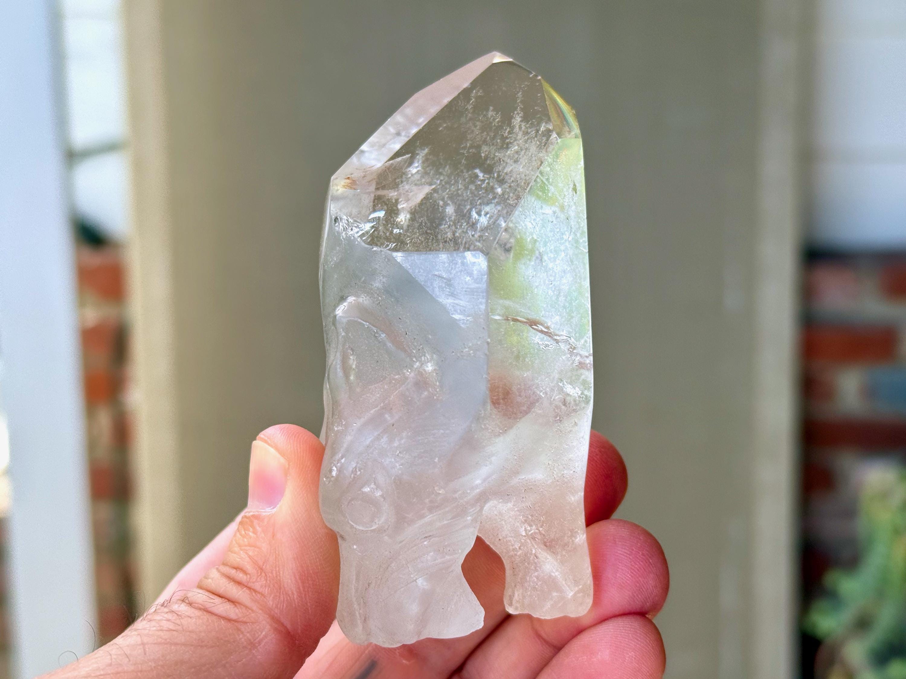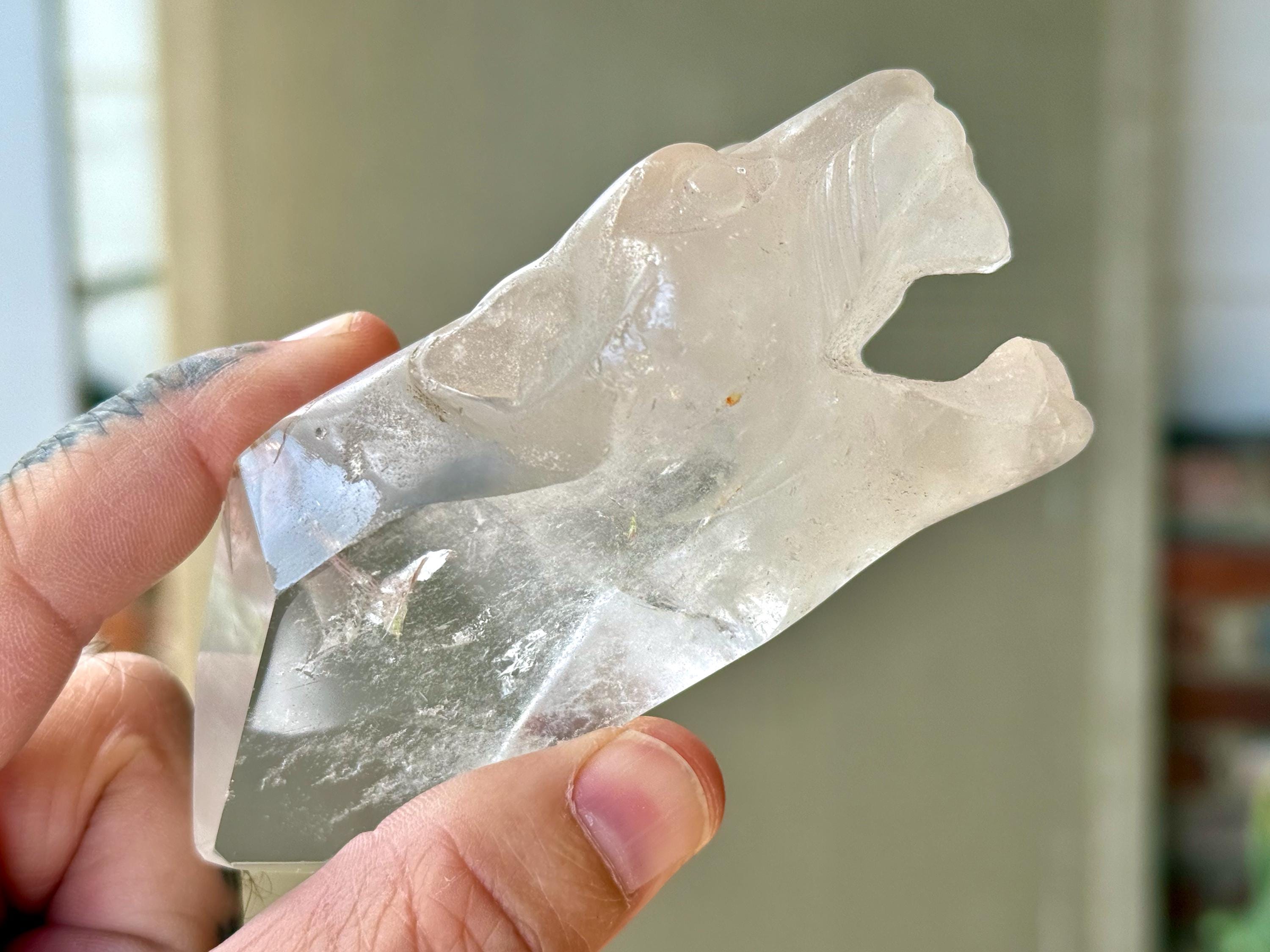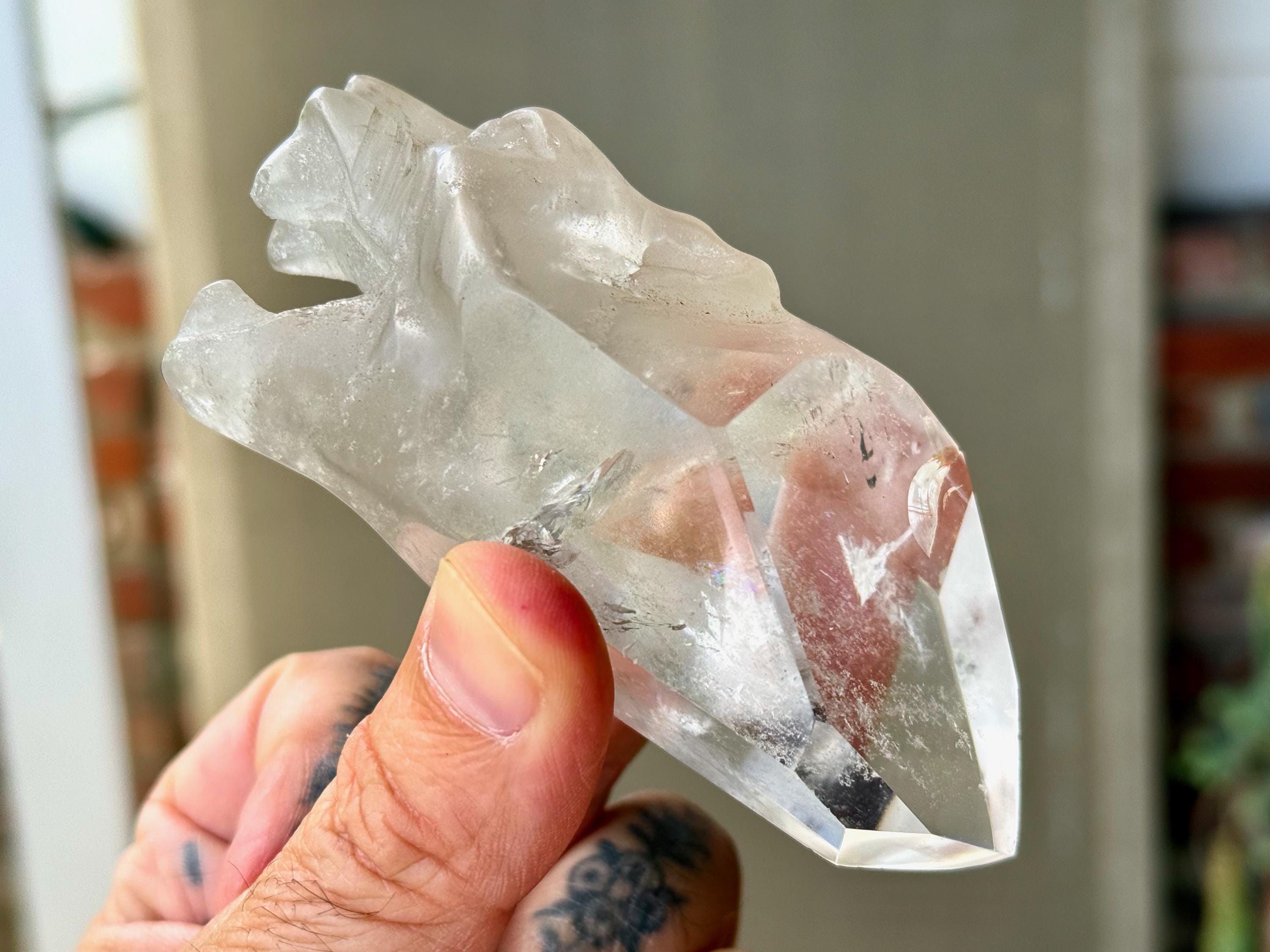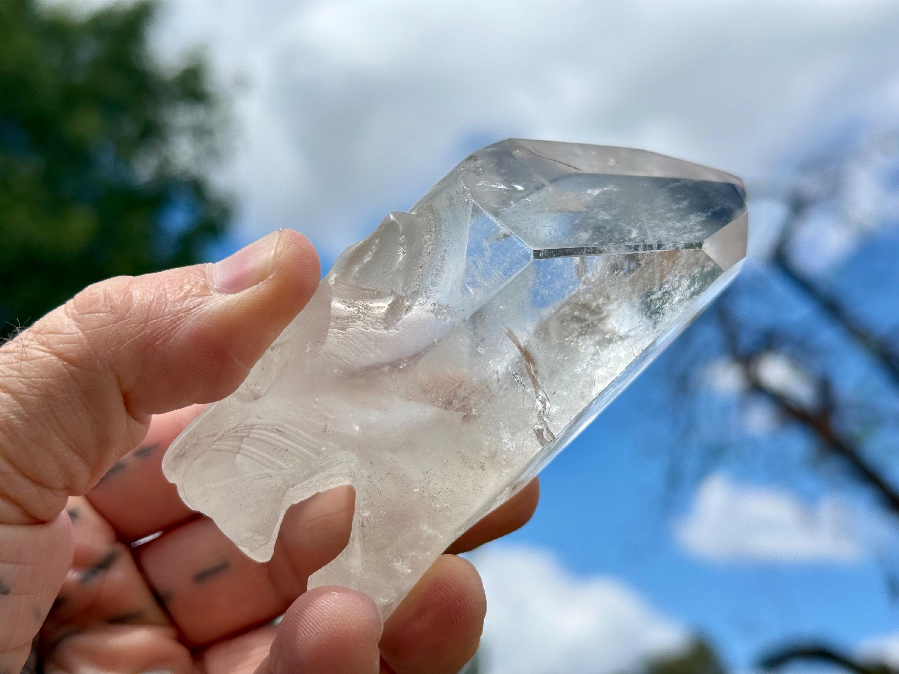 The Quartz is water clear and the carving is incredibly articulated. The main facet area and sides are polished, and the termination is beautiful. There's one *very* minor chip at the base of the main facet on the left side.