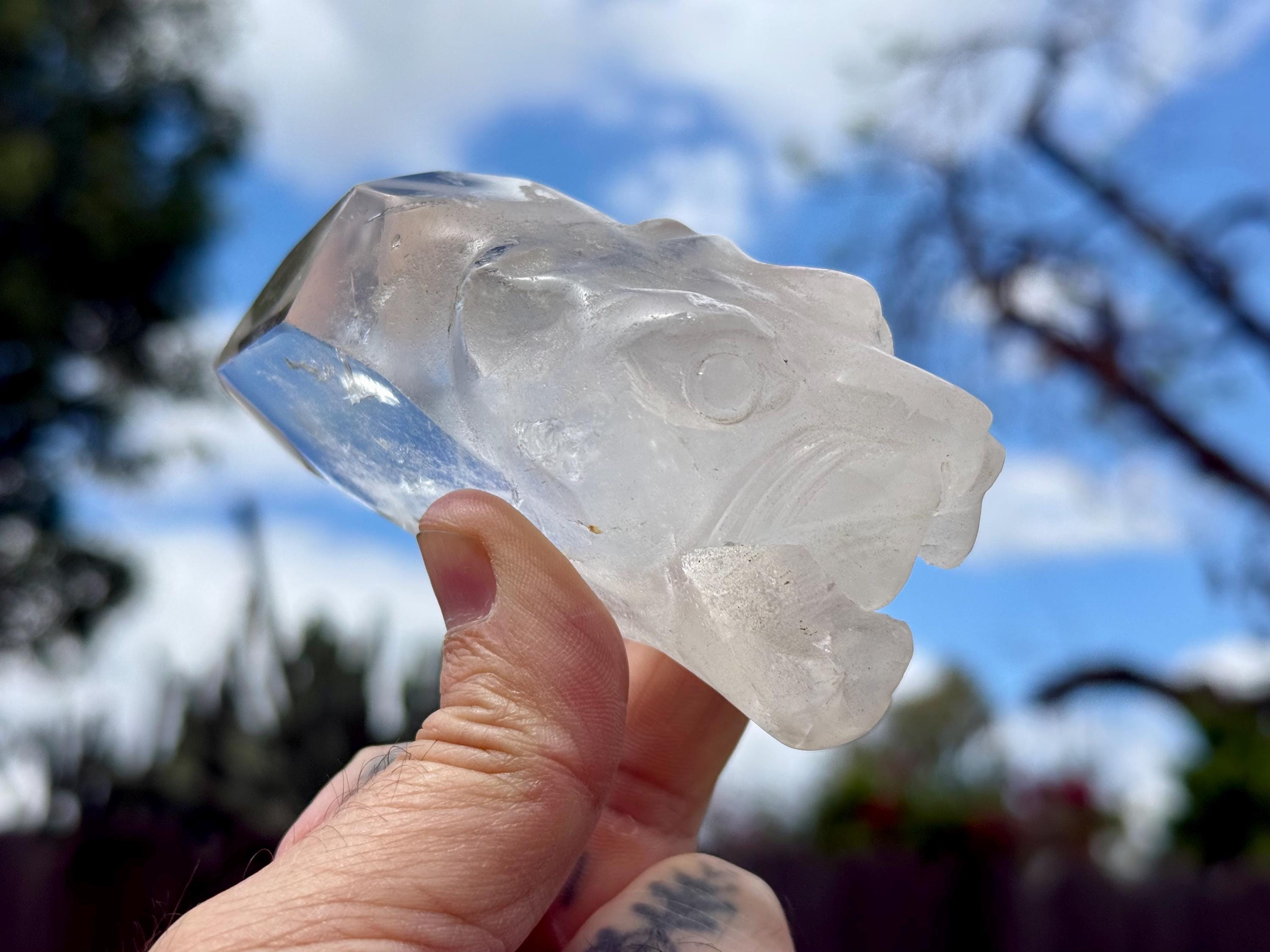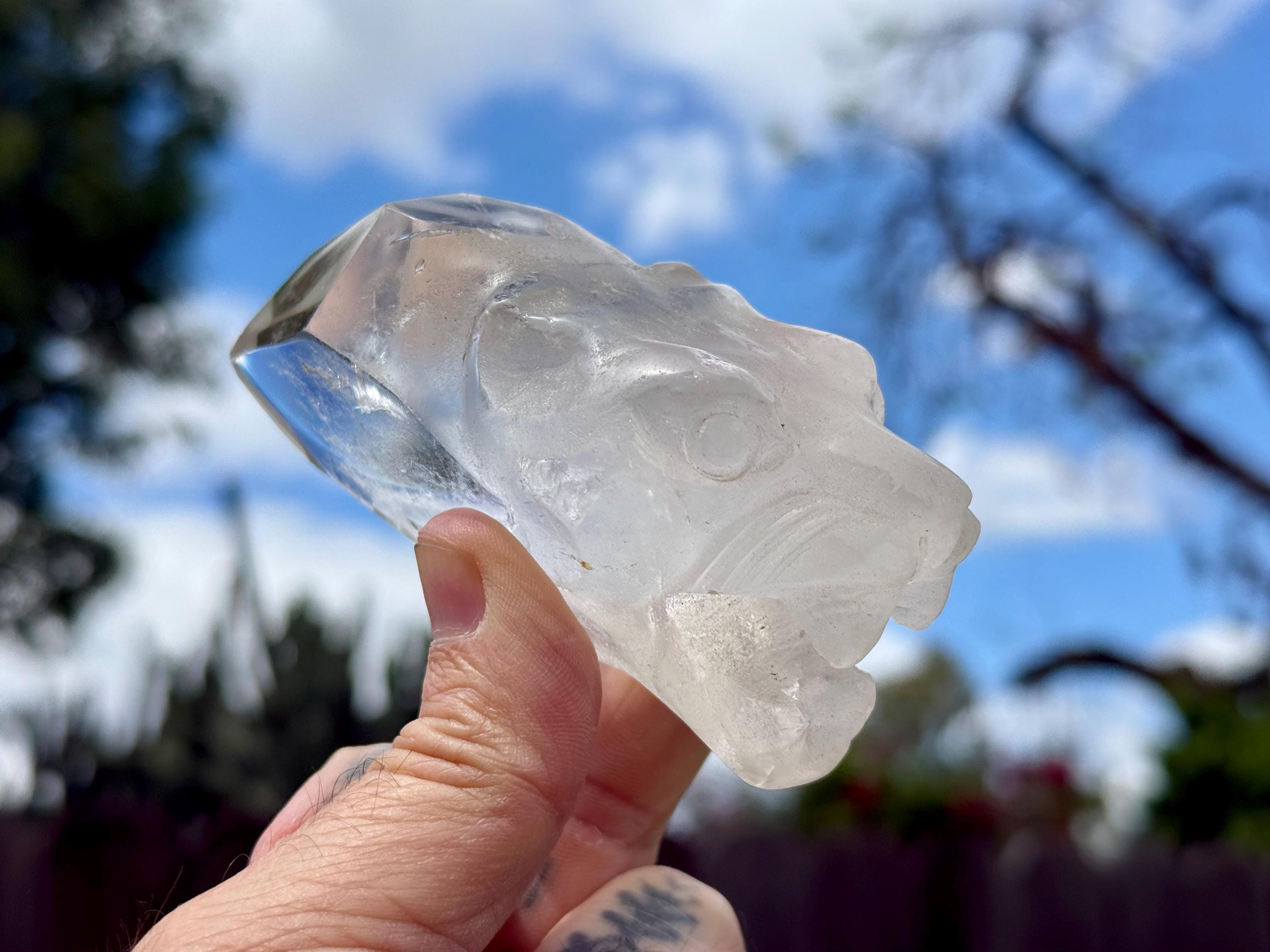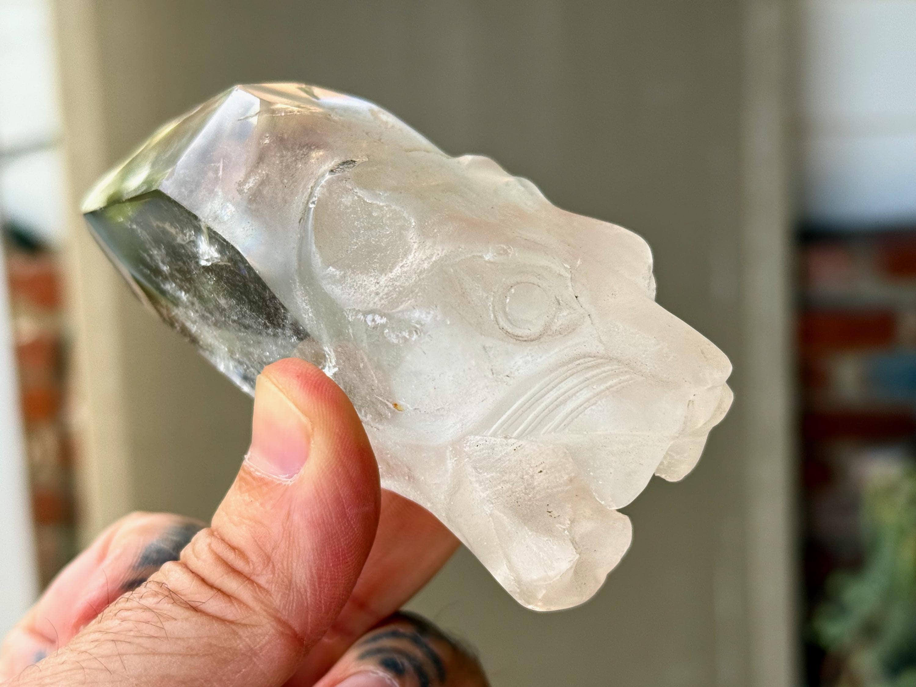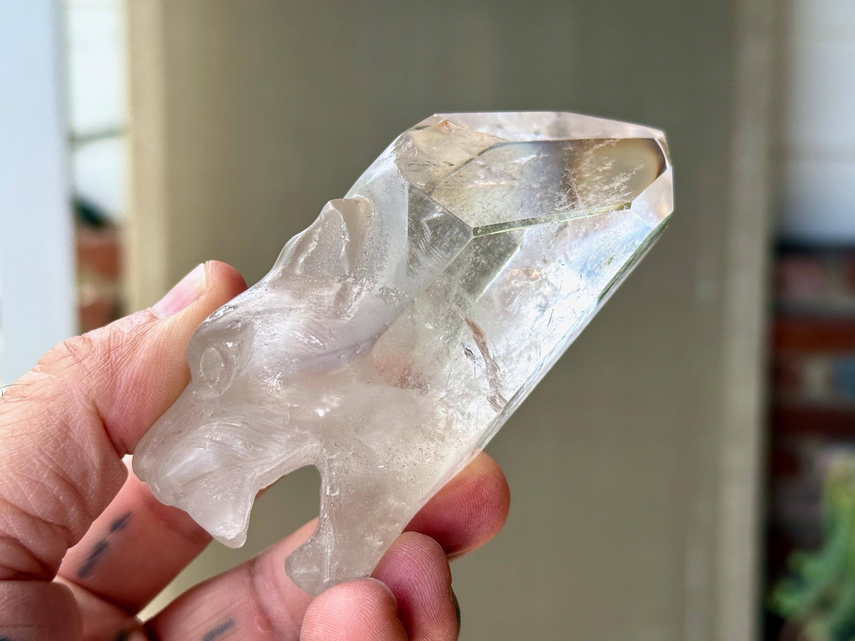 The Quartz is water clear and the carving is incredibly articulated. The main facet area and sides are polished, and the termination is beautiful. There's one *very* minor chip at the base of the main facet on the left side.