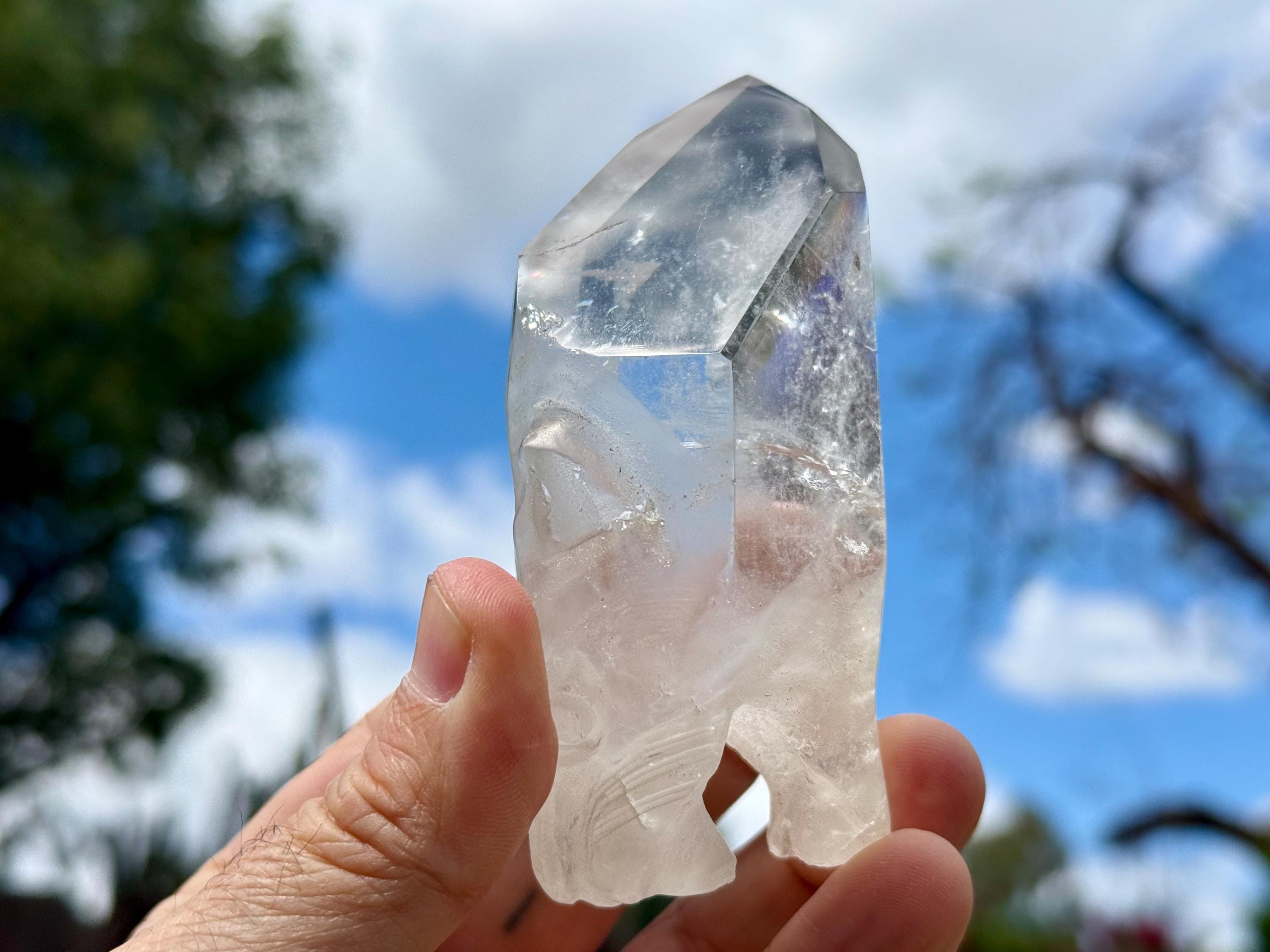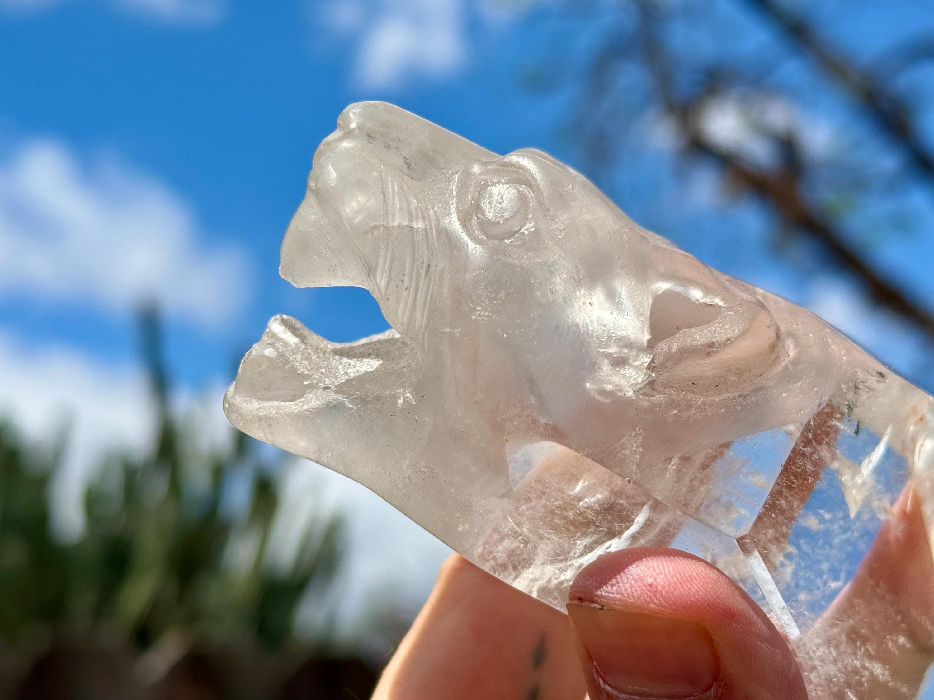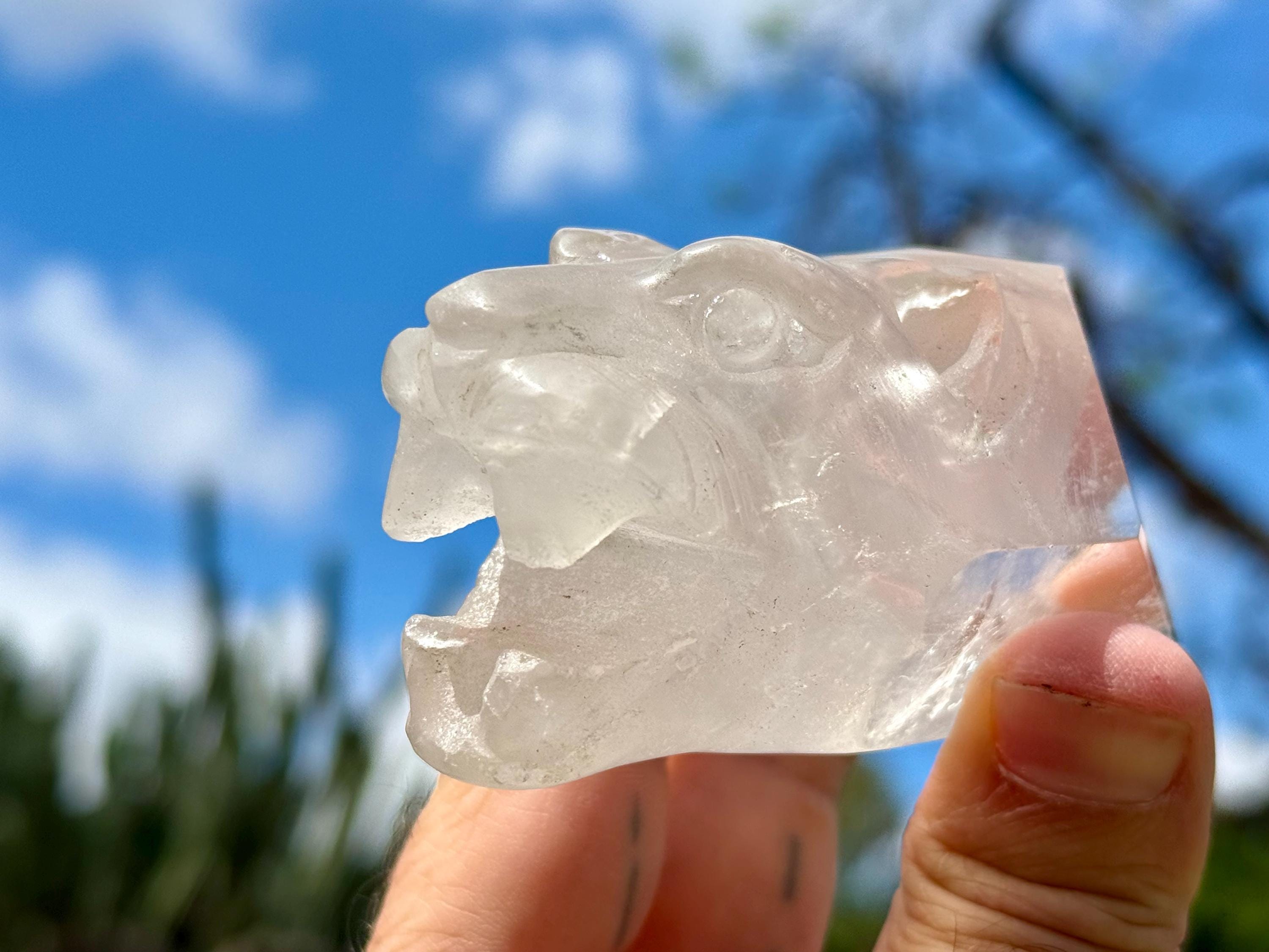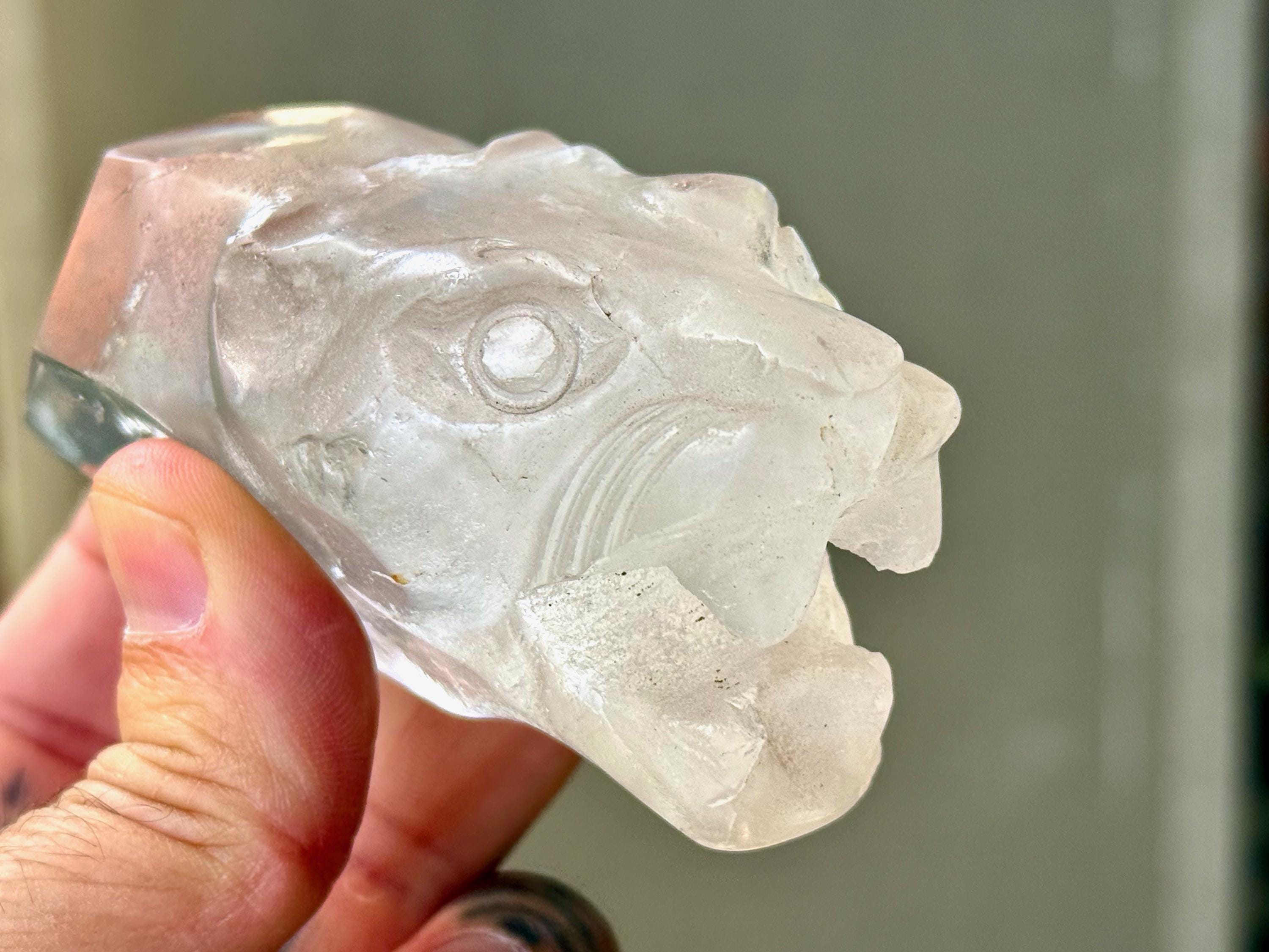 The Quartz is water clear and the carving is incredibly articulated. The main facet area and sides are polished, and the termination is beautiful. There's one *very* minor chip at the base of the main facet on the left side.