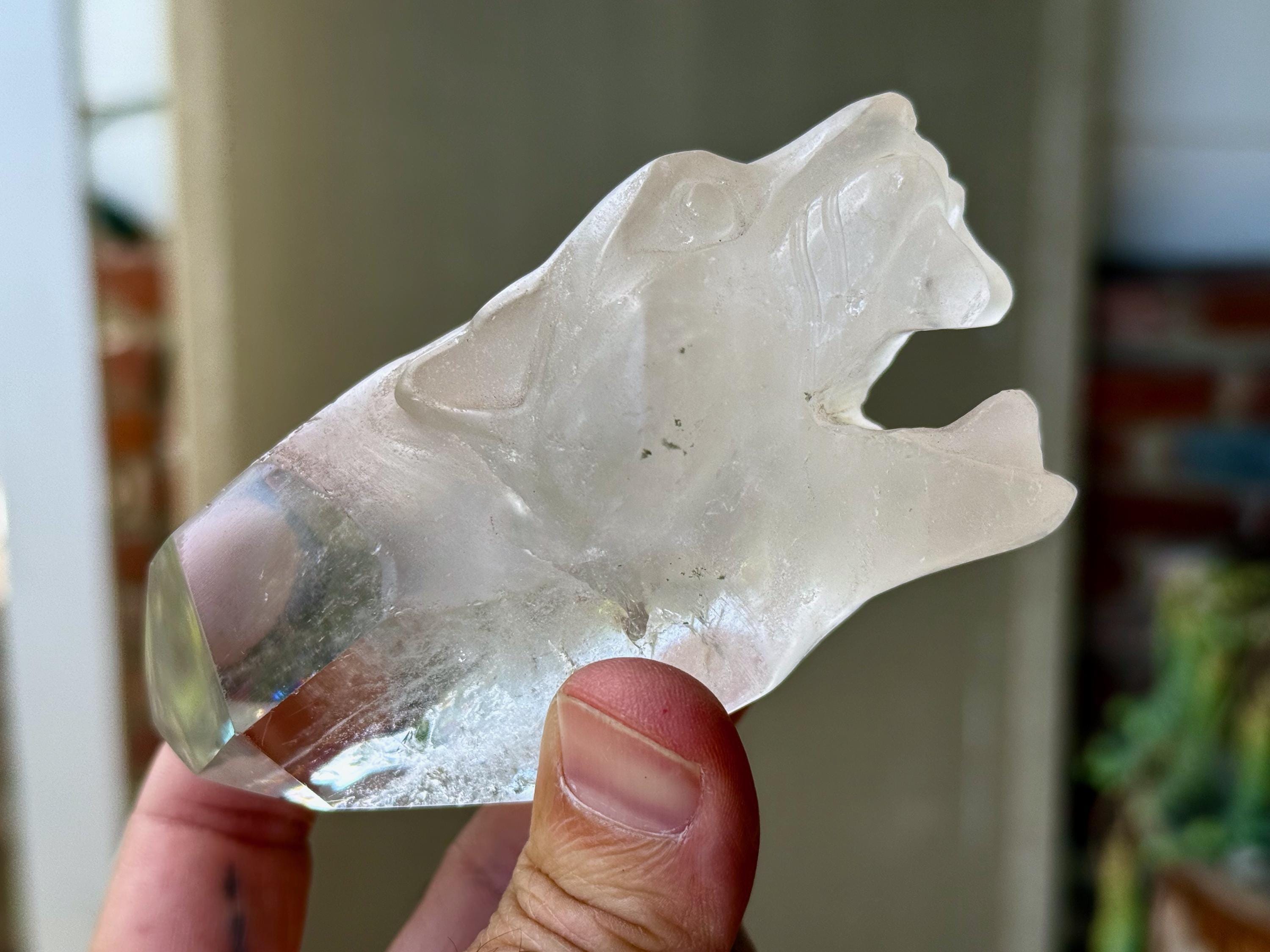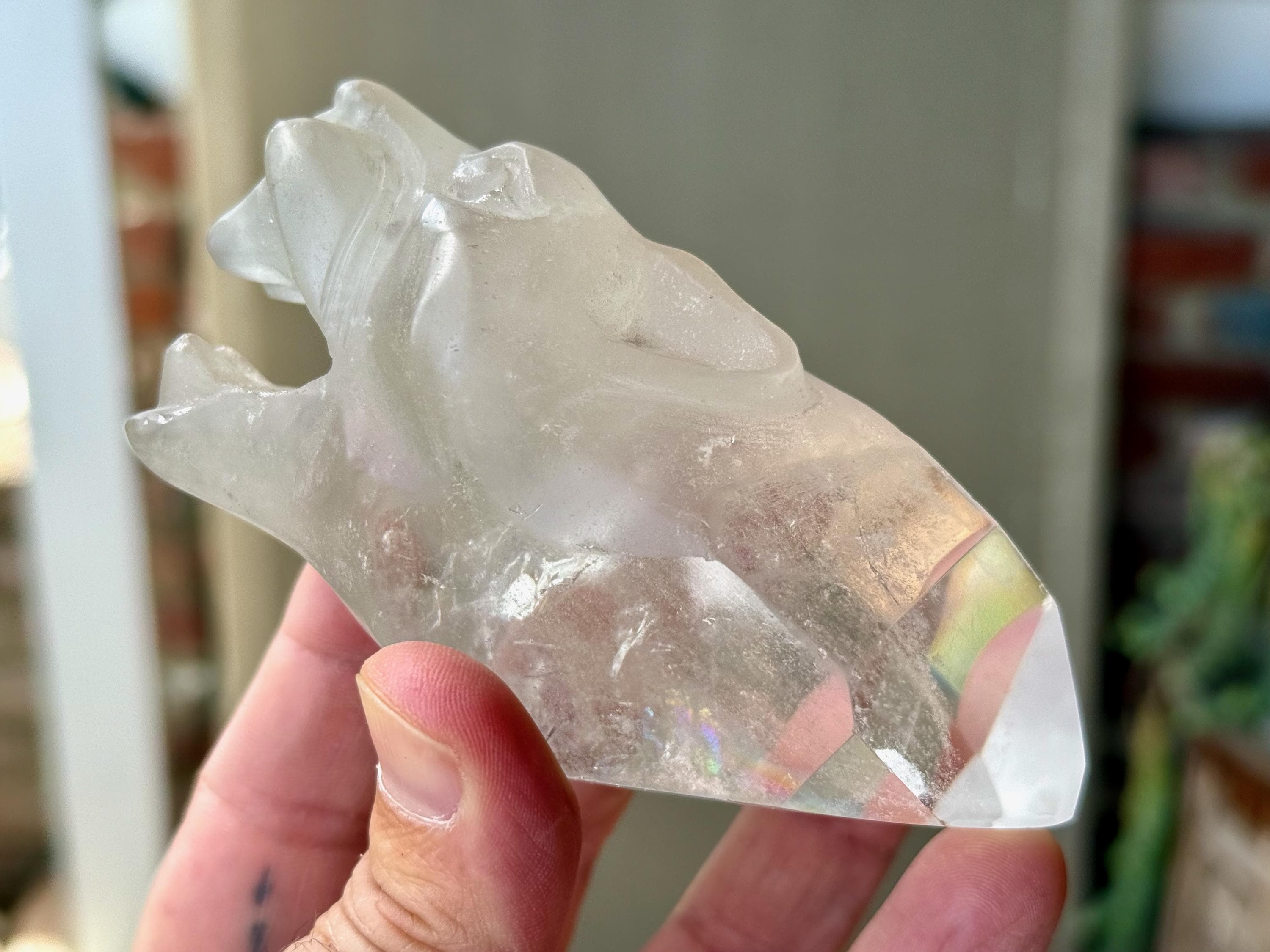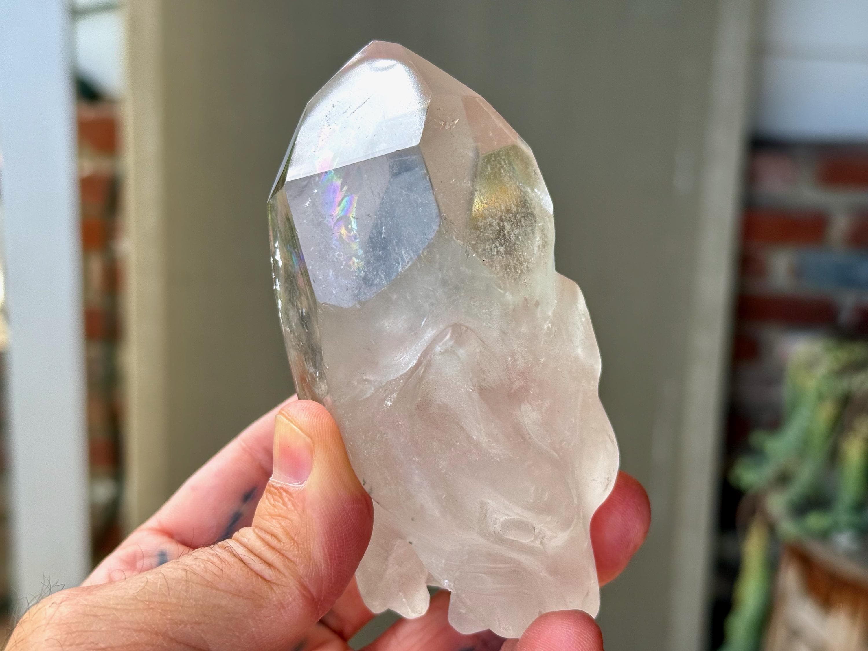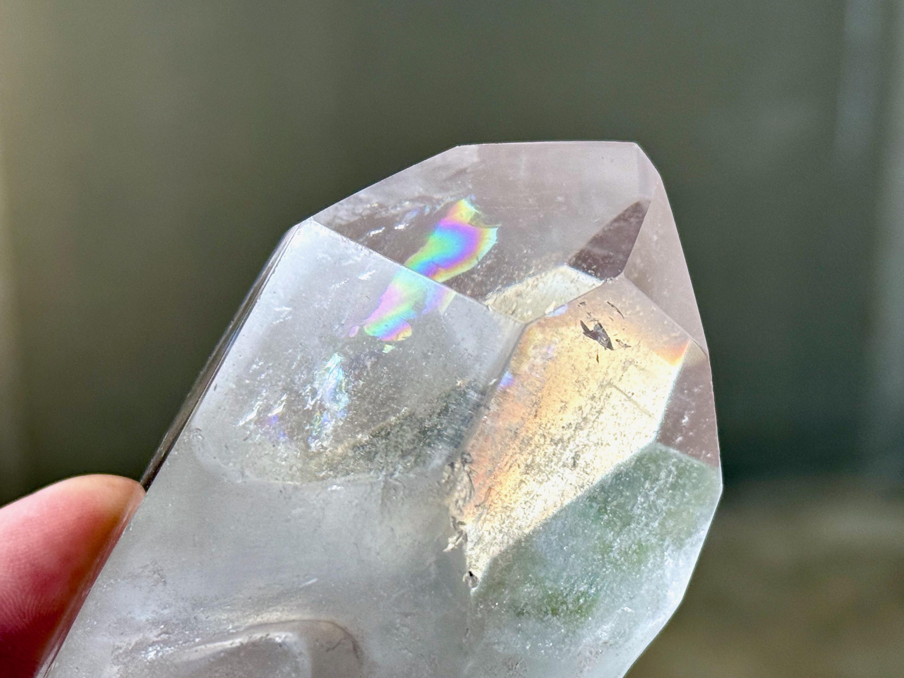 The Quartz is water-clear and the carving is incredibly articulated. The main facet area and sides are polished, and the termination is beautiful. And there's a very vibrant rainbow inclusion in the main facet as well! (Photo 6).