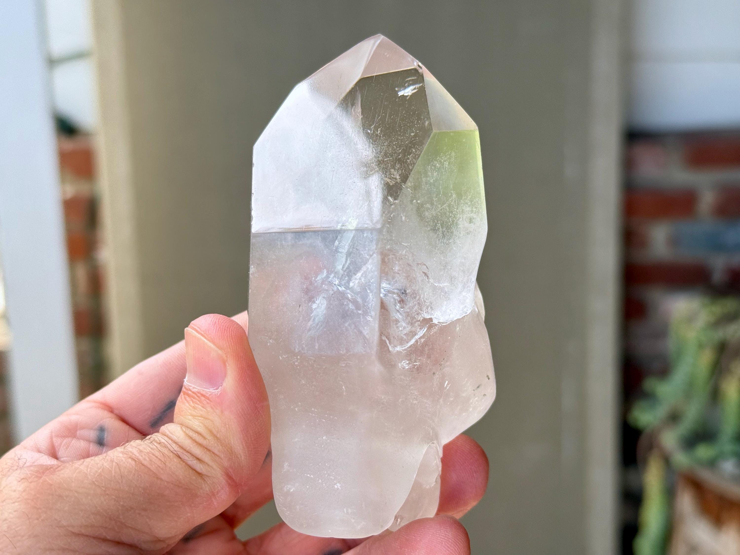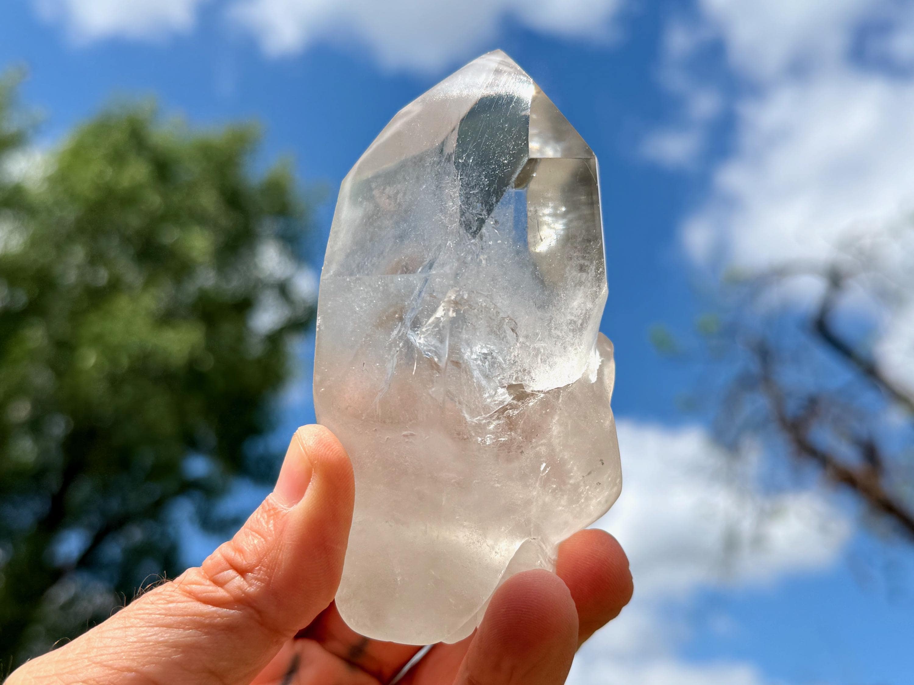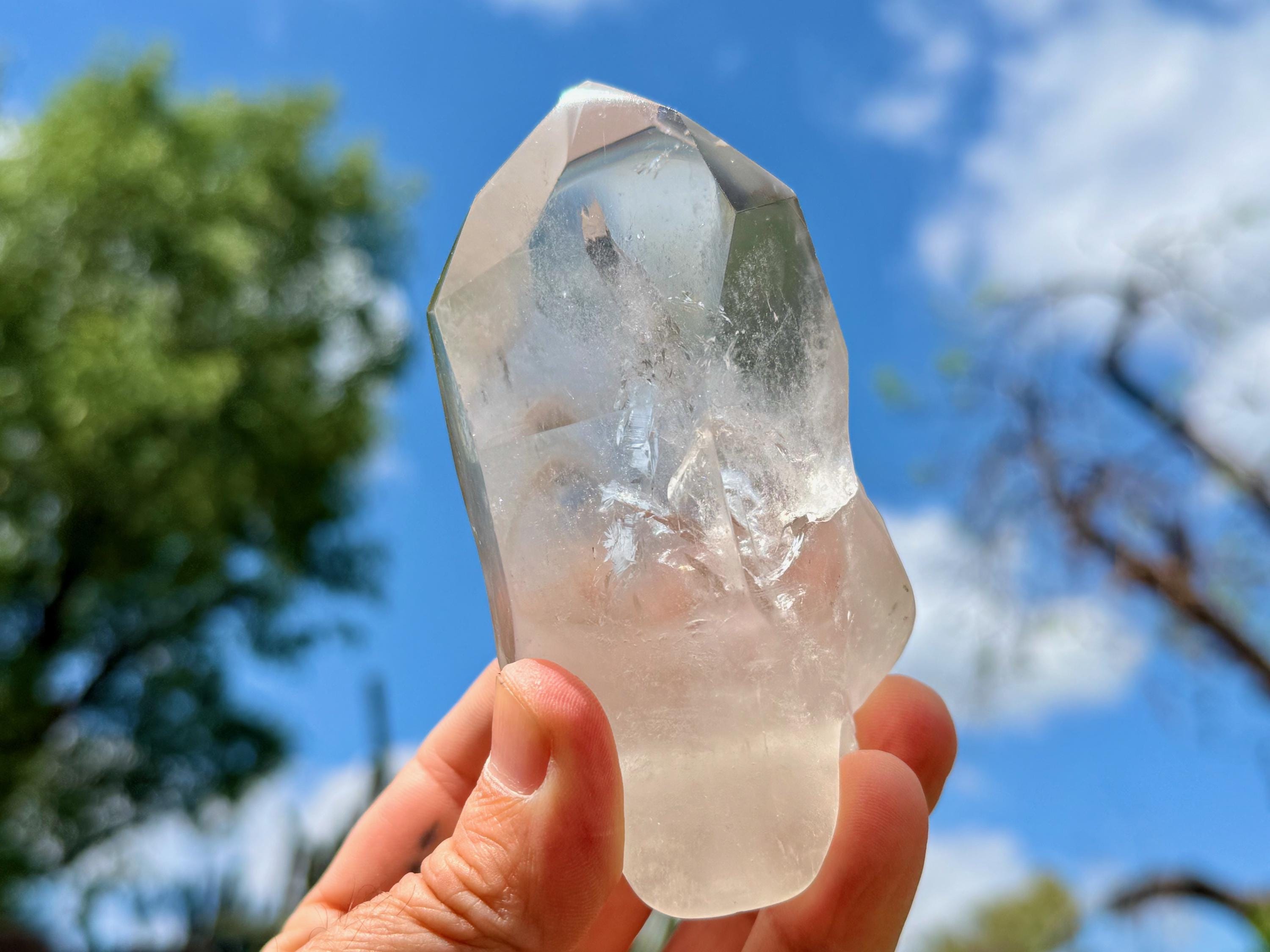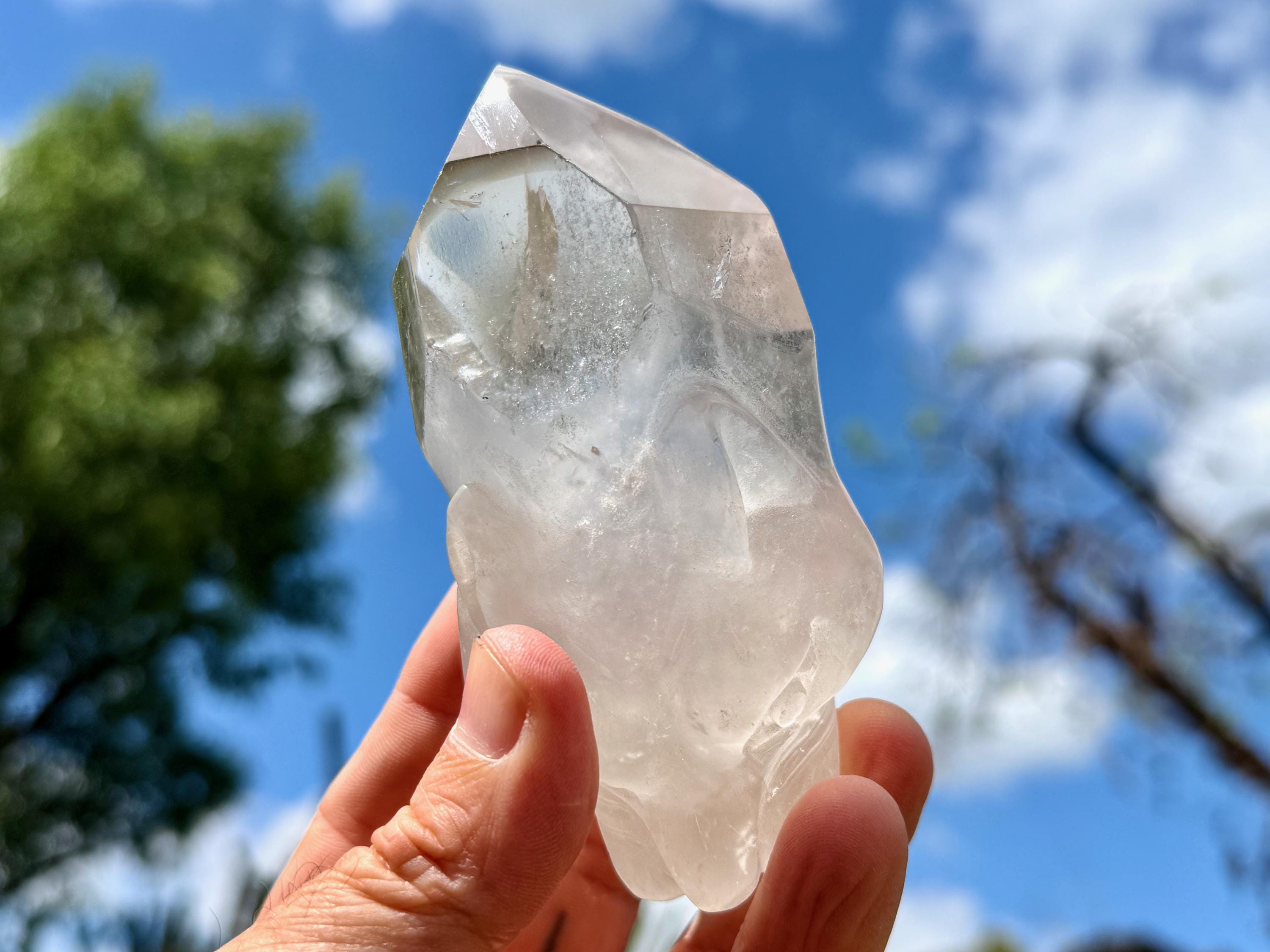 The Quartz is water-clear and the carving is incredibly articulated. The main facet area and sides are polished, and the termination is beautiful. And there's a very vibrant rainbow inclusion in the main facet as well! (Photo 6).