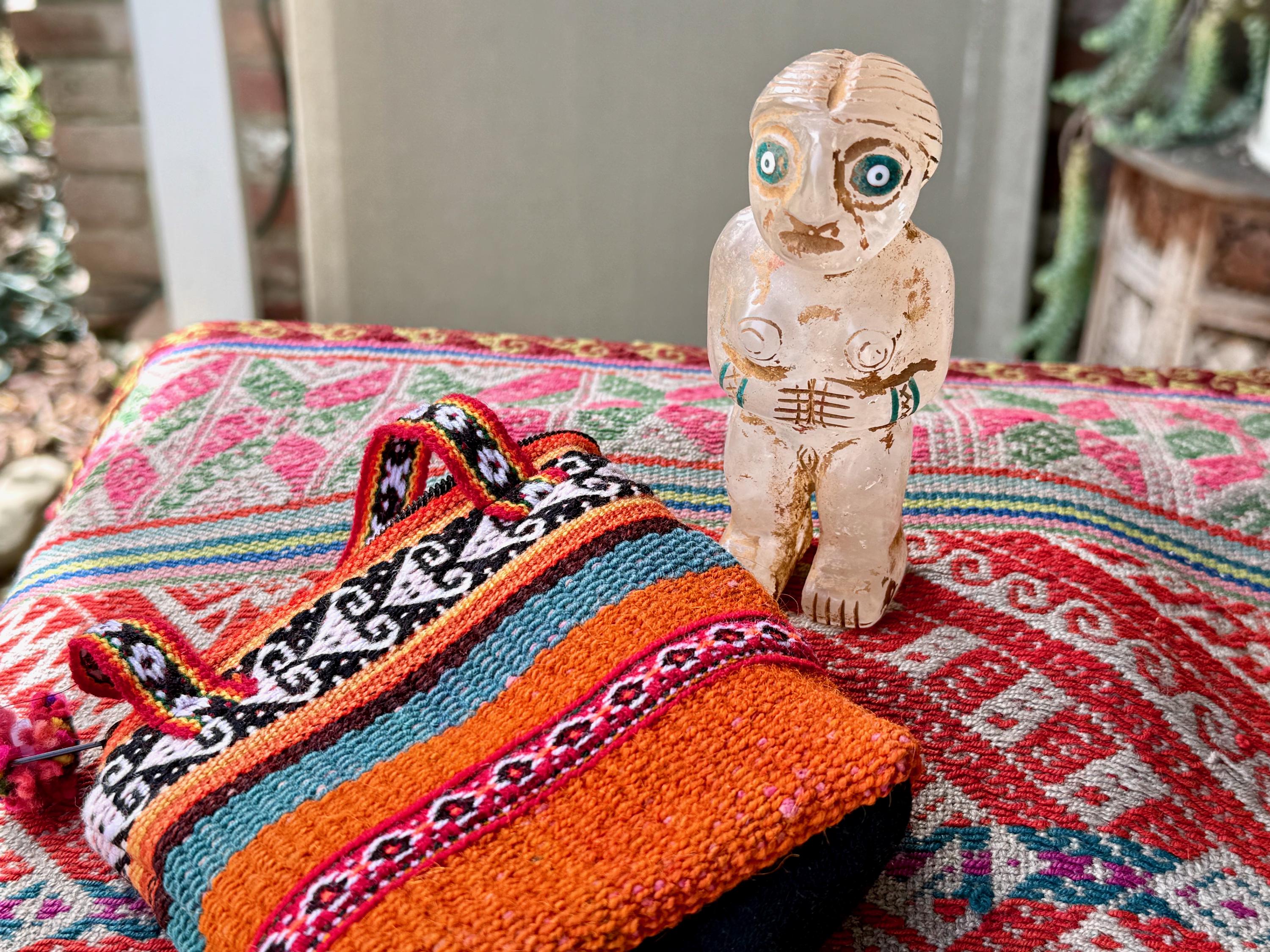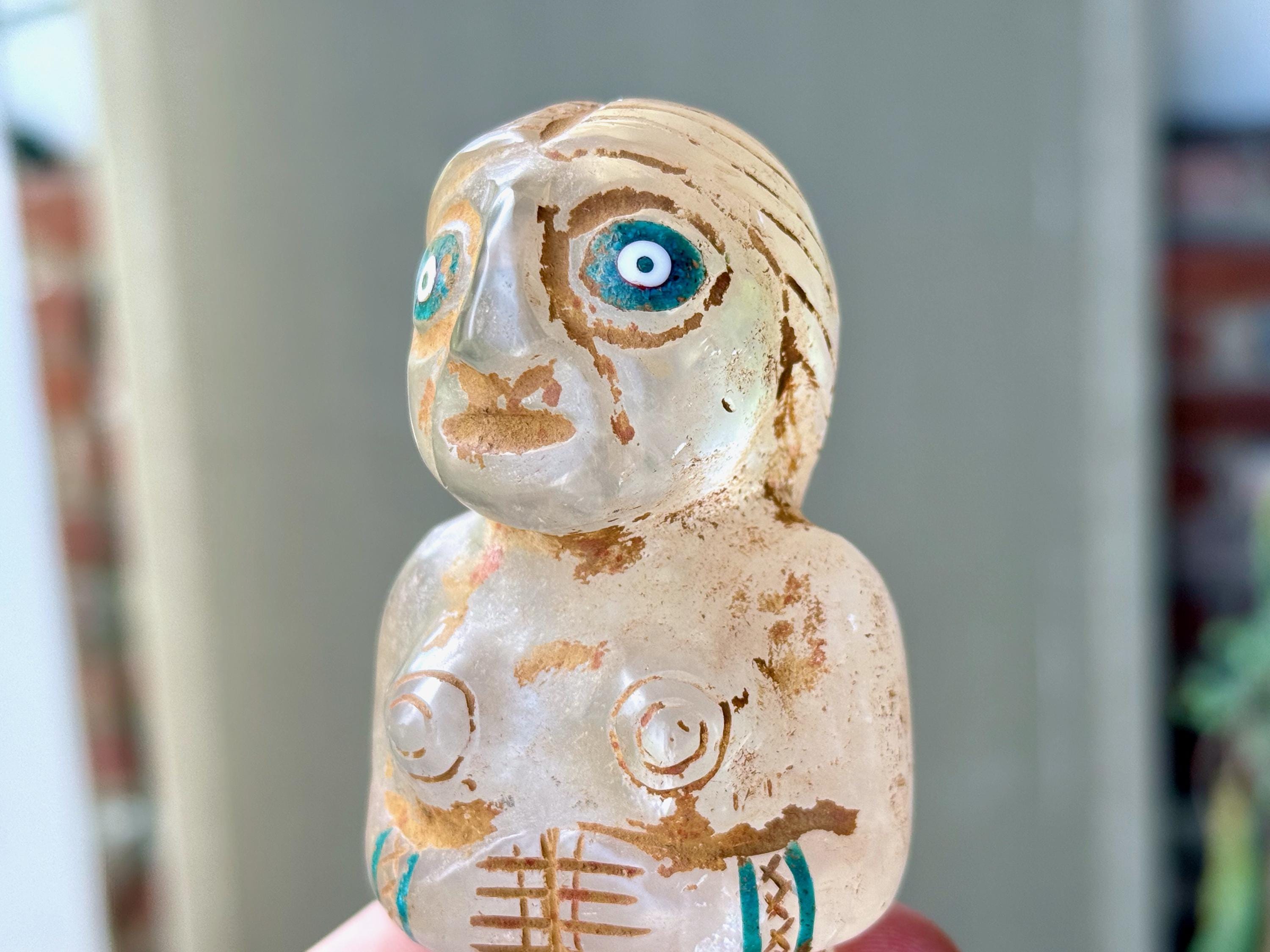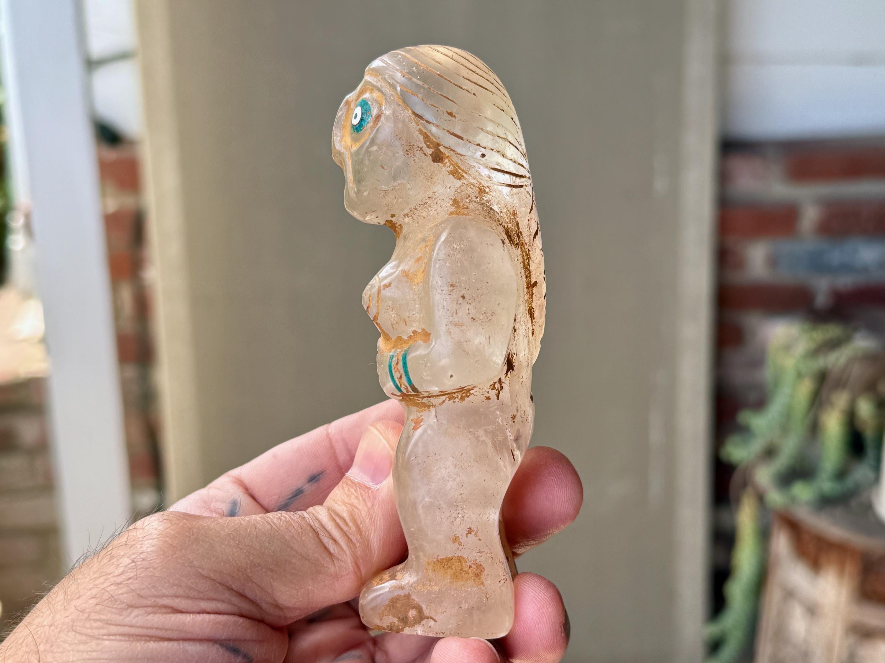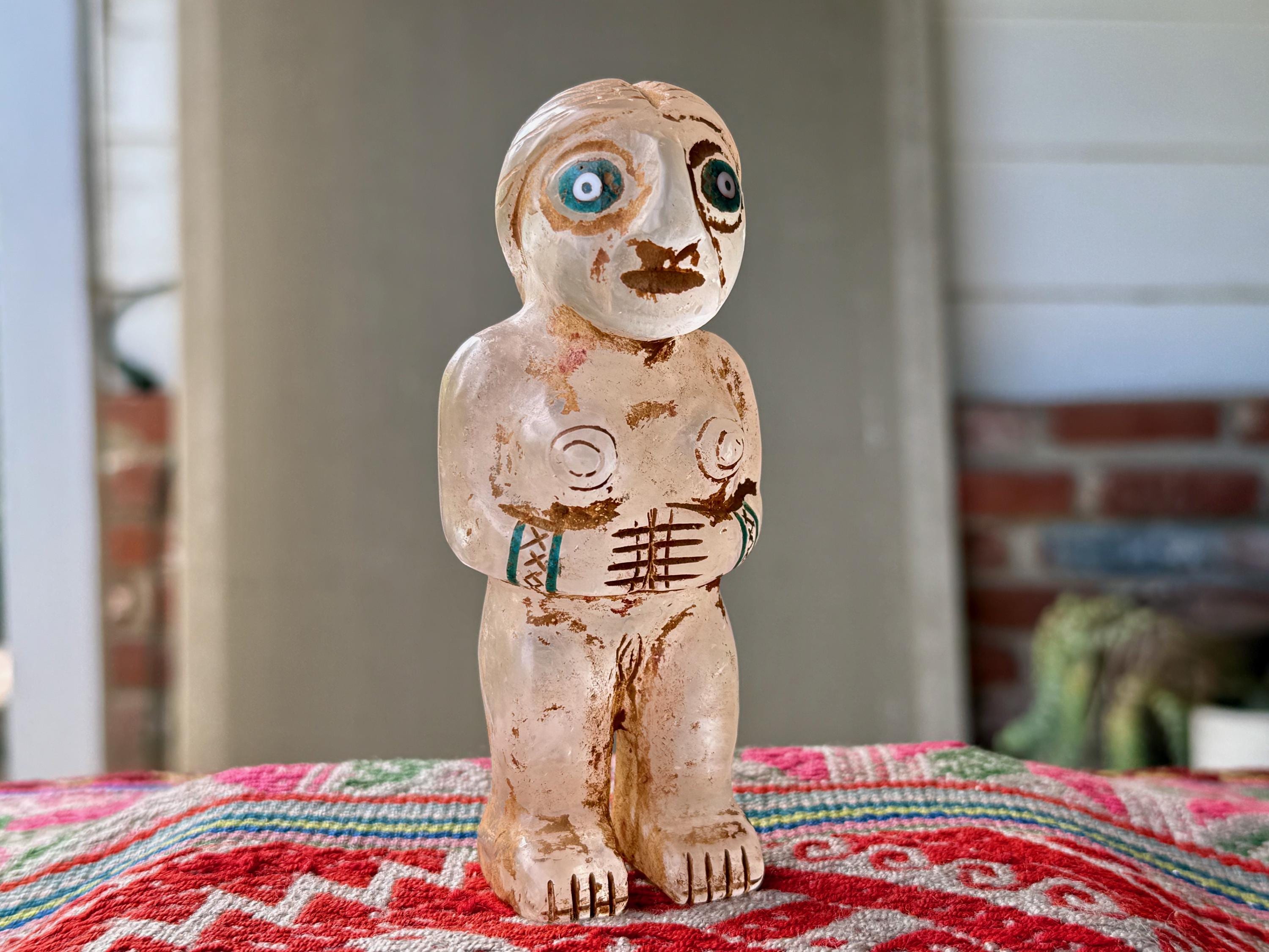She is masterfully carved from solid native Quartz, found in the area around Peru's Sacred Valley, and weathered to perfection to give an ancient patina. The artist uses Chrysocolla for her bracelets and eyes.