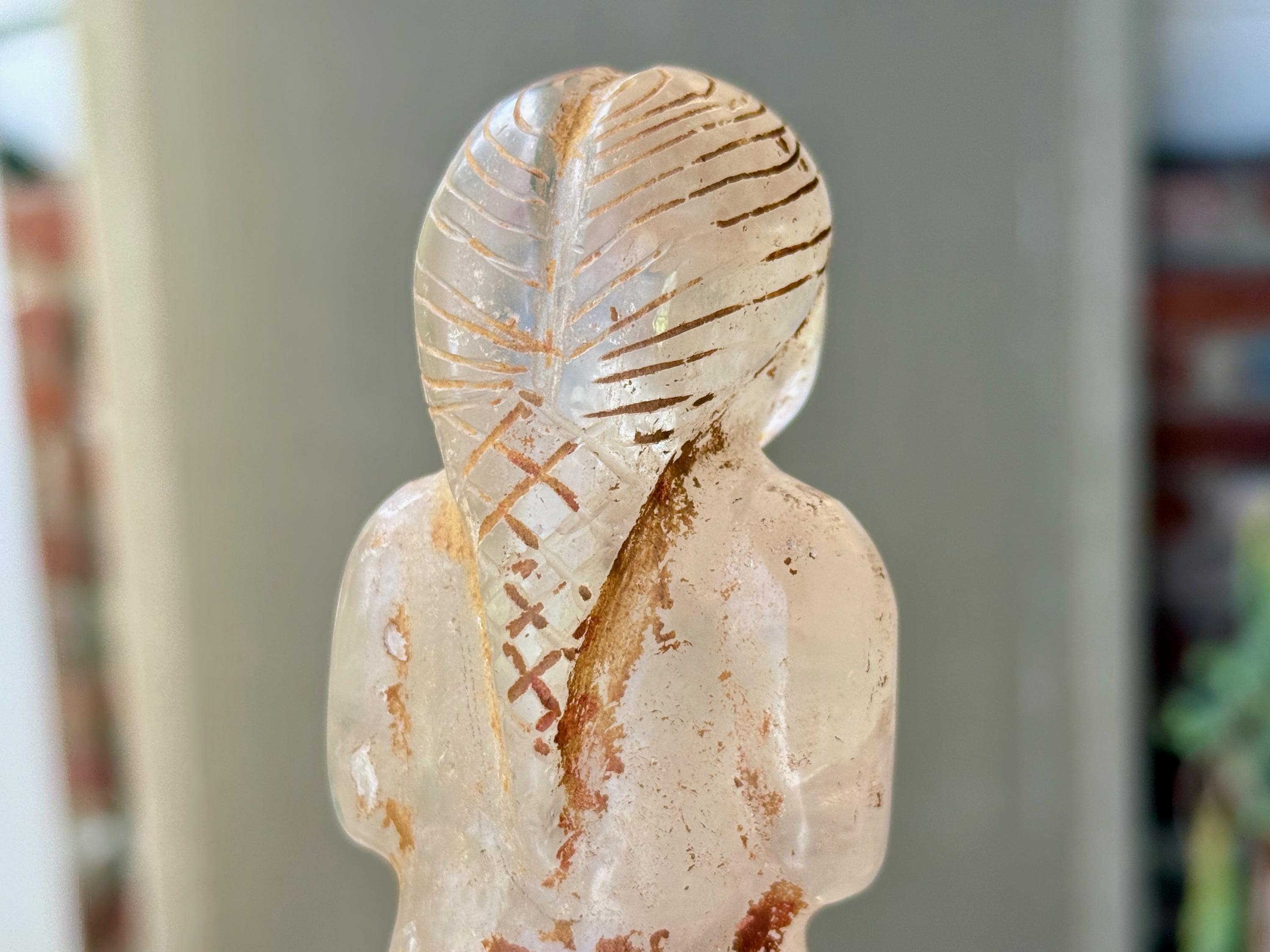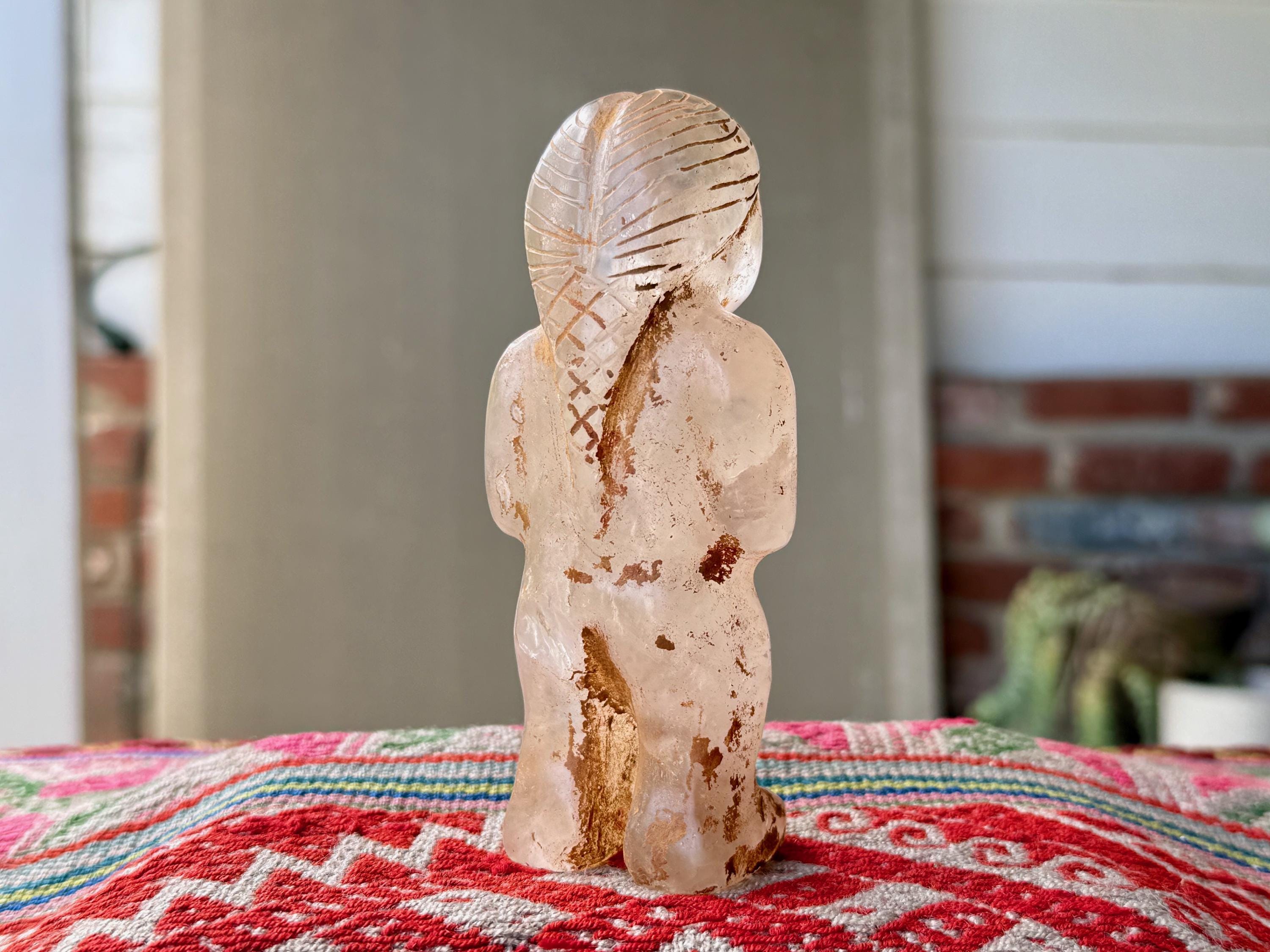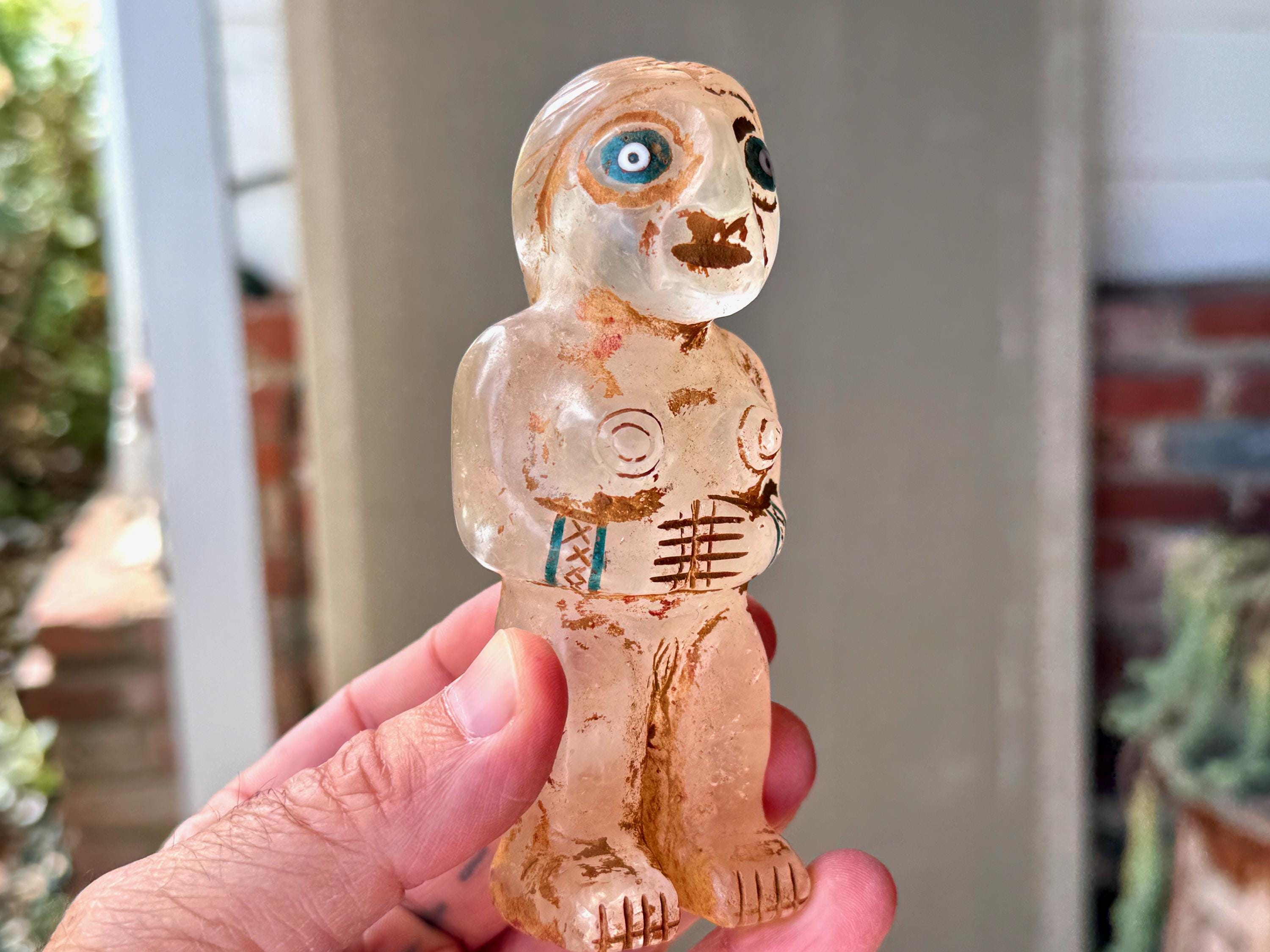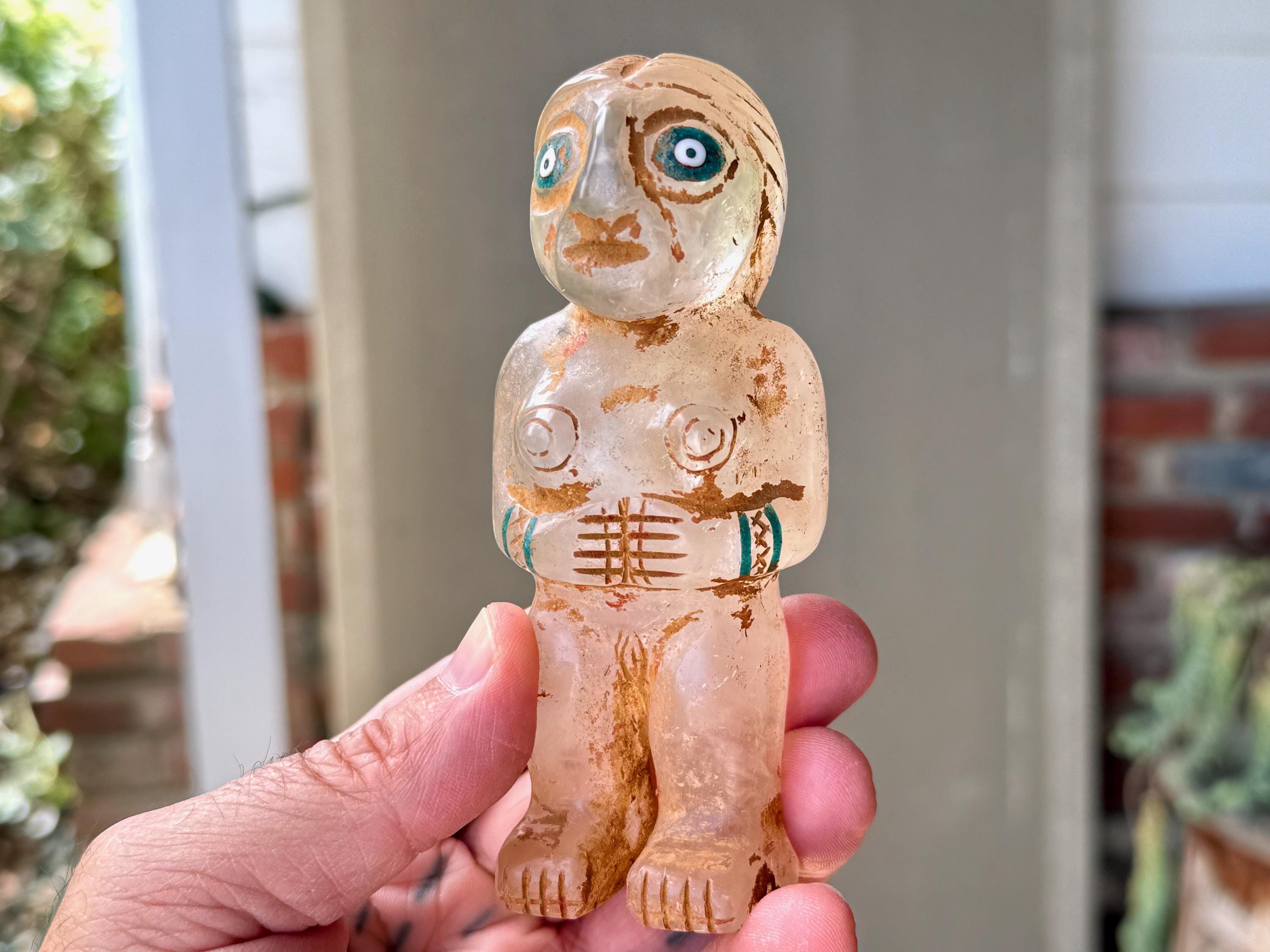She is masterfully carved from solid native Quartz, found in the area around Peru's Sacred Valley, and weathered to perfection to give an ancient patina. The artist uses Chrysocolla for her bracelets and eyes.