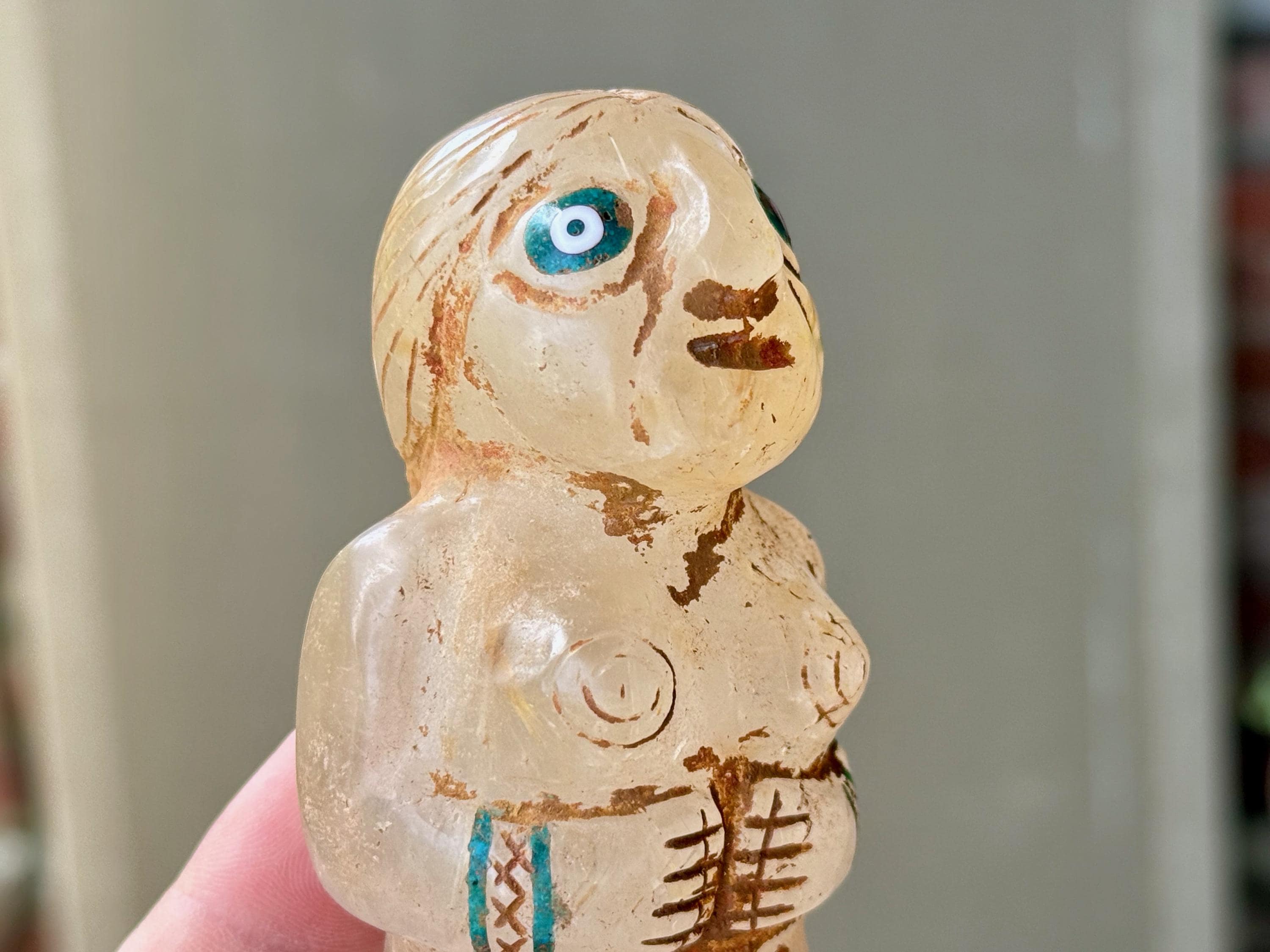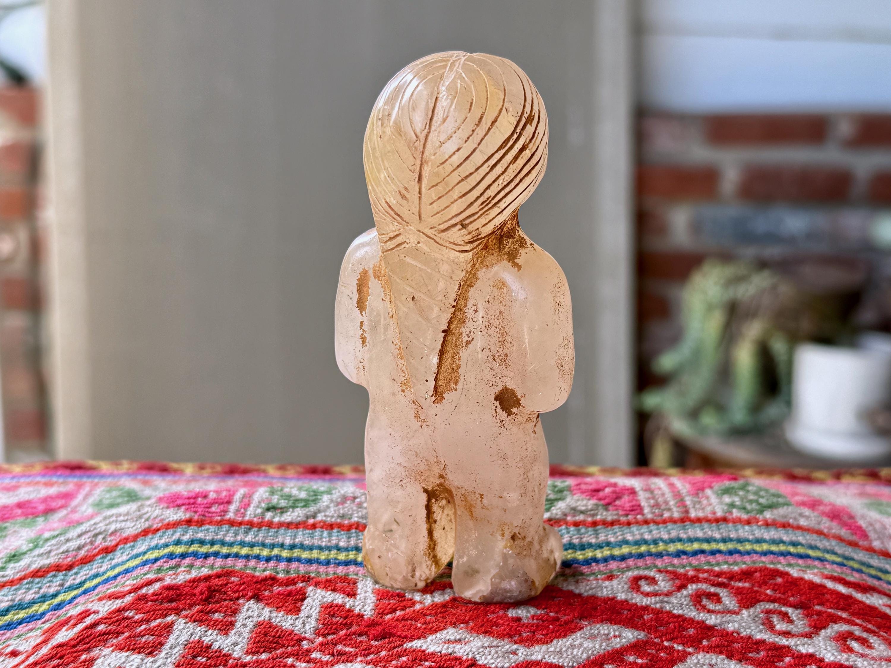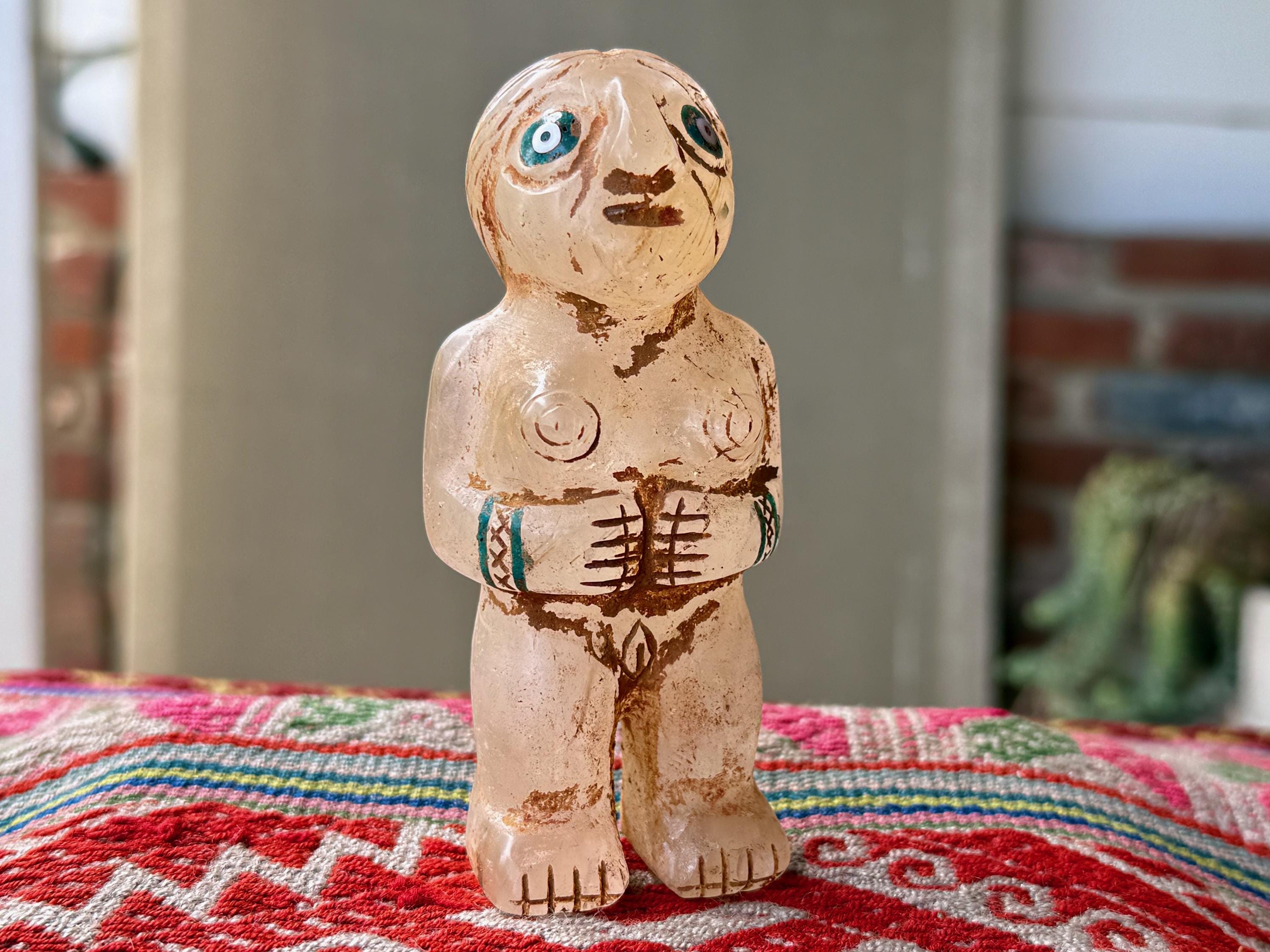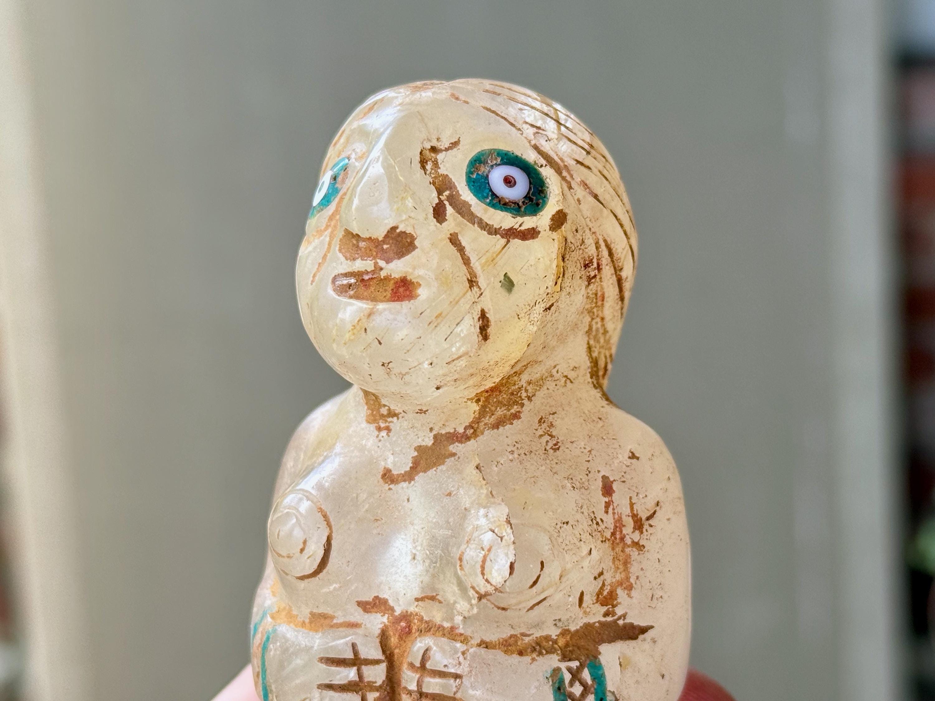 She is masterfully carved from solid native Quartz, found in the area around Peru's Sacred Valley, and weathered to perfection to give an ancient patina. The artist uses Chrysocolla for her bracelets and eyes.