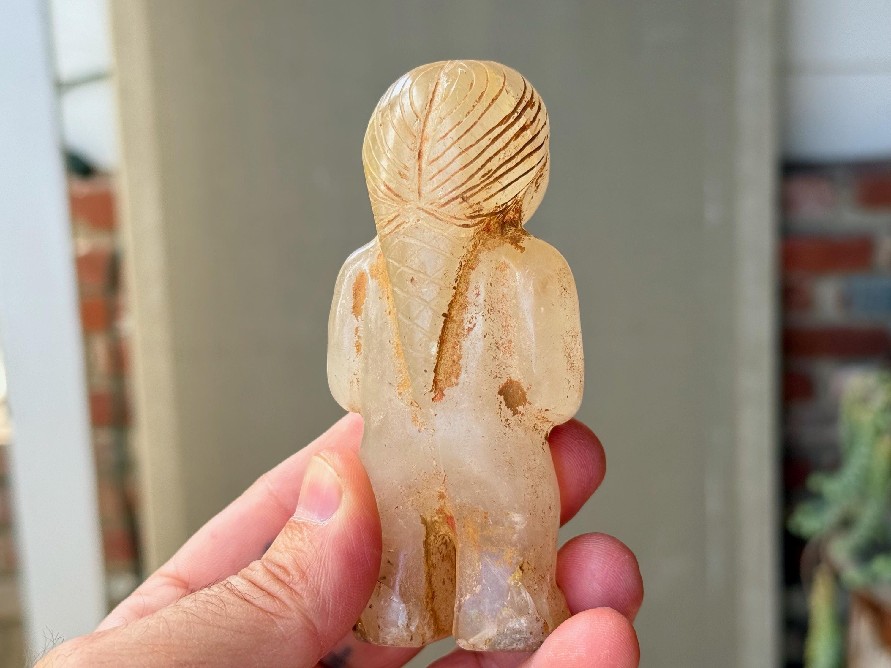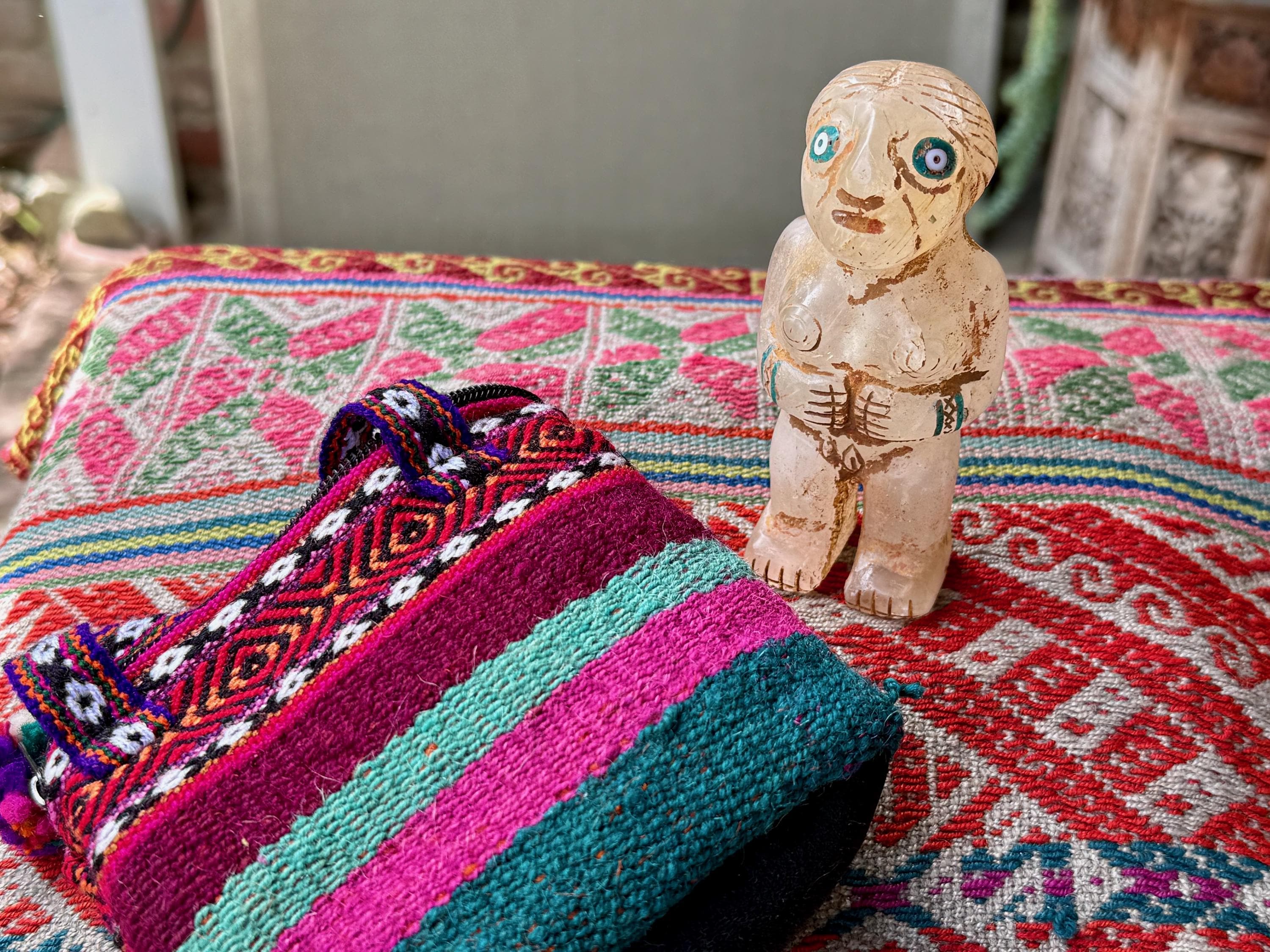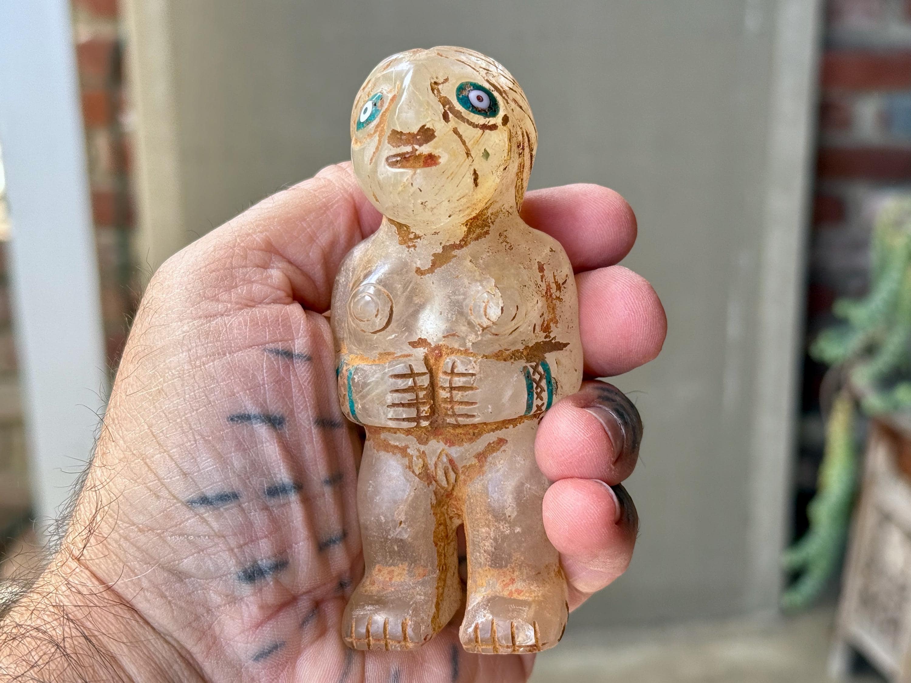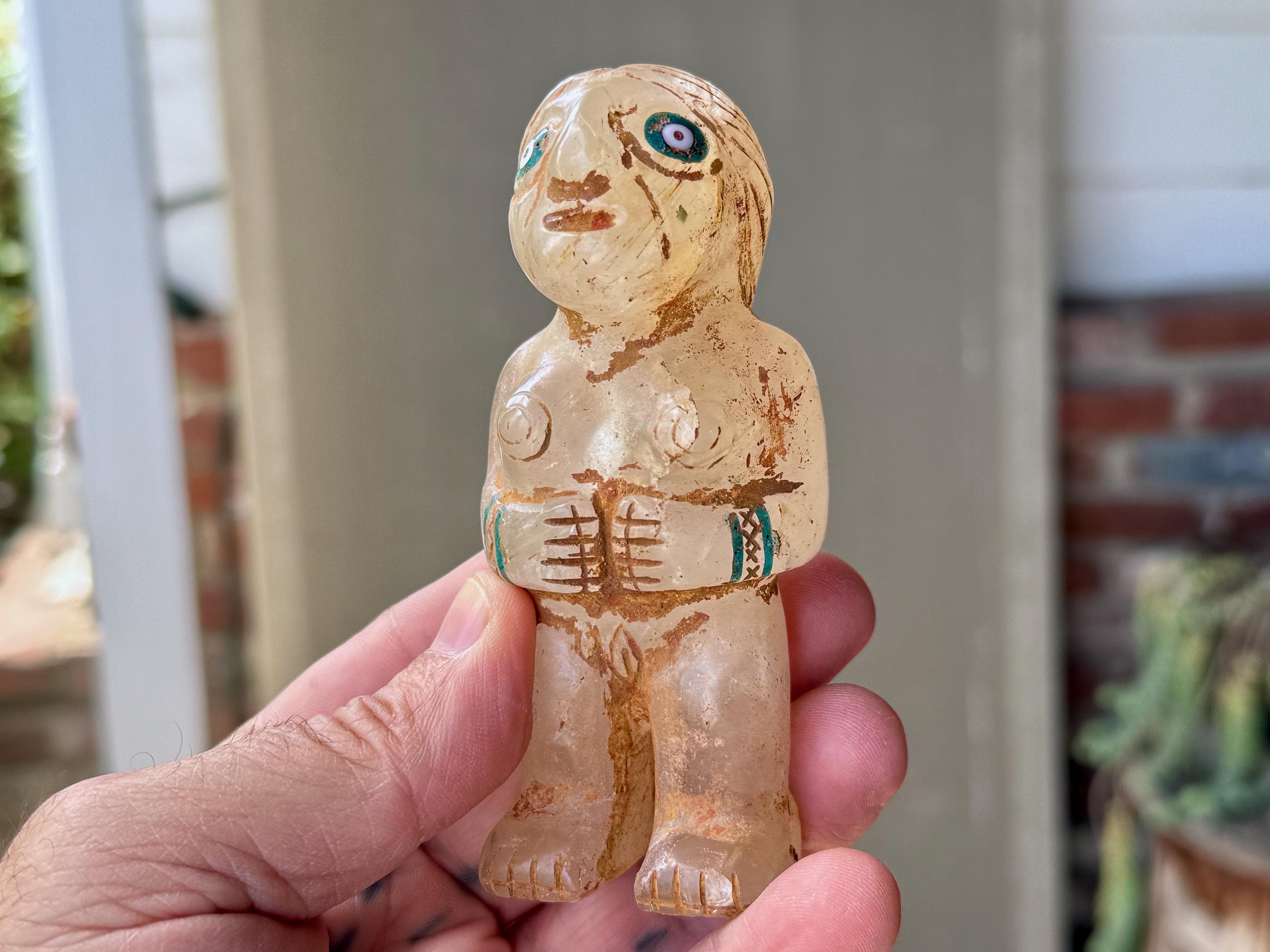 She is masterfully carved from solid native Quartz, found in the area around Peru's Sacred Valley, and weathered to perfection to give an ancient patina. The artist uses Chrysocolla for her bracelets and eyes.