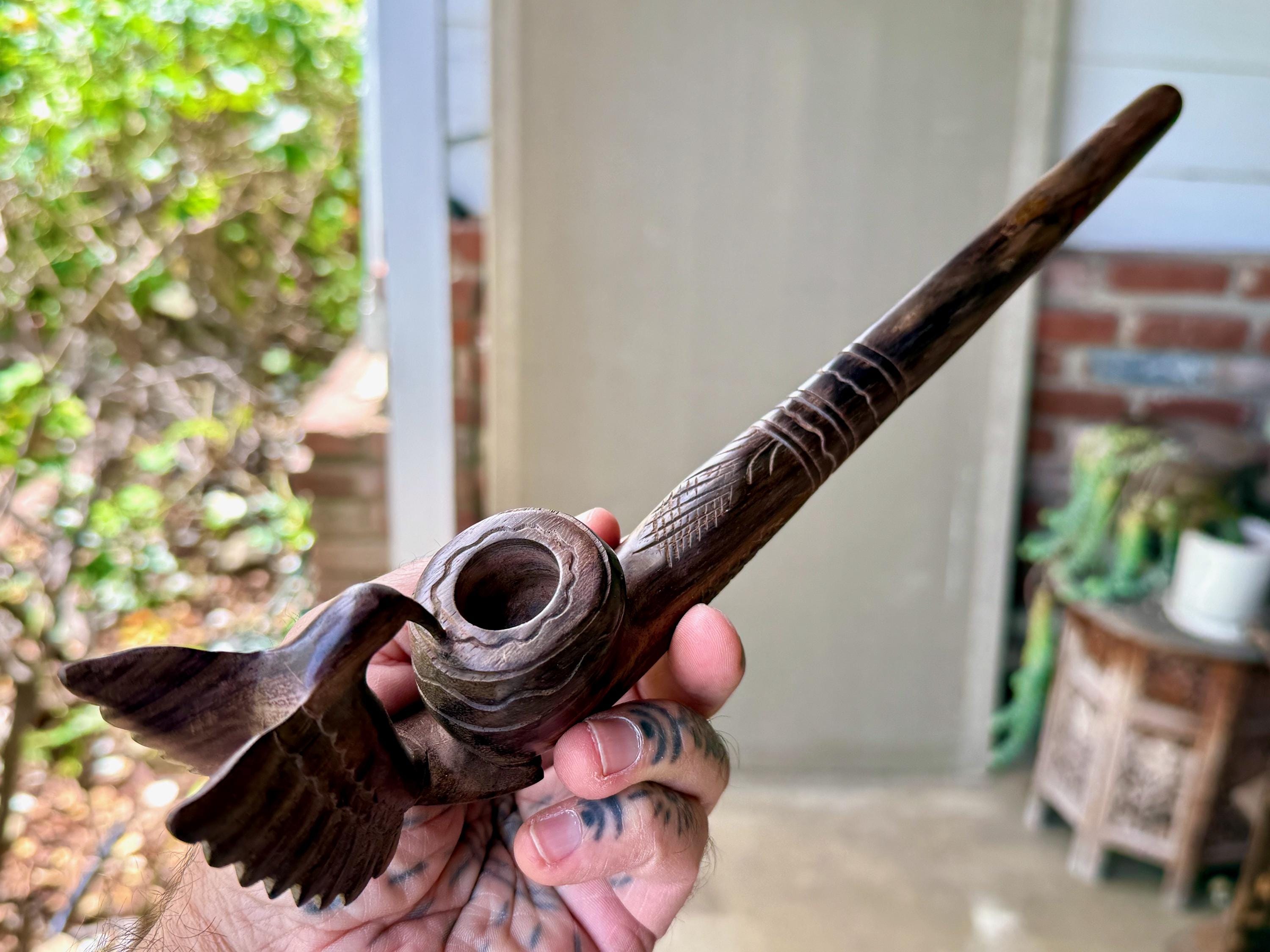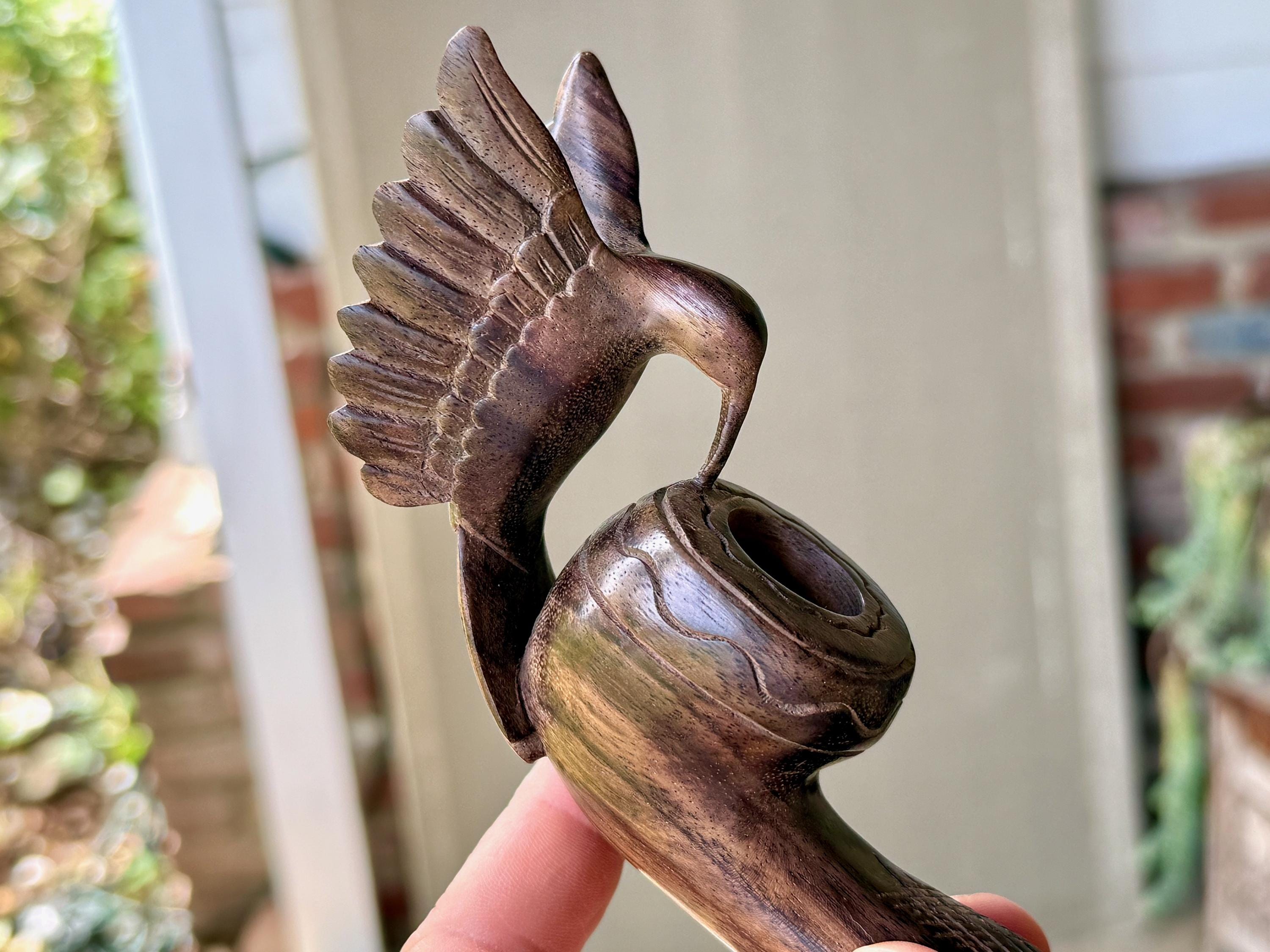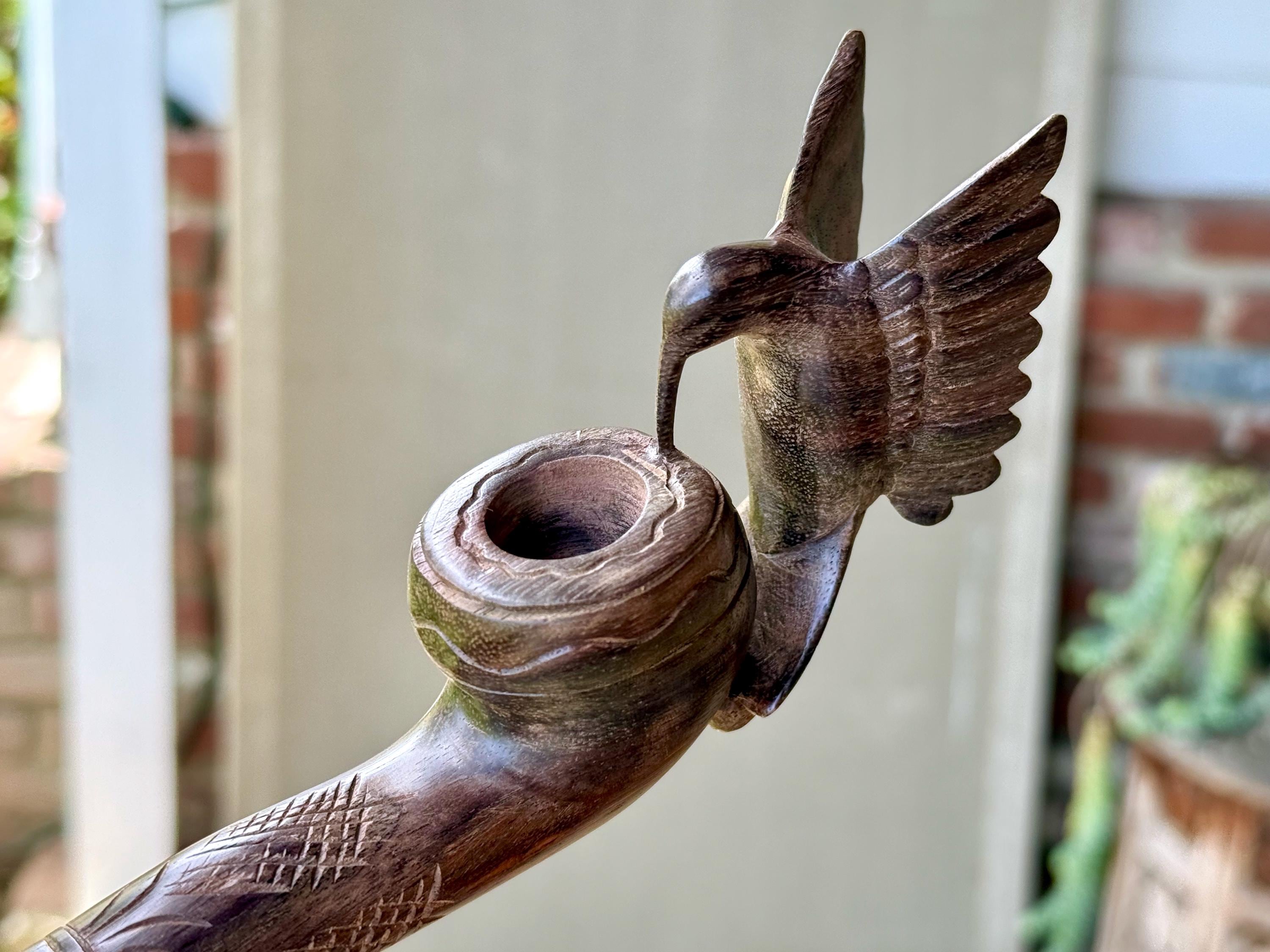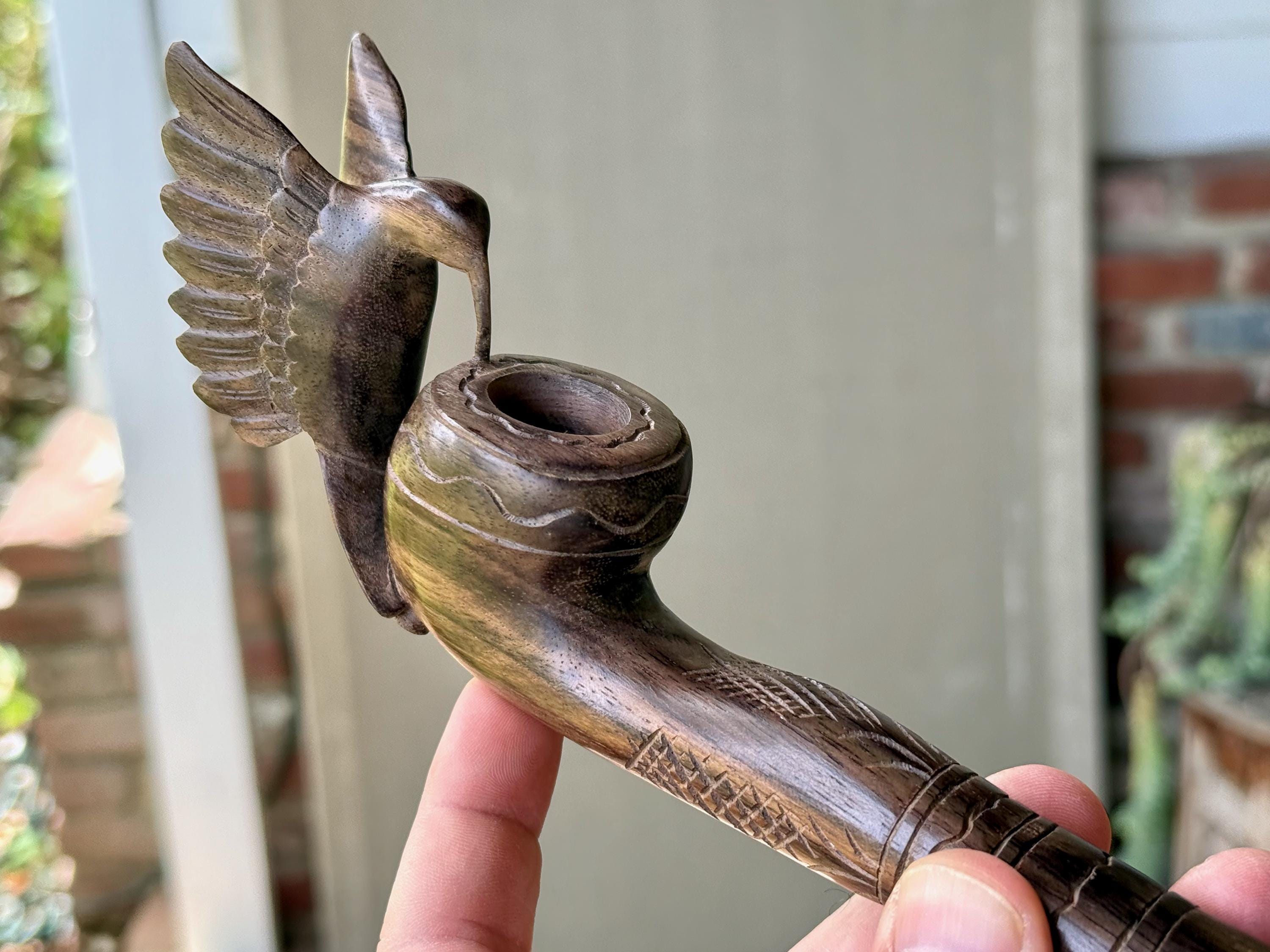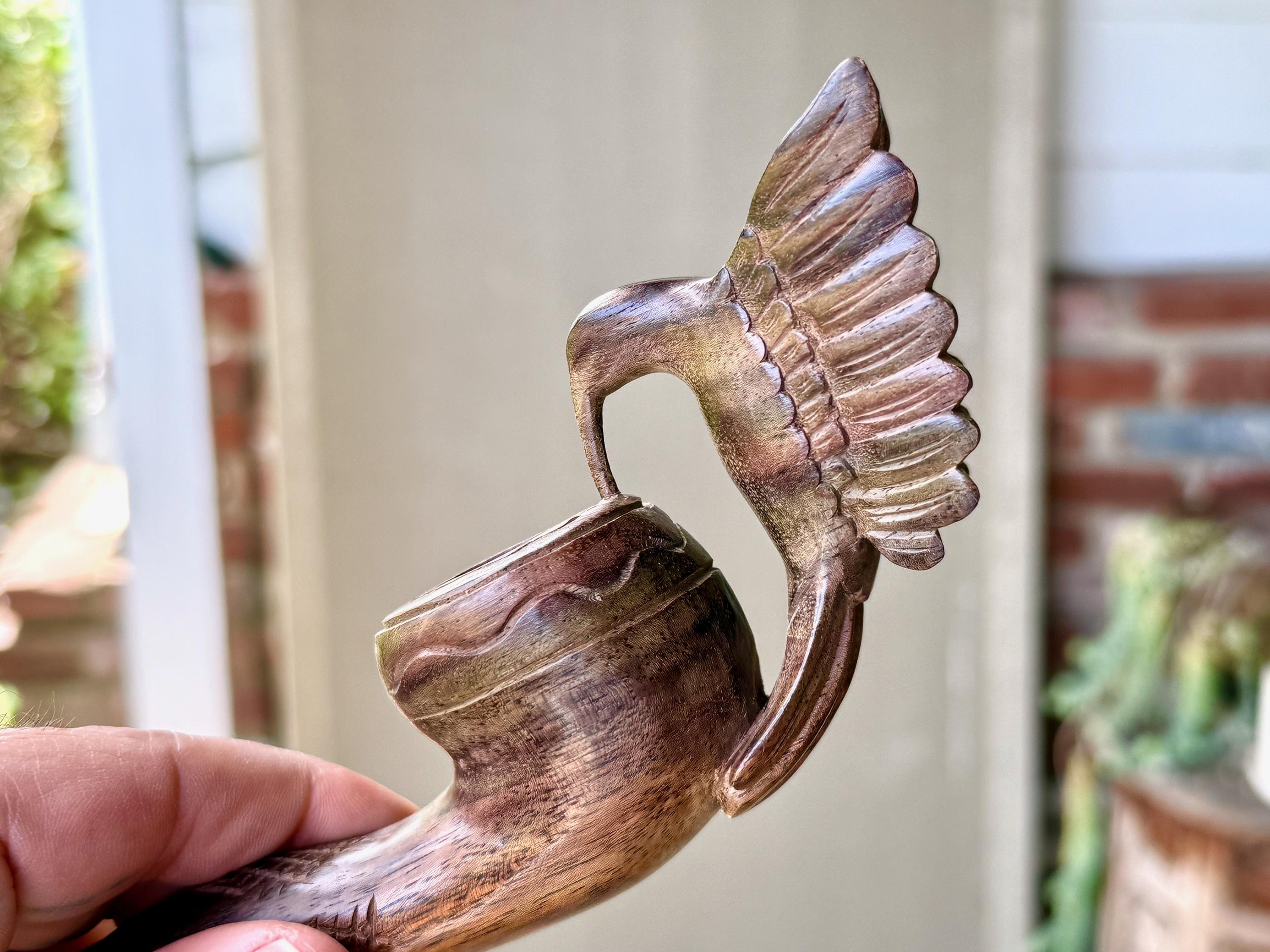 Our most beloved animal ally, the Hummingbird is depicted here with wings outstretched, perched atop this handsome tobacco pipe. We love the design and the beautiful, all natural two-tone hue of the wood. The level of craftsmanship is impressive, with such attention to detail (each feather is hand carved!). A beautiful and powerful tool for shamanic ceremony.
