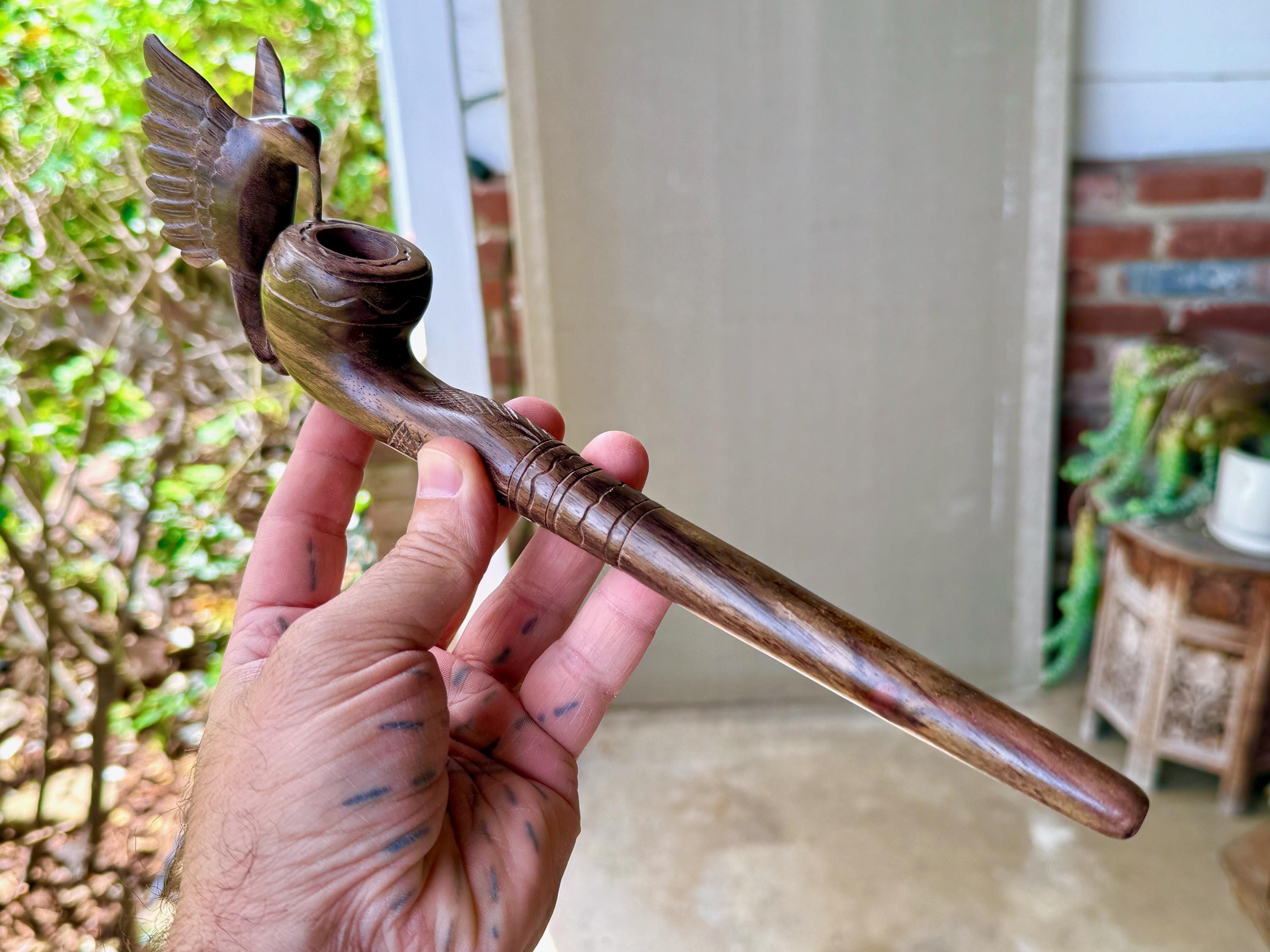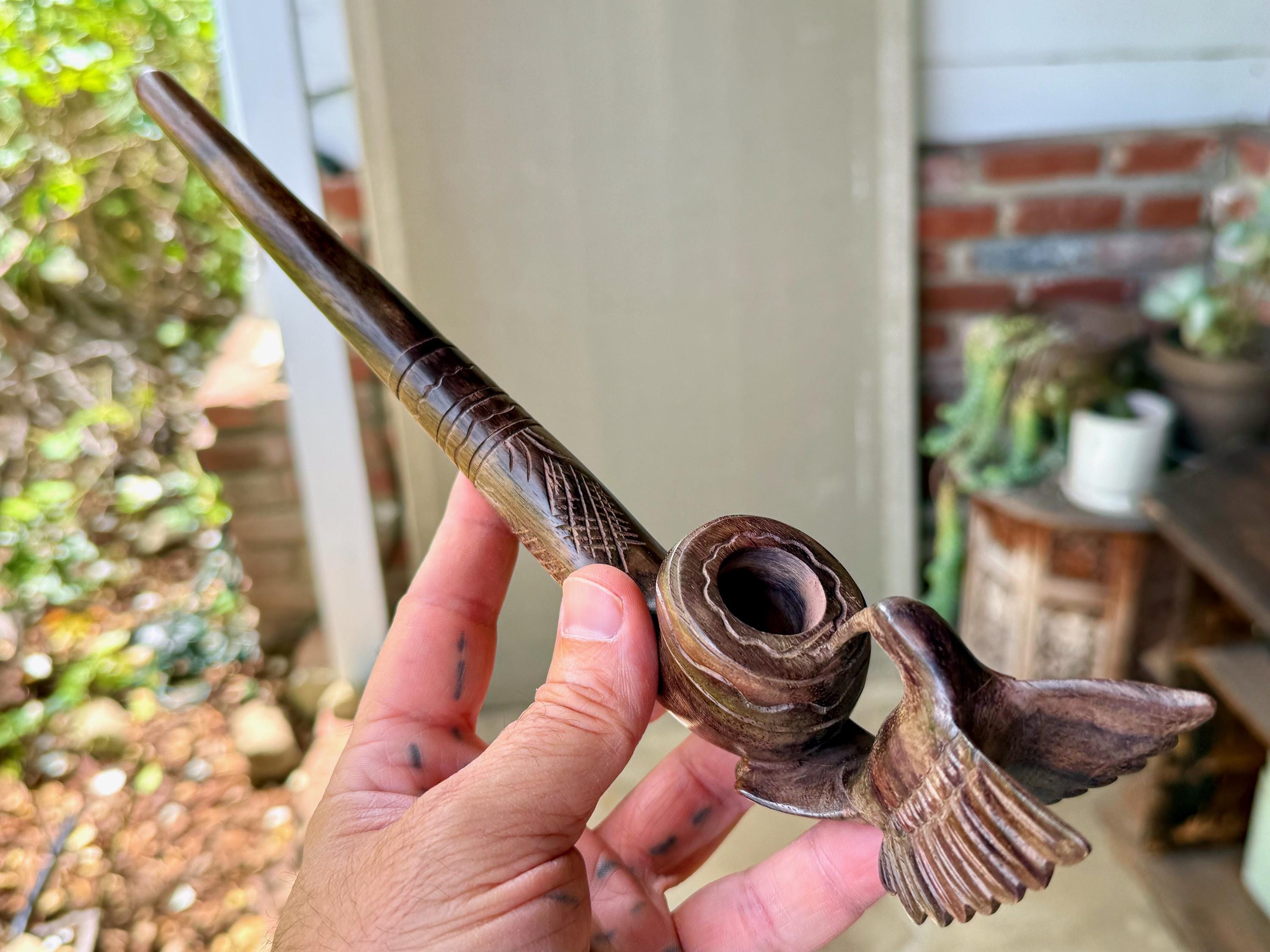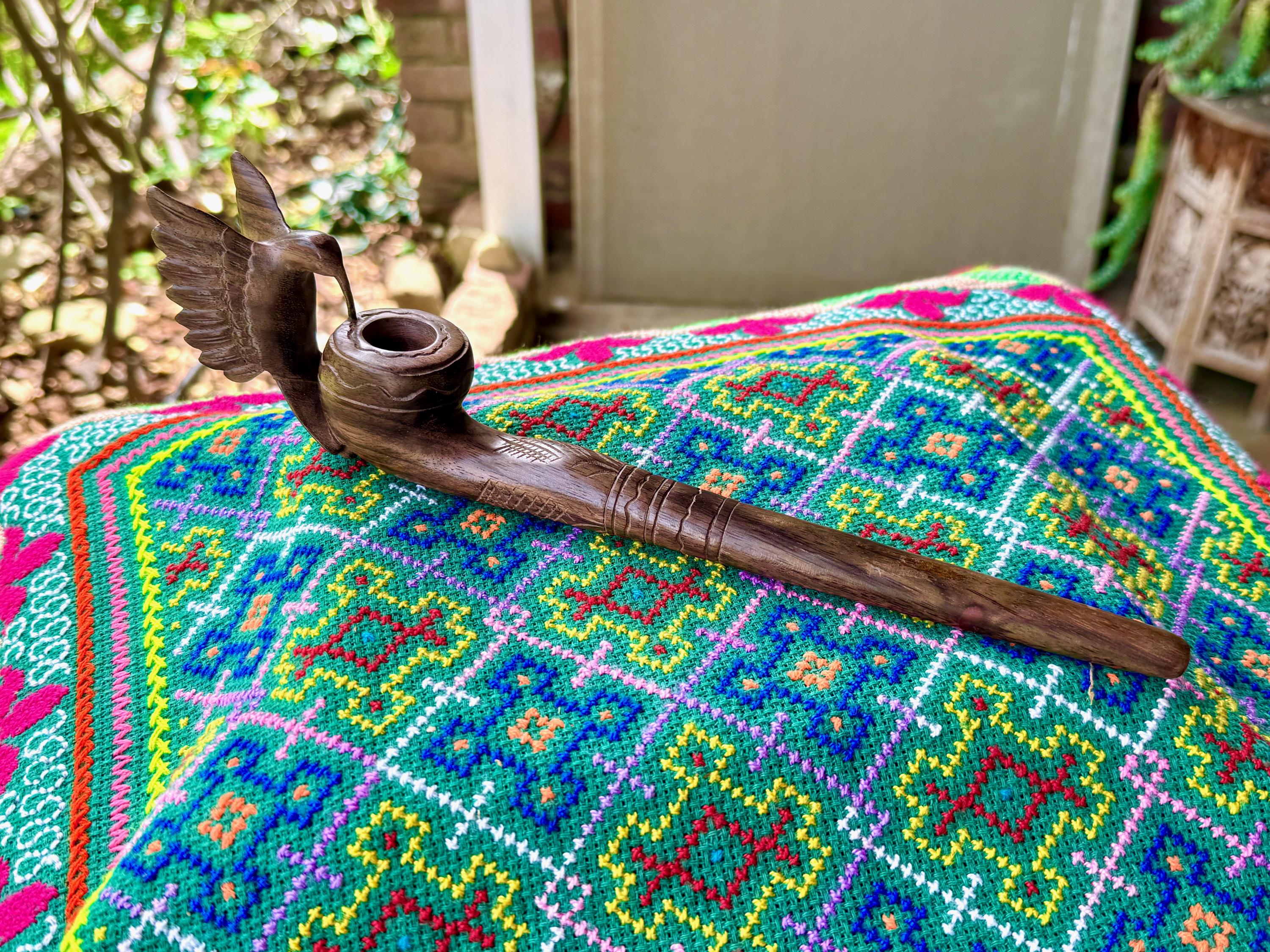 This exquisite Hummingbird Pipe for tobacco and mapacho was hand carved from natural, tropical hardwood. This pipe is intended for use in shamanic healing ceremonies or for other energy healing applications.