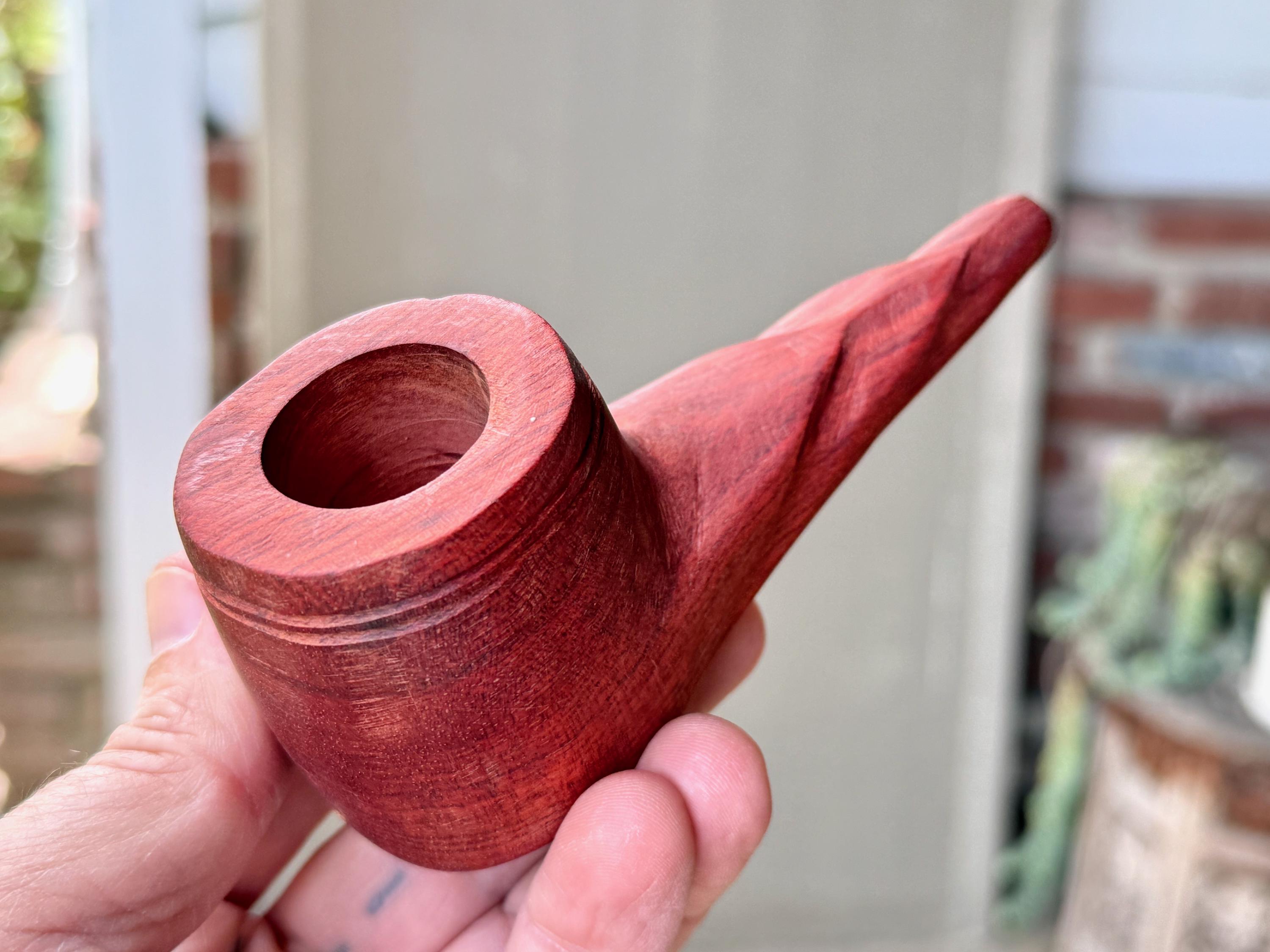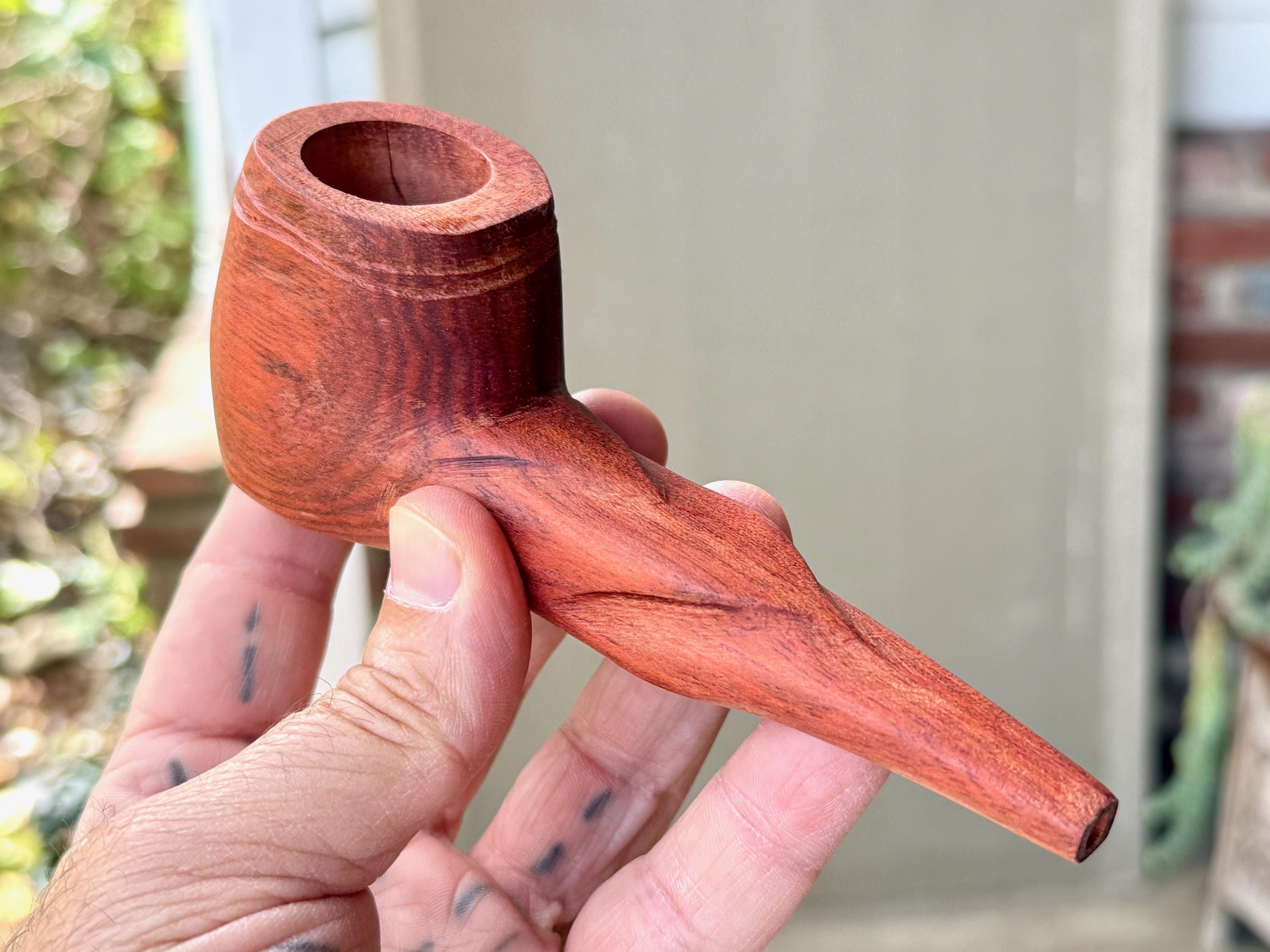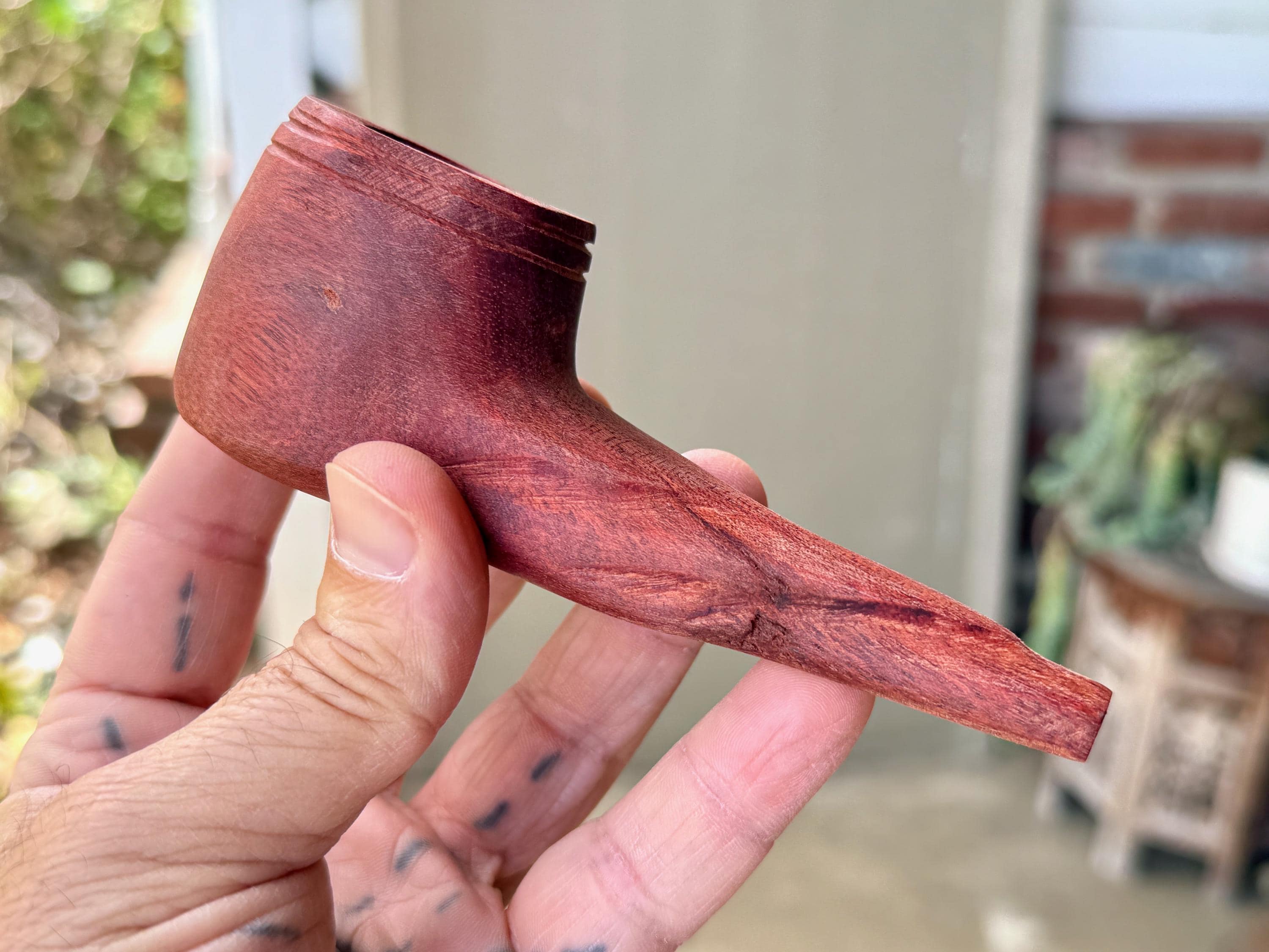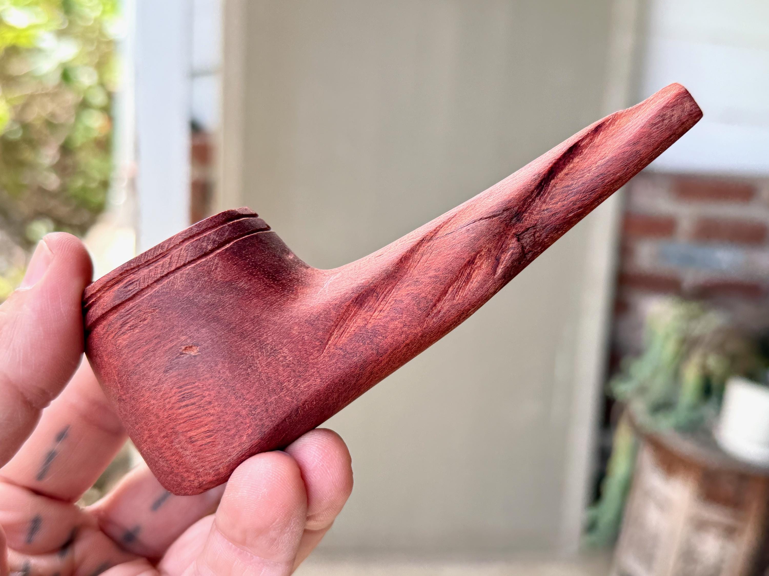 Here the artist uses Palo Sangre ("Blood Wood") for his creation, a very strong hardwood with a rich reddish-brown hue, indigenous to the Amazon and areas of Central and South America. This pipe is carved from a single piece of this wood and is weighty and well-crafted. A powerful and beautiful medicine tool for ceremony.