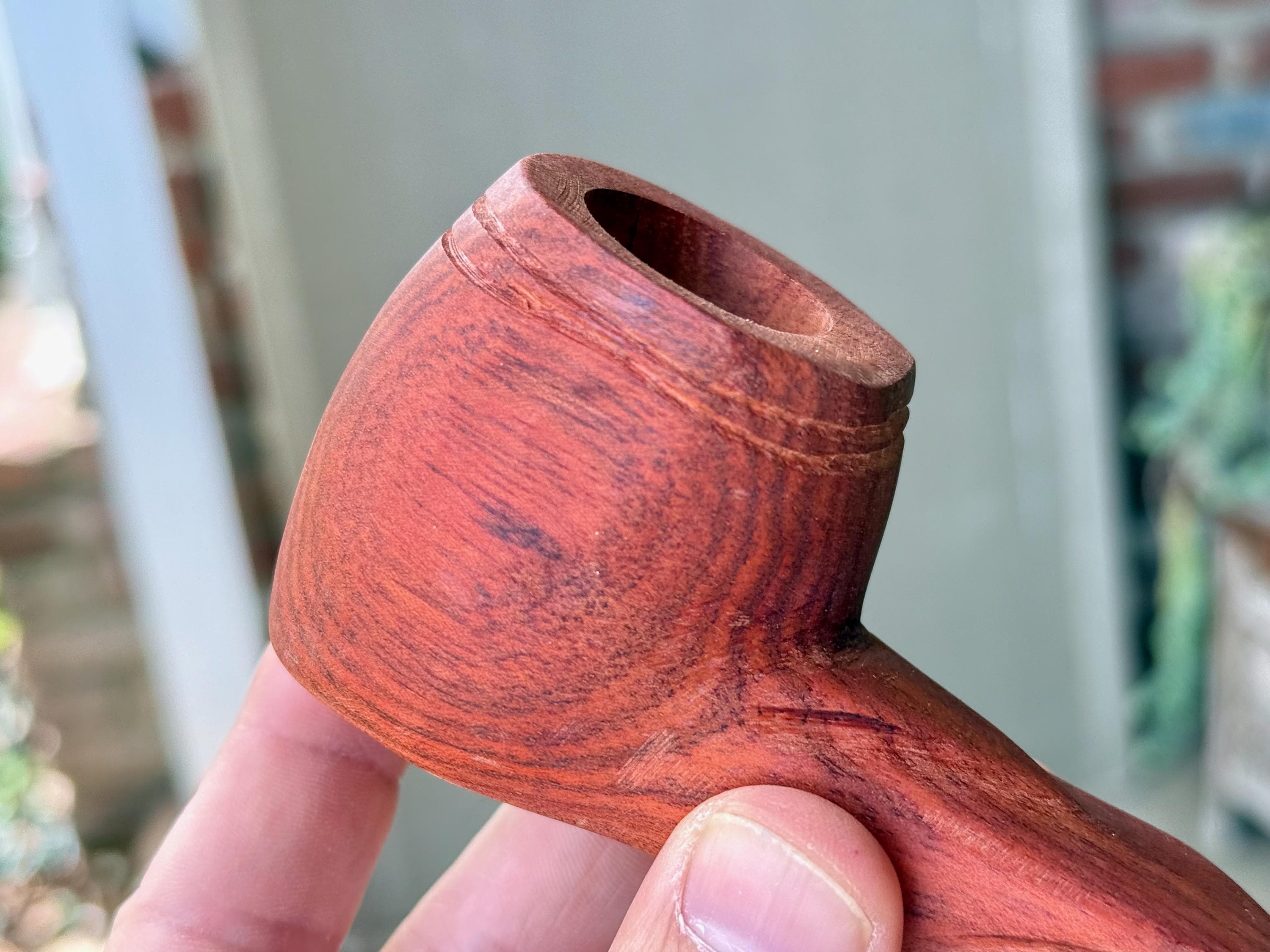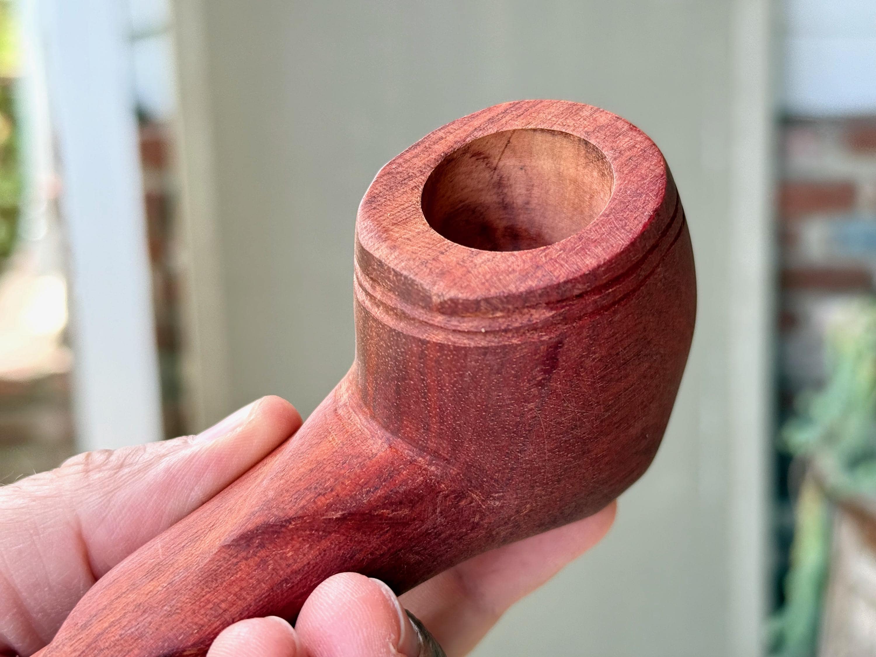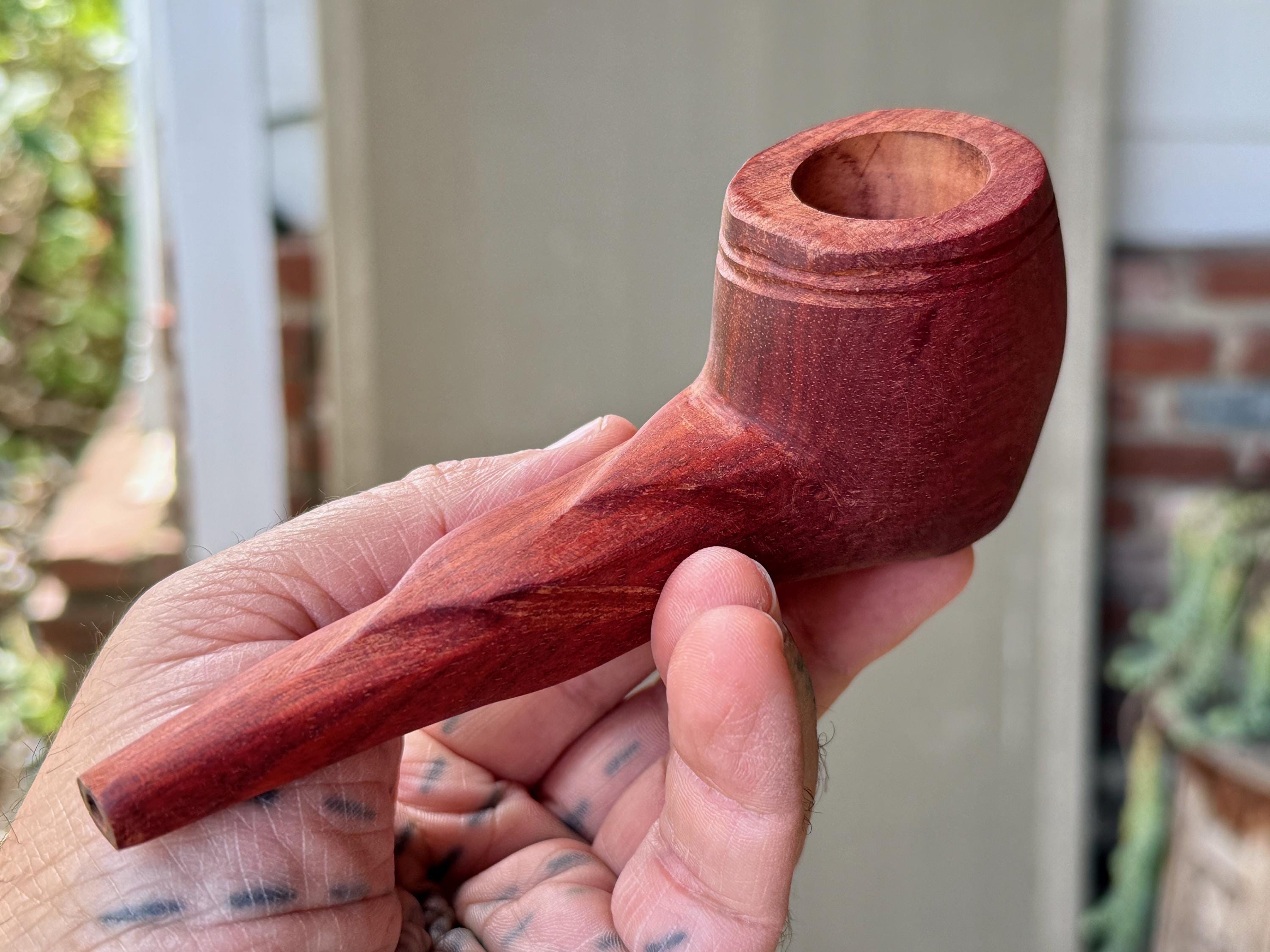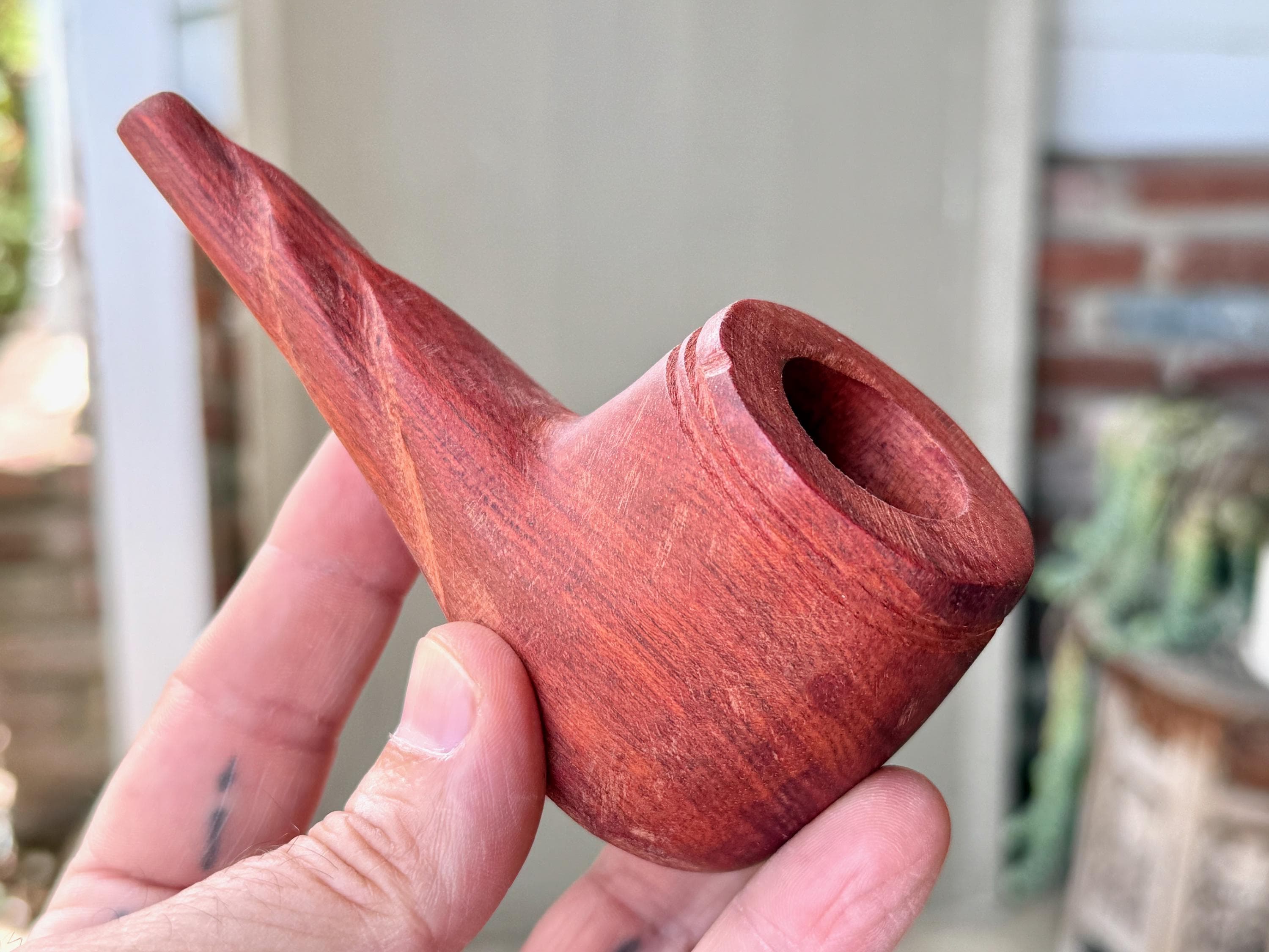Here the artist uses Palo Sangre ("Blood Wood") for his creation, a very strong hardwood with a rich reddish-brown hue, indigenous to the Amazon and areas of Central and South America. This pipe is carved from a single piece of this wood and is weighty and well-crafted. A powerful and beautiful medicine tool for ceremony.