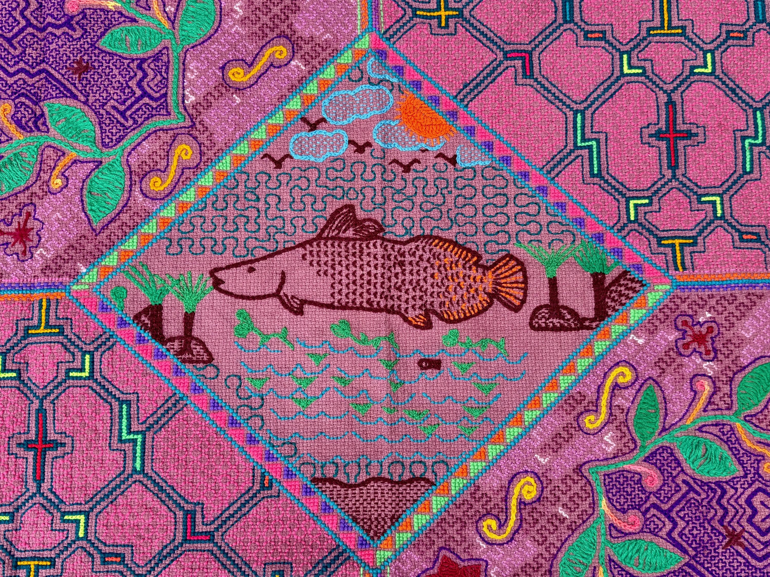 The centerpiece of this cloth is an Amazonian fish, which may be a Pirarucu or a similar species native to the Amazon River. It is surrounded by floral and traditional kene designs.