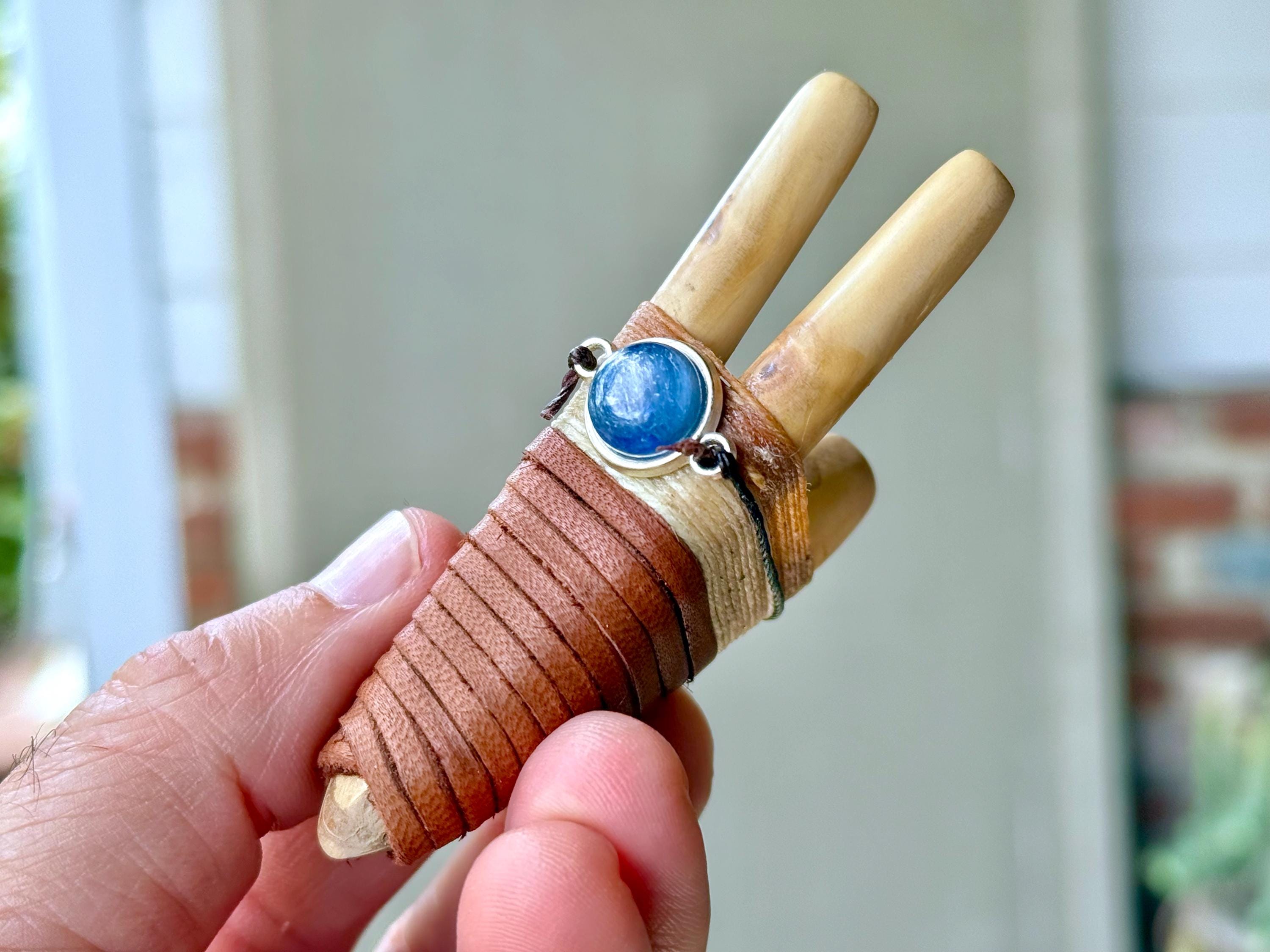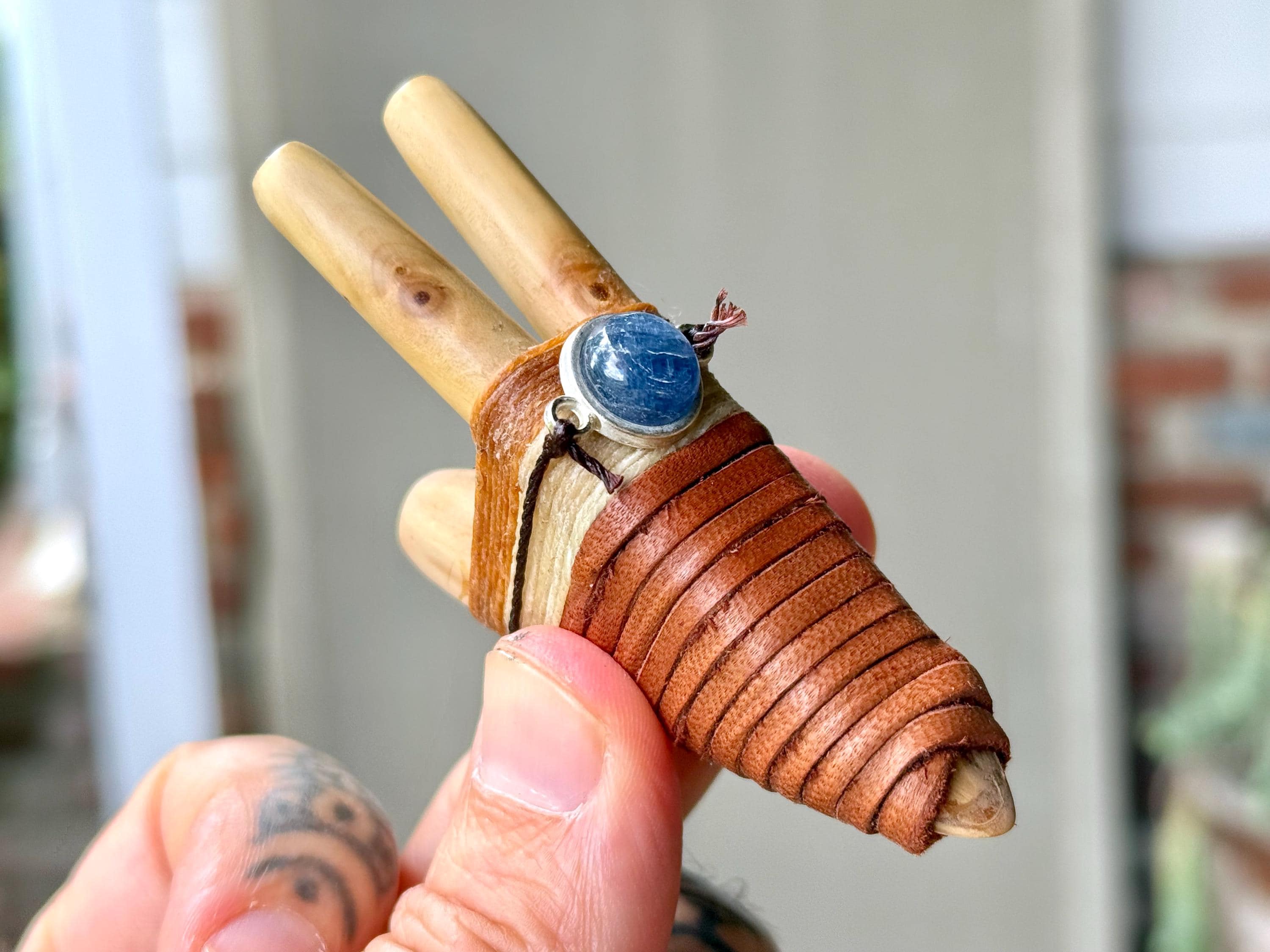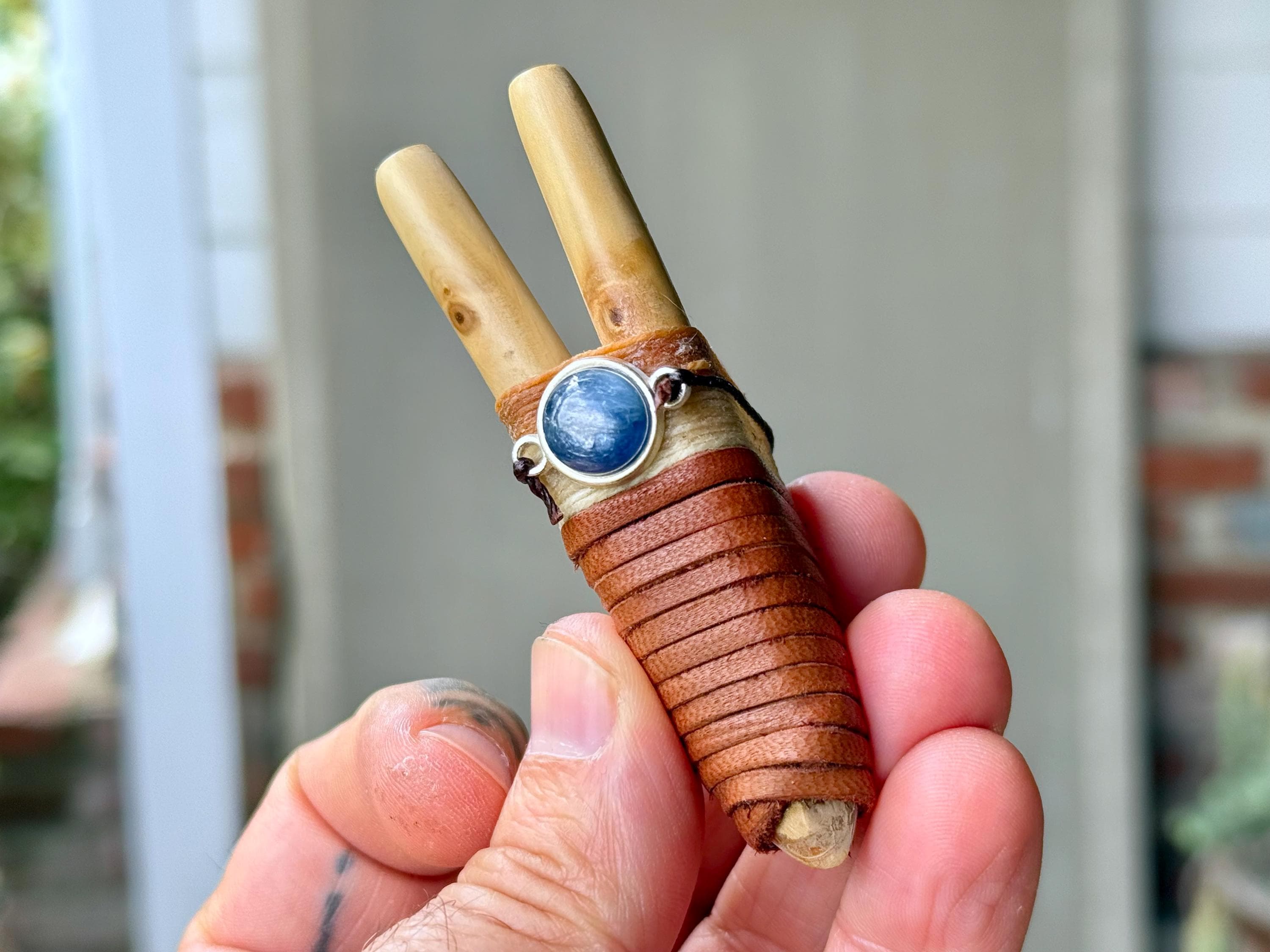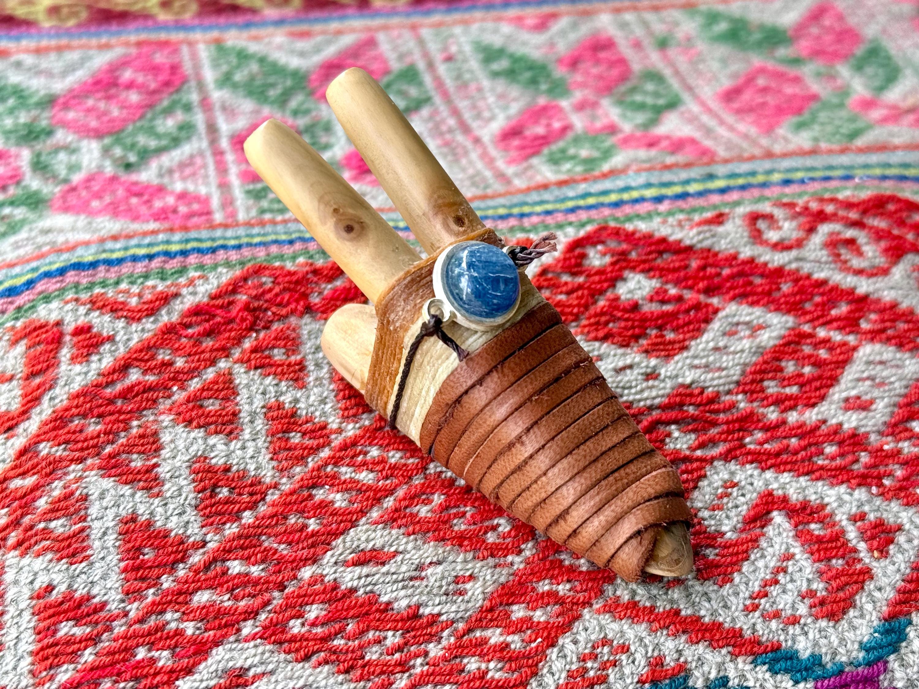 This Double Kuripe — for self-administering hapé — was handcrafted from natural Cemara Wood and adorned with leather wrapping, waxed thread and a Blue Kyanite cabochon.