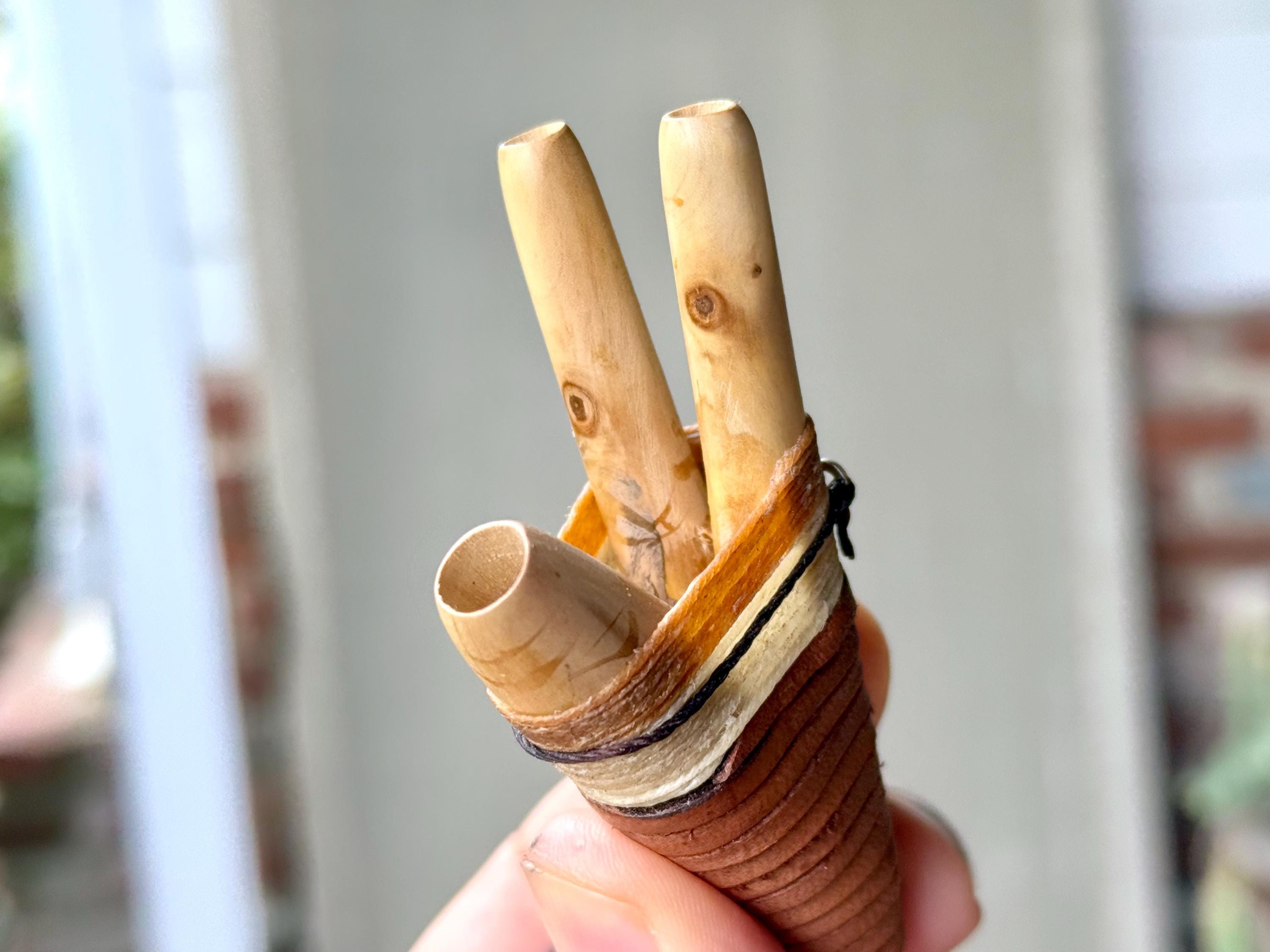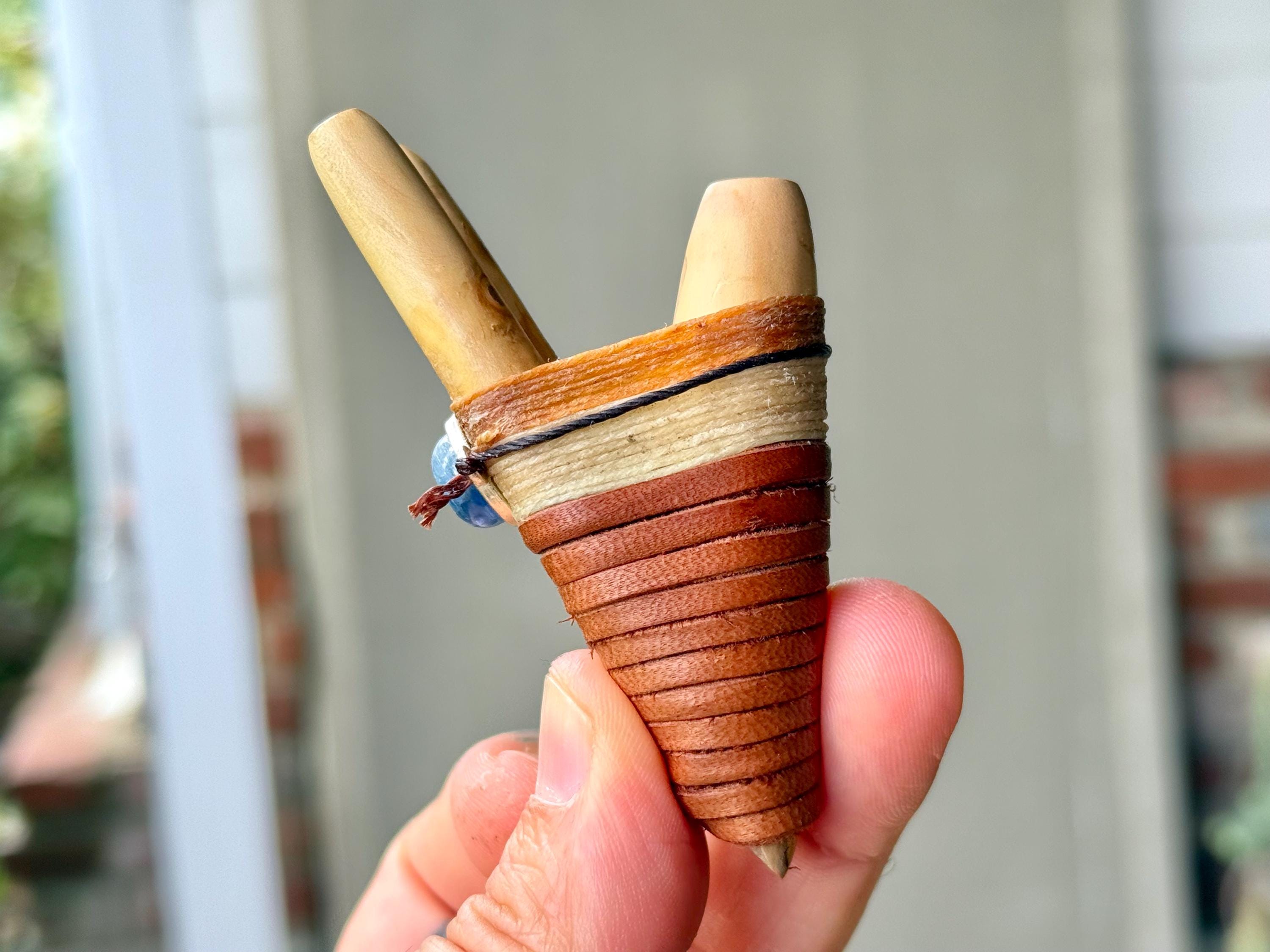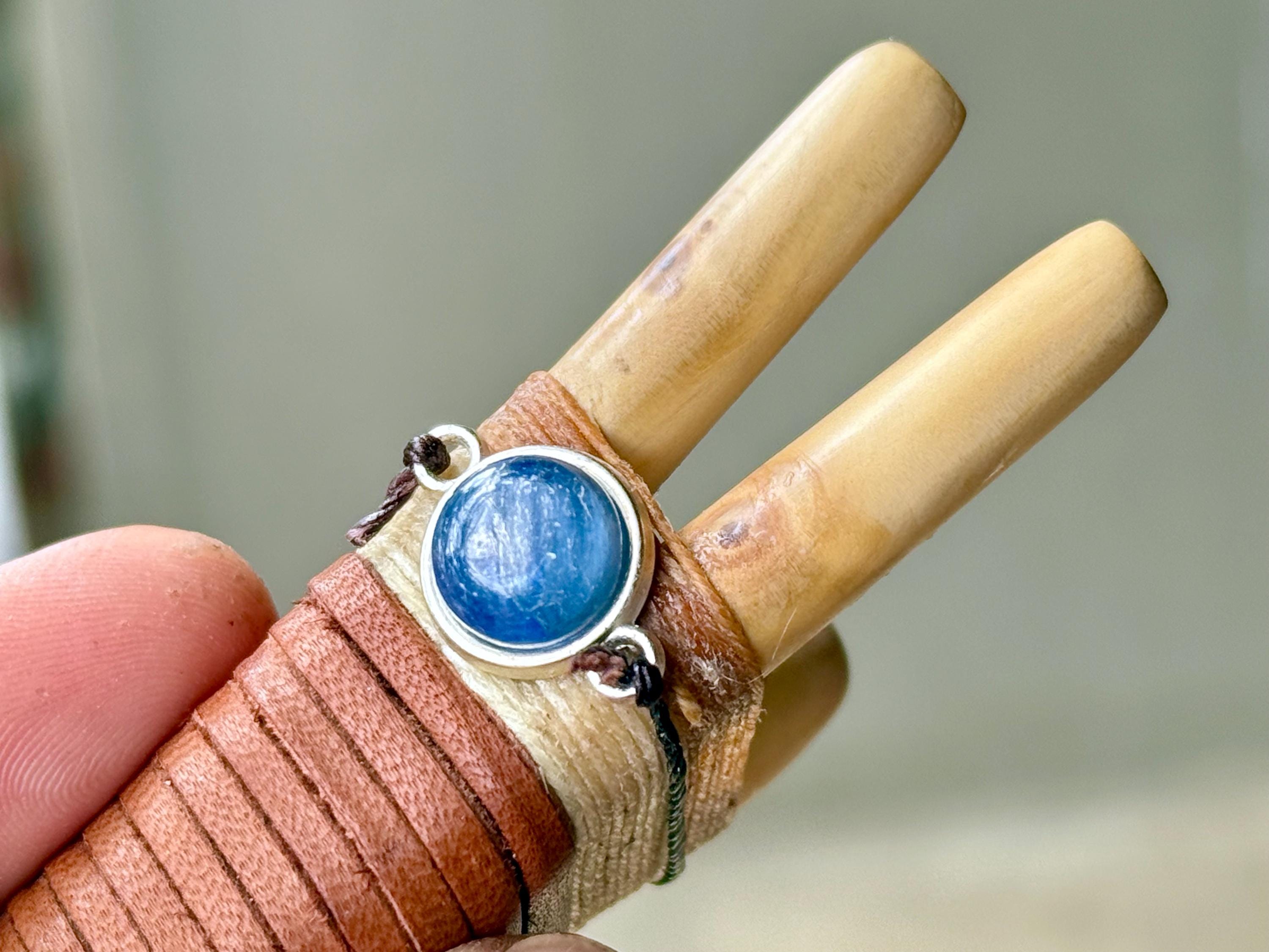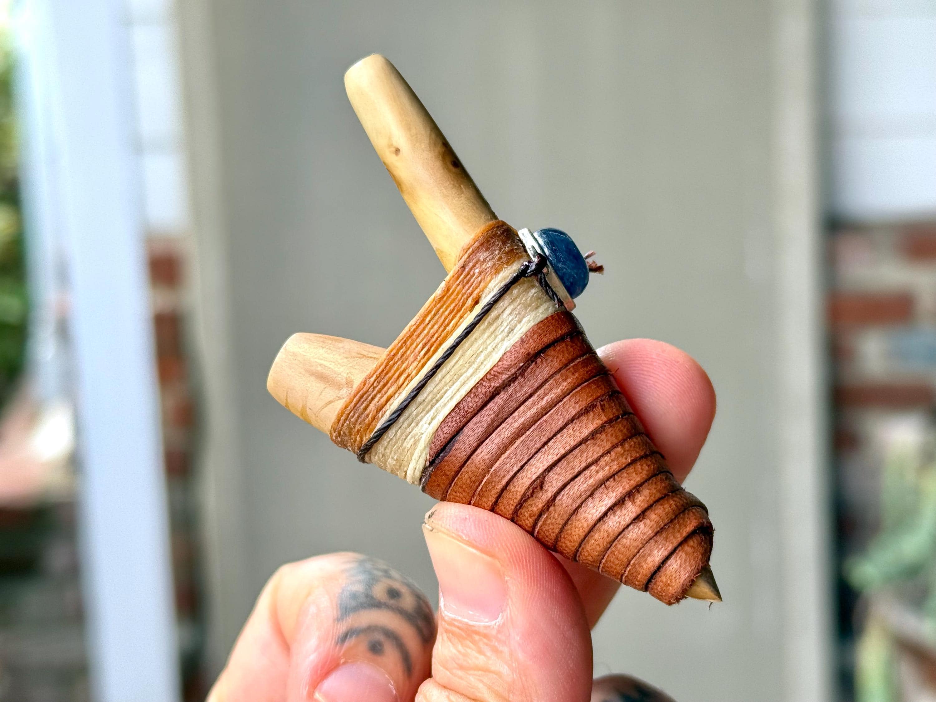 This Double Kuripe — for self-administering hapé — was handcrafted from natural Cemara Wood and adorned with leather wrapping, waxed thread and a Blue Kyanite cabochon.