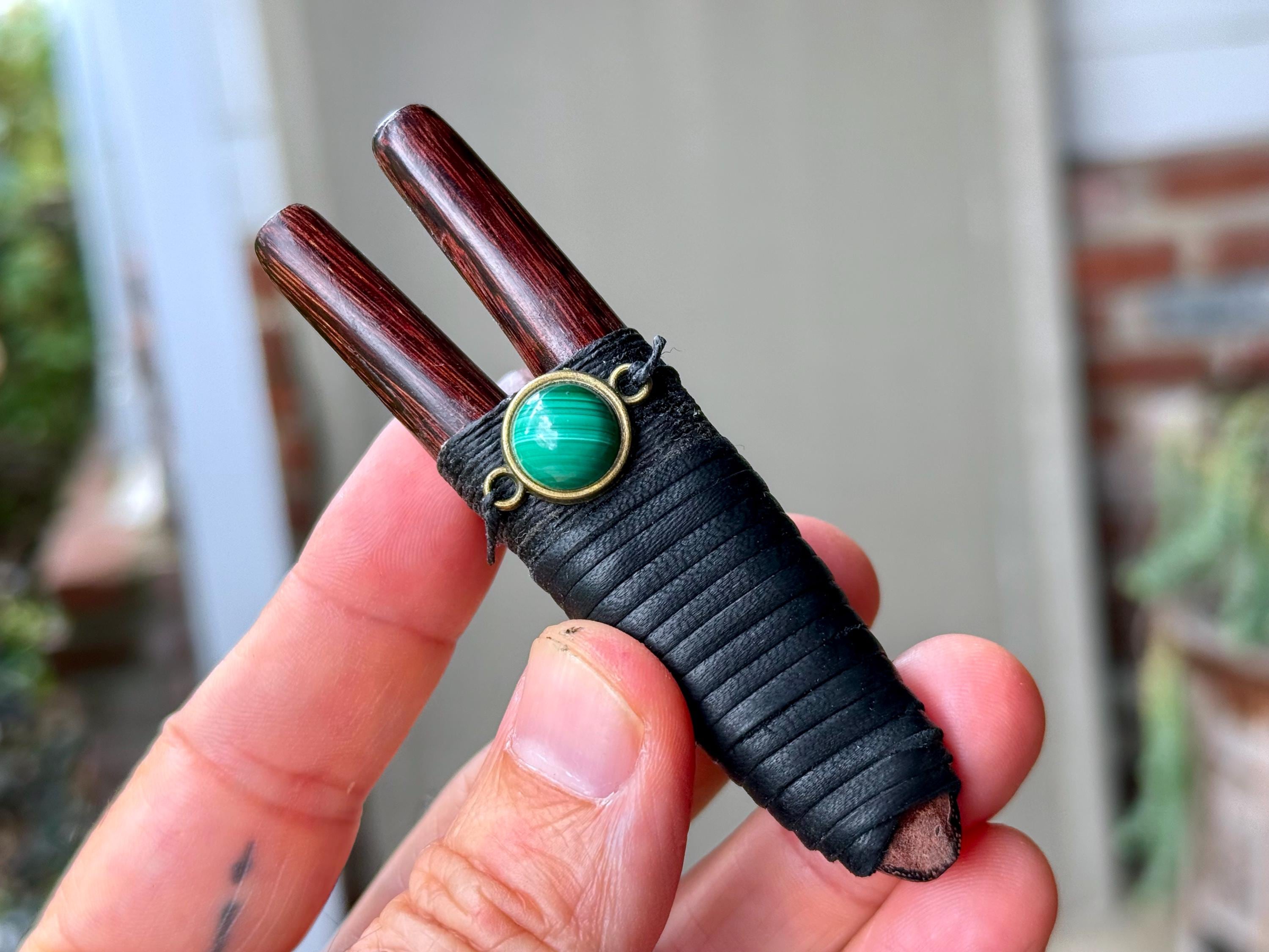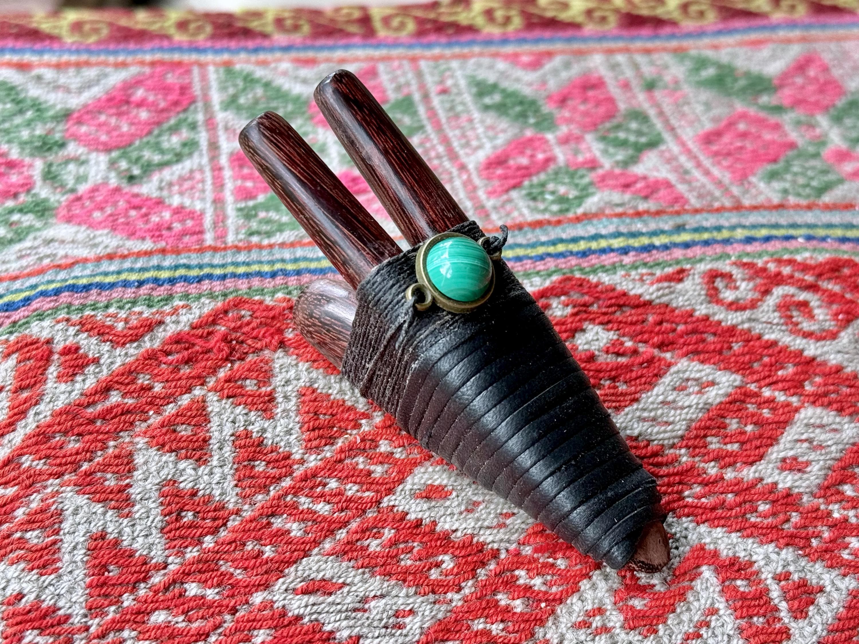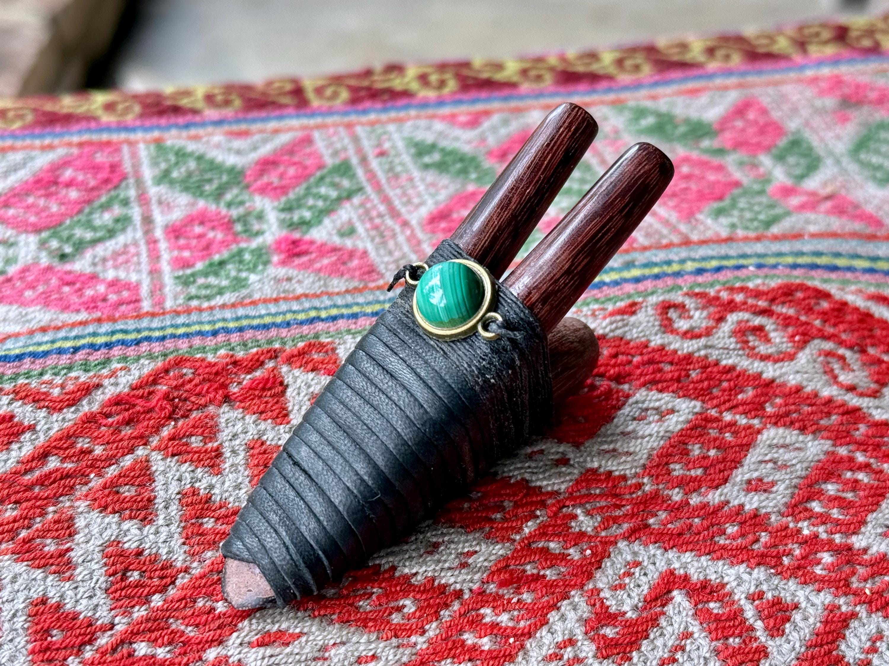 This Double Kuripe Pipe — for self-administering hapé — was handcrafted from natural, dark Tamarind Wood. It is adorned with a Malachite cabochon, leather and waxed threading.