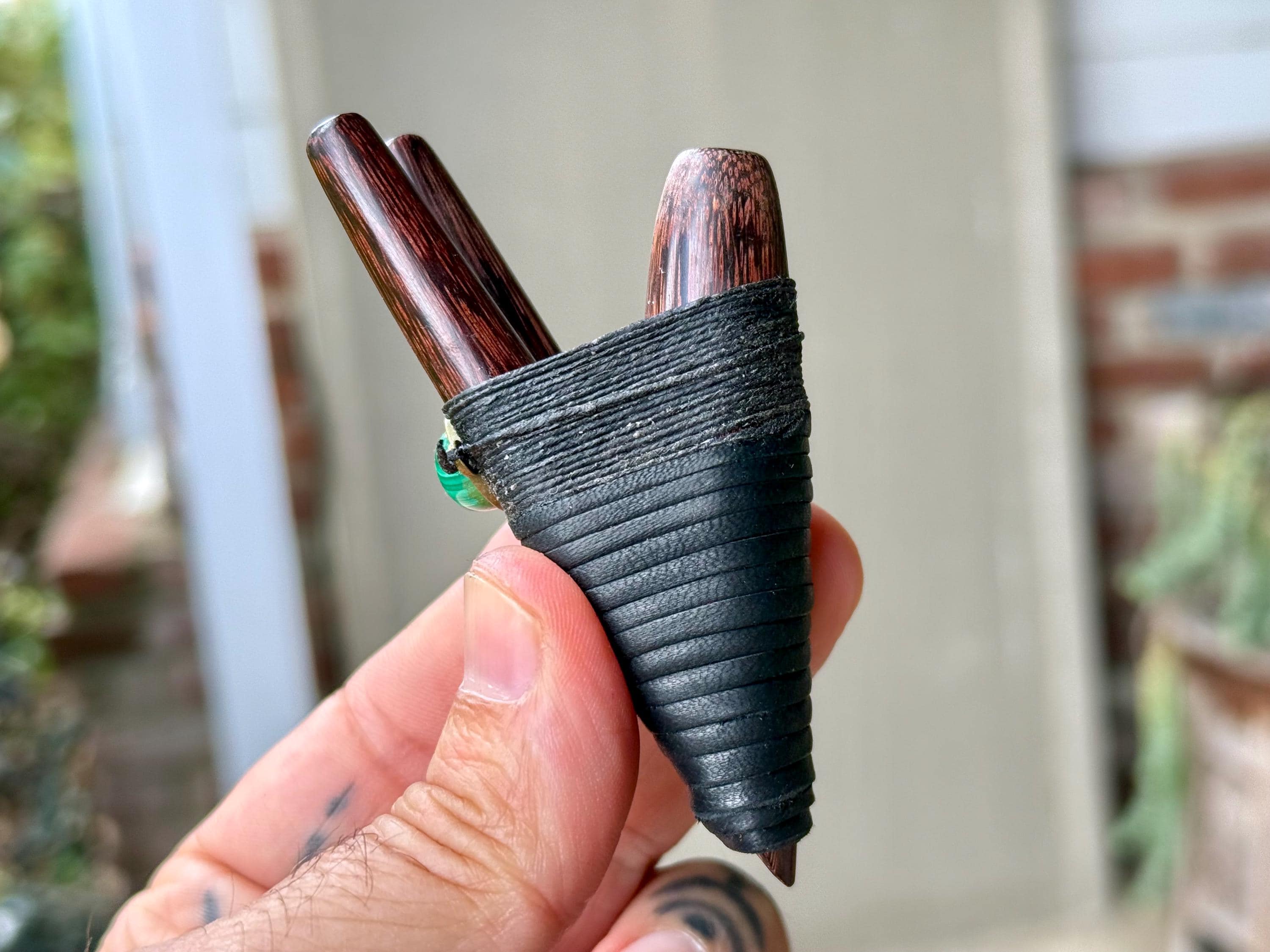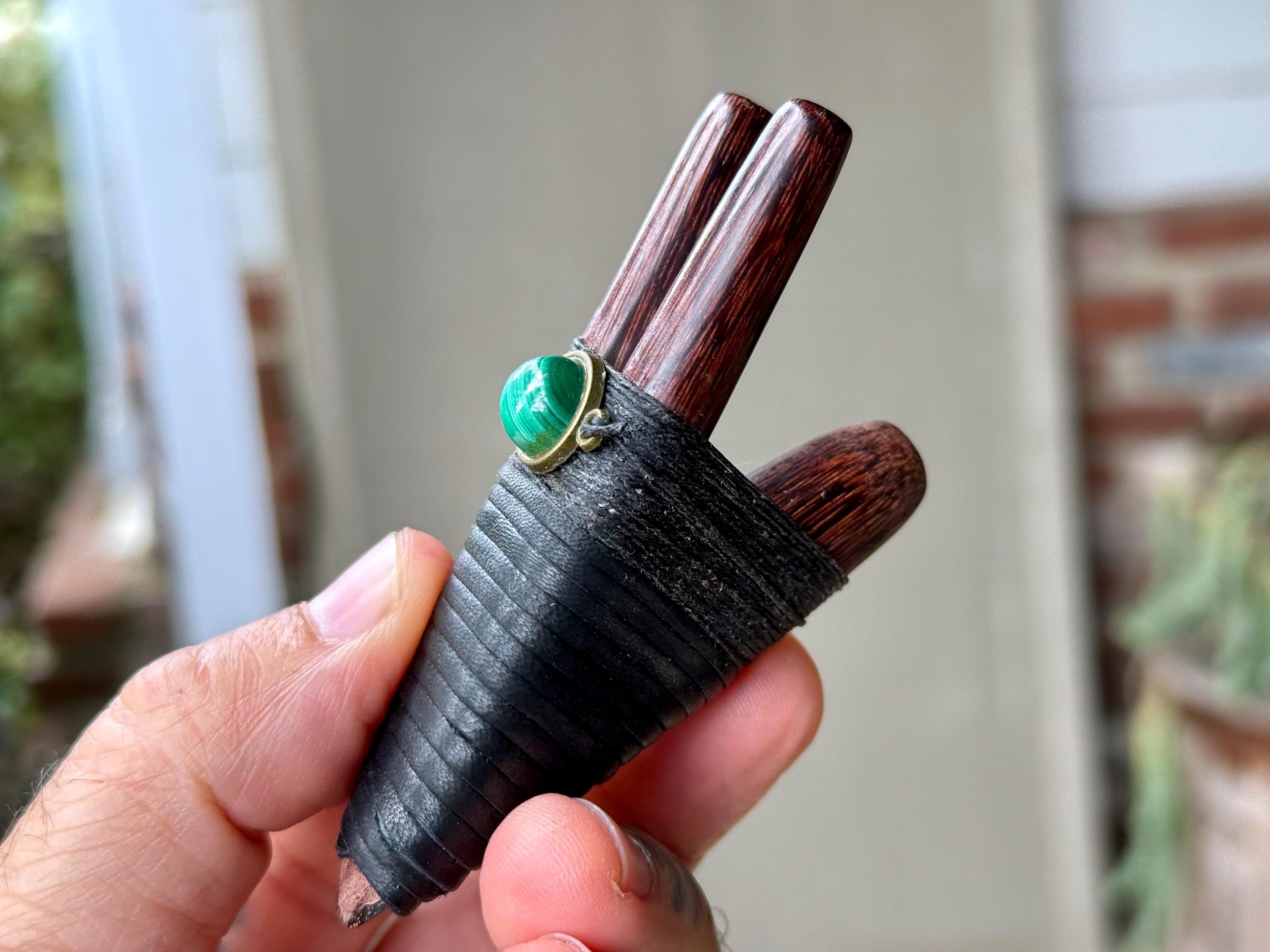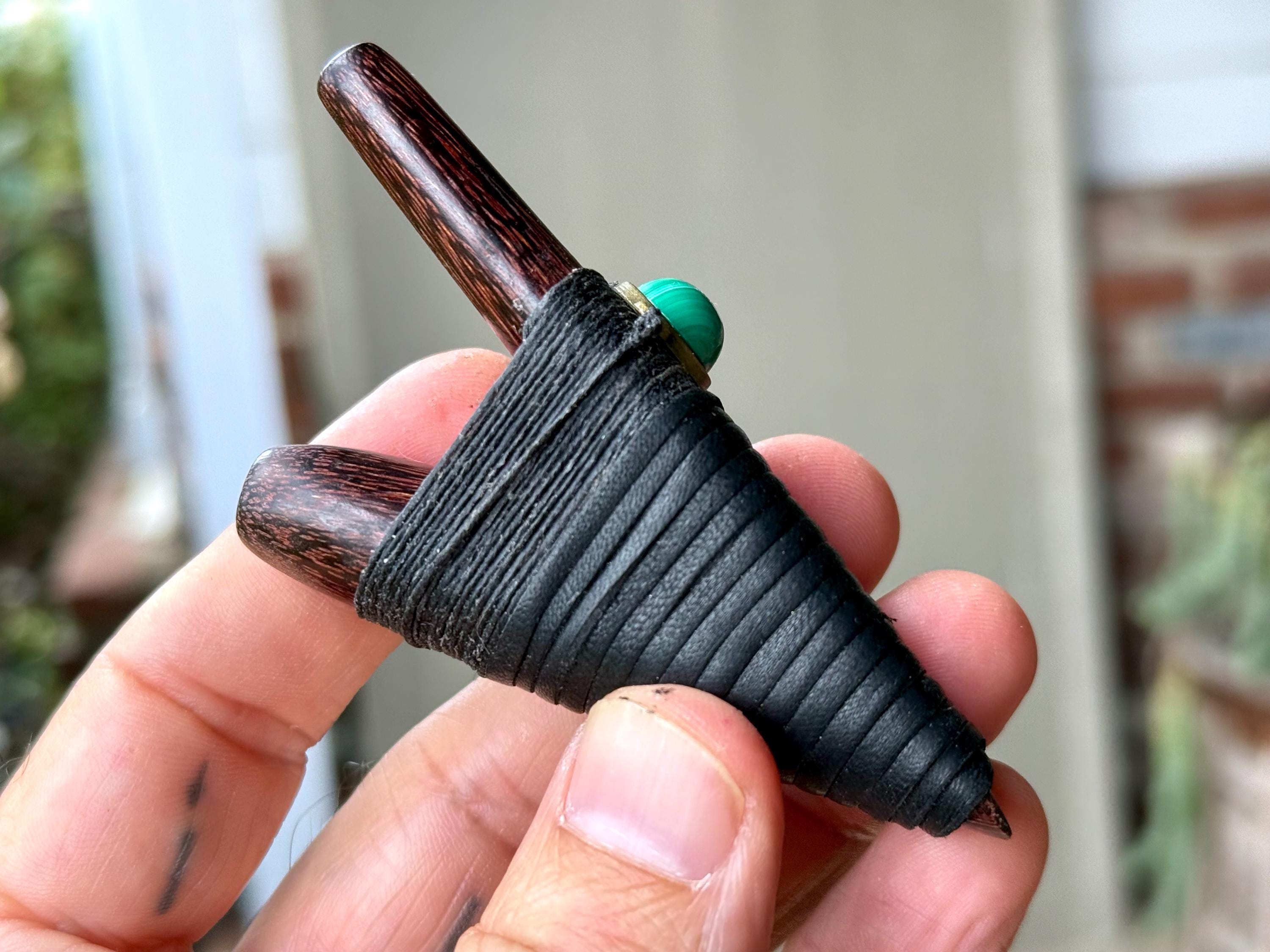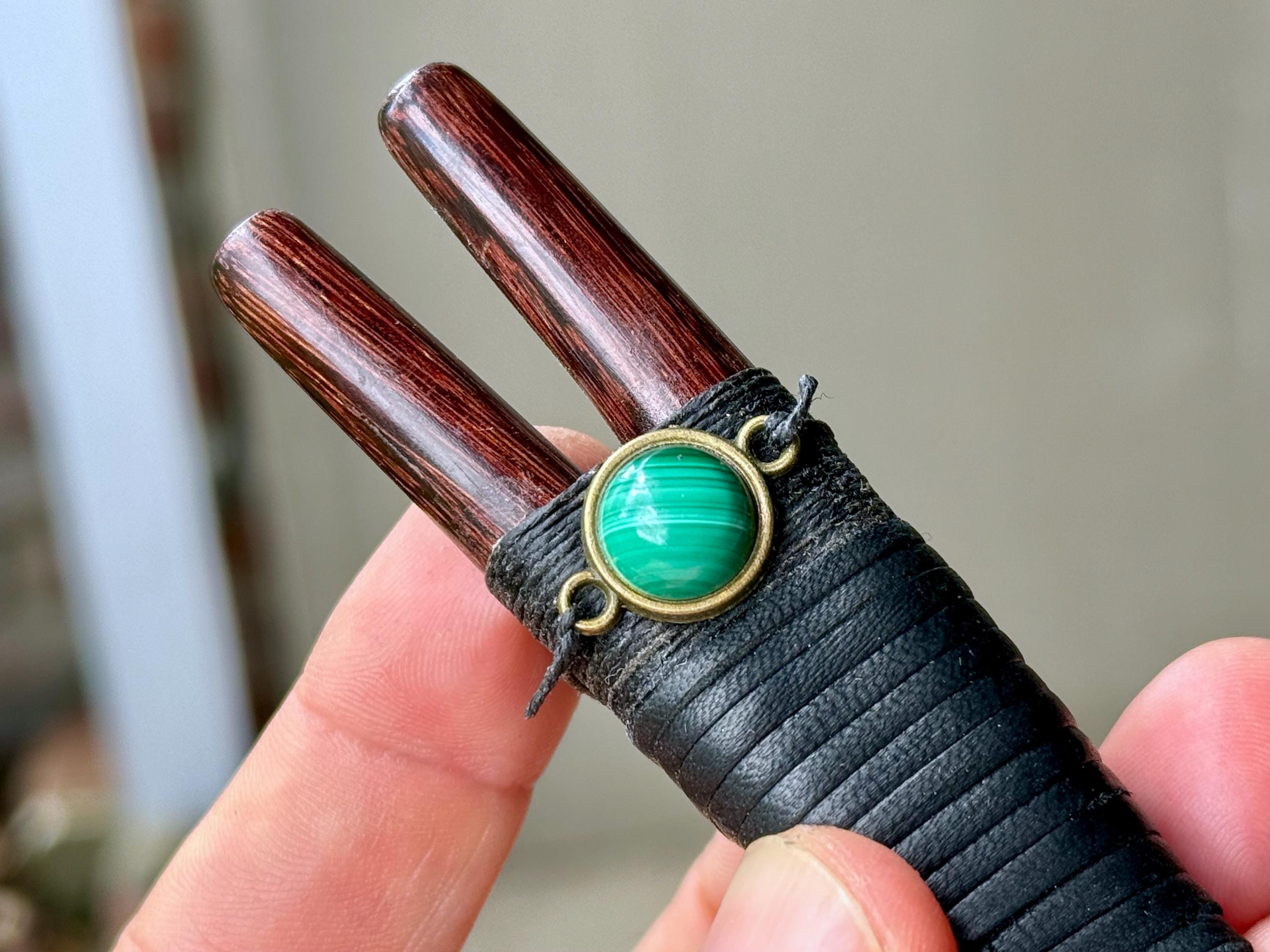 This Double Kuripe Pipe — for self-administering hapé — was handcrafted from natural, dark Tamarind Wood. It is adorned with a Malachite cabochon, leather and waxed threading.
