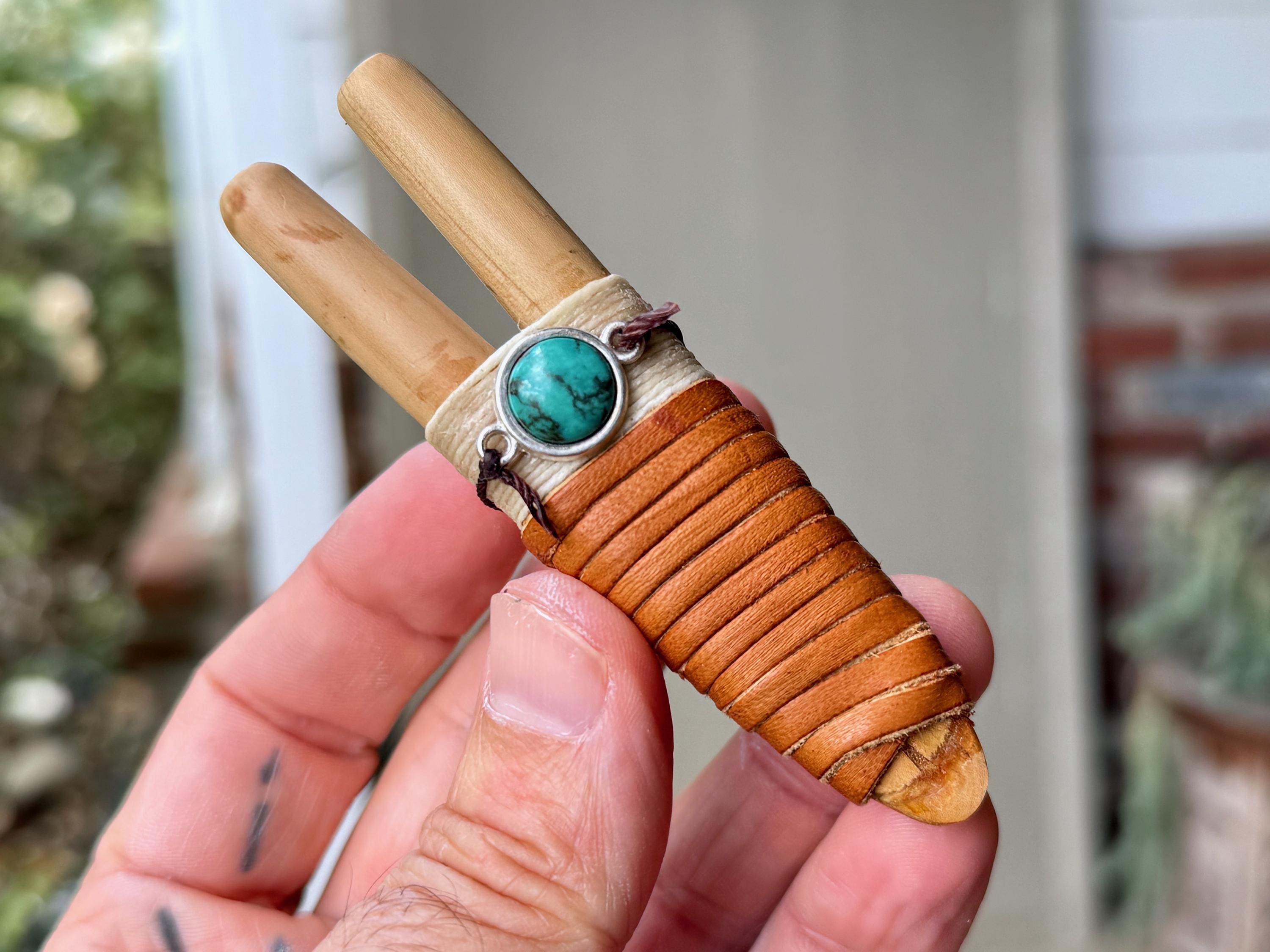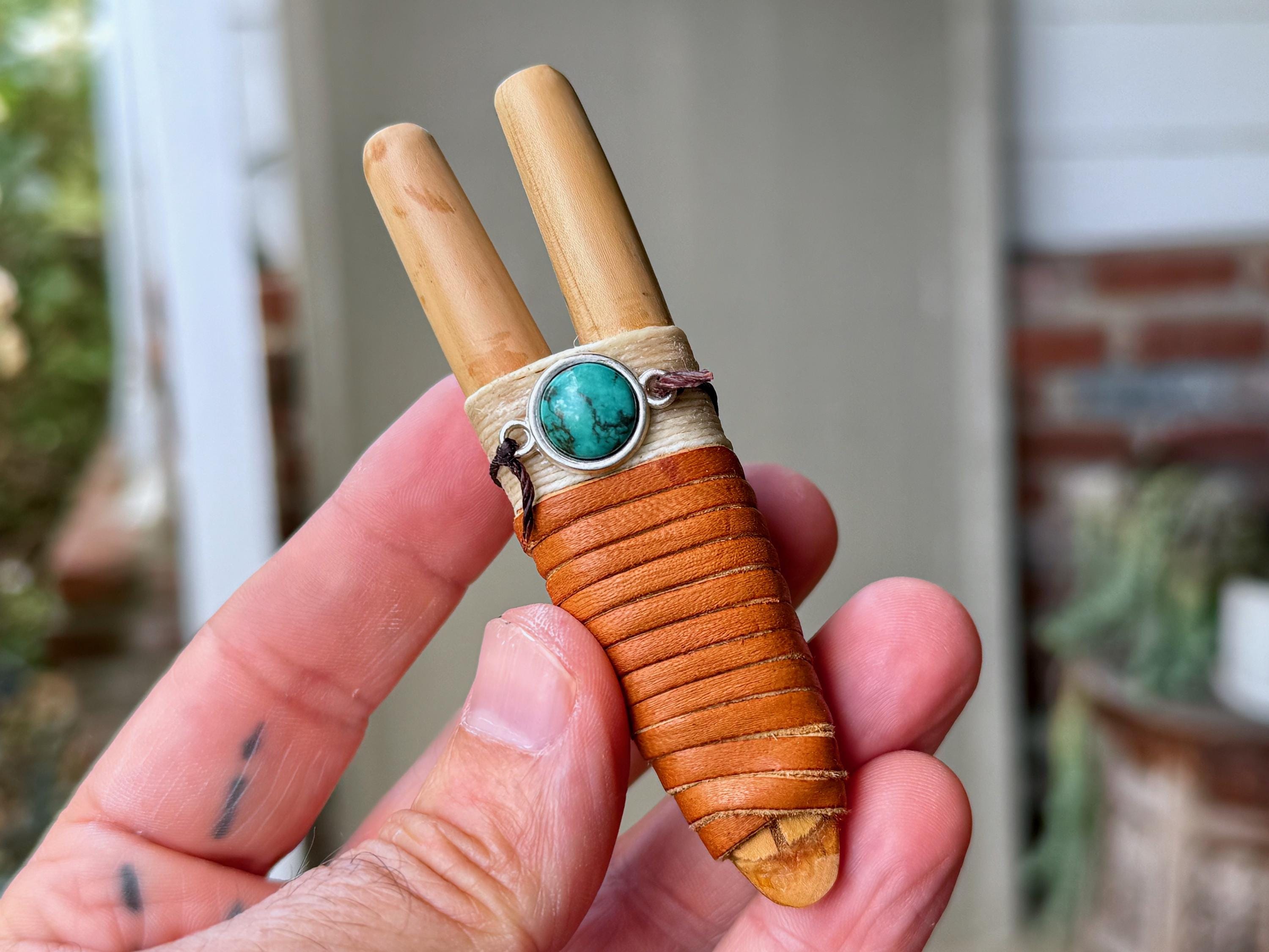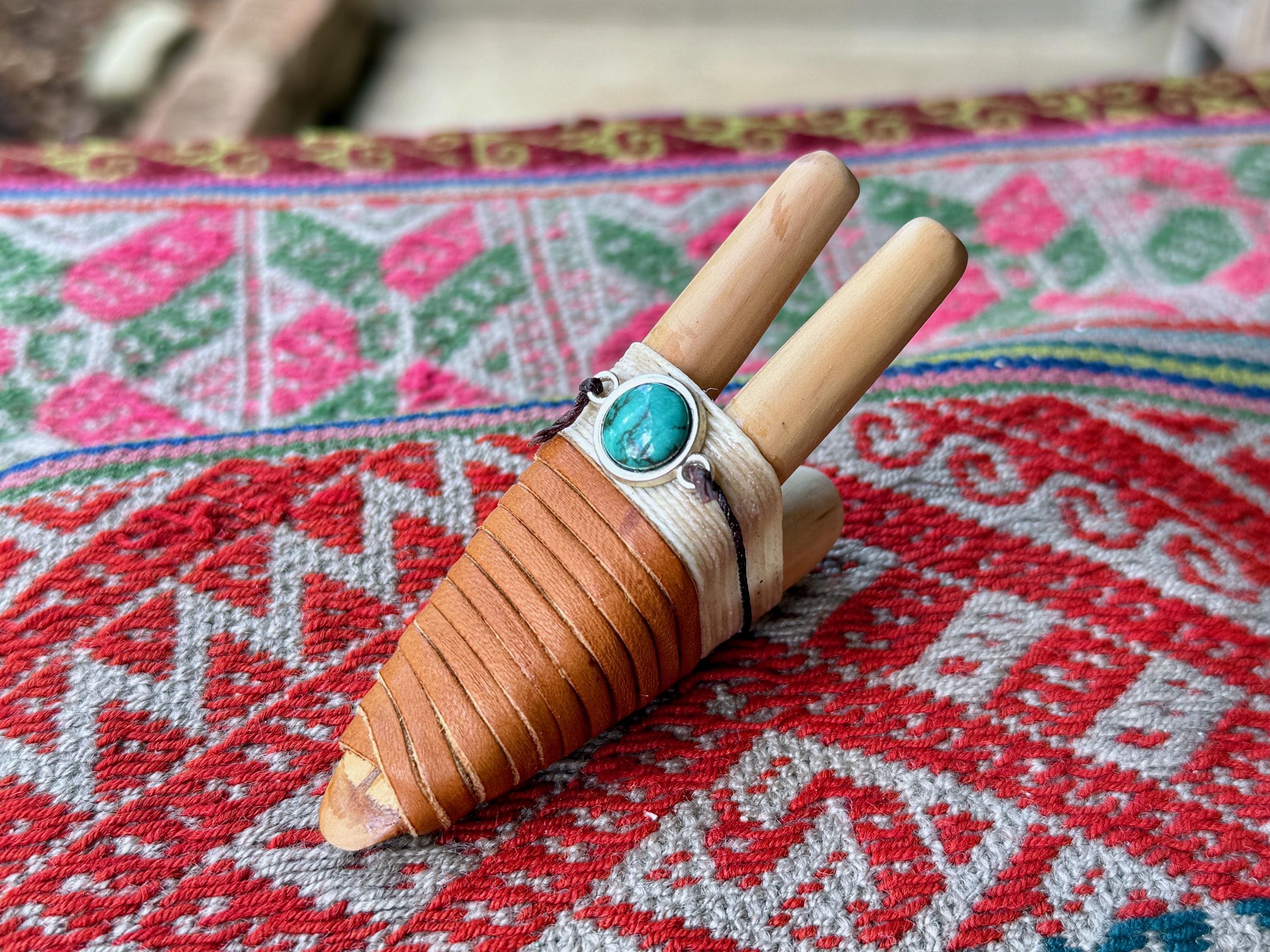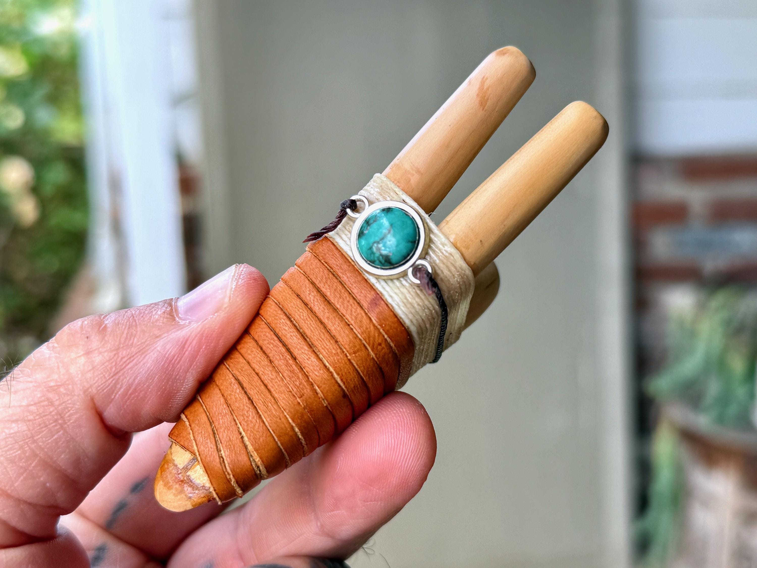 This Double Kuripe Pipe — for self-administering hapé — was hand crafted from natural Cemara Wood and adorned with leather, waxed thread and a Cloud Mountain Turquoise cabochon.