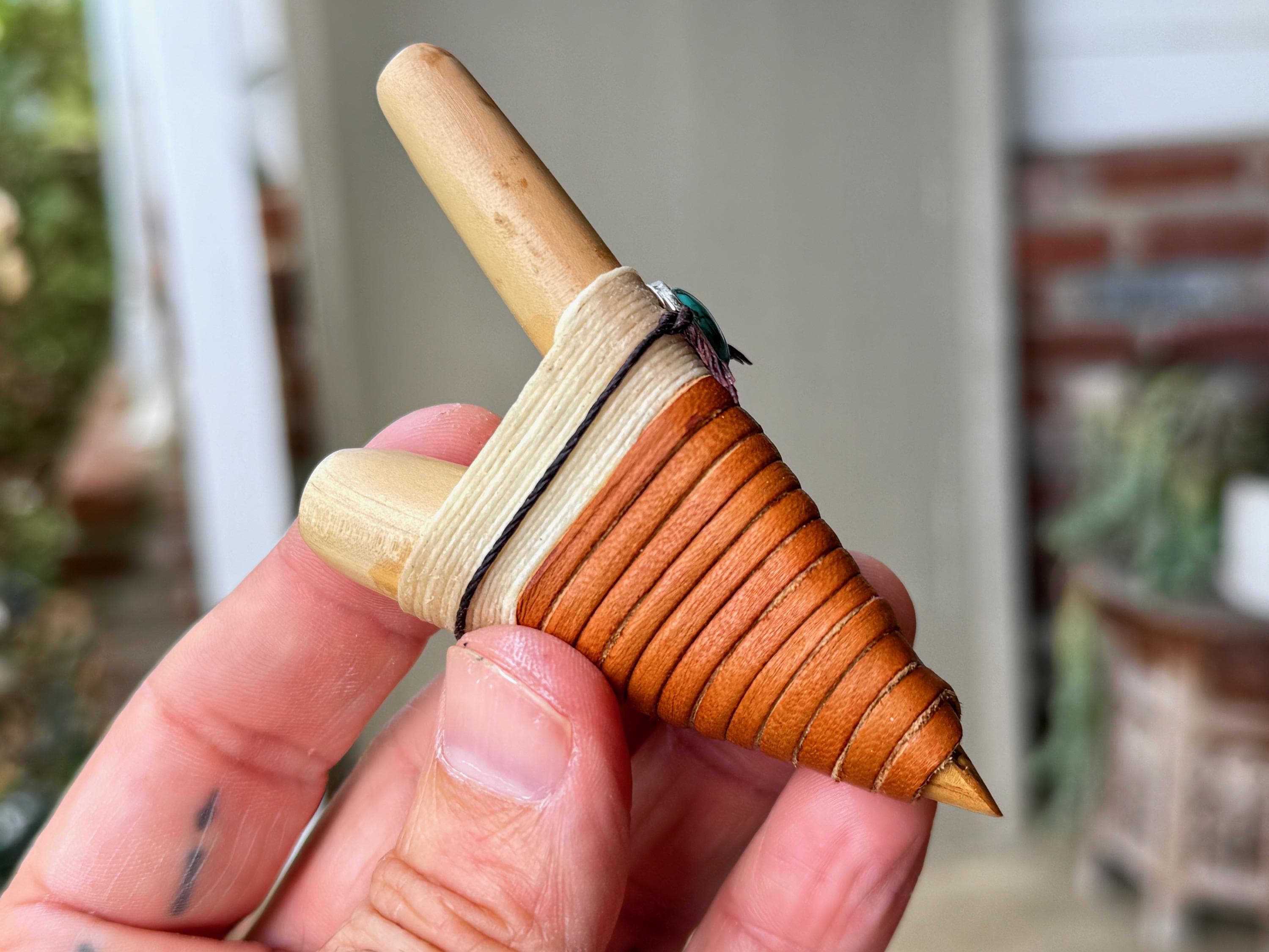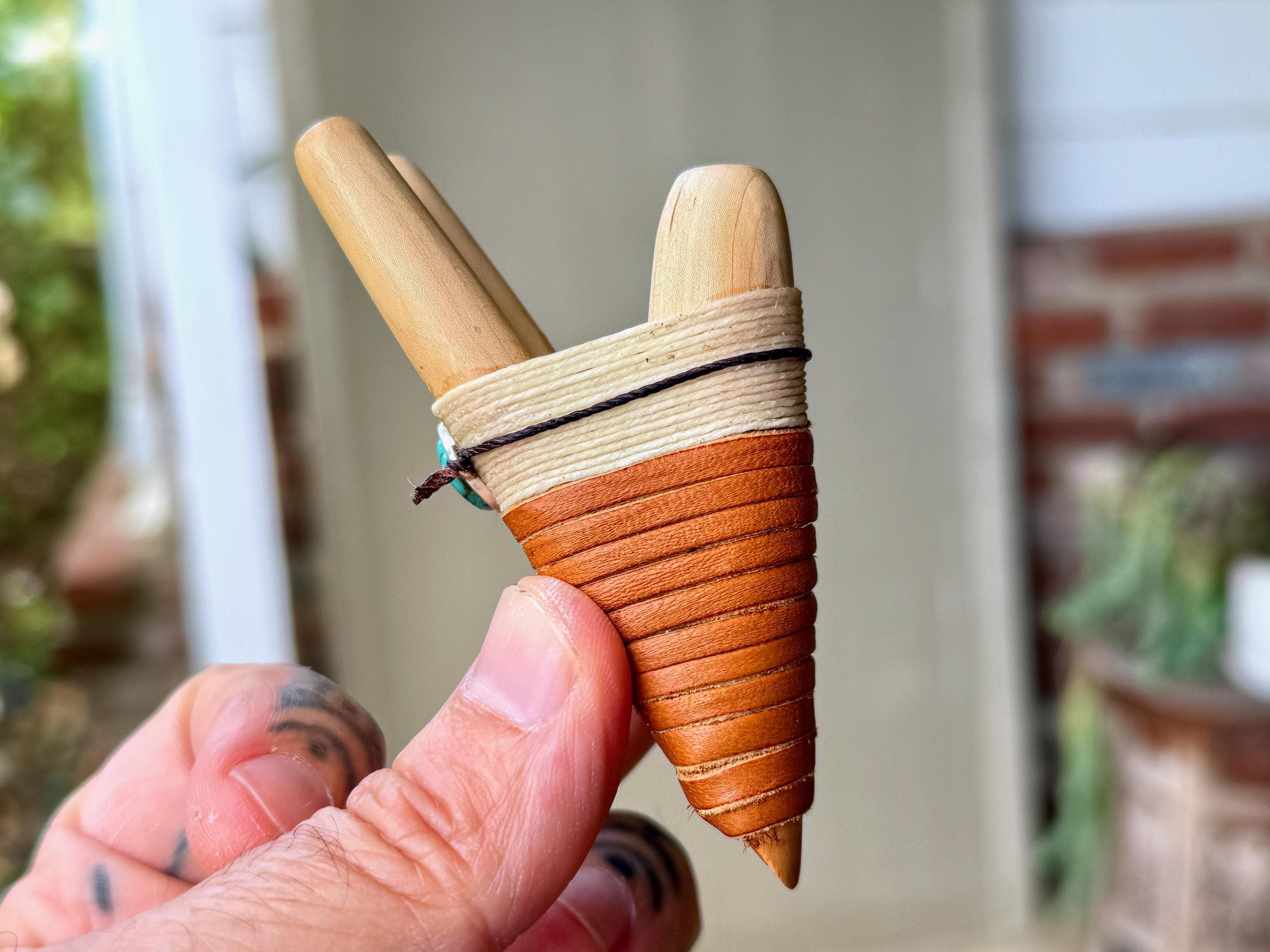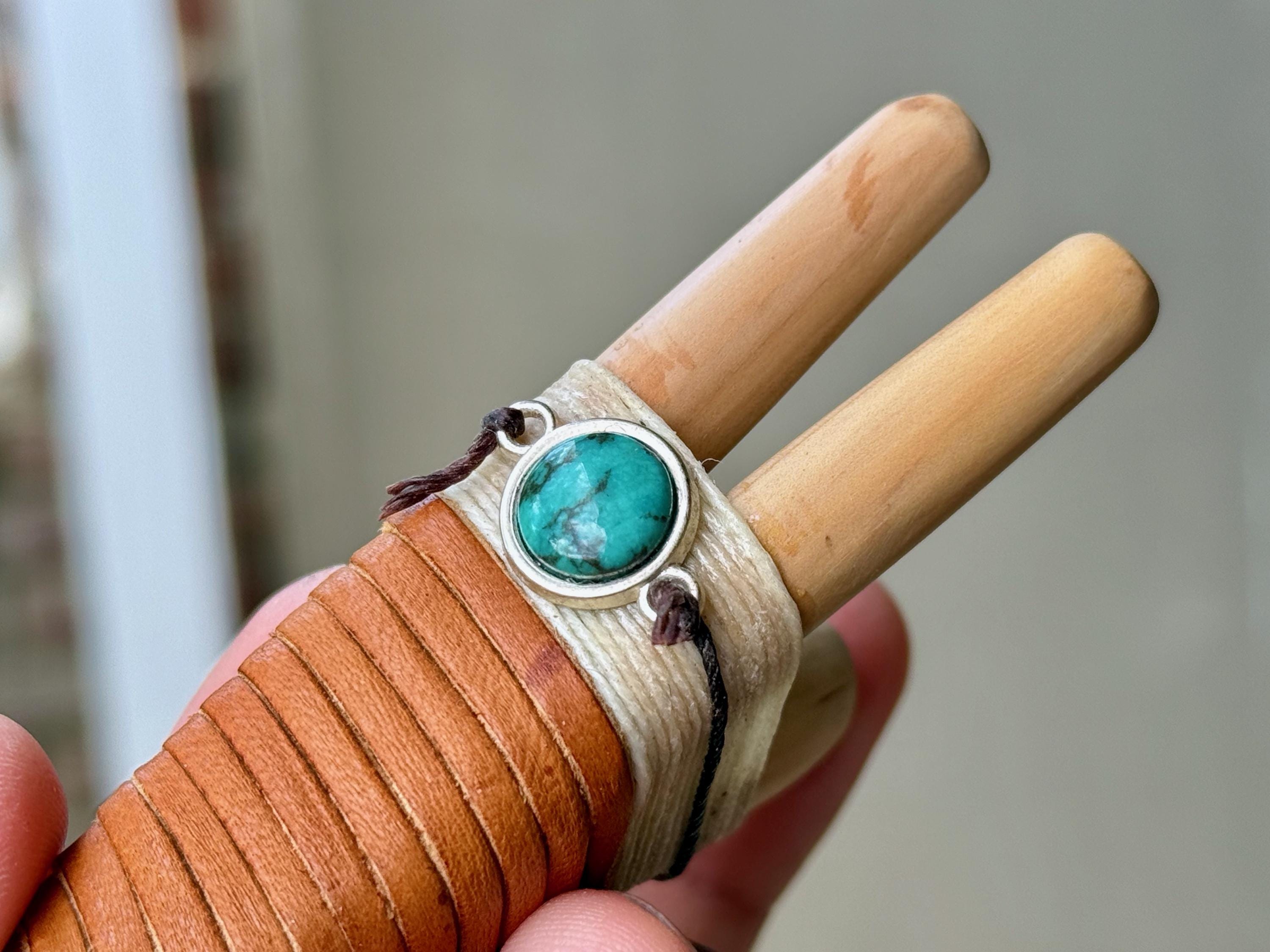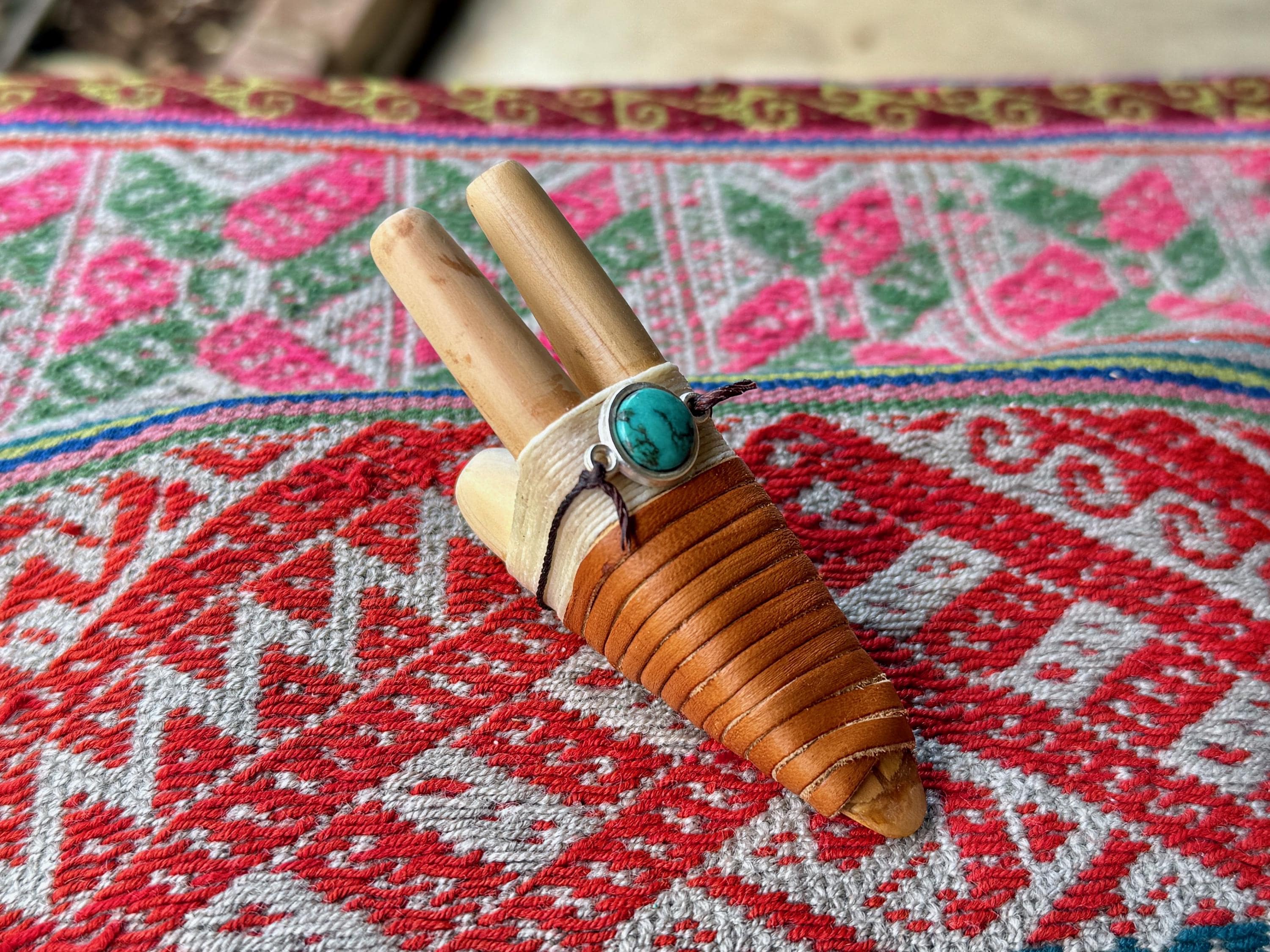 This Double Kuripe Pipe — for self-administering hapé — was hand crafted from natural Cemara Wood and adorned with leather, waxed thread and a Cloud Mountain Turquoise cabochon.