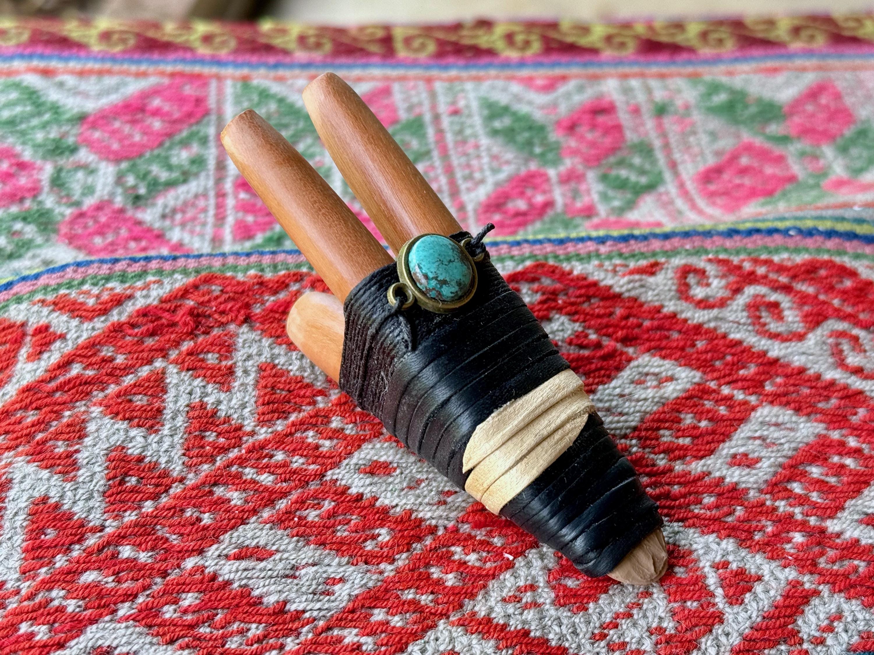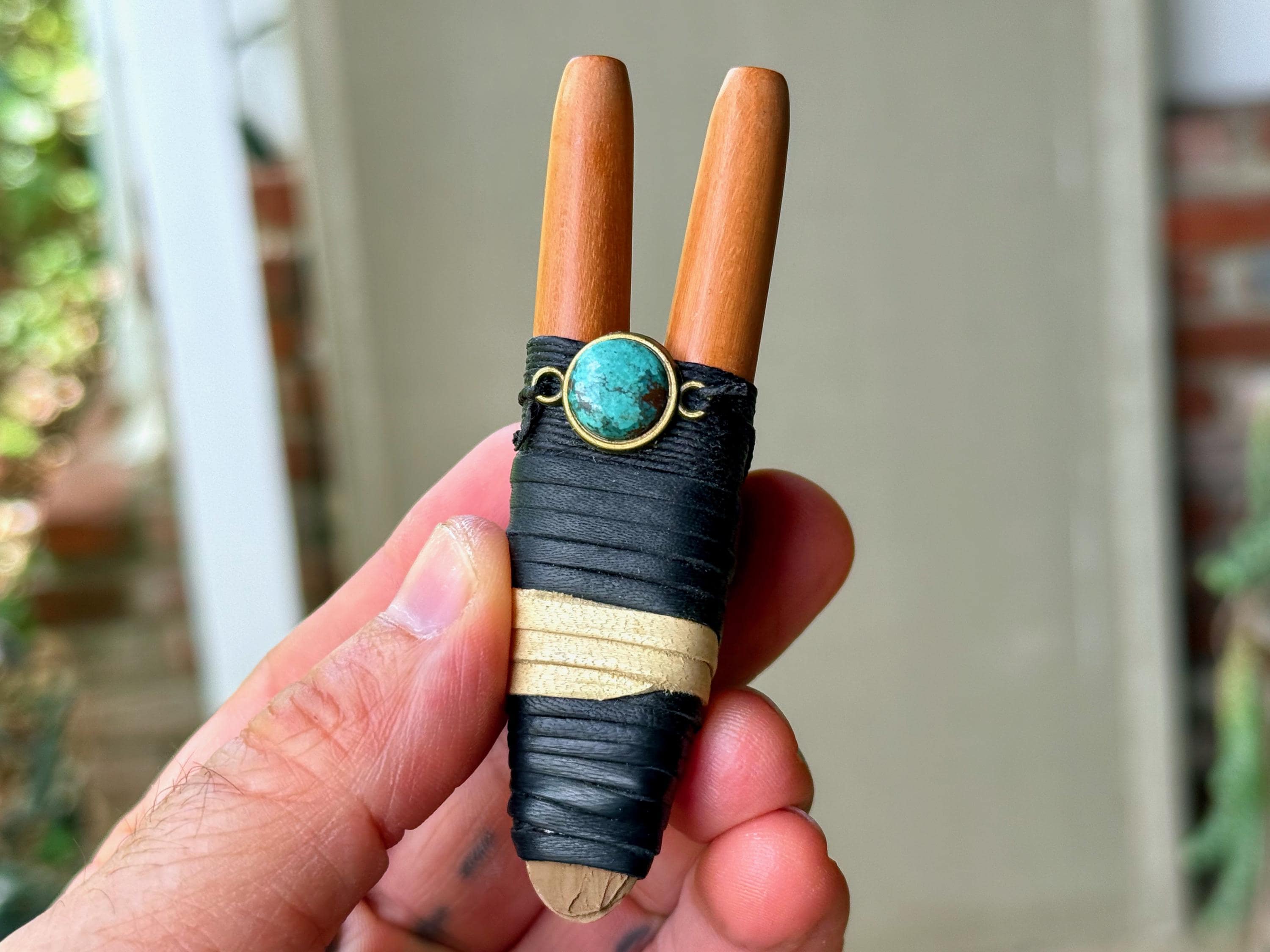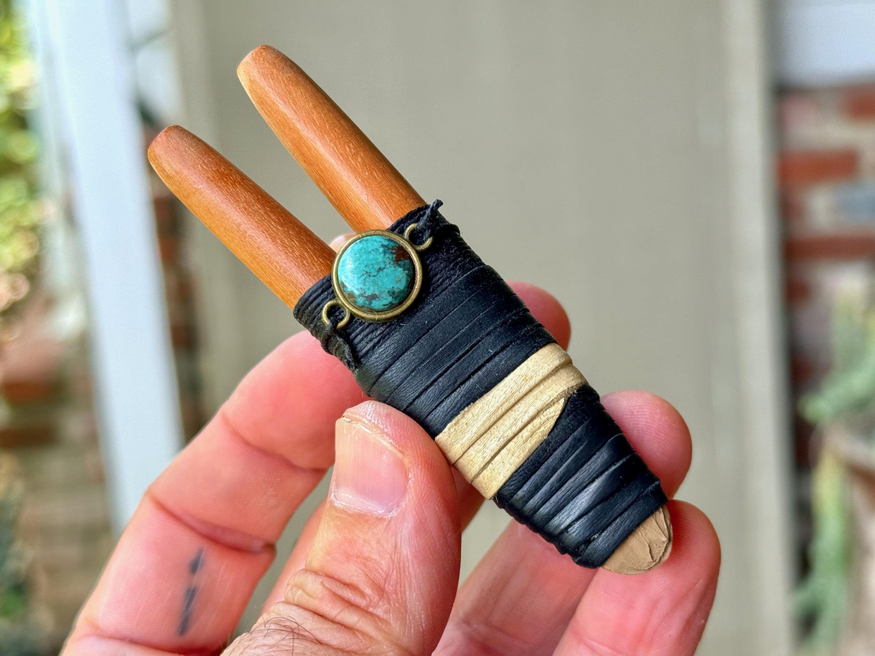 This Double Kuripe Pipe — for self-administering hapé — was hand crafted from natural Sawo Wood and adorned with leather, waxed thread and a Cloud Mountain Turquoise cabochon.